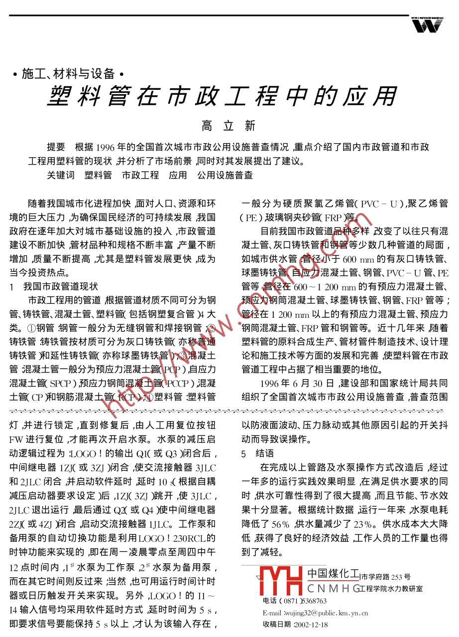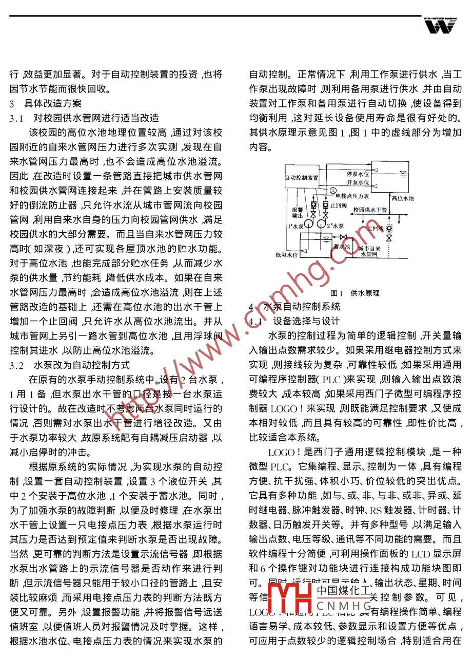高校校園供水方式的改造實(shí)踐張成立黃恒王煜曾云提要根據(jù)高校用水時(shí)間集中用水量變化較大的特點(diǎn)分析了某校園原供水系統(tǒng)存在成本高可靠性低水資源浪費(fèi)管網(wǎng)系統(tǒng)待完善的問(wèn)題。提出以利用自來(lái)水水壓供水為主水泵提升為輔水泵采用自動(dòng)控制方式的改造思路。并據(jù)此進(jìn)行了管網(wǎng)改造及利用微型可編程控制器LOGO!實(shí)現(xiàn)水泵自控取得了良好的節(jié)能節(jié)水效果。關(guān)鍵詞高校供水改造節(jié)能節(jié)水可編程控制器1校園供水存在的問(wèn)題成來(lái)水后大量溢流極大地浪費(fèi)了水資源增大了供高校校園的供水和一般城市供水相比較為特水成本。殊。主要是由于校園內(nèi)學(xué)生住宿區(qū)一般都較為集(4)校園管網(wǎng)系統(tǒng)設(shè)計(jì)有缺陷。對(duì)于一般建筑中造成了學(xué)生宿舍、食堂的用水十分集中且用水物如教室、實(shí)驗(yàn)室、教師住宿區(qū)等本來(lái)城市自來(lái)水量較大。而其它建筑物如教室、實(shí)驗(yàn)室、教師住宿區(qū)的正常供水即可滿足其用水量要求但采用水泵供等的用水量則相對(duì)較少。同時(shí)用水的時(shí)間性強(qiáng)水后反而會(huì)出現(xiàn)供水不足的現(xiàn)象。同時(shí)用水量大般在早上6:00~8:00中午11:00~2:00,下午5:00的學(xué)生宿舍屋頂水池設(shè)計(jì)偏小調(diào)節(jié)能力較差7:00晚上9:00~10:00四個(gè)時(shí)間段用水量最大,2改造思路而其它時(shí)間則用水量一般。某高校的某區(qū)供水方式(1)校園供水以自來(lái)水供水為主水泵供水為為把城市自來(lái)水管網(wǎng)的水源取到蓄水池后用水泵輔。由于自來(lái)水采用多廠聯(lián)合供水的方式并設(shè)有抽到校園內(nèi)高位水池再由高位水池向校園管網(wǎng)供大量的多級(jí)調(diào)節(jié)水池和加壓泵站對(duì)水壓和水量的水。隨著髙校的擴(kuò)招學(xué)生人數(shù)顯著增多造成了經(jīng)調(diào)節(jié)能勹較強(qiáng)。且自來(lái)水對(duì)供電事故的應(yīng)急能力較常性的供水不足特別是學(xué)生宿舍和食堂最為明顯,強(qiáng)機(jī)電設(shè)備的備用率較高特別是經(jīng)過(guò)近幾年的管影響了學(xué)生和教師的正常生活秩序,同時(shí)該供水方網(wǎng)改造供水可靠性大大提高。因此校園供水應(yīng)充式還存在如下問(wèn)題分利用自來(lái)水管網(wǎng)所提供的水壓滿足校園供水中(1腆烘水成本高。由于校園內(nèi)的用水全部采用的大部分需要。針對(duì)用水量較大、用水集中、時(shí)間性水泵供水造成電能的極大浪費(fèi)和機(jī)電設(shè)備的大量強(qiáng)的學(xué)生宿舍和食堂在用水高峰期會(huì)出現(xiàn)供水不損耗。足的情況。應(yīng)在自來(lái)水正常供水的情況下采用水2)供水可靠性低。由于水泵采用人工操作方泵供水作為輔助措施發(fā)揮校園內(nèi)蓄水池、高位水池式高位水池的水位只能靠人為估計(jì)而且高位水池和屋頂水池的貯水作用。這種供水方式既節(jié)約了大離水泵房較遠(yuǎn)無(wú)法做到準(zhǔn)時(shí)開(kāi)機(jī)和停機(jī)。會(huì)造成量電能降低機(jī)電設(shè)備的損耗獲得良好經(jīng)濟(jì)效益供水中斷或?qū)绗F(xiàn)高位水池水位過(guò)高而溢流電能和又提高了供水的可靠性滿足校園的特殊供水需要。水資源造成浪費(fèi)。另外如果蓄水池水位過(guò)低還會(huì)(2冰泵供水采用自動(dòng)控制方式。采用自動(dòng)控造成水泵空轉(zhuǎn)導(dǎo)致電能浪費(fèi)和機(jī)電設(shè)備的加速損制方式雖然會(huì)增加一些投資費(fèi)用但這部分費(fèi)用與耗。供水濃相九備投資相比是很小的3冰資源浪費(fèi)。除水泵不能準(zhǔn)時(shí)停機(jī)而造成加上弌成熟可靠性高既減的溢流浪費(fèi)外。學(xué)生因高峰期供水中斷故經(jīng)常打少了頭叫問(wèn)了水泵供水的可靠性和開(kāi)閥門未關(guān)造成來(lái)水后的浪費(fèi)。很多學(xué)生在上課準(zhǔn)確性又可減輕工作人員的工作量降低能耗和機(jī)前或睡覺(jué)前打開(kāi)閥門用水桶或臉盆接水、貯水造電設(shè)備的損耗獲得良好的經(jīng)濟(jì)效益特別是長(zhǎng)期運(yùn)66給水排水ol.29No.42003行效益更加顯著。對(duì)于自動(dòng)控制裝置的投資也將自動(dòng)控制。正常情況下利用工作泵進(jìn)行供水當(dāng)工因節(jié)水節(jié)能而很快回收。作泵出現(xiàn)故障時(shí)則利用備用泵進(jìn)行供水并由自動(dòng)3具體改造方案裝置對(duì)工作泵和備用泵進(jìn)行自動(dòng)切換使設(shè)備得到3.1對(duì)校園供水管網(wǎng)進(jìn)行適當(dāng)改造均衡利用這對(duì)延長(zhǎng)設(shè)備使用壽命是很有好處的。該校園的高位水池地理位置較高通過(guò)對(duì)該校其供水原理示意見(jiàn)圖1圖1中的虛線部分為增加園附近的自來(lái)水管網(wǎng)壓力進(jìn)行多次實(shí)測(cè)發(fā)現(xiàn)在自內(nèi)容來(lái)水管網(wǎng)壓力最高時(shí),也不會(huì)造成高位水池溢流。因此在改造時(shí)設(shè)置一條管路直接把城市供水管網(wǎng)自動(dòng)控制裝置亭泵水位開(kāi)泵水和校園供水管網(wǎng)連接起來(lái)并在管路上安裝質(zhì)量較電接點(diǎn)壓力表高位水池好的倒流防止器只允許水流從城市管網(wǎng)流向校園止回