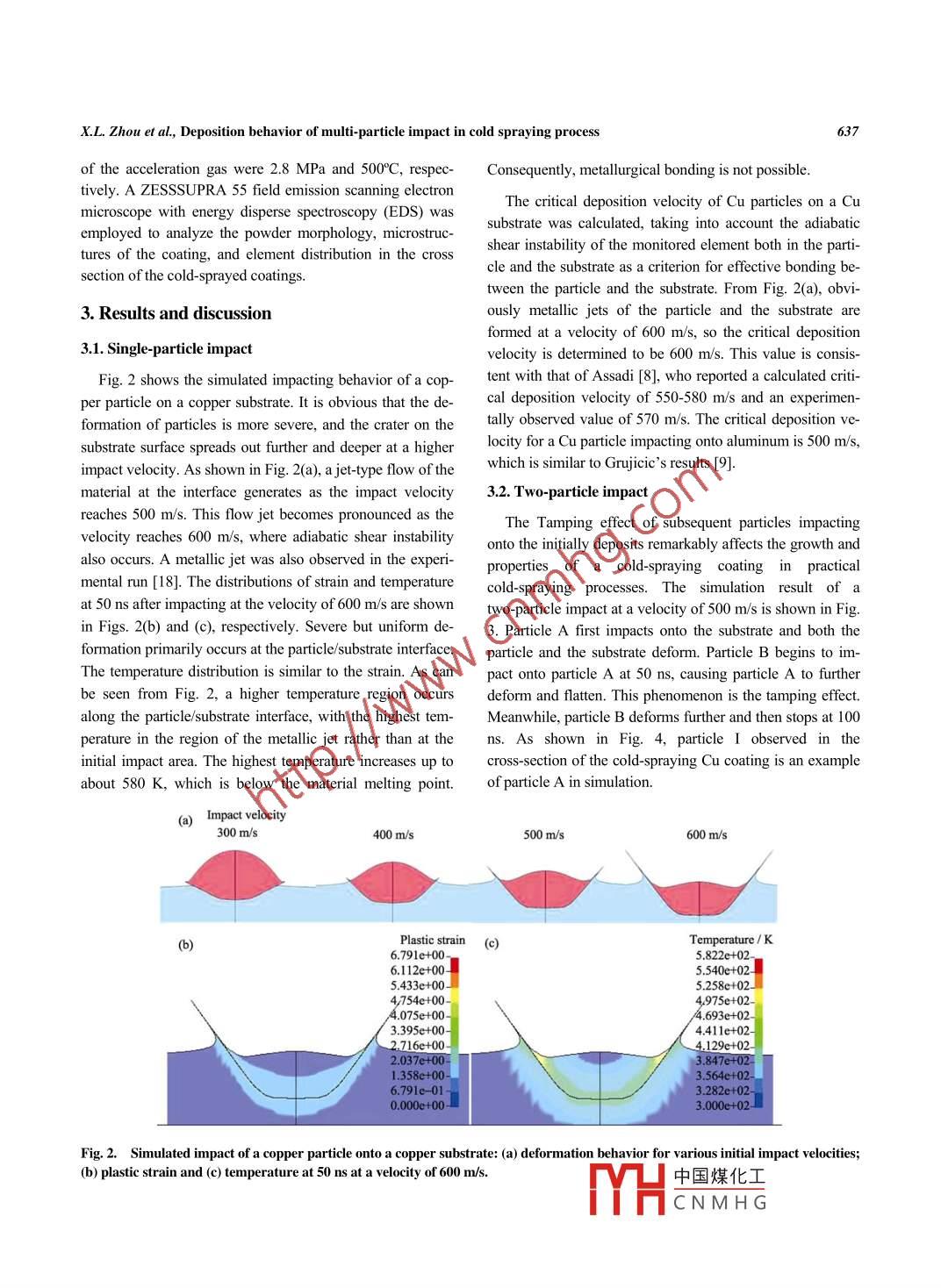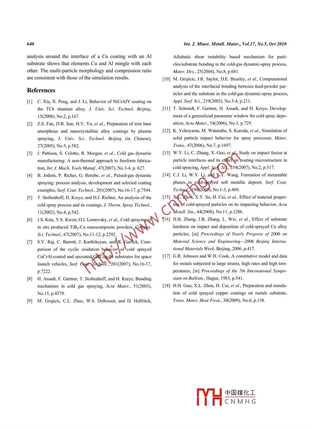 International Journal of Minerals, Metallurgy and MaterialsVolume 17, Number 5, October 2010, Page 635DOI: 10.1007/s12613-010-0367-8Deposition behavior of multi-particle impact in cold spraying processXiang-lin Zhou, Xiang-kun Wu, Hui-hua Guo, Jian-guo Wang, and Ji-shan ZhangState Key Laboratory for Advanced Metals and Materials, University of Science and Technology Bejing, Beiing 100083, China(Received: 10 December 2009; revised: 20 January 2010; accepted: 25 January 2010)Abstract: In the practical cold-spraying process, a number of particles impact onto a substrate and then form a coating. To study the defor-mation behavior and multi-particle interactions, single-particle, two-particle, and three-particle impacts were simulated using the AN-SYS/LS-DYNA version 970. A copper coating was prepared and scanning electron microscopy (SEM) was employed to analyze the micro-structures of the powders and the coating. Numerical results reveal that the critical deposition velocity is 600 m/s for a copper particle/coppersubstrate. The particles deform more fully due to multi-particle interactions, such as tamping, interlocking, and extrusion effects. The com-multi-particle morphology and compression ratio in the experiment are consistent with those of simulation results. Based on these results, thecoating of high performance can be prepared through selecting appropriate parameters and suitable pre-treatment processes.Keywords: spraying; deposition; interfaces; particle interactions; bonding; simulation[This work was financially supported by the National Natural Science Foundation of China (Nos. 50871019 cand 50874009) cand the NationalSuperiority Discipline Innovation Platform Project (SKL AMM-CS).]1. Introductionintimate conformal contact, which is beneficial to physicalbonding by Van der Waals forces. However, it is very diffi-Cold spraying is a new coating technology. Comparedcult to find experimental proofs of this type of bondingwith thermal spraying [1-2], some processes affected bymode, so far, the physical bonding mode just remains as athermally activation such as oxidation, decarburization,presumption [8]. For the metallurgical bonding, some re-phase transition, and micro-structural changes can besearchers [13-14] hold that the adiabatic temperature shouldavoided. In recent years, investigations on the cold-sprayingreach the melting point at the contact interface to achievetechnology have primarily focused on the optimization ofmetallurgical combination. This usually occurs in conditionsthe cold-spraying system [3-4] and processing parametersof a higher impact velocity or materials with lower melting[5], the development of new coating materials [6], applica-temperatures. For the mechanical bonding, Gruijicic et al.tions in specific fields [7], particle deposition behavior, and[9-10] proposed that jet-like metals may produce interfacialbonding mechanisms [8-12], etc. Numerical and experi-roll-ups and vortices through the Kelvin-Helmholtz effect,mental researches on the bonding mechanisms and deforma-which cause particles to mechanically combine on a sub-tion behavior have also been reported [8-15]. A number ofstrate. However, this view only derives from the qualitativedifferent bonding mechanisms in the particle/substrate con-tact interface, induced by adiabatic shear instability, haveanalysis and presumption.been proposed. For physical bonding, the formation ofFor the reason of the very short duration of particle im-jet-like metals at the local intensively deformed zones maypact, it is very difficult to observe the whole deformationdisrupt thin surface films such as oxides, and provideprocess of particles. Therefore, the most effective methodsCorresponding author: Xiang-lin Zhou E-mail: bkdzxl@sina.com◎University of Science and Technology Bejing and Springer-Verlag Berlin Heidelberg 2010中國(guó)煤化工包SpringerMYHCNM HG.636Int. J. Miner. Metall. Mater, Vol.17, No.5, Oct 2010in investigating the bonding mechanism between particleswhereTr is the reference temperature and Tm the meltingand substrates are numerical simulation or theoretical analy-temperature. The material parameters are taken from John-sis associated with relative experiments. Modeling of a sin-son and Cook's research [17].gle particle impacting onto a substrate using finite-elementAnalyses were performed using the models of particlemethods has been mentioned in a few studies, but few at-impact with 4-node shell elements, hourglass control, andtempts have been made to explore multi-particle effectstwo-dimensional automatic single surface contact. The La-though a number of particles impacting onto a substrate andgrangian algorithm was used for solutions based on the ba-then forming a coating in the practical cold-spraying process.sic mass, momentum, and energy conservation equations.Also, these effects have an important influence on the for-The initial kinetic energy of particles was the dominant fac-mation of a cold-spraying coating. The theory of adiabatictor in deposition behavior. Therefore, the effect of the initialshear instability and the formula of critical deposition veloc-temperature was not considered, and the substrate and parti-ity [9, 12] were presented based on numerical simulation.cle temperatures were set to 298 K.Additionally, the criterion of effective bonding is based onThe cold-sprayed particles were assumed to be spherical,the adiabatic shear instability of the particle [8-9]. In fact, ithas been confirmed experimentally that when the hardnessand the substrate was a semi-infinite thick plate. The singleof a substrate is much higher than that of the impacting par-particle model was performed to analyze the deposition be-ticles, adiabatic shear instability in the substrate is negligible.havior. A two-particle numerical model was used to studyConsequently, effective bonding is rarely achieved, even ifthe tamping effect, where the particle diameter was 20 um,the distance between the two particles wa