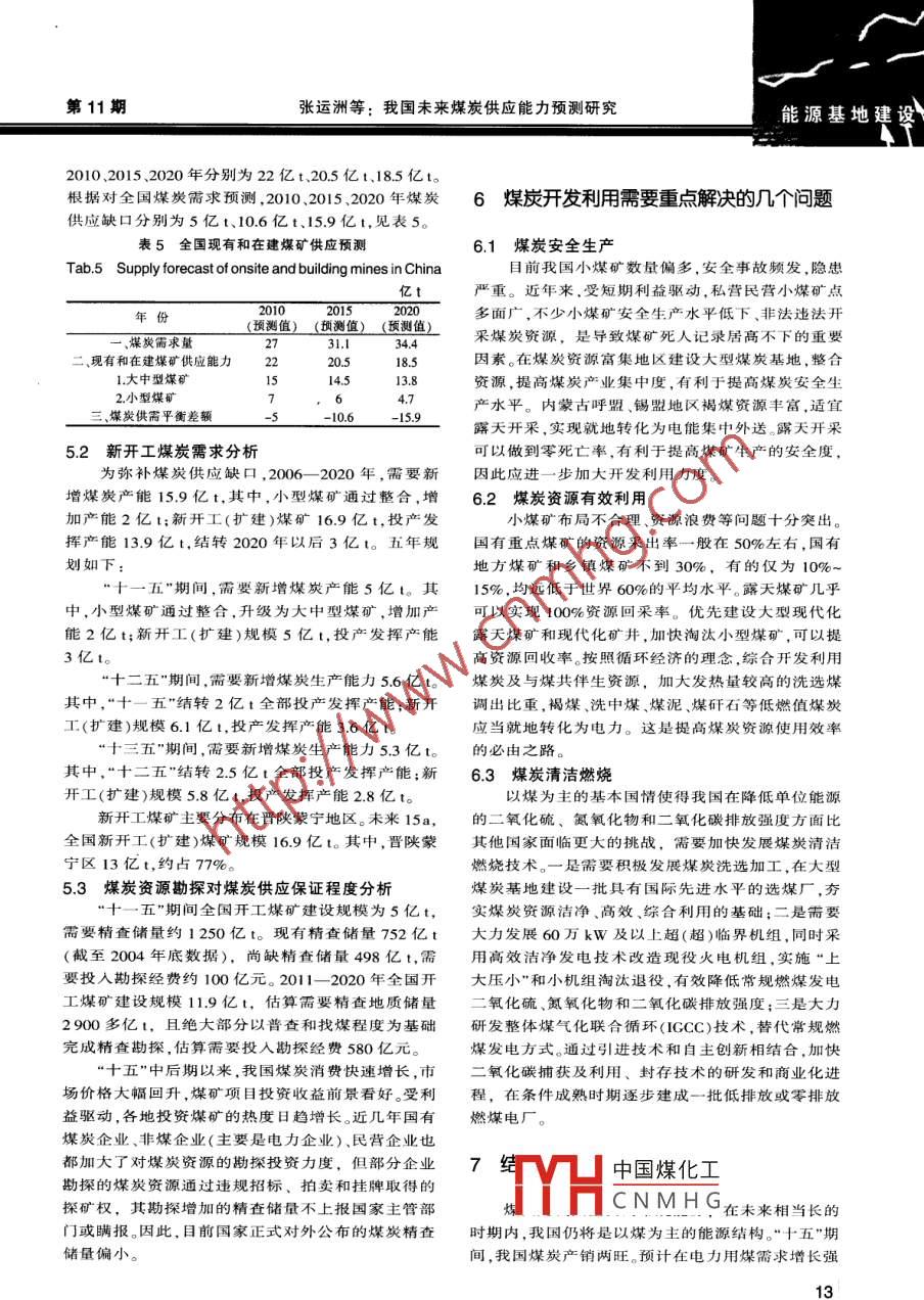 第40卷第11期中國(guó)電力Vol. 40, No.112007年11月ELECTRIC POWERNov. 2007.學(xué)能源基地建設(shè)我國(guó)未來(lái)煤炭供應(yīng)能力預(yù)測(cè)研究張運(yùn)洲,張風(fēng)營(yíng),李德波2(1.國(guó)網(wǎng)北京經(jīng)濟(jì)技術(shù)研究院,北京100761;2.中國(guó)煤炭工業(yè)發(fā)展研究中心,北京 100013)摘要: 我國(guó)化石能源資源的稟賦特征決定了在未來(lái)相當(dāng)長(zhǎng)的一段時(shí)間內(nèi),煤炭仍將是我國(guó)最重要的一次能源,煤炭作為主體能源的地位短期內(nèi)難以改變。在介紹我國(guó)煤炭資源狀況、回顧我國(guó)“十五”期間煤炭供需形勢(shì)的基礎(chǔ)上,預(yù)測(cè)2010、2015、 2020 年全國(guó)煤炭需求量分別為27.7、31.1、 34.4億t。 從資源開(kāi)發(fā)現(xiàn)狀和未來(lái)開(kāi)發(fā)潛力等角度分析,滿足我國(guó)煤炭需求的增量部分將主要由晉陜蒙寧提供,并需要逐步加大新疆等地煤炭資源的開(kāi)發(fā)力度。提出了煤炭開(kāi)發(fā)利用需要解決的問(wèn)題。關(guān)鍵詞:煤炭需求;預(yù)測(cè);生產(chǎn)布局;供應(yīng)能力中圖分類號(hào): F407.21文獻(xiàn)標(biāo)識(shí)碼: A文章編號(hào): 1004-9649(2007)11-0009-06預(yù)測(cè)1 000m以內(nèi)淺煤炭資源量為2.86萬(wàn)億t,0引言目前已累計(jì)查明約1.2萬(wàn)億t,查明程度42%。截至2005年底,全國(guó)煤炭保有資源量為10430億t,排在我國(guó)是世界上少數(shù)幾個(gè)以煤炭為主要常規(guī)能源俄羅斯和美國(guó)之后,居世界第3位。其中山西、內(nèi)蒙的國(guó)家。2005年,全球-.次能源消費(fèi)中,煤炭?jī)H占古、陜西新疆、貴州、寧夏6省(區(qū))占全國(guó)煤炭保有27.8%,而我國(guó)高達(dá)68.9%。在全國(guó)常規(guī)能源資源經(jīng)資源量的81.2%,分別居全國(guó)的第1-6位。濟(jì)可開(kāi)發(fā)探明剩余可采總儲(chǔ)量中,煤炭占87.4%,石1.2 煤炭種類油占2.8%,天然氣占0.3%,水能占9.5%(技術(shù)可開(kāi)我國(guó)煤炭種類從褐煤到無(wú)煙煤均有分布。煤質(zhì)發(fā)的水能,按使用100a計(jì)算)。盡管經(jīng)過(guò)多年努力,總體上較優(yōu)良,原煤灰分和硫分低.發(fā)熱量高,工業(yè)我國(guó)在水電開(kāi)發(fā)、沼氣建設(shè)、風(fēng)電建設(shè)、太陽(yáng)能利用用途廣泛。但肥煤、焦煤和瘦煤資源儲(chǔ)量?jī)H占保有資等方面取得了顯著的成績(jī),未來(lái)水電、風(fēng)電等可再生源量的15%左右,硫分小于1%的優(yōu)質(zhì)煉焦用煤較能源開(kāi)發(fā)將迎來(lái)持續(xù)快速增長(zhǎng)的黃金時(shí)期,但是從少,是我國(guó)稀缺煤種。總體上看,我國(guó)可再生能源在能源生產(chǎn)和消費(fèi)總量1.3煤炭分布中所占比重依舊較小,只能起到輔助調(diào)節(jié)作用。由于煤炭資源主要分布在秦嶺一大別山以北地區(qū)調(diào)整能源結(jié)構(gòu)在一-定程度上受到資源結(jié)構(gòu)的制約,(北方地區(qū)),超過(guò)90%,且集中分布在晉陜蒙寧新5以煤為主的能源資源和消費(fèi)結(jié)構(gòu)在未來(lái)相當(dāng)長(zhǎng)的一省區(qū)。秦嶺一大別山以南(南方地區(qū))占全國(guó)的比重段時(shí)間將不會(huì)發(fā)生根本性改變,使得煤炭的生產(chǎn)、供不足10%, 且集中分布在貴州和云南2省(占南方應(yīng)和高效利用成為實(shí)施我國(guó)能源發(fā)展戰(zhàn)略、確保發(fā)地區(qū)80%)。我國(guó)經(jīng)濟(jì)最發(fā)達(dá)的東部十省市(包括北電能源安全可靠供應(yīng)的重大問(wèn)題。京、遼寧、天津、河北、山東江蘇、上海、浙江、福建.廣東)保有資源儲(chǔ)量?jī)H占全國(guó)的5%。1我國(guó)煤炭資源狀況1.4 煤炭賦存條件同美國(guó)、俄羅斯、澳大利亞等煤炭資源大國(guó)相l(xiāng).1 資源總量比,我國(guó)煤層埋藏深、構(gòu)造復(fù)雜,適宜露天開(kāi)采的煤據(jù)全國(guó)第3輪煤炭資源預(yù)測(cè)資料,預(yù)測(cè)全國(guó)炭資源量約占6% ,而美國(guó)在60%左右,澳大利亞為垂深2000m以內(nèi)淺煤炭資源總量為5.57萬(wàn)億t。其中76%左右。新疆、內(nèi)蒙古、山西、陜西、貴州、寧夏6省(區(qū))占全煤層構(gòu)造與世界主要產(chǎn)煤國(guó)家相比為中等偏下國(guó)煤炭資源總量的87%,分別居全國(guó)的第1~6位。水平中國(guó)煤化工十布在山西陜西、收稿日期: 2007-09-25MHCNMHG作者簡(jiǎn)介:張運(yùn)洲(1962-),男,遼寧營(yíng)口人,高級(jí)工程師(教授級(jí)),院長(zhǎng),從事能源規(guī)劃.全國(guó)聯(lián)網(wǎng)規(guī)劃研究等工作。E-mail:zhangyunzhou@chinasperi.com.cn熊源基地建設(shè)中國(guó)電力第40卷內(nèi)蒙古、寧夏、新疆5省區(qū)。界煤炭產(chǎn)量的37%,占我國(guó)一次能源生產(chǎn)總量的我國(guó)煤礦瓦斯較高,嚴(yán)重影響煤礦安全。國(guó)有重76.3%。點(diǎn)煤礦中,高瓦斯和煤與瓦斯突出礦井?dāng)?shù)量接近截至2005年底,全國(guó)煤礦數(shù)量約2.2萬(wàn)處,煤50%;國(guó)有地方煤礦和鄉(xiāng)鎮(zhèn)煤礦中,高瓦斯和煤與瓦炭生產(chǎn)能力21.7億t。按井型分類,大中型煤礦11.7斯突出礦井?dāng)?shù)量占1/4以上。億t、占53.9%,小型煤礦10 億t、占46.1%;按所有1.5資源開(kāi)發(fā)現(xiàn)狀.制分類,國(guó)有重點(diǎn)煤礦10.2億t、占47%,國(guó)有地方在煤炭10430億t保有資源量中,已占用(已劃煤礦3億t、占13.8%,鄉(xiāng)鎮(zhèn)煤礦8.5億t、占39.2%。給生產(chǎn