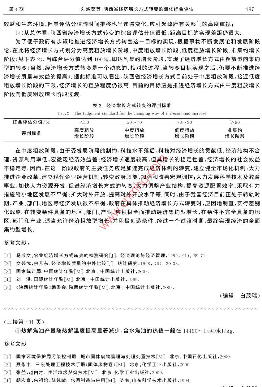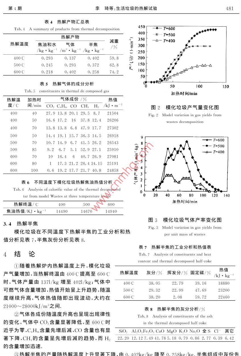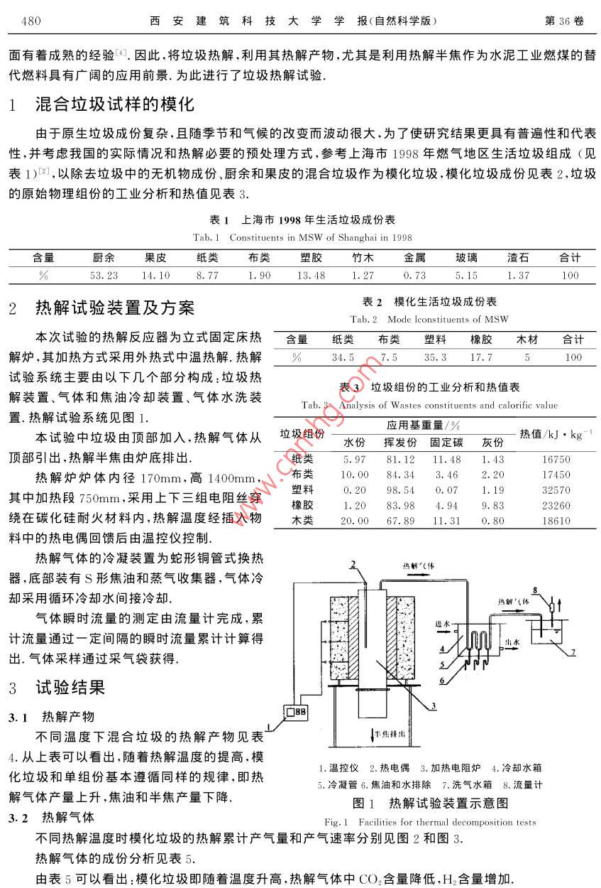 第36卷第4期西安建筑科技大學(xué)學(xué)報(bào)(自然科學(xué)版)Vol 36 No 42004年12月Xi'an Univ. of Arch. & Tech (Natural Science Edition)Dec.2004生活垃圾的熱解試驗(yàn)李琦,徐德龍,李輝,肖國先,王堤,吳華夏(西安建筑科技大學(xué)粉體工程研究所,陜西西安710055)摘要:利用實(shí)驗(yàn)室規(guī)模的試驗(yàn)裝置實(shí)施了垃圾中溫?zé)峤庠囼?yàn),在400至600℃的條件下熱解混合有機(jī)垃圾.經(jīng)測定,熱解產(chǎn)生的半焦熱解達(dá)22460kJ/kg,同時(shí)產(chǎn)生了熱解氣體其熱值大約在21000kJ/m3以上,以及含水焦油的熱值近1500kJ/kg.熱解半焦因其影響熟料燒成的有害成份少又易于加工,可作為替代燃料用于水泥熟料鍛燒,熱解氣體和焦油可作燃料使用為熱解提供熱量.關(guān)鍵詞:熱解;半焦;城市生活垃圾中圖分類號(hào):X705文獻(xiàn)標(biāo)識(shí)碼:A文章編號(hào):1006-7930(2004)04-047903Research on the pyrolysis of MSWli Qi, XU De-long, LI Hui, XIAO Guo-rian, WANG Ti, wu hua-xia(Institude of Powder Eng. Xi'an Univ. of Arch. & Tech, Xi'an 710055, China)Abstract: An experimental project was carried out to dispose solid waste by thermal decomposition, using laboratoryfacilities. The tests were conducted under temperature ranging from 400 to 600C and decomposed solid organic wastemixture of various sources. Measurements indicated that the half-coke produced from thermal decomposition had theheat content of 22460kJ/kg. At he same time. the gases from thermal decomposition had the calorific value of about21000kJ/m". And the heat content in the water-containing-tar produced was about 15000kJ/kg. The thermal-derivedhalf-coke may be used as fuel because clinker firing for its constituents that are harmful to cement is minor and it iseasily handled by conventional jet burners. The thermal decomposed gases and water-containing tar may be used asuel to offer heat for the thermal processKey words pyrolysis; char from the mixed organic solid waste: MSW隨著城市化進(jìn)程的加快,生活垃圾旳產(chǎn)生量逐年增加,傳統(tǒng)旳垃圾墳埋和焚燒處理技術(shù)很難適應(yīng)對(duì)環(huán)境保護(hù)和能量利重要用日益嚴(yán)格的要求,外熱式垃圾熱解技術(shù)可以有效解決環(huán)境污染和能量利用的問題,是垃圾處理技術(shù)的研究和發(fā)展方向112.熱解法雖可得到有利用價(jià)值的中間原料,長期以來熱解產(chǎn)物的利用主要集中在熱解氣和焦油方面,而熱解半焦合理利用的研究卻很少.利用方式之一是將熱解產(chǎn)物轉(zhuǎn)化為一種穩(wěn)定的儲(chǔ)存性能源,如單純的制氣和制油,實(shí)踐證明都不很成功;再次是將熱解產(chǎn)物進(jìn)一步燃燒,但該法和垃圾焚燒一樣都存在余熱利用的問題,一般的辦法是進(jìn)行余熱發(fā)電,而熱效率仍然很低.水泥工業(yè),尤其是以新型干法水泥工藝為標(biāo)志的現(xiàn)代水泥工業(yè)在生活垃圾處理方面具有許多獨(dú)特的優(yōu)點(diǎn),其水泥煅燒系統(tǒng)不僅可以處理多種有害氣體和重金屬,且在使用燃?xì)?、燃油和低熱值燃料?80西安建筑科技大學(xué)學(xué)報(bào)(自然科學(xué)版)第36卷面有著成熟的經(jīng)驗(yàn).因此,將垃圾熱解,利用其熱解產(chǎn)物,尤其是利用熱解半焦作為水泥工業(yè)燃煤的替代燃料具有廣闊的應(yīng)用前景.為此進(jìn)行了垃圾熱解試驗(yàn).1混合垃圾試樣的?;捎谠煞輳?fù)雜,且隨季節(jié)和氣候的改變而波動(dòng)很大,為了使研究結(jié)果更具有普遍性和代表性,并考慮我國的實(shí)際情況和熱解必要的預(yù)處理方式,參考上海市1998年燃?xì)獾貐^(qū)生活垃圾組成(見表1)2,以除去垃圾中的無機(jī)物成份、廚余和果皮的混合垃圾作為?;??;煞菀姳?,垃圾的原始物理組份的工業(yè)分析和熱值見表3.表1上海市1998年生活垃圾成份表Tab. 1 Constituents in MSw of Shanghai in 1998含量余果皮紙類布類塑膠竹木金屬玻璃渣石合計(jì)53.2314.100.732熱解試驗(yàn)裝置及方案表2模化生活垃圾成份表Tab 2 Mode Constituents of Msw本次試驗(yàn)的熱解反應(yīng)器為立式固定床熱含量紙類布類塑料橡膠木材合計(jì)解爐,其加熱方式采用外熱式中溫?zé)峤?熱解%34.57.535.317.75試驗(yàn)系統(tǒng)主要由以下幾個(gè)部分構(gòu)成:垃圾熱表3垃圾組份的工業(yè)分析和熱值表解裝置、氣體和焦油冷卻裝置、氣體水洗裝Tab. 3 Analysis of Wastes constituents and calorific value置.熱解試驗(yàn)系統(tǒng)見圖1.應(yīng)用基重量/%本試驗(yàn)中垃圾由頂部加入,熱解氣體從垃圾組份水份揮發(fā)份固定碳灰份熱值/kJ·kg頂部引出,熱解半焦由爐底排出紙類5.9781.1211.481.4316750熱解爐爐體內(nèi)徑170mm,高1400mm,布類084.343.462.2其中加熱段750mm,采用上下三組電阻絲穿塑料0.2098.540.072570橡膠1.2083.984.949.8323260繞在碳化硅耐火材料內(nèi),熱解溫度經(jīng)插入物木類20.0067.89--1.310.808610料中的熱電偶回饋后由溫控儀控制熱解氣體的冷凝裝置為蛇形銅管式換熱熱解氣佧器,底部裝有S形焦油和蒸氣收集器,氣體冷卻采用循環(huán)冷卻水間接冷卻.熱解氣體氣體瞬時(shí)流量的測定由流量計(jì)完成,累計(jì)流量通過一定間隔的瞬時(shí)流量累計(jì)計(jì)算得不同溫度下混合垃圾的熱解產(chǎn)物魯<⑧出.氣體采樣通過采氣袋獲得3試驗(yàn)結(jié)果3.1熱解產(chǎn)物↓焦出4.從上表可以看出,隨著熱解溫度的提高,?;蛦谓M份基本遵循同樣的規(guī)律,即熱1.溫控儀2.熱電偶3.加熱電阻爐4.冷卻水箱5.冷凝管6.焦油和水
