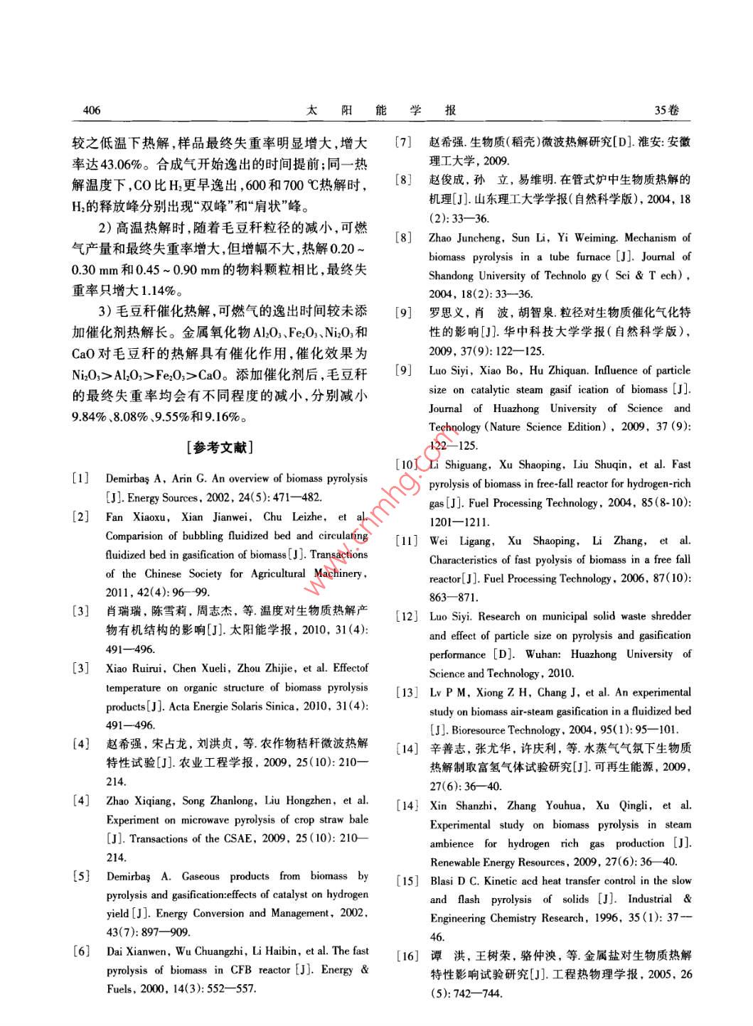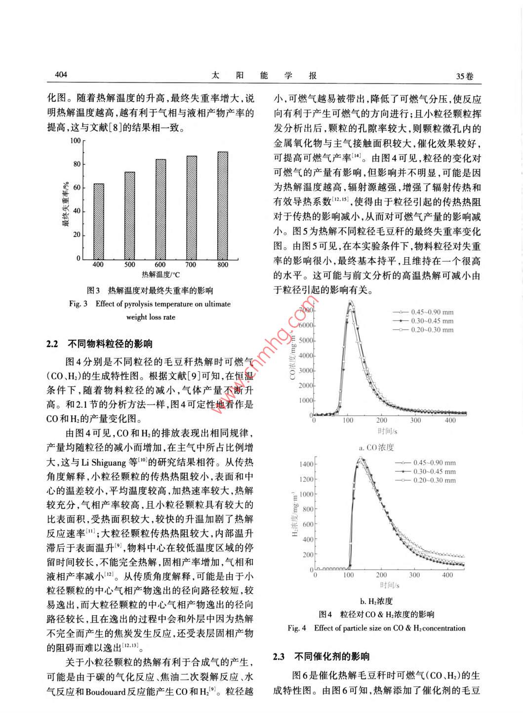 第35卷第3期太陽能學(xué)報(bào)Vol 35, No. 32014年3月ACTA ENERGIAE SOLARIS SINICA文章編號:02540096(2014)03-040206毛豆稈熱解實(shí)驗(yàn)研究李龍君,馬曉茜,胡志鋒(華南理工大學(xué),能源高效清潔利用廣東普通高校重點(diǎn)實(shí)驗(yàn)室,廣州510640)摘要:以毛豆稈為實(shí)驗(yàn)原料,研究不同熱解溫度、物料粒徑和金屬氧化物催化劑對毛豆稈熱解產(chǎn)生的可燃?xì)?COH)生成特性和最終失重率的影響。實(shí)驗(yàn)發(fā)現(xiàn),提高熱解溫度,可燃?xì)獾漠a(chǎn)量和最終失重率增大;高溫?zé)峤鈺r(shí),毛豆稈粒徑對熱解的影響很小,最終失重率維持在約93%;金屬氧化物AlO3、Fe:O3、NiO3和CaO催化熱解毛豆稈,可提高可燃?xì)獾漠a(chǎn)量,但會(huì)減小最終失重率減小率最大可達(dá)984%。關(guān)鍵詞:毛豆稈;熱解溫度;粒徑;催化劑;可燃?xì)?最終失重率中圖分類號:TK6;S2162文獻(xiàn)標(biāo)識碼:A0引言最后用分樣篩篩分,得到粒徑小于0.20mm、0.20030mm、0.30~045mm和045~0.90mm的樣品,熱解是生物質(zhì)高效利用的處理方法之一。通裝進(jìn)密封袋,放進(jìn)干燥皿內(nèi)備用。參照GB212-91過對生物質(zhì)進(jìn)行熱解,可得到高品位的半焦、焦油和對毛豆稈樣品進(jìn)行工業(yè)分析,分析結(jié)果為:水分M可燃?xì)?,并達(dá)到對農(nóng)業(yè)廢棄物的減量化、無害化、7.98%、灰分An8.21%、揮發(fā)分V70.03%、固定碳資源化處理的目的,是處理生物質(zhì)資源的有效方FC13.78%。法。對于玉米秸稈、稻殼和麥稈等生物質(zhì)的熱解特12實(shí)驗(yàn)裝置性,國內(nèi)外的研究者已做了很多有價(jià)值的研究2但關(guān)于毛豆稈的熱解特性的研究未見報(bào)道。實(shí)驗(yàn)裝置如圖1所示,包括自帶熱電偶的管式本文以定向產(chǎn)生可燃?xì)?CO、H2)為目標(biāo),采用爐、溫控儀、冷凝管、載氣瓶、浮子流量計(jì)、集氣袋、管式爐實(shí)驗(yàn)臺對毛豆稈進(jìn)行熱解實(shí)驗(yàn)研究不同熱廢氣處理裝置、 Testo350-s煙氣分析儀和計(jì)算機(jī)。解溫度、物料粒徑和催化劑對毛豆稈熱解的影響,在前人的研究基礎(chǔ)上,利用煙氣分析儀測得不同工況下目標(biāo)氣體含量變化,間接分析目標(biāo)氣體的產(chǎn)量變化規(guī)律的簡便方法,為進(jìn)一步研究毛豆稈的熱解機(jī)理和高效合理利用毛豆稈資源提供一定的理論依據(jù)。1實(shí)驗(yàn)1.氮?dú)馄?.浮子流量計(jì)3.管式爐4.溫控儀5集氣袋6.廢氣處理裝置7.計(jì)算機(jī)8.煙氣分析儀9.冷凝管11原料選取與制備圖1實(shí)驗(yàn)裝置實(shí)驗(yàn)用毛豆稈取自廣東省梅州市梅縣程江鎮(zhèn)菜地。毛豆稈采摘后先自然曬干,在干燥箱內(nèi)(恒實(shí)驗(yàn)以N2為載氣,流量為0m/h,物料在管式溫105℃)干燥24h,對干燥后的毛豆稈進(jìn)行粉碎,爐內(nèi)熱解,爐內(nèi)溫度通過溫控儀和熱電偶配合收稿日期:2011-12-13基金項(xiàng)目:國家自然科學(xué)基金(50906025)通倌作者:馬曉茜(1964—-),男,博土、教授、博士生導(dǎo)師,主要從事高效低污染燃燒、生物質(zhì)及固廢能源利用方面的研究epxma@scut.edu.cn3期李龍君等:毛豆稈熱解實(shí)驗(yàn)研究403控制,煙氣一部分經(jīng)兩級冷凝管冷凝過濾,再升高有助于毛豆稈內(nèi)含氧官能團(tuán)的斷裂、重組,使由煙氣分析儀進(jìn)行煙氣分析(數(shù)據(jù)采集時(shí)間間隔設(shè)CO大量逸出,且800℃熱解時(shí)的CO體積濃度峰值為1s,測量數(shù)據(jù)由計(jì)算機(jī)實(shí)時(shí)記錄);另一部分用集較其他溫度時(shí)大。由圖2b可知,當(dāng)熱解溫度為400氣袋收集,做進(jìn)一步研究,最后用廢氣處理裝置對和500℃時(shí)幾乎無H2產(chǎn)生,隨著熱解溫度的升高,H2剩余煙氣作無害化處理。此外,實(shí)驗(yàn)裝置還包括精產(chǎn)量增大,這與A. Demirbas3的研究結(jié)果相同,且H2度為0001g的天平和DFY-300C粉碎機(jī)、101A型干體積濃度峰值增大,說明熱解溫度越高,H2的生成燥箱和干燥皿等物料處理裝置。反應(yīng)越劇烈,即高溫?zé)峤庥欣谏镔|(zhì)的二次熱13實(shí)驗(yàn)方法解,主要是焦炭的轉(zhuǎn)化和焦油的裂解6。當(dāng)熱解溫連接煙氣分析儀,開啟管式爐,先持續(xù)通人高度為600℃時(shí),H的釋放峰出現(xiàn)“雙峰”,而熱解溫度純N約15mn(保持流量為0.1m/h),以保證石英管為700℃時(shí),H的釋放峰出現(xiàn)“肩狀”峰,且800℃內(nèi)為純惰性氣氛。在恒溫?zé)峤鈱?shí)驗(yàn)中每次取粒徑時(shí),H1體積濃度下降減緩,這是因?yàn)闅庀喈a(chǎn)物中的小于02mm的毛豆稈01g,分別在400、500、600、CH4在溫度高于600℃時(shí)就會(huì)分解,產(chǎn)生大量H2,700和800℃的溫度下熱解;做不同粒徑的熱解實(shí)驗(yàn)m由于熱解溫度的不同,則毛豆稈的升溫速率和所時(shí),分別取0.20~0.30mm、0.30~045mm和0.45~能達(dá)到的終溫不同,表現(xiàn)為CH4分解釋放的H2對于090mm的毛豆稈各01,依次在管式爐內(nèi)(800℃)產(chǎn)量的貢獻(xiàn)階段不同,即隨著熱解溫度的升高,熱解;做添加不同催化劑的熱解實(shí)驗(yàn)時(shí),取一個(gè)干CH4分解大量釋放H2的階段從熱解直接產(chǎn)生H2的凈的玻璃器皿,加入1.8g粒徑小于0.2mm的毛豆稈濃度下降段向濃度上升段偏移。和02g催化劑(即加入10%催化劑),充分?jǐn)嚢韬?圖3為不同熱解溫度下毛豆稈的最終失重率變?nèi)?.1g進(jìn)行熱解實(shí)驗(yàn)(800℃),催化劑分別選用400C500CAl2O3、Fe2O3