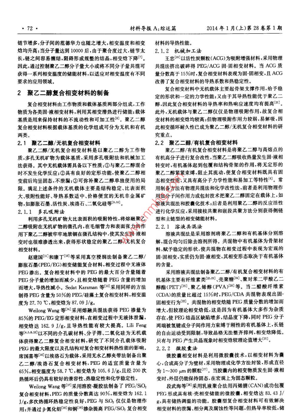 聚乙二醇復(fù)合相變材料的研究進(jìn)展/何麗紅等·71·聚乙二醇復(fù)合相變材料的研究進(jìn)展何麗紅2,李文虎,李菁若1,佟禹1,朱洪洲12(1重慶交通大學(xué)土木建筑學(xué)院,重慶400074;2重慶交通大學(xué)交通土建材料國(guó)家地方聯(lián)合工程實(shí)驗(yàn)室,重慶400074)摘要綜述了以聚乙二醇( Polyethylene glycol,PEG)為工作物質(zhì)的復(fù)合相變材料的研究進(jìn)展,重點(diǎn)介紹了聚乙二醇的熱物性參數(shù)、聚乙二醇復(fù)合相變材料的類別、制備方法及研究現(xiàn)狀,分析了聚乙二醇復(fù)合相變材料研究和應(yīng)用中存在的問(wèn)題及發(fā)展前景。關(guān)鍵詞聚乙二醇復(fù)合相變材料制備中圖分類號(hào):TB34文獻(xiàn)標(biāo)識(shí)碼:AResearch Progress of Polyethylene Glycol Composite Phase Change MaterialsHE Lihong, 2, LI Wenhu, LI Jingruo', TONG Yu, ZHU Hongzhou,(1 School of Civil Engineering & Architecture, Chongqing Jiaotong University, Chongqing 400074; 2 The NationalJoint Engineering Laboratories of Traffic Civil Materials, Chongqing Jiaotong University, Chongqing 400074)Abstract Research progress of polyethylene glycol (PEG) composite phase change materials is summarizedand thermophysical parameters of polyethylene glycol, categories, preparation methods and research status of polyethylene glycol composite phase change materials are focused on. Moreover, the problems and foregrounds of polyethy-lene glycol composite phase change materials are proposed.Key words polyethylene glycol, composite phase change materials, preparation0引言20000等的聚合物。表1為分子量從1000~20000的聚乙二醇的熱物性參數(shù),樣品由天津光復(fù)精細(xì)化工廠生產(chǎn),經(jīng)相變儲(chǔ)能技術(shù)是一項(xiàng)將能量以相變潛熱的形式進(jìn)行高真空干燥處理,測(cè)試儀器為 Netzsch-STA49C綜合熱分析密度儲(chǔ)存的高新技術(shù)可解決能量供求在時(shí)間和空間上不匹儀,保護(hù)氣和沖掃氣為高純氮,升溫速度為10℃/min配的矛盾,在能源利用和節(jié)能領(lǐng)域具有廣闊的應(yīng)用前景。實(shí)表1聚乙二醇的熱物性參數(shù)現(xiàn)儲(chǔ)能技術(shù)的核心和基礎(chǔ)是相變儲(chǔ)能材料,簡(jiǎn)稱相變材料Table 1 Thermophysical parameters of PEG( Phase change materials,PCM),研究和開(kāi)發(fā)相變潛熱大、性參數(shù)能穩(wěn)定和性價(jià)比高的相變材料是相變儲(chǔ)能技術(shù)的熱點(diǎn)課Tm/℃Tp/℃Ta/℃△Ha/(J/g題2樣品PEG100029.045.676.778.6聚乙二醇( Polyethylene glycol,PEG)具有適宜的相變溫PEG150033.557.387.8150.1度,較高的相變潛熱,且無(wú)過(guò)冷和相分離、腐蝕性小、性能穩(wěn)定等優(yōu)點(diǎn)而受到廣泛的關(guān)注,但在使用過(guò)程中易滲漏使其在PEG200042.090.9163.1PEG40004564.7172.0實(shí)際應(yīng)用中受限4。聚乙二醇復(fù)合相變材料是解決上述矛盾的有效途徑之一,它既能有效克服聚乙二醇易滲漏、導(dǎo)熱PEG600046.966.7175.0PEG800047.667.797.21772系數(shù)低和密度小等缺點(diǎn),又能改善其應(yīng)用效果。因此,聚PEG1000050.3乙二醇復(fù)合相變材料已成為新型相變材料研究領(lǐng)域的熱點(diǎn)。PEG20000本文結(jié)合近年來(lái)國(guó)內(nèi)外在聚乙二醇復(fù)合技術(shù)的研究成果,重點(diǎn)論述聚乙二醇復(fù)合相變材料的制備方法與研究進(jìn)展。注:T一相變起始溫度;T。一相變終止溫度;T—相變峰溫;△H一相變焓1聚乙二醇的熱物性由表1可看出,聚乙二醇相變具有明顯的分子量依賴聚乙二醇是由(CH2CH2On組成的長(zhǎng)鏈高分子,兩端性,其相變溫度和相變焓均隨著分子量的增加而增大,但超為羥基,由于聚合度不同,可形成一系列平均分子量從200~過(guò)10000后相變焓反而降低。聚乙二醇分子量增加時(shí),結(jié)晶兼國(guó)家自然科學(xué)基金(51178491);交通運(yùn)輸部科技項(xiàng)目(2012319814200);重慶市科技重點(diǎn)攻關(guān)計(jì)劃項(xiàng)目(CSTC201AB6067)何麗紅:女,1978年生,講師,博士生,主要從事材料結(jié)構(gòu)與性能的研究 E-mail2 sunnyhlh@126.cm朱洪洲;通訊作者,男,1976年生,博士,教授,主要從事路基路面新結(jié)構(gòu)與新材料方面的研究Emil:zhuhongzhouchina@126.com·72·材料導(dǎo)報(bào)A:綜述篇2014年1月(上)第28卷第1期鏈節(jié)增多,分子間的范德華力也隨之增大,相變溫度和相變材料的導(dǎo)熱性能。焓均升高;當(dāng)分子量達(dá)到10000后,由于聚合度過(guò)大,鏈節(jié)太2.1.2機(jī)械加工法長(zhǎng),鏈之間容易纏結(jié),阻礙形成規(guī)整的結(jié)晶,相變焓下降王忠以活性炭顆粒(ACG)為吸附增強(qiáng)材料,采用物理因此,通過(guò)控制聚乙二醇分子量大小或?qū)⒉煌肿恿抗不炜晒不旆〝D出破碎得PEG/ACG固固相變材料。當(dāng)ACG質(zhì)獲得一系列相變溫度的儲(chǔ)能材料,以適應(yīng)對(duì)相變溫度有不同量分?jǐn)?shù)高于15%時(shí),復(fù)合相變材料表現(xiàn)為固固相變,且ACG要求的應(yīng)用領(lǐng)域改善了復(fù)合相變材料的導(dǎo)熱系數(shù)和熱穩(wěn)定性2聚乙二醇復(fù)合相變材料的制備復(fù)合相變材料中無(wú)機(jī)載體主要起骨架支撐作用給予穩(wěn)定的形狀和一定的力學(xué)性能;又由于其導(dǎo)熱性能優(yōu)于聚乙二復(fù)合相變材料由工作物質(zhì)和載體基質(zhì)兩部分組成,工作醇因此復(fù)合相變材料的導(dǎo)熱率和熱響應(yīng)速度均有提高2]。物質(zhì)為各類固液相變材料,利用其相變潛熱進