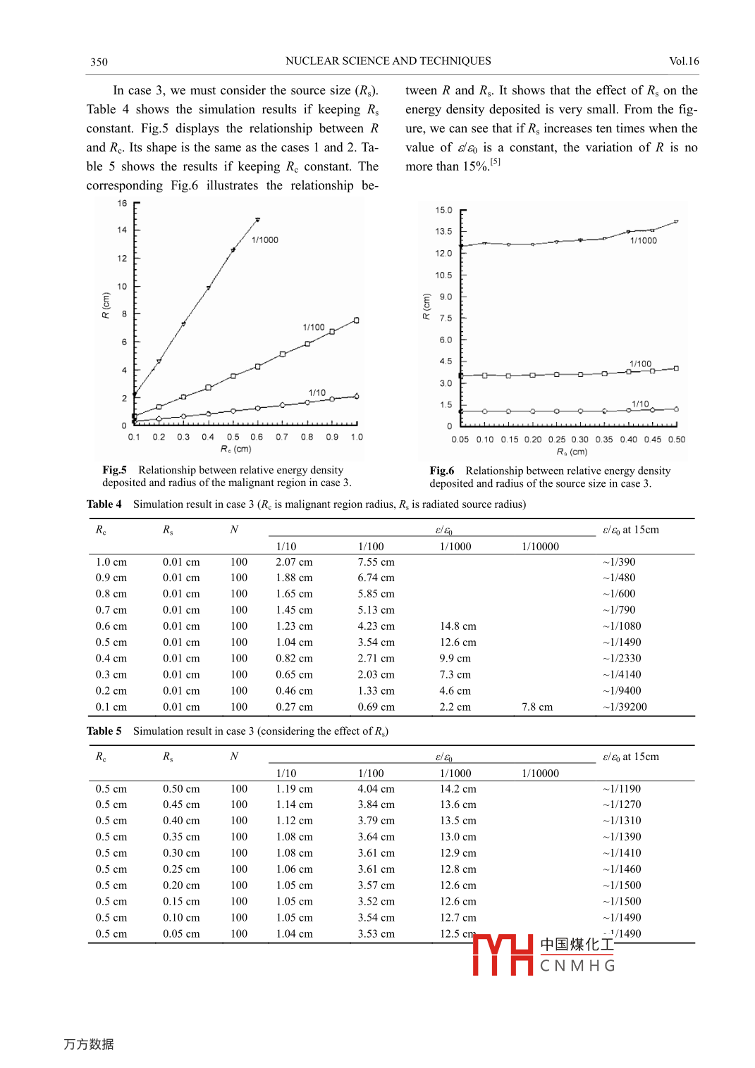 Vol.16 No.6NUCLEAR SCIENCE AND TECHNIQUESDecember 2005Simulation of distribution of radiation energydensity in water ballsTANG Shi-Biao'*, MA Qing-Li, YIN Ze-Jie', TANG Yu', HUANG Huan', RAO Nan-Xia', ZHU Da-Ming2( ' Department of Modern Physics, University of Science and Technology of China, Hefei 230026, China;2 Department of Physics, University of Missouri-Kansas City, Kansas City, Missouri 64110, USA)Abstract The distribution of energy deposition density in radiate region and its surrounding areas from γy-rays wassimulated and analyzed for a water-ball model with Geant4 package ( Geant4.7.0,2005 ) developed by CERN (theCenter of European Research of Nucleus). The results show that the distribution depends strongly on the collimat-ing condition of radiation beam. A well-collimated beam would reduce radiation effects on surrounding areas.Key words Water ball, Radiation energy density distribution, Energy deposition, Geant 4CLC numbers TN25, 0571.33IntroductionComputer simulationIn this work, we have carried out a numericalWe have used a Monte Carlo program, Geant 4,simulation on energy deposition from γ-rays generatedwhich is a toolkit designed initially for simulating nu-by ""Co sources under different collimating conditionsclear and high energy physics experiments, but in re-and hope to shed light on how to optimize the size of acent years has been applied in a wide range of subjectsradiation beam and its collimation.including radiation analysis, space and cosmic rayFig. 1 ilustrates a typical situation, where regionanalysis and, more recently, medical oncology analy-A (malignant tissue) represents the area that need to besis and evaluations. The toolkit is based on the ob-radiated, region B represents the immediate surround-ject oriented technology. It provides transparency forings of region A. The radiation passes through regionimplementation of various physics parameters.B before entering region A and it penetrates throughA set of models that describes the interaction ofregion B. In addition, the interaction of the radiationphotons and electrons with matters at low energies haswith atoms and molecules in region A could generatebeen implemented in the toolkit. The physical proc-secondary radiation effect in region B. In order toesses involved include photoelectric effect, Comptonminimize the radiation effect on region B, a number ofscattering, Raleigh effect, Bremsstrahlung and ioniza-factors need to be considered and adjusted.tion.2J A low energy limit for particle interaction cor-responding to the minimal energy within the validityrange of the models is denied. A higher threshold forSecondary radiation二==any specific application can be alternatively definedRadiationby user.B]Region BGeant 4 is supported under various operatingRegion Asystems. In our simulation, we used the one underLinux (Redhat8). The simulation was run on dedicatedFig.1 Effect of radiation on tssue.Pentium-IV personal computers.Supported by“Hundred people Plan Fund" of CAS* Corresponding author中國煤化工Received date: 2005-07-04MHCNMH G.NUCLEAR SCIENCE AND TECHNIQUESVol.163 Simulation methody-rays at these two different energies and at an aver-aged energy of 1.25 MeV. Our simulation shows thatThe radiation source used in the simulation isthe difference in the energy deposition for Y-rays at°0Co which emits y-rays with two dfferent energies atthese different energies is not significant. Thus in1.333 and 1.173 Mev.!4] Table 1 gives radiation char-the following we only display the results obtained foracteristics of °'Co. We do simulation by consideringγ-rays of 1.333MeV.Table 1 Radiation characteristic of 6°CoSymbolHalflife (a)Disintegration type and energy (MeV)Production method__γ60Co5.263(63)0.318(99.9%)1.173(99.86%)S9Co(n,r)1.491(0.1%).33399.98%)5Co(d,p)We assumed that the radiate region has a spheri-The first one is that the radiation source is a pointcal shape, thus the situation can be modeled as a wa-source and the radiated Y-ray is perfectly collimated,ter-ball with center region being the radiate part and(in this model we assume that the point source is athe other areas being the surrounding areas. The waterperfect point, so the Y-ray radiation from the source isball in the simulation was divided evenly into N shellsalso a perfect beeline) as shown in Fig.2(a). The sec-with each shell thickness to be (R- -RJ)IN, where R andond case is that the γ radiation source is a point source,R。are the radius of the water ball and the radiate re-but the radiated Y-ray is spread over an angle 0, andgion,respectively. In most cases, we choose N= 100.the angle θ satisfies sinθ RJL, where R。is the radiusThe energy deposition is integrated for each shell. Theof the malignant tissues, as shown in Fig.2(b).Theradius of the water ball was chosen to be 15 cm.third case is that radiated γY-ray remains to be perfectlycollimated, but the size of the source and the beam tobe a nonzero Rs as shown in Fig.2(c). A combinationr 1.33MleVof the second and the third cases allows one to resem-ble a case close to a realistic radiation source.(a)Case 1Results and discussions。。From the simulation, we got the energy deposited+HE中井(GeV) of different radial shell and the average energy↓R.density deposited (GeV/cm') in a given shell. For case1 and case 2, when calculating the density, since what(b)Case2we care is only the comparative tendency, we can ig-- FR←nore the constant 4π/3 and R'. Table 2 and Table 3display respectively the results of case 1 and case 2.From the values under the different ratio of e/80(where ε is energy density deposited in a given shelland &0 is the averaged energy density deposited in themalignant region) on the different radiate region size,↓↓↓(C) Case 3we can obtain that if the radiate region size increases,Fig.2 Various Y-ray source-water ball configurations.energy density deposited in a given shell falls offWe first focus on the r/-ray radiation from theslower and slower 