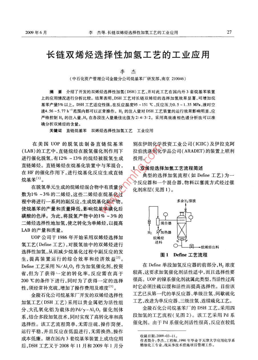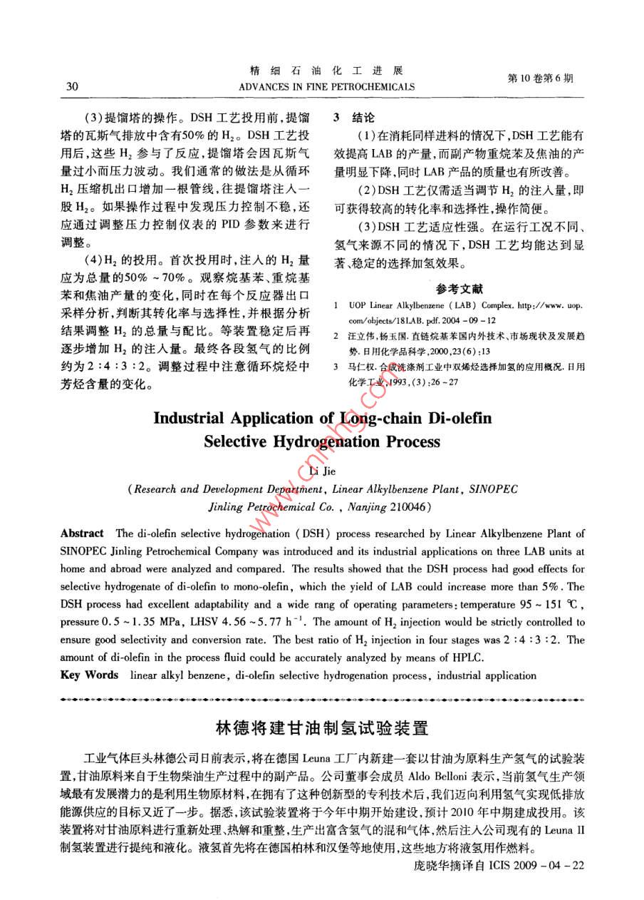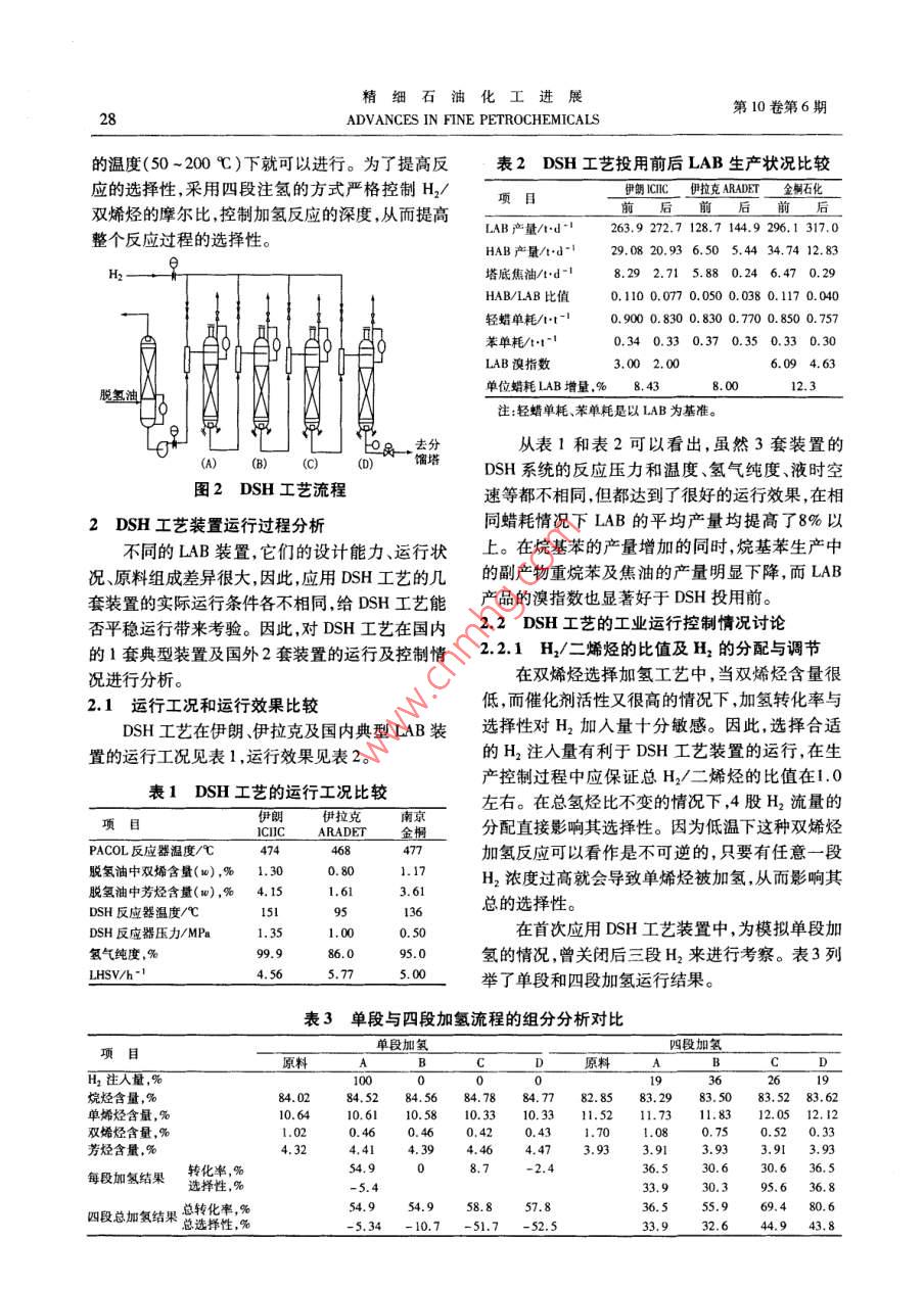 2009年6月李杰等. 長鏈雙烯烴選擇性加氫工藝的工業(yè)應(yīng)用27長鏈雙烯烴選擇性加氫工藝的工業(yè)應(yīng)用(中石化資產(chǎn)管理公司金陵分公司烷基苯廠研發(fā)部,南京210046)摘要介紹了開發(fā)的雙烯烴選擇性加氫( DSH)工藝,并對此工藝在國內(nèi)外3套烷基苯裝置上的應(yīng)用情況進(jìn)行分析比較。結(jié)果表明,DSH工藝對長鏈雙烯烴的選擇加氫效果顯蓍,可增加烷基苯產(chǎn)量5%以上。DSH 工藝適應(yīng)性強(qiáng),在反應(yīng)溫度95~151 C、反應(yīng)壓力0.5~ 1.35 MPa、液時(shí)空速4.56 -5.77 h-'范圍內(nèi)都可以正常操作。H, 的注人量對DSH工藝裝置的運(yùn)行效果影響明顯,應(yīng)嚴(yán)格控制H,的注人量,H,在各段注人量最佳比值為2:4:3:2。采用高效液相色譜分析法可以準(zhǔn)確分析雙烯烴的含量。關(guān)鍵詞直鏈烷基苯 雙烯烴選擇性加氫工藝 工業(yè)應(yīng)用在美國UOP的脫氫法制備直鏈烷基苯別在伊朗化學(xué)投資工業(yè)公司(ICIIC)及伊拉克阿(LAB)的工藝中,直鏈烷烴在脫氫催化劑作用下拉伯洗滌劑化學(xué)品公司( ARADET)的裝置上順利進(jìn)行催化脫氫,有12%~13%的烷烴被脫氫生成投用。直鏈烯烴。直鏈烯烴在烷基化裝置中與苯混合,1雙烯烴選擇 加氫工藝流程簡述在HF的催化作用下,進(jìn)行烷基化反應(yīng)生成直鏈典型的選擇加氫流程(如Define工藝)為--烷基苯”。在脫氫單元生成的烷烯烴混合物中有質(zhì)量分個(gè)反應(yīng)器和--個(gè)混合器,物料以塞流方式經(jīng)過催數(shù)為1% ~3%的二烯烴,這些二烯烴在烷基化過化劑床層(見圖1)。程中將進(jìn)行一系列的副反應(yīng),生成烷基化副產(chǎn)物,多余Hz排放使烷基苯的產(chǎn)量和質(zhì)量降低,影響烷基苯磺化后磺酸的色澤。為此,將脫氫產(chǎn)物中的1% ~3%的二烯烴選擇性地加氫,使之轉(zhuǎn)化為單烯烴,以提高P混合器LAB的產(chǎn)量和質(zhì)量。H2 中加熱器UOP公司于1986年開始采用雙烯烴選擇加烷烯烴進(jìn)料氫工藝(Define工藝),對脫氫油中的雙烯烴進(jìn)行咼+烷烯烴出料選擇性加氫,從而減少烷基化過程中副反應(yīng)的發(fā)圖1 Define 工藝流程生,提高裝置運(yùn)行的綜合效率和經(jīng)濟(jì)效益”)。Define工藝采用Ni/Al203作為加氫催化劑,投資在Define單段加氫反應(yīng)器的前部分,H2濃度省,但為了獲得一定的轉(zhuǎn)化率,反應(yīng)需在高于較高,這要求加氫催化劑活性適中,而且選擇性要200 C的條件下進(jìn)行,同時(shí)為了獲得- -定的選擇 .很高。UOP的鎳系催化劑就屬此類型,當(dāng)活性過高性,須經(jīng)常補(bǔ)充硫,增加了操作費(fèi)用及難度[3)。時(shí)它必須注硫以緩和活性而提高選擇性。目前該金陵石化公司烷基苯廠開發(fā)的雙烯烴選擇性工藝已從第一-代的單反應(yīng)器、單級注氫、間歇硫化加氫工藝(DSH工藝)采用以貴金屬鈀為活性組工藝,改進(jìn)為單反應(yīng)器、三級注氫、連續(xù)硫化工藝。分、大孔氧化鋁為載體的Pd/y-Al2O3催化劑體金陵石化公司烷基苯廠的DSH工藝,采用四系,結(jié)合多段加氫技術(shù),同時(shí)實(shí)現(xiàn)了高轉(zhuǎn)化率和高段加氫的工藝流程(見圖2)。該工藝采用Pd系選擇性。該工藝流程簡單,無需注硫,操作簡便,催化劑。由于Pd系催化劑活性很高,反應(yīng)在較低運(yùn)行平穩(wěn),并且反應(yīng)在低溫進(jìn)行,無需換熱,操作收稿日期:2009-03-11。成本低廉。繼在國內(nèi)3套烷基苯裝置上成功應(yīng)用作者簡介:李杰,工程師.1990年畢業(yè)于天津大學(xué)應(yīng)用化學(xué)系后,DSH工藝又于2008年11月和2009年1月分精細(xì)化工專業(yè).現(xiàn)從事技術(shù)措施項(xiàng)目管理工作。精細(xì)石油化工進(jìn)展第10卷第6期28ADVANCES IN FINE PETROCHEMICALS的溫度(50 ~200 C)下就可以進(jìn)行。為了提高反表2 DSH 工藝投用前后LAB生產(chǎn)狀況比較應(yīng)的選擇性,采用四段注氫的方式嚴(yán)格控制H2/項(xiàng)目伊朗ICIC伊拉克 ARADET金桐石化前后前后前后雙烯烴的摩爾比,控制加氫反應(yīng)的深度,從而提高LAB產(chǎn)量/d-1263.9 272.7 128.7 144.9 296.1 317.0整個(gè)反應(yīng)過程的選擇性。HAB產(chǎn)量/1+d-129.08 20.93 6.50 5.44 34.74 12.83H2--,塔底焦油/1+d-18.29 2.71 5.88 0.24 6.47 0.29HAB/LAB比值0.110 0.077 0.050 0.038 0.117 0. 040輕蠟單耗/1-10.900 0.830 0.830 0.770 0.850 0.757苯單耗/t-10.34 0.33 0.37 0.35 0.33 0.30LAB溴指數(shù)3.00 2.006.09 4.63單位蠟耗LAB增量.%8.438.0012.3脫氫油注:輕蠟單耗茉單耗是以LAB為基準(zhǔn)。昂2品.去從表1和表2可以看出,雖然3套裝置的二的一餾塔(A)(BC)DSH系統(tǒng)的反應(yīng)壓力和溫度、氫氣純度、液時(shí)空圖2 DSH 工藝流程速等都不相同,但都達(dá)到了很好的運(yùn)行效果,在相2 DSH 工藝裝置運(yùn)行過程分析同蠟耗情況下LAB的平均產(chǎn)量均提高了8%以不同的LAB裝置,它們的設(shè)計(jì)能力、運(yùn)行狀上。在烷基苯的產(chǎn)量增加的同時(shí),烷基苯生產(chǎn)中況、原料組成差異很大,因此,應(yīng)用DSH工藝的幾的副產(chǎn)物重烷苯及焦油的產(chǎn)量明顯下降,而LAB套裝置的實(shí)際運(yùn)行條件各不相同,給DSH工藝能產(chǎn)品的溴指數(shù)也顯著好于DSH投用前。否平穩(wěn)運(yùn)行帶來考驗(yàn)。因此,對DSH工藝在國內(nèi)2.2 DSH工藝的工業(yè)運(yùn)行控制情況討論的1套典型裝置及國外2套裝置的運(yùn)行及控制情2.2.1 H2/二烯烴的比
