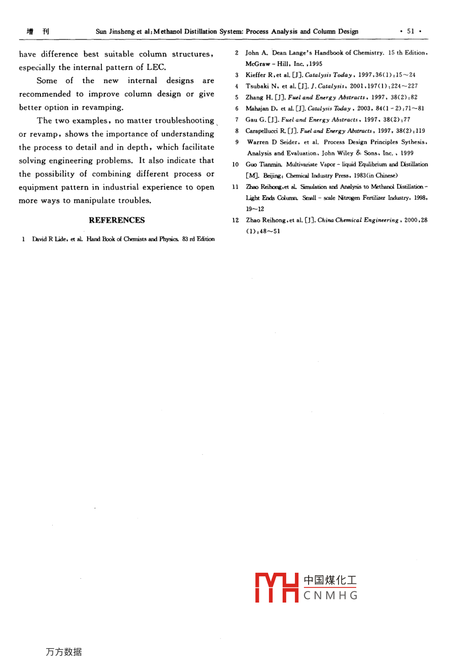 化進(jìn)畏●40.CHEMICAL INDUSTRY AND ENGINEERING PROGRESS2005年第24卷增刊Methanol Distillation System: Process Analysis and Column DesignSun Jinsheng, Tian Yufeng, Xu Shimin, Ding Hui, Wang Tao, Li Xingang, Zheng Yarmei(1 Shool of Chemical Engineering and Technology ,Tianjin University, Tianjin 300072;2 National Engineering Research Center for Disillation Technology, Tianjin 300072)Abstract Base on industrial research and experience, the process of methanol distillation is analyzed,and above all, a new concept of high pressure flowsheet and low pressure flowsheet is defined. The newconfiguration helps to handle problems encountered in many factories in China. The inter influencebetween process and column internal pattern is also pointed out. Recommendation of new column internaldesigns is given. Finally, industrial examples tell the how the new concept works and the possibility ofcombining process to give more opens to solve engineering problems.Keywordsmethanol ditilation, two - effet ditillation, high pressure flowsheet and low pressureflowsheet, flowsheet analysis, simulation with hydraulic, column internal designA very important material in organic chemicalPROCESS DESCRIPTIONindustry, methanol is widely involved in themanufacture of plastic material, synthetic fiber andMethanol can be synthesized from manyrubber, dyestuff, covering material, spice,materials, for instance, natural gas, gas oil, fuelmedical field, pesticide and etc. Also, it is notoil, coal, etc. [3~8]. Except for the difference inonly a fine solvent for many organic compoundscatalysts, reaction mechanics and the concentrationbut a sound substitute for gasoline in manyof methanol in raw product, the subsequentcountries as green energy(With the quickdistillation process and equipments are similar ,development of the national economy, the demandfalling into three main assortments: 2 - column(actual or potential) of methanol has sharplyprocess, 3 - column process and 3十1一columnincreased, which accelerates the development 0process. A 2 - column process is composed of lightthe methanol industry and increment of theends column and methanol refining column or mainmethanol output. Presently, methanol distillationcolumn which is found in factories under 100 kt/a,technology has been developed to be large - scale,offering simple process, equipments and lowlow energy consuming and more environmental.investment. 3 - column process is built up by lightThe main patent dealers in this industry of thends column, pressured methanol refining columnworld have the equipments designed for 5 000 ~( PMRC ) and atmospheric methanol refining7 500 t/d2]. But China (mainland) has hardly nocolumn (AMRC), forming a 2 - effects distillationrunning units with capability over 200kt/a of highwith the mixture of the distillates from the 2quality (such as 0- M - 232E US). Recently,methanol refining columns the methanol product.NationalEngineeringResearchCenter forThe characteristic of this process is the 2 - effectDistillation Technology at Tianjin Universitydistillation pattern between PMRC and AMRC,(NERCDT) has done much on technical andmeaning heat exchange between the top of PMRCmarket research, including the simulation of all theand the bottom of AMRC. This pattern saves thefamiliar flowsheets on industrial and lab data,energy (by 30%~40%) and the recycle rate ofespecially studying the 2 - effect heat exchangecooling wateIf a methanol recovery column, orbetween the 2 methanol refining columns. As astrip中國(guó)煤化工olves after the lowsummary of our work, the high pressure processpresMYHCNMHGumntoimprovetheand the low pressure process for 3 + 1 - columnquality of the wastewater, the process will turnprocess was put forward.into 3+ 1 - column process.增刊Sun Jinsheng et al: M ethanol Distillation System: Process Analysis and Column Design●41●1.1 Light Ends Columnthe components.No matter in 2 - column process, 3 - columnAs a routine method, large refux ratio; sayprocess or 3 +1 - column process, the Light End0.7~0.9 (reflux to column feed), requires highColumn (LEC) plays the same Role. Some of thecondenser temperature to remove light impurities oflight component in raw methanol fatal to thehigh boiling point, for example acetone. Obviously,product are removed in this column, such asthismethodaccompanied b;high energymethyl formate (MFOR), dimethyl ether (DME),consumption. Because the above method can notC1~ C6,as well as acetone and methyl ethylreduce the loss of methanol, process water is added toketone (MEK). Some publications define MFOR,the column to change the concentration of methanolDME and C1 ~ C6 as the alcoholic- solubleand water in order to weaken the solubility of theimpurities, while DME and MEK the aquaticliquid mixture in the column to the alcoholic - solublesoluble impurities. The standard of the divisionimpurities. The process water is normally fed to thecan be found in Table 1.column in 3 ways: into the 2nd condenser, at the topIndustrial investigation shows that the basicof the column and along with the raw methanol feed.measures of the removal operation include largeTo get the same methanol and water concentration atreflux ratio and process water inlet or both taken.the inlet position, process water in the first wayThe principles respectively employ the difference ofamounts approximately 5% that of the feed, while theboiling point or relative volatility and solubility ofothers, 10% ~20%.Table1 Components in raw methanol by coke oven gasNO.COMPONENTNORMALSOLUBILITYMOLEMASSDENSITYBOILINGAQUATICALCOHOLICWEIGHTFRACTION/kg" m-)H2-252. 802.024.0300E-0669. 93Nz- 195. 8028. 012.1300E-04807. 31-191. 50.3.8100 E-05800. 00R- 185.8639.951. 5300E-04679. 33c1-161. 493.34716. 042.0000E-04299. 706COr-78. 4844. 018.0700E-03826. 19DME-24.8446. 077. 000E-03674. 81MFOR31. 803Mise60. 055.1300E-04980. 559NC536.07N/AMisc .72. 153.5100 E-04630. 380ACETONE56.29Mise .58.081.500 E-04794. 6511METHANOL84. 7032. 040.817 412NC668.748