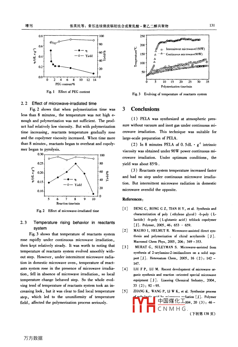 第46卷增刊中山大學(xué)學(xué)報(bào)( 自然科學(xué)版)VoL. 46 Sup.2007年6月ACTA SCIENTIARUM NATURALIUM UNIVERSITATIS SUNYATSENIJun.2007Continuous Microwave-Irradiated Synthesis of Poly(D,L-Lactide ) -co-Poly ( Ethylene Glycol )Copolymer Under AtmosphereZHANG Ying-min, WANG Peng, LI Yue, LEI Haifen, JIAO Chun-yan, HAN Ning( Research Center for Green Chemistry and Technology ,School of Municipal andEnvironmental Engineering, Harbin Institute of Technology, Harbin 150090, China)Abstract: Poly (D, L-lactide) -co-poly ( ethylene gycol) copolymer ( PELA) of Intrinsic viscosity0. 51 dL●g"'had been preparedunder continuous microwae-iradiation power of 90 W for 8 min at atmosphere. Effects of poly ( ethylene glycol) ( PEG) content,polymerization time on intrinsic viscosity and yield of PELA had been discussed. Furthermore, temperature rising behavior in reactantssystem was studied through copolymerization under continuous microwave oven and domestic microwave oven. The results showed thattemperature of reactants system evolved smoothly without step under continuous microwave iradiation, which occurred under intermit-tent microwave iradiation in domestic microwave oven.Key words: continuous microwave imadiation; polylactide; poly ( ethylene glycol) ; copolymerCLC number: TQ316. 6*1Document code; AArticle ID: 0529-6579 (2007) SI 0130-03Poly (D, L-lactide) -co-poly ( ethylene glycol)(Sn (Oct)2) was used as catalyst. PEG1000 and tet-( PELA), obtained through copolymerizing PEG intorahydrofuran (THF) were analytically pure.Poly (lactie acid) (PLA) chains, has not only the.2 Procedureproperties of PLA homopolymery , but also hydrophilici-3g DLLA and PEG - 1000 in a certain proportionty, toughness,flexibility and so on which are not avail-were weighed into a 50mL beaker, Sn( 0ct)2(0. 40% )able in PLA homopolymery'.as catalyst then the beaker was placed on the heating-Microwave technology for organic synthesis reac-medium and was irradiated under microwave power oftion has been reported[2-3]Nowadays most research 90W for minutes.of organic synthesis reaction are still concentrated 0.3 Measurementsthe domestic microwave ovens'”. Because microwaveIntrinsic viscosity of PELA was measured with anis intermittently irradiated, reaction temperature rises atUbbelohde viscometer in THF at 379C. IR spectrahe presence of microwave irradiation and drops at the , were recorded on a Nicolet - 670FT-IR apparatus.' Habsence of it during reaction. Such a heating way is ad-NMR spectra of polymer were recorded with a Brukerverse to reaction. Moreover, power adjustment of do-AC-P200MHz apparatus.mestic microwave oven is limited for several intervalsand can't meet the actual requirement. In this paper ,2 Results and discussioncontinuous microwave oven was used ( 2450MHz),2.1 Effect of PEG contentpower output of which was continuous without intermit-In the Fig 1, when PEG content was 1%,PELAtence and overcome the shortcomings of domestic micro-with maximum intrinsic viscosity of 0.51dL●g~' waswave imadiation.synthesized. It was considered that with PEG content1 Experimentalincreasing, chain transfer rate increased, which resul-ted in the halt of the chain growing, thus lowered co-1.1 Materialspolymer viscosity.The synthesis and purification of D, L-lactictide(DLLA) was according to ref [5]. Stannous octoate中國(guó)煤化工MHCNMHG收稿日期: 200701-10基金項(xiàng)目:哈爾濱市科技攻關(guān)資助項(xiàng)目(2005AA4CS112)作者簡(jiǎn)介:張英民(1976年生),男,博士生;通訊聯(lián)系人:王鵬; E mail: pwang73@ hit edu. en增刊張英民等:常壓連續(xù)微波輻射法合成聚乳酸-聚乙二醇共聚物1310.8廠丁10025080200.6 |Inermillent microwave(t50W)150 1Continuous mircrowave(90W).4--0- Yield1000.2個(gè)-205(00724681012140 35PEG content/%Polymerizaion time/minFig 1 Effect of PEG contentFig 3 Evolving of temperature of reactants system2.2 Effect of microwave-irradiated timeFig 2 shows that when polymerization time was 3 Conclusionsless than 8 minutes, the temperature was not high e-(1) PELA was synthesized at atmospheric pres-nough and polymerization was not sufficient. The prod-uct had rlatively low viscosity. But with polymerizaion sure without vacum and inert gas under continuous mi-time increasing, reactants temperature gradually rose crowave iradiation. This technique was suitable forand the copolymer viscosity increased. When time more large-scale preparation of PELA.than 8 minutes , reactants began to overheat and copoly-(2) In 8 minutes PELA of 0.5dL●g' intrinsicmer began to pyrolysis.viscosity was obtained under 90W power continuous mi-crowave iradiation. Under optimum conditions, the0.25t8yield was about 85% .(3) Reactants system temperature increased faster”0.2t6and had no step under continuous microwave iradia-40占0.15{ ◆tion. But intermittent microwave radiation in domestict20.10microwave ovendid the opposite.5678910References:Reaction time/min[1] DENG C, RONG C z, TIAN H Y, et al. Synthesis andFig2 Elect of microwave-irradiated timecharaceriaion of poly ( ethylene gycol) -b-poly (Llactide) -b-poly ( Lglutamie acid) triblock copolymer2.3 Temperature rising behavior in reactants[J]. Polymer, 2005, 46: 653 - 659system[2] MAURO I, HELMUT R. Microwave asted direct syn-Fig.3 shows that temperature of reactants systemthesis and polymerization of chiral acrylamide [ J].rose rapidly under continuous microwave irradiation,Macromol Chem Phys, 2005, 206: 349 -353.then kept relatively steady. It was worth to noting that[3] MURAT C, SULEYMAN s. Microwave asited from ;temperature of reactants system evolved smoothly with-synthesis of 2-arylamino-2-imidazolines on a solid sup-out step. However ,under intermittent microwave radia-port [J]. Heteroatom Chem, 2005, 16 (2): 142 -tion in domestic microwave oven, temperature of react-147ants system rose in the presence of microwave irradia-[4] LIUFP, LU M. Recent development of microwave or-tion, fell in a