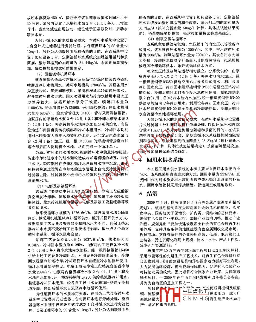 2012年第1期大眾科技No.1, 2012.(總第149期)DA ZHONG KE JI(Cumulatively No.149)梧州年產(chǎn)30萬(wàn)噸再生銅循環(huán)水系統(tǒng)鄧敏隸(廣西有色再生金屬有限公司,廣西梧州543002 )[摘要] 水的循環(huán)利用不僅可以大大減輕水資源短缺的壓力,也是最積極主動(dòng)地保護(hù)水環(huán)境,還是解決生態(tài)用水和環(huán)境用水的最佳途徑;文章介紹了廣西有色再生金屬有限公司年產(chǎn)30萬(wàn)噸再生銅項(xiàng)目的水循環(huán)工藝,體現(xiàn)廣西有色重視環(huán)境保護(hù),充分考慮采用減少“三廢”污染的工藝和設(shè)施,為保護(hù)好山川秀美、生態(tài)梧州盡企業(yè)最大的社會(huì)責(zé)任。[關(guān)鍵詞]水循環(huán);再生;冷卻[中圖分類號(hào)] TQ085+. 41[文獻(xiàn)標(biāo)識(shí)碼] A[文章編號(hào)] 1008-1151 (2012)01-0204-02The water reuse system of engineering of an anural output of 300000 tons recycled copperAbstract: Water recycling can greatly reduce the pressure on water sbortage, and it is also the most active protection of the waterengineering of an anural output of 30000 tons recycled copper, Guangxi Noferous Metals Recycling Co, Ltd. Fully reflects thecompany concern about environment protection and the social responsility.Keyword: water Cycle; Recycle; Refrigeration水千管管徑為DN400 DN300,給水管管材采用給水涂塑鋼管,1前言給水管架空或埋地敷設(shè)。該系統(tǒng)與室外消防給水管網(wǎng)并用。梧州年產(chǎn)30萬(wàn)噸再生銅項(xiàng)目是廣西有色再生金屬有限循環(huán)水系統(tǒng)公司在梧州進(jìn)口再生資源加工園區(qū)的新建項(xiàng)目,項(xiàng)目建設(shè)規(guī)模為30萬(wàn)噸/年陰極銅,總投資約22. 88億元人民幣,生產(chǎn)根據(jù)設(shè)備對(duì)水質(zhì)、水溫及用水點(diǎn)的位置不同等要求,廠工藝上采用先進(jìn)的再生銅冶煉技術(shù),綜合回收原料中的有價(jià)區(qū)循環(huán)水系統(tǒng)分為熔煉車間循環(huán)水、圓盤澆鑄機(jī)循環(huán)水、電金屬,并充分考慮到節(jié)能、節(jié)水等環(huán)節(jié),經(jīng)濟(jì)效益較高,廢解與凈液循環(huán)水、制氧空壓站循環(huán)水共4個(gè)循環(huán)水設(shè)施。分水、廢氣、廢渣等廢料排放完全達(dá)到國(guó)家、國(guó)際標(biāo)準(zhǔn),節(jié)能述如下:減排效果十分顯著。(1)熔煉車間循環(huán)水本項(xiàng)目生產(chǎn)總用水量為105649m'/d, 其中:生產(chǎn)新水量該系統(tǒng)主要供給低品位熔煉區(qū)及高品位熔煉區(qū)頂吹轉(zhuǎn)為5196m/d.回用水量為223m/d、循環(huán)水量為100230m*/d,爐、NGL 爐、精煉搖爐等設(shè)備冷卻用水,并要求維持事故供設(shè)計(jì)工業(yè)用水重復(fù)利用率為95. 08%,生活用水量為230m'/d.水時(shí)間不小于20分鐘。本項(xiàng)目根據(jù)設(shè)備及工藝對(duì)水質(zhì)、水壓、水溫及供水安全該系統(tǒng)循環(huán)水規(guī)模為1310m'/h, 其中:頂吹轉(zhuǎn)爐噴槍冷性等不同要求,給水系統(tǒng)分為生產(chǎn)與生活供水系統(tǒng)、循環(huán)水卻水量為400m/h, NGL 爐門冷卻水量為160 m/h, NGL 爐水系統(tǒng)、回用水供水系統(tǒng)三個(gè)部分。冷集煙罩冷卻水量為400 m/h, 精煉搖爐冷卻水量為270m'/h,排煙風(fēng)機(jī)等設(shè)備冷卻水量為80 m'/h,供水壓力要求約2生產(chǎn)與生活供水 系統(tǒng)為0. 30~0. 35 MPa,其供水溫度為33C,設(shè)備冷卻回水溫度該系統(tǒng)主要供給工藝系統(tǒng)補(bǔ)充水、循環(huán)水系統(tǒng)補(bǔ)充用水約為43C,設(shè)備用水為隔套冷卻,水質(zhì)僅溫度升高而無(wú)其他及綜合辦公樓、食堂浴室、檢測(cè)中心、各車間生活設(shè)施等生成份污染,采用機(jī)械通風(fēng)冷卻塔冷卻、敞開(kāi)式循環(huán)+高位水塔活用水,供水方式為直流給水。生產(chǎn)及生活供水量為供水方式。由設(shè)于泵房?jī)?nèi)的供水泵3臺(tái)(2工1備),將冷水5426m/d,最大小時(shí)供水量為406. 95m"/h.池內(nèi)水加壓經(jīng)DN500焊接鋼管供至高位水塔,再由高位水塔從工業(yè)園區(qū)市政環(huán)狀供水管網(wǎng)上引入2根DN400生產(chǎn)及直接供給熔煉車間各設(shè)備用水;循環(huán)回水通過(guò)回水管道重力生活給水管,在兩處進(jìn)水管上設(shè)置流量計(jì)量,并分別設(shè)置倒流至熱水池,由熱水泵3臺(tái)(2工1備)從熱水池中吸水揚(yáng)流防止器,給水接管點(diǎn)處的水壓為0. 35~0. 40MPa。給水管至冷卻塔,經(jīng)過(guò)冷中國(guó)煤化工一個(gè)循環(huán)單沿廠區(qū)道路環(huán)狀布置,沿線就近接出支管給各車間使用;給元。該系統(tǒng)設(shè)置了YHCNMHG高),其中事[收稿日期] 2011-10-26[作者簡(jiǎn)介]鄧敏隸,供職于廣西有色再生金屬有限公司熔煉分廠。- 204-