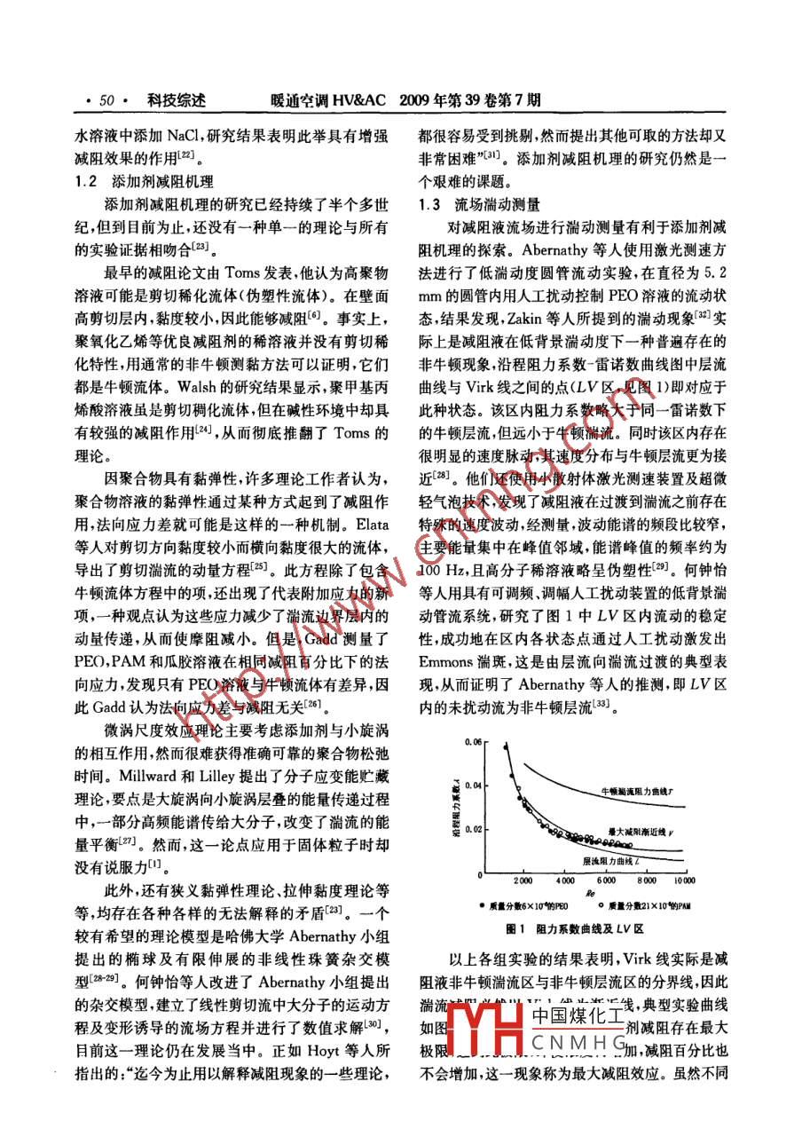 ●48●科技綜述暖通空調(diào)HV&AC 2009 年第39卷第7期添加劑減阻及其在供熱系統(tǒng)中的應(yīng)用哈爾濱工業(yè)大學(xué)朱蒙生* 鄒平華 蔡偉華^摘要簡要介紹了添加劑減阻的國內(nèi)外研究概況,詳細(xì)介紹了減阻劑的特性、減阻機(jī)理、流場湍動測量,減阻效果對傳熱的影響及添加劑減阻在集中供熱系統(tǒng)中的應(yīng)用。關(guān)鍵詞減阻特性機(jī)理傳熱供熱系統(tǒng)Application of additive drag reduction to heating systemsBy Zhu Mengsheng*,Zou Pinghuo ond Col WerhuoAbstract Gives a brief presentation of the rescarch status at home and abroad of drag reduction byadditives and a detailed description of the characteristics, drag reduction mechanism, measurement of flowfield turbulent motion, influence of drag reduction cffcct on heat transfer and the application of dragreduction by additives to central heating systems.Keywords drag reduction, characteristic, mechanism, heat transfer, heating system★Harbin Institute of Technology, Harbin, China0引言應(yīng)用作簡要介紹。添加劑減阻是指在液體中加入少量的高分子1國內(nèi)外研究概況聚合物或表面活性劑以大幅度減小其湍流摩阻的在添加劑減阻研究領(lǐng)域,具有代表性的成果是方法。該方法具有減阻劑投放量少、減阻效率高等1948年第- -屆國際流變學(xué)會議上Toms發(fā)表的第優(yōu)點(diǎn),對于節(jié)能或提高水中物體的運(yùn)動速度具有重一篇減阻論文,該文指出以少量的聚甲基丙烯酸甲大意義。在20世紀(jì)50年代及60年代初期,減阻酯(PMMA)溶于氯苯,沿程阻力可降低50%61。研究多局限于流變學(xué)及石油化工領(lǐng)域,60年代中此后,這種高分子減阻現(xiàn)象被稱為Toms效應(yīng)。期以后,添加劑減阻開始引起流體力學(xué)研究者的注Fabula等人發(fā)現(xiàn)質(zhì)量分?jǐn)?shù)約為5X10-6~10X意,研究工作更加廣泛地開展起來[”。目前減阻劑10-的PEO(聚氧化乙烯)水溶液與純水相比最大已應(yīng)用于水下武器發(fā)射、原油管道輸送、泄洪、消防減阻率可達(dá)80%[7。Oliver 等人利用超大分子量等領(lǐng)域,在原油管道輸送領(lǐng)域,近20多年來先后研聚丙烯酰胺E-10和MG-200 作減阻劑,在1X制出了聚氯乙烯、乙烯丙烯共聚物.聚甲基丙烯酸10- °質(zhì)量分?jǐn)?shù)下達(dá)到了80%的最大減阻率[8,充等一系列油溶性減阻劑[2]。1979 年美國某公司生分證明了減阻劑的減阻高效性。減阻率又可稱為產(chǎn)的CDR減阻劑開始應(yīng)用于橫貫阿拉斯加的原油減阻百分比,計(jì)算式為輸送管道中,取得了良好的節(jié)能效果[3]。80年代末至90年代中期在國外出現(xiàn)了將減阻劑應(yīng)用在區(qū)★朱蒙生,男,1963年9月生,博士研究生,博士,副教授域供熱系統(tǒng)中的實(shí)驗(yàn),取得了良好的節(jié)能和環(huán)保綜150090哈爾濱T業(yè)大學(xué)市政環(huán)境工程學(xué)院合效益"。近幾十年,我國城市集中供熱與空調(diào)系(0451) 82307642E- mail:zmszkg@sina. com統(tǒng)發(fā)展迅速,其輸配管網(wǎng)中水泵的能耗占總能耗的S 150001 哈爾濱工業(yè)大學(xué)能源科學(xué)與工程學(xué)院比例較大,若能在集中供熱與空調(diào)水系統(tǒng)中應(yīng)用減中國煤化工阻劑,節(jié)能環(huán)保效果將會十分顯著[]。本文擬對添收YHCNMHG加劑減阻的國內(nèi)外研究概況以及在供熱工程中的二次修回:2009-06-05暖通空調(diào)HV&AC 2009 年第39卷第7期科技綜述●49●e=f二f x 100%(1)械剪切作用下,其棒狀結(jié)構(gòu)即使會暫時(shí)斷裂,但是經(jīng)過泵之后(機(jī)械剪切消失),又可恢復(fù)為原來的棒式中E 為減阻百分比;f為加人減阻劑前流體的狀結(jié)構(gòu),仍具有較好的減阻效果[5-1]。范寧摩阻系數(shù);f'為加入減阻劑后同- -雷諾數(shù)下流減阻劑的減阻效果還受以下幾個(gè)因素的影響:體的范寧摩阻系數(shù)。1)減陰流體溶液的濃度。Virk認(rèn)為減阻劑1974年召開了第一次國際減阻會議,早期的的濃度影響管道內(nèi)流動的彈性底層的厚度,濃度越主要研究成果由White 和Virk等人進(jìn)行了總大,彈性底層越厚,減阻效果越好0。最近對PAM結(jié)).9。國內(nèi)的研究起步于上個(gè)世紀(jì)70年代,大多和CTAC水溶液進(jìn)行的減阻實(shí)驗(yàn)研究表明,在相以實(shí)驗(yàn)研究為主,最早發(fā)表在公開刊物上的研究成同溫度和雷諾數(shù)下,減阻效果隨著溶液濃度的增加果見文獻(xiàn)[10]。國內(nèi)外有關(guān)添加劑減阻的研究主而變好;但是當(dāng)濃度增加到一定程度后,減阻效果要體現(xiàn)在減阻劑的特性、減阻機(jī)理、實(shí)驗(yàn)研究及工開始變差,這說明減阻流體存在一個(gè)最佳濃.程應(yīng)用等方面。度[13.18]。1.1 減阻劑特性2)減阻流體溶液的溫度。減阻劑都有其自身目前,已發(fā)現(xiàn)的減阻劑種類很多,但能用于集的適用溫度范圍,也就是說都存在著臨界溫度,并中供熱系統(tǒng)的減阻劑只有兩類:第1類為高分子聚且在適用溫度范圍內(nèi)隨著溫度升高減阻效果變差,合物,例如PEO, PAM(聚丙烯酰胺)等人工合成聚一旦溫度超過臨界溫度,即會出現(xiàn)減阻完全失效的合物;第2類為表面活性劑,分為非離子、陽離子、現(xiàn)象。最近對PAM水溶液的減阻實(shí)驗(yàn)研究表明,陰離子和兩性表面活性劑,例如CTAC(十六烷基在相同濃度和雷諾數(shù)下,減阻效果隨肴溶液溫度的三甲基氯化銨)陽離子表面活性劑。升高而減弱L3-1]。具