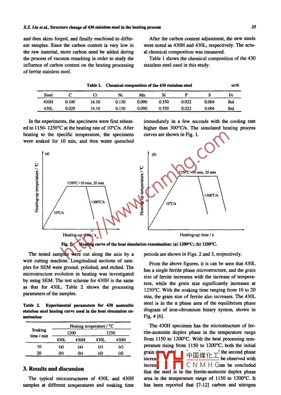 Journal of University of Science and Technology BeijlngMaterialsVolume 15, Number 1, February 2008, Page 34EL SEVIERStructure change of 430 stainless steel in the heating processXinzhong Liu, Jingtao Han, Wanhua Yu, and Shifeng DaiSchool of Materials Science and Engineering, University of Science and Technology Beijing, Beijing 00083, China(Received 2007-02-22)Abstract: The microstructure analysis was employed for the femitic stainless steel (SUS430) with the carbon content from 0.029wt%to 0.100wt% under the simulated heating process condition. The higher carbon sample (430H) contains the duplex phase micro-tructure at the temperature of 1150*C; on the other hand, the lower carbon content sample (430L) does not touch two phase areaeven at the temperature of 1450°C and has the single phase ferritic microstructure. The carbon content need be well controlled for the430 frritic stainless steel since it can significantly affect the heating process curve, and the heating process may not be done in thetwo phase area due to the uncotolled carbon content. With the low carbon content and the proper soaking time, the grain size is notsensitive to the heating process temperature and the soaking time. In the present heat treatment experiments, the soaking time isabout 10 min, and the processing parameters can be chosen according to the requirement of the gross energy, the efficiency and thecontinual forming,2008 University of Science and Technology Beijing. All rights reserved.Key words: frritic stainless stel; carbon content; microstructure; heating curve1. Introductionproducts.In this paper, according to the real dimensions of aWith the continually increased consumption fornickel and the intense resources supply, high cost hasheating process furmace used in the company, the in-been the main problem of nickel-based stainless steel.fluence of carbon content on the microstructure evo-The ferrite stainless steel without nickel has been alution during the heating process was investigated formore promising candidate due to its low cost. The ap-430 ferrite stainless steel under the simulated heatingplication range is unceasingly expanding and the usedprocess condition. In order to determine the effect ofamount is continuously increased [1]. 430 stainlessboth heating processing temperature and time on thesteel is one representative ferrite stainless steel andmicrostructure, the samples are first heated to 1 150-has been widely used in industries, including con-1280°C, and then quenched to room temperature; thestruction, decoration, food machinery, and bouseholdmicrostructures of samples were analyzed by SEM.electrical appliances, etc.2. ExperimentalSome recent studies [2-5] indicate that the grain offerrite stainless steel will increase when the steel isThe simulated heating process curve of 430 stain-overheated, which will reduce its ductility and thusless steel was carried out in Gleeble-1500. In the ex-cause cracking. It also shows that the content ofperiment, the process parameters are selected accord-spread varies with the temperature, and thus the heating to the situation of heating process fumace used inprocessing temperature is limited within a small rangesome factories and the stainless steel trial production[3]. Therefore, it is very important to investigate therelated process parameters, which are also referring tomicrostructure evolution of 430 stainless steel at aboutthe domestic and foreign hot rolling stainless sheet1250°C in order to create an optimized heating proc-strip F中國(guó)煤化工,ess curve, which can be used as a guideline in practice_ituation, the coldand can also be employed to improve the quality ofrollingYHC N M H Gthe Vacum state,Correspondng aothor: Xinzhong Liu, E-mail: liuxzhyx@ sohu.comAlbo available online at ww.wcenecedireet.com。2008 University of Science and Tectnology Beijing. All rights reserved.X,Z Liu et al, Structure change of 430 stainless steel in the heating process35and then skins forged, and finally machined to differ-After the carbon content adjustment, the new steelsent samples. Since the carbon content is very low inwere noted as 430H and 430L, respectively. The actu-the raw material, more carbon need be added duringal chemical composition was measured.the process of vacuum remelting in order to study theTable 1 shows the chemical composition of the 430influence of carbon content on the heating processingstainless steel used in this study.of ferrite stainless steel.Table 1. Cbemical composition of the 430 stainless steelwt%_SteelCr_Ni_Mn _SPFe430H0.10016.100.1300.0900.5500.0220.004Bal430L0.029. Bal_In the experiments, the specimens were first reheat-immediately in a few seconds with the cooling rateed to 1150- 1250°C at the heating rate of 10°C/s. Afterhigher than 300°C/s. The simulated heating processheating to the specific temperature, the specimenscurves are shown in Fig. 1.were soaked for 10 min, and then water quenched↑(間()1250Cx 10 min, 20 min1200°Cx10 min, 20 min司>300C/s>300"C/s10C/s! 10C/sHeating-up time/sFig. 1. Heating curve of the heat simulation examination: (a) 1200C; (b) 12500C.The tested samples were cut along the axis by a periods are shown in Figs. 2 and 3, respectively.wire cutting machine. Longitudinal sections of sam-From the above figures, it is can be seen that 430Lples for SEM were ground, polished, and etched. Thehas a single ferrite phase microstructure, and the grainmicrostructure evolution in heating was investigatedsize of ferrite increases with the increase of tempera-by using SEM. The test scheme for 430H is the sameture, while the grain size significantly increases atas that for 430L. Table 2 shows the processing1250°C. With the soaking time ranging from 10 to 20parameters of the samples.min, the grain size of ferrite also increases. The 430LTable 2. Experimental parameters for 430 austeniticsteel is in the a phase area of the equilibrium phasestainless steel heating curve used in the heat simulation ex-d