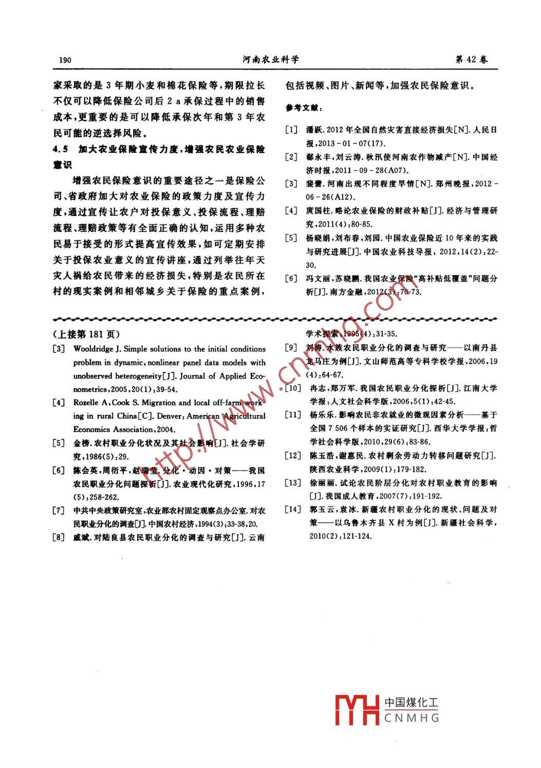 河南農(nóng)業(yè)科學(xué),2013,42(8) :186-190Journal of Henan Agricultural Sciences河南省農(nóng)業(yè)保險發(fā)展問題研究(河南省牧業(yè)經(jīng)濟(jì)學(xué)院金融系,河南鄭州450044)摘要:農(nóng)業(yè)保險作為有效的農(nóng)業(yè)風(fēng)險管理手段,對減輕農(nóng)業(yè)災(zāi)害損失,保障農(nóng)業(yè)經(jīng)濟(jì)發(fā)展順暢進(jìn)行具有現(xiàn)實(shí)意義。在分析河南省農(nóng)業(yè)保險發(fā)展環(huán)境的基礎(chǔ)上,指出了目前影響農(nóng)業(yè)保險效能發(fā)揮的主要因素,并提出應(yīng)盡快完善現(xiàn)有農(nóng)業(yè)保險保費(fèi)補(bǔ)貼制度、創(chuàng)新農(nóng)業(yè)保險產(chǎn)品、消減逆選擇行為等建議,以進(jìn)一步提升河南省農(nóng)業(yè)保險的服務(wù)效能,有力支持全省現(xiàn)代農(nóng)業(yè)經(jīng)濟(jì)發(fā)展。關(guān)鍵詞:農(nóng)業(yè)保險;保費(fèi)補(bǔ)貼;保費(fèi)劃轉(zhuǎn);提升中圖分類號: F842. 6文獻(xiàn)標(biāo)志碼: A文章編號: 1004 - 3268(2013)08 - 0186 - 05Research on Development of Agricultural Insurancein Henan ProvinceLIU Ning(Department of Finance Collge of Henan Husbandry & Economy ,Zhengzhou 450044,China)Abstract: As an effective means of agriculture risk management,agricultural insurance is very im-portant for reducing disaster losses of agriculture and ensuring development of agricultural econo-my. This paper analyzed the development environment of agricultural insurance in Henan pro-vince, pointed out major factors which affected efficiency of agricultural insurance, and put for-ward some suggestions that could improve the service efficiency of the agricultural insurance andsupport the development of modern agricultural economy, such as improving subsidy system inagricultural insurance premium, innovating agricultural insurance products, decreasing adverse se-lection and so on.Key words :agricultural insurance; premium subsidies; transfer of premium; upgrade我國是一個典型的農(nóng)業(yè)大國,農(nóng)村人口達(dá)48. 601萬hm2 ,其中成災(zāi)面積23. 4328萬hm',絕6.57億人,耕地面積達(dá)1.217億hm2,農(nóng)業(yè)經(jīng)濟(jì)是.收面積1.345 萬hm2 ,經(jīng)濟(jì)損失達(dá)17. 23億元[2;國民經(jīng)濟(jì)發(fā)展的基礎(chǔ)與命脈。同時,我國又是一個2012年6月洛陽、固始、南陽等地的持續(xù)旱情造成自然災(zāi)害頻發(fā)的國家,在推進(jìn)農(nóng)業(yè)經(jīng)濟(jì)建設(shè)過程中,受災(zāi)人口達(dá)97.7萬人、飲水困難人口4 310人、飲農(nóng)業(yè)生產(chǎn)經(jīng)營者飽受自然災(zāi)害威脅。據(jù)統(tǒng)計(jì),僅水困難大牲畜216頭,農(nóng)作物受災(zāi)面積28.348萬2012年,我國因各類自然災(zāi)害造成的直接經(jīng)濟(jì)損失hm2、成災(zāi)面積3.18萬hm2,造成農(nóng)業(yè)經(jīng)濟(jì)損失達(dá)4 185.5億元,死亡人數(shù)1 338人,失蹤人數(shù)1923385萬元田]。人,緊急轉(zhuǎn)移安置人數(shù)1109. 6萬人;農(nóng)作物受災(zāi)面由此可見,自然災(zāi)害的客觀存在及頻繁發(fā)生使積2 496.2萬hm? ,其中絕收面積182.6萬hm2 ;房.農(nóng)業(yè)生產(chǎn)缺乏保障。在此情況下,農(nóng)業(yè)生產(chǎn)經(jīng)營者屋倒塌90.6萬間,嚴(yán)重?fù)p壞145.5萬間”。必須尋找有效的農(nóng)業(yè)風(fēng)險管理辦法,以保證農(nóng)業(yè)生河南省作為我國第一人口大省和農(nóng)業(yè)大省,每產(chǎn)順暢進(jìn)行。農(nóng)業(yè)保險作為一種有償?shù)霓r(nóng)業(yè)風(fēng)險管年因自然災(zāi)害所致?lián)p失非常嚴(yán)重。僅2011年9月理手段,主要承保農(nóng)業(yè)生產(chǎn)經(jīng)營者在種植業(yè)和養(yǎng)殖洛陽、濟(jì)源等地的秋汛導(dǎo)致農(nóng)作物受災(zāi)面積達(dá)業(yè)生產(chǎn)過程中因自然災(zāi)害和意外事故所造成的經(jīng)濟(jì)中國煤化工收稿日期:2013-04-19MHCNMH G基金項(xiàng)目:河南省哲學(xué)社會科學(xué)規(guī)劃項(xiàng)目(2012BJ]005)作者簡介:劉寧(1973-),女 ,河南鄭州人,講師,碩士,主要從事農(nóng)村保險方面研究。E - mail: ningl2003@ tom. com第8期寧:河南省農(nóng)業(yè)保險發(fā)展問題研究 .187損失,這一制度能夠有效分散農(nóng)業(yè)生產(chǎn)風(fēng)險、減輕農(nóng)迅速提升,為推進(jìn)農(nóng)業(yè)保險功效發(fā)揮奠定經(jīng)濟(jì)基礎(chǔ)。業(yè)災(zāi)害損失穩(wěn)定糧食等主要農(nóng)產(chǎn)品的市場供應(yīng),創(chuàng)2河南省農(nóng)業(yè)保險發(fā)展概況造良好的農(nóng)業(yè)生產(chǎn)環(huán)境,是建立農(nóng)業(yè)風(fēng)險防范機(jī)制、提高農(nóng)業(yè)防災(zāi)減災(zāi)能力的重要措施。因此,充分發(fā)河南省的農(nóng)業(yè)保險發(fā)展經(jīng)歷了商業(yè)化經(jīng)營、政揮農(nóng)業(yè)保險效能對支持農(nóng)業(yè)經(jīng)濟(jì)建設(shè)意義重大。為策性經(jīng)營階段。此,本研究對河南省農(nóng)業(yè)保險發(fā)展的現(xiàn)實(shí)環(huán)境及影2.1商業(yè)化經(jīng)營 階段響因索進(jìn)行分析,并提出相應(yīng)的發(fā)展建議,以有力支1982年,中國人民保險公司河南省分公司嘗試持全省現(xiàn)代農(nóng)業(yè)經(jīng)濟(jì)發(fā)展。在河南省進(jìn)行農(nóng)業(yè)保險的商業(yè)化自主經(jīng)營,主要包1推進(jìn)河南省農(nóng)業(yè)保險發(fā)展的現(xiàn)實(shí)括養(yǎng)殖業(yè)和種植業(yè):養(yǎng)殖業(yè)保險主要有生豬、奶牛、魚、兔、雞、貂等牲畜保險,種
