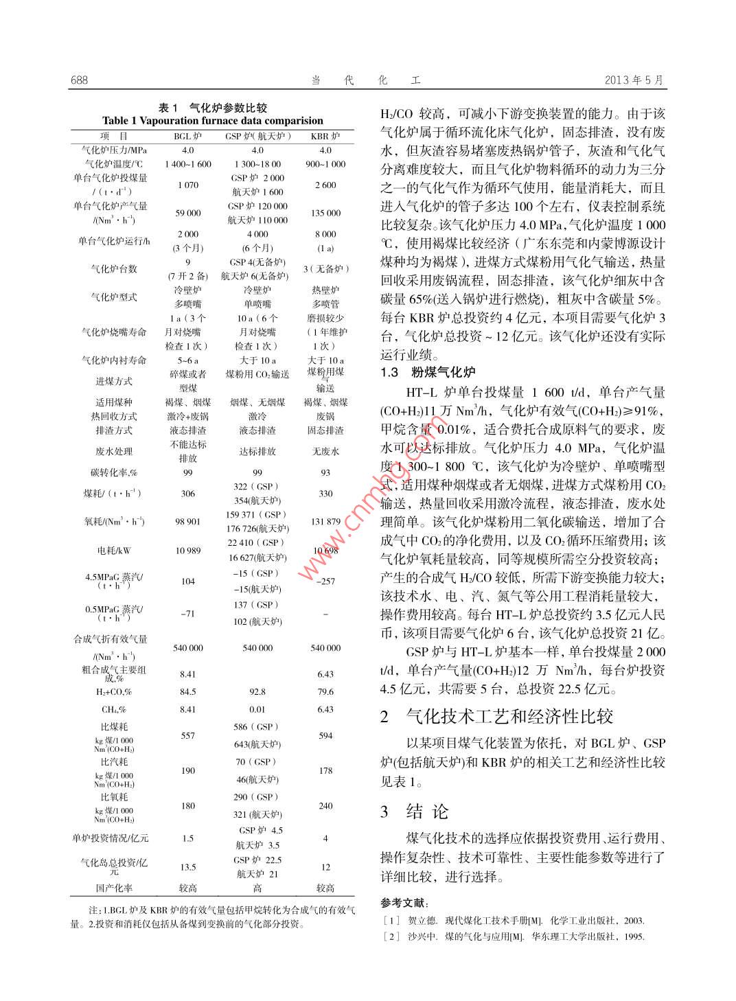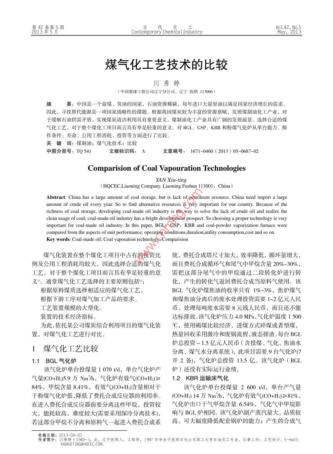 第42卷第5期當0142203Contemporary Chemica 1 IndustryMay, 2013。煤氣化工藝技術(shù)的比較閆秀婷(中國寰球工程公司遼寧分公司,遼寧撫順113006 )摑要:中國是一個富煤、貧油的國家,石油資源稀缺,每年進口大量原油以滿足國家經(jīng)濟增長的需求。因此,尋找替代能源是一項國家戰(zhàn)略性的課題。根據(jù)我國煤炭較為豐富的資源稟賦,發(fā)展煤制油化工產(chǎn)業(yè),對于緩解石油供需矛盾,實現(xiàn)煤炭清潔利用具有重要意義,煤制油化工產(chǎn)業(yè)具有廣闊的發(fā)展前景。選擇合適的煤氣化工藝,對于整個煤化工項目而言具有舉足輕重的意義。對BGL、GSP、KBR和粉煤氣化爐從單臺能力、操作條件、壽命、公用工程消耗、投資等方面進行了比較。關(guān)鍵詞:煤制油;煤氣化技術(shù);比較中圖分類號: TQ 541文獻標識碼: A文章編號: 1671-0460 ( 2013) 05-0687-02Comparision of Coal Vapouration TechnologiesYAN Xiu-ting( HQCEC.Liaoning Company, Liaoning Fushun 113001, China)Abstract: China has a large amount of coal storage, but is lack of petroleum resource. China need import a largeamount of crude oil every year. So to find altermative resources is very important for our country. Because of therichness of coal storage, developing coal-made oil industry is the way to solve the lack of crude oil and realize theclean usage of coal; coal made oil industry has a bright development prospect. So choosing a proper technology is veryimportant for coal-made oil industry. In this paper, BGL,GSP,KBR and coal-powder vaporization furnace werecompared from the aspects of unit performance, operating conditions,duration,utility consumption,cost and so on.Key words: Coal made oil; Coal vaporation technology; Comparision煤氣化裝置在整個煤化工項目中占有的投資比統(tǒng),費托合成塔尺寸加大,效率降低,循環(huán)量增大,例及公用工程消耗均較大,因此選擇合適的煤氣化而且費托合成循環(huán)氣和尾氣中甲烷含量20%~-30% ,工藝,對于整個煤化工項目而言具有舉足輕重的意需把這部分尾氣中的甲烷通過二段轉(zhuǎn)化爐進行轉(zhuǎn)義"。通常煤氣化工藝選擇的主要原則包括!:化,產(chǎn)生的轉(zhuǎn)化氣返回費托合成當原料氣使用。該根據(jù)原料煤質(zhì)選擇相適應的煤氣化工藝。BGL氣化爐煤焦油的收率只有1%~3%,焦爐煤氣.根據(jù)下游工序?qū)γ簹饧庸ぎa(chǎn)品的要求。和煤焦油分離后的廢水處理投資需要1~2億元人民工藝裝置規(guī)模的大型化。幣,處理每噸廢水需要8元錢人民幣,而且還不能裝置的技術(shù)經(jīng)濟指標。達標排放。該氣化爐壓力4.0 MPa,氣化爐溫度1 500為此,依托某公司煤炭綜合利用項目的煤氣化裝C,使用褐煤比較經(jīng)濟,進煤方式碎煤或者型煤,置,對煤氣化工藝進行對比。熱量回收采用激冷和廢鍋流程,液態(tài)排渣。每臺BGL爐總投資~ 1.5億元人民幣(含投煤、氣化、焦油水.1煤氣化工藝比較分離、煤氣水分離系統(tǒng)),此項目需要9臺氣化爐(71.1 BGL 氣化爐開2備),氣化爐總投資13.5 億。該氣化爐( BGL該氣化爐單臺投煤量1 070t/d,單臺氣化爐產(chǎn)爐)還沒有實際運行業(yè)績。氣量(CO+H)5.9萬Nm'/h,氣化爐有效氣(CO+H2)≥1.2 KBR 運輸床氣化84%,甲烷含量8.41%,有效氣(C0+H)含量相對于該氣化爐單臺投煤量2 600 ld,單臺產(chǎn)氣量干粉煤氣化爐低,降低了費托合成反應器的利用率。(C0+H2) 14萬Nm'/h,氣化爐有效氣(CO+H2)≥81%,在進人費托合成反應器前要分離這些甲烷,投資較氣化爐出口干氣甲烷含量6.54%, 氣化氣中甲烷影大,能耗較高,難度較大(需要采用深冷分離技術(shù)),響與BGL爐相同。該氣化爐副產(chǎn)蒸汽量大,品質(zhì)較若這部分甲烷不分離和原料氣一起進人費托合成系高,可大幅度降低配套鍋爐的能力;產(chǎn)生的合成氣收稿日期: 2013-04-03作者簡介:閆秀婷(1960-). 女,遼寧撫順人,工程師,1987年畢業(yè)于撫順石化公司職工大學石油化工專業(yè),從事工作:工藝設(shè)計。E-mail:YANXUETING@HOCEC.COM688當代化2013年5月表1氣化爐參數(shù)比較H2/CO較高,可減小下游變換裝置的能力。由于該Table 1 Vapouration furnace data comparision頁目BGL爐CSP 爐(航天爐) KBR 爐氣化爐屬于循環(huán)流化床氣化爐,固態(tài)排渣,沒有廢.氣化爐壓力J/MIPa4.04.水,但灰渣容易堵塞廢熱鍋爐管子,灰渣和氣化氣氣化爐溫度/C 1 400-1 6001 300-18 00900-1 000分離難度較大,而且氣化爐物料循環(huán)的動力為三分單臺氣化爐投煤量GSP爐20001 070航天爐1 6002 600之一的氣化氣作為循環(huán)氣使用,能量消耗大,而且單臺氣化爐產(chǎn)氣量CSP爐120 000進入氣化爐的管子多達100個左右,儀表控制系統(tǒng)/(Nm'●的航天爐10000135 000比較復雜。該氣化爐壓力4.0 MPa,氣化爐溫度1 0002 0004 0008 000單臺氣化爐運行h(3個月)(6個月)C,使用褐煤比較經(jīng)濟(廣東東莞和內(nèi)蒙博源設(shè)計氣化爐臺數(shù)GSP 4(無備爐)3(無備爐)煤種均為褐煤),進煤方式煤粉用氣化氣輸送,熱量(7開2備) 航天爐6(無備爐)熱壁爐回收采用廢鍋流程,固態(tài)排渣,該氣化爐細灰中含氣化爐型式冷璧爐冷壁爐多噴管碳量65%(送入鍋爐進行燃燒),粗灰中含碳量5%。多噴嘴單噴嘴1a(3個10a(6個磨損較少每臺KBR爐總投資約4億元,本項目需要氣化爐3氣化爐燒嘴壽命月 對燒嘴月對燒嘴(1年維護臺,氣化爐總投資~ 12億元。該氣化爐還沒有實際檢查1次)1次運行業(yè)績。氣化爐內(nèi)襯壽命5~6a大于10a碎煤或者煤粉用CO:輸送 煤粉用煤1.3 粉煤氣化爐進煤方式型煤輸送HT-L爐單臺投煤量1 