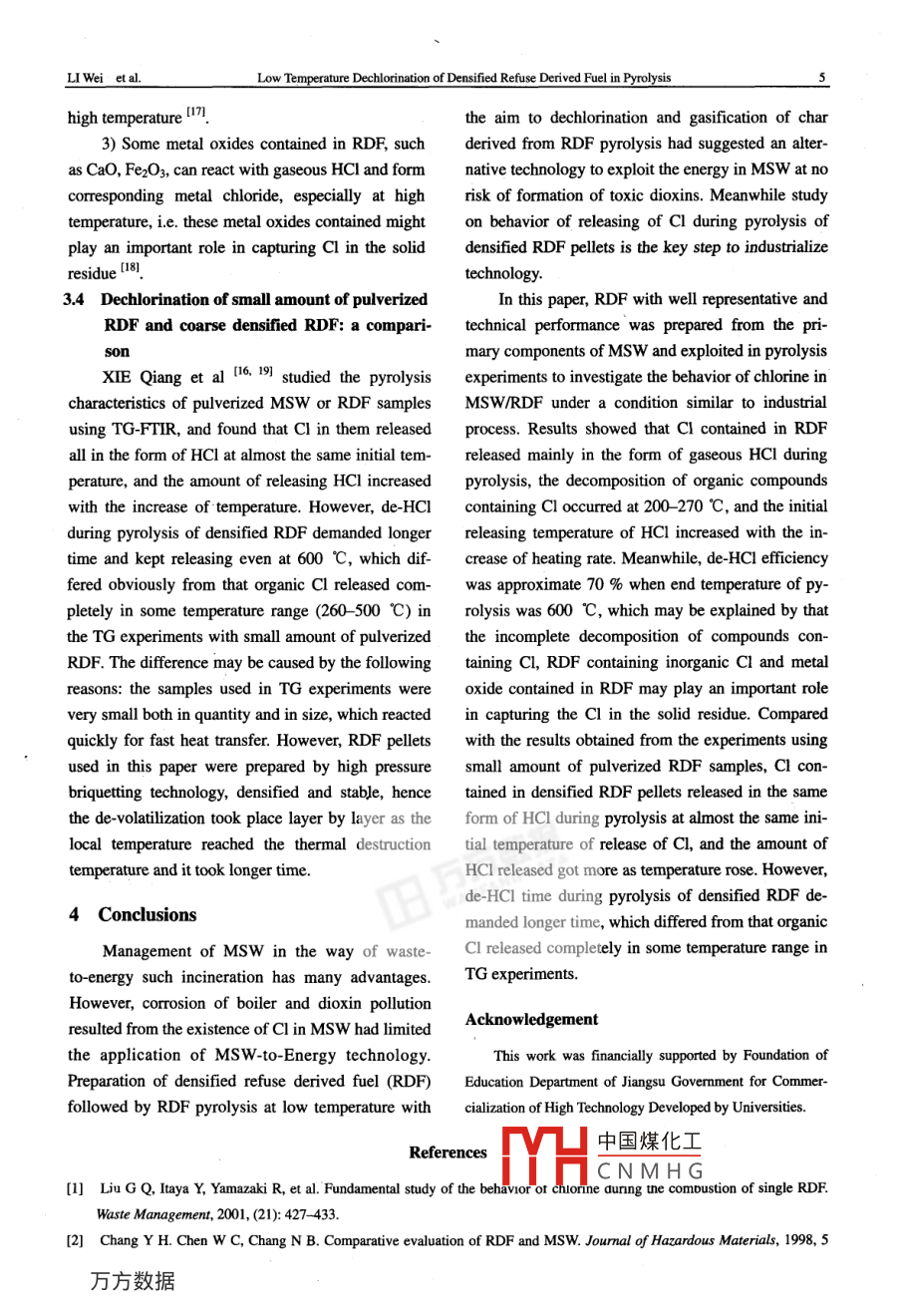 Mar.2005J. China Univ. of Mining &Tech (English Edition)VoL.15 No.1Low Temperature Dechlorination of DensifiedRefuse Derived Fuel in PyrolysisLI Wei' , XIE Qiang1 School of Chemical Engineering and Technology, China University of Mining & Technology,.Xuzhou, Jiangsu 221008, China;"School of Chemical and Environmental Engineering, China University of Mining & Technology; Bejing 100083, ChinaAbstract: Study on behavior of chlorine contained in oval-shaped densified refuse derived fuel (d-RDF) preparedfrom municipal solid waste in pyrolysis was carried out by means of temperature-programmed electrical furmace, andthe gas evolving from pyrolysis was investigated by FTIR. De-HCl rate was calculated by determining the emissionfraction of HCI in the fue gas and the fraction of Cl left in the pyrolysis residue. The results show that CI in the d-RDFreleases primarily in the form of HCl during the pyrolysis, and the initial releasing temperature of HCI enhances withthe increase of heating rate. Meanwhile, the higher the end temperature of pyrolysis, the more the CI released. De-HClrate is about 70% when the end temperature of pyrolysis is around 600"C. Besides, mechanism of Cl release is dis-cussed.Key words: municipal solid waste; refuse derived fuel; pyrolysis, dechlorination; HCI; FTIRCLC number: X 7051 Introductionposed as an altermative technology to exploit the en-In recent years the amount of municipal solidergy in MSW at no risk of formation of toxic diox-insl!-3!.waste (MSW) increases rapidly. With the depletion ofSo far, the characteristics of pyrolysis and com-suitable sites for MSW landiling and the enhance-ment of public attention to environment and ecology,bustion of pulverized main combustible componentsmore and more MSW is treated by waste-to-energyof MSW or RDF have been widely investigated bytechnology (for instance incineration) other than bymeans of thermal gravimetric analysis (TGA) andits direct lanfilling, and its thermal energy is recov-differential thermal analysis (DTG) 146), and theered for power generation. However, corrosion on theevolving emissions from MSW or RDF TGA processsurface of the heat exchanger in the boiler caused bywere determined and studied (7-8]. However, it need toacidic flue gases such as HCl limits the. power gen-be further validated that whether the results obtainederation efficiency to a considerable low level. Mea-from TGA experiments using tiny amount of pulver-nwhile, the existence of HCl may also stimulate theized samples (<10 20 mg in general), epecially theformation of highly toxic substances such as dioxinsresults about behavior of chlorine during pyrolysiswhich consequently cause serious environmentalare the same as that under industrial conditions usingpollution. Preparation of densified refuse derived fueldensified RDF pellets (>5 g in general, 25- 45 mm in(RDF) from MSW by crushing, drying, screening andsize).briquetting, followed by RDF pyrolysis at low tem-tainedMH中國煤化工of chorine co-perature with the aim to dechlorination, and gasifica-C N M H Guse derived fueltion of char derived from RDF pyrolysis were pro-(d-RDF) which prepared from municipal solid wasteReceived 25 October 2004; accepted 20 January 2005Project supported by Foundation of Education Department of Jiangsu Government for Commercialization of High Technology Developed by UniversitiesCore萬弓數(shù)據(jù)l: +86-516 3884079, E-mail adress vidylee@e 163 comJ. China Univ. of Mining & Tech. (English Edition)VoL.I5 No.1in pyrolysis was carried out by means of tempera-energy-containing substance, such as carbonaceousture-programmed electrical furnace, and the gasshale, coal refuse, as well as MSW and RDF 12.evolving from pyrolysis was investigated by FTIRThus in this study, composition and properties ofwith the aim to provide practical data for high effi-RDF were analyzed and tested by the coal analysiscient and clean energy utilization of MSW.methods. The results are shown in Table 2.2 Experimental2.1 Preparation of samplesThe composition of MSW varies greatly fromregions and seasons. On the basis of survey andmodification of characteristics of MSW in China 9, a .formulation for an artificial RDF was proposed, asshowed in Table 1. The major advantages with anFig. 1 Densified refuse derived fuel (RDF- -5)artificial RDF in study include that the compositionof RDF is very homogeneous, the content of ele-Table 2 Characterization of Coal and RDFments is well known and the mixture can easilyM AVPCCHO*NSClQm 1(kJ.kg^)changed as the MSW content is changed. Thus thecoal 2.3 9.4 38.1 61.9 78.75.0 14.5 1.2 0.629910.5artificial RDF used in experimental study makes theRDF 4.2 41.3 33.7 20.9 59.87.6 27.4 0.3 0.9 3.910470.5result to be of general significance.*by differenceTable 1 Formulation for artifcial refuse derived fuelPaper (0.28 %)waste newspaper, book, packing paper2.2 Pyrolysis of RDFCellulose (7.49 %) flax, cotton clothThe schematic diagram of the experimental sys-organic Wood (1.25 %)Sawdusttem, which mainly consists of a temperature-pro-Plastic and rubberPVC, foamed plastic, weaved bag, plasticgrammed electric furnace for pyrolysis and a Niolet(33.74 %) _bottle, waste tyreNexus470 Fourier Transform Infrared SpectrometerMetal ( 1.756 %)iron and oxideCeramics and glassbottle, waste glass(FTIR), and both of them were jointed by TG-FTIRinorganic (5.49 %)interface, is shown in Fig. 2.Ash and otherssoil, gravel, coal briquete slag,. saw-(50.00 %)dust<10 mmMaterials in Table 1 were collected. All compo-nents were air dried and shredded into particles withsize less than 3mm, adding coal powder (<1mm)西西from Xuzhou Qishan Coal Mine which account fo20 per cent of total weight, then mixed well- propor-Fig.2 Schematic diagram of experimental system for pyro-lysis and dechlorinationtionally. The characteristics of the coal are shown in1. N2; 2. buffer bttl; 3. flow meter; 4. ectric furnace; 5. d-RDF sample;Table 2. A hydraulic machine (NYL2000) and special6. temperature col