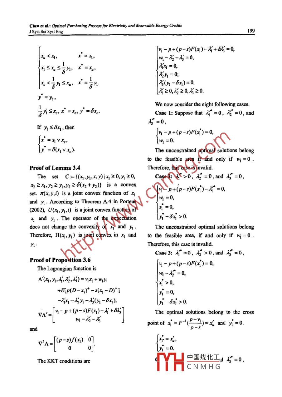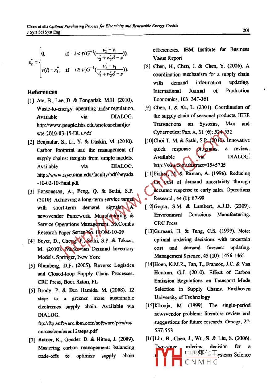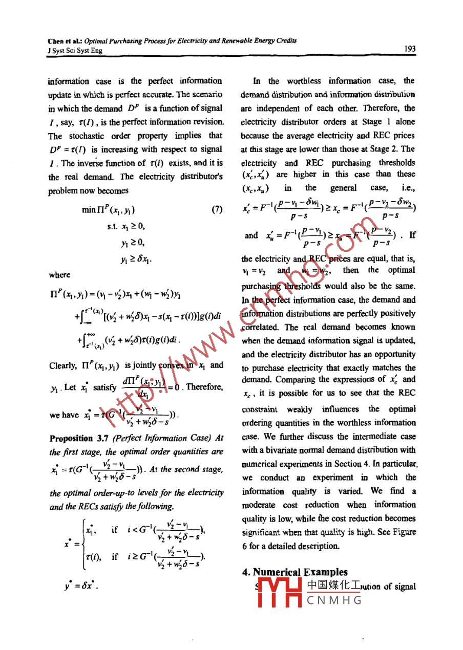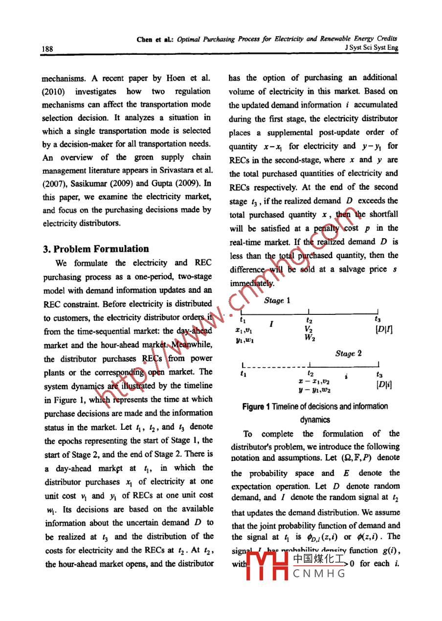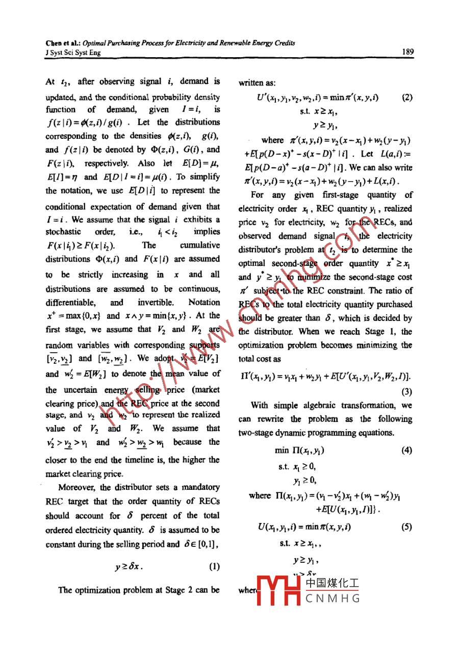 J Syst Sei Syst Eng (Jun 2012) 21(2): 184-203ISSN: 1004-3756 (Paper) 1861-9576 (Online)DOI: 10. 1007/s11518-012-5192-3CN11-2983/NOPTIMAL PURCHASING PROCESS FOR ELECTRICITY ANDRENEWABLE ENERGY CREDITS WITH PRICE AND DEMANDUNCERTAINTYZhiyuan CHEN Yiwen SU2 Houmin YAN3'Department ofAutomation, Tsinghua Universit, Beijing, 100084. China'Department of Sytems Engineering and Engineering Management, The Chinese University of Hong Kong,Shatin, N.T, China'Department ofManagement Sciences, City University of Hong Kong Kowloon, Chinahoumin. yan@cityu. edu.hk (8)AbstractThis paper optimizes the electricity and renewable energy credit (REC) purchasing process forenergy distribution. Electricity is traded in deregulated time-sequential markets at fluctuating prices.Optimal electricity purchasing under price and demand uncertainty is a challenging task for electricitydistributors, and the recently implemented renewable portfolio standards (RPS) further complicate thepurchasing process. Goverment regulatory decisions concemning the RPS require distributors topurchase corresponding certificates, namely RECs, equivalent to a certain percentage of theirelectricity sales. This paper formulates and optimizes the joint purchasing process for electricity andRECs. It also analyzes the effect of RPS policy on electricity distributors.Keywords: Renewable energy credit, information update, dynamic programming1. Introductionemissions sources across the United States." ToCarbon dioxide (CO2) emissions are thereduce carbon emissions, many U.S. states havemain cause of climates change, such as risingadopted a mandatory renewable energy policysea levels, severity and frequency of extremenamed as renewable portfolio standard (RPS).weather, ecosystems imbalance, and otherThe RPS requires that the electricity purchasingenvironmentalproblems.The electricityprocess include the purchase of correspondinggeneration sector is an intensely high-carbongovermment certificates called renewable energyindustry with a heavy reliance on fossil fuels.credits (RECs) to support the generation ofAccording to the U.S. Environments Protectionelectricity from renewable energy sources (U.S.Agency (2010) “The process of generatingDepartment of Energy 2010). In Califormia, forelectricity is the single largest source of CO2example, electricity dstributors need to showemissions in the United States, representing 40%that中國煤化工of total CO2 emissions from all CO2equivTYHCNMH G◎Systems Engineering Society of China & Springer-Verlag Berlin Heidelberg 2012Chen et al: Optimal Purchasing Process for Electricity and Renewoble Energy CreditsJ Syst Sci Syst Eng185The U.S. electricity market is a rather specialelectricity it produces from such sources. Thecase. Power generation piants sell elecricity to apower plant can sell these RECs 10 ectricitypower pool, Electricity distributors thendistributors to gaincompensation for itpurchase power from the pool and sell it tcinvestment costs in exploring renewable energycustomers. In the electricity markets, thesources. These electricity distributors then passdistributors bid oa and purchase electricity moreon the corresponding RECs, based on their sales,than once in the facc of imperfect demand10 the govemment to demonstrate theiuinformation and uncertainty in both price ancompliance with their regulatory obligations.demand. Take the electricity markets irRECs are central to the implementation of anCalifomia as an example. The states electricityRPS. Such a credit is a tradable certificate ofdistributorsbavemultiplepurchasingproof that me kWh of elecincity has beenopportunities, and there are three typicalgenerated from a renewable fuel source. Creditstime-sequentialelectricitymarkets:theare denominated in kWh and are a separateday- ahead market, the hour-ahead market (alsocommodity from the power itself. Electricity andknown as day-of market), and the indcpendentRECs can be, and often are, sold separately.systcm operator (ISO) teal-time marke. As timeThere thus exists an open REC market ingocs by, ditributors bave two opportunities toconjunction with the corresponding electricityprocure electricity from the day-ahead andmarket. The price of RECs depends on thehour-ahead markets. In the ISO real time market,equilibrium of demand and supply. An RPSthe total quantities of electricity purchased fromrequires all electricity distributors (or electricitytbe day-ahead and hour-ahead markets anrctailers, depending on the policy design) tocompared to the realized demand. Electricitydemonstrate, through the ownersbip of credits,distributors are then forced to buy/sell thethat they have supported an amount ofdifference betweea the realized demand andreaewable energy generation tbat is equivaleatelectricity purcbased. The optimal purchasing切0 a given percentagc of their to1a) xWh sales'.problem in the electricity market has beenUnder a mandatory RPS policy, electricitysolved by Sethi et al. (2005) and Yan et al.distributors must cach day determine the order(2000a, 2000b).quantities of kWhs electricity that need to beThe electrons that make up commoditypurchased in the day-ahead or hour-aheadelectncity are physically the same and cannot bemarkets to meet demand and tbe requiredidentified as coming from traditional energyquantities of RECs. In this paper, we derive asources or renewable sources. Governmentsmodel that optimizes the purchasing processcreaced RPS to address this challenge. The RPSsubjcct to RPS policy and demand informationmechanism generally places 叨obligation nupdates in time- scquential markets for clectricitypower plants to produce a specified fraction ofelectricity from renewable energy sources, andI For example, if the RPS is set to 5% and anthe govermment issues coresponding RECs toelectricity, distributor sells 100,000 kWhs, then itncc中國煤化工the power plantsthe pawer plant based on the quantity ofor cfYHCNM HGChen et sa; Optimal Purchasing Process for Electricity and Renewable Energy