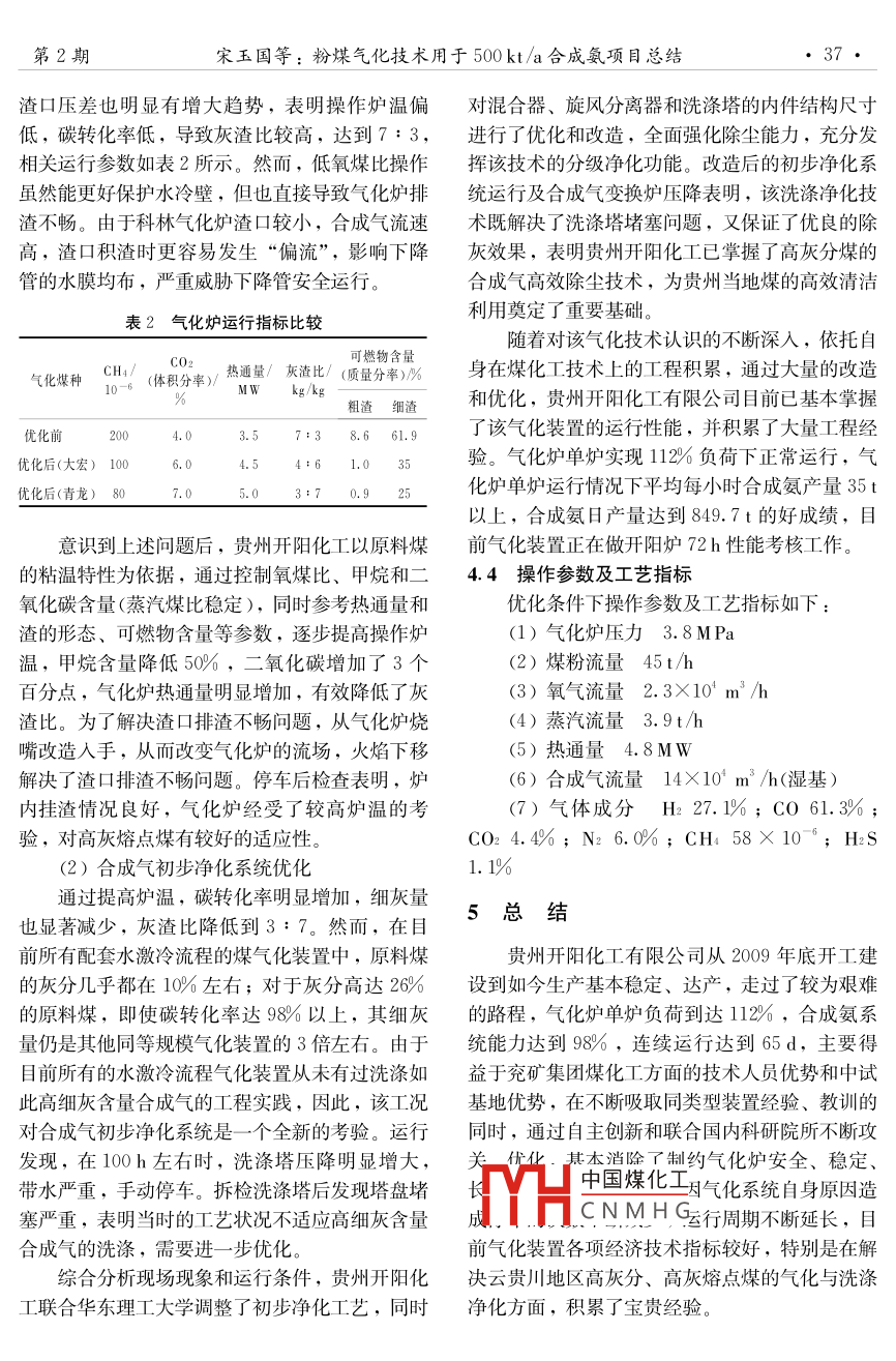 化工設(shè)計通訊第40卷第2期,34●Chemical Engineering Design Communications2014年4月粉煤氣化技術(shù)用于500kt/a合成氨項目總結(jié)宋玉國,張慶忠(兗礦新疆煤化工有限公司,新疆烏魯木齊830011)摘要:介紹貴州開陽 500 kt/a合成氨裝置氣化技術(shù)的特點,工藝流程,以及裝置的開車及試生產(chǎn)情況。關(guān)鍵詞: 500kt/a 合成氨;頂噴式干煤粉氣化;運行中圖分類號: TQ113. 26文獻標志碼: B文章編號: 1003-6490(2014 )02-0034-04Operation of Dry Pulverized Coal Gasification Process in the 500 kt Ammonia PlantSONG Yu-guo ,ZHA NG Qing-zhong( Y ancon Xinjiang Coal Chemical Industry Co .,Ltd .. Urumqi Xinjang 830011 ,China)Abstract :Describe the gasification technology features , process,the unit start-up and trialproduction in Kaiyang 500 kt/a ammonia plant .Key words 500 kt/a ammonia ; top spraying dry pulverized coal gasification ; operation貴州開陽500 kt/a合成氨項目是大型煤化工占地2136畝,于2010年底開工建設(shè),2012年6項目。該項目由兗礦集團與貴州開磷集團共同投月完成建設(shè)安裝,進入試運行階段。資建設(shè),是國家批準的貴陽煤磷化工(國家)生態(tài)本項目由中國天辰化學(xué)工程公司負責總體設(shè)工業(yè)示范基地重點項目,總投資43億元人民幣,計, 多家化建公司參與建設(shè)。由于地質(zhì)條件和原收稿日期: 2014-01-08作者簡介:宋玉國(1971-), 男,山東滕州人,助理工程師,現(xiàn)從事生產(chǎn)技術(shù)管理工作。響熱井液位。由于疏水系統(tǒng)屬于負壓區(qū),若磁翻板液位計(2)對冷凝水泵出口調(diào)節(jié)閥氣源、閥位開關(guān)法蘭密封面存在泄漏,空氣會吸人,會影響磁翻情況進行檢查,確認正常,排除了冷凝水泵出口板液位計的浮子正常位置,造成液位計顯示波調(diào)節(jié)閥故障影響熱井液位。動,熱井液位隨之波動,而一旦法蘭面密封效果(3)聯(lián)系調(diào)度檢查冷凝液管網(wǎng)管路是否暢不好又不容易發(fā)現(xiàn)。知道了問題的原因,立即停通,閥門開度是否到達要求,出水量是否正常。掉備用運行的冷凝水泵,進、回水液位改為手動確認運行正常,排除了冷凝液管網(wǎng)壓力過高或不控制 ;對液位計法蘭面進行緊固,并涂抹黃油密暢通影響熱井液位。封,直至10 :.00液位穩(wěn)定正常。(4)對液位變送器進行檢查。本熱井設(shè)置兩3結(jié)語個液位計,磁翻板液位計和玻璃板液位計,熱井液位測定由磁翻板液位計傳輸信號至主控室,正本次對汽輪機調(diào)速系統(tǒng)和冷凝系統(tǒng)消缺優(yōu)化常情況下玻璃板液位計顯示水位應(yīng)該和磁翻板液后。壓縮機可以滿負荷運行,汽輪機運行轉(zhuǎn)數(shù)穩(wěn)位計顯示-致。但是巡檢人員到達現(xiàn)場對比兩個欠中國煤化工,一個小小的雜質(zhì)就液位計,發(fā)現(xiàn)玻璃板液位計液位持續(xù)下降,磁翻THCNMH法蘭面泄漏就會引起液板液位計劇烈波動。因此造成液位劇烈波動的根位的波動?;どa(chǎn)的特殊性要求我們防微杜本原因是磁翻板液位計失靈,而當備用冷凝水泵漸,細節(jié)決定成敗。另外,密切結(jié)合現(xiàn)場實際,自啟動后水位迅速下降,玻璃板液位計顯示的才多方面、多專業(yè)、多角度考慮問題,只有多增進是真實的熱井液位。學(xué)科間的融合才能更好地解決各種故障和難題。第2期宋玉國等:粉煤氣化技術(shù)用于500kt/a合成氨項目總結(jié)●35●始地貌復(fù)雜,場平、地基處理、基礎(chǔ)與框架施工和設(shè)計改造,最終確定設(shè)計方案。裝置于2010難度大,增加了項目投資,對工程項目的進展影年底開工建設(shè),2012 年6月完成建設(shè)安裝。設(shè)響較大。整個廠區(qū)生產(chǎn)裝置分布在三個臺階上,計年操作時間8000h,設(shè)計單臺氣化爐滿負荷運第一臺階為空分、熱電,標高1 178m,第二個行有效氣產(chǎn)量為7X10' m3 /h。臺階布置氣化、凈化、合成,標高1170m,第該氣化裝置包括磨煤干燥、煤粉供料、氣三個臺階為公用工程及生產(chǎn)輔助設(shè)施,標高化、合成氣初步凈化、含渣水處理等工序。粉煤1157 m。制備為常規(guī)成熟技術(shù);煤粉供料系統(tǒng)采用兗礦集空分裝置由法液空成套提供,供氧能力6X團干煤粉中試技術(shù);開陽氣化爐的上半部分,即10* m3 /h,氣化采用引進科林氣化技術(shù)基礎(chǔ)上再氣化室,采用科林技術(shù)并加以創(chuàng)新改造;氣化爐經(jīng)過開發(fā)創(chuàng)新的開陽爐(3+ 1頂噴式干煤粉加壓的下半部分,即激冷室及其后面的粗合成氣初步氣流床氣化技術(shù))、合成氣凈化采用耐硫變換、凈化和渣水處理工序為成熟的自主產(chǎn)權(quán)技術(shù)。大連理工大學(xué)低溫甲醇洗,合成氣精制采用杭州在設(shè)備加工制造方面,氣化裝置的國產(chǎn)化率中泰的液氮洗工藝,氨合成采用瑞士卡薩利中壓很高;除燒嘴為國外制造(現(xiàn)已國產(chǎn)化),其余設(shè)氨合成技術(shù)。硫回收采用荷蘭荷豐超級克勞斯工備均國產(chǎn)化。藝。在煤氣化技術(shù)的選擇上,貴州開陽進行了多2工藝流程方調(diào)研。為適應(yīng)貴州煤灰分高、灰熔點高、煤礦工藝流程如圖1。由磨煤干燥單元制備的合小而分布廣的煤種特點,同時也為自主知識產(chǎn)權(quán)格煤粉存于常壓粉倉。粉倉內(nèi)的煤粉通過三個煤粉煤氣化技術(shù)工業(yè)示范項目積累工程經(jīng)驗,確定粉鎖斗向- 一個發(fā)料罐供料。發(fā)料罐設(shè)有三路煤粉引