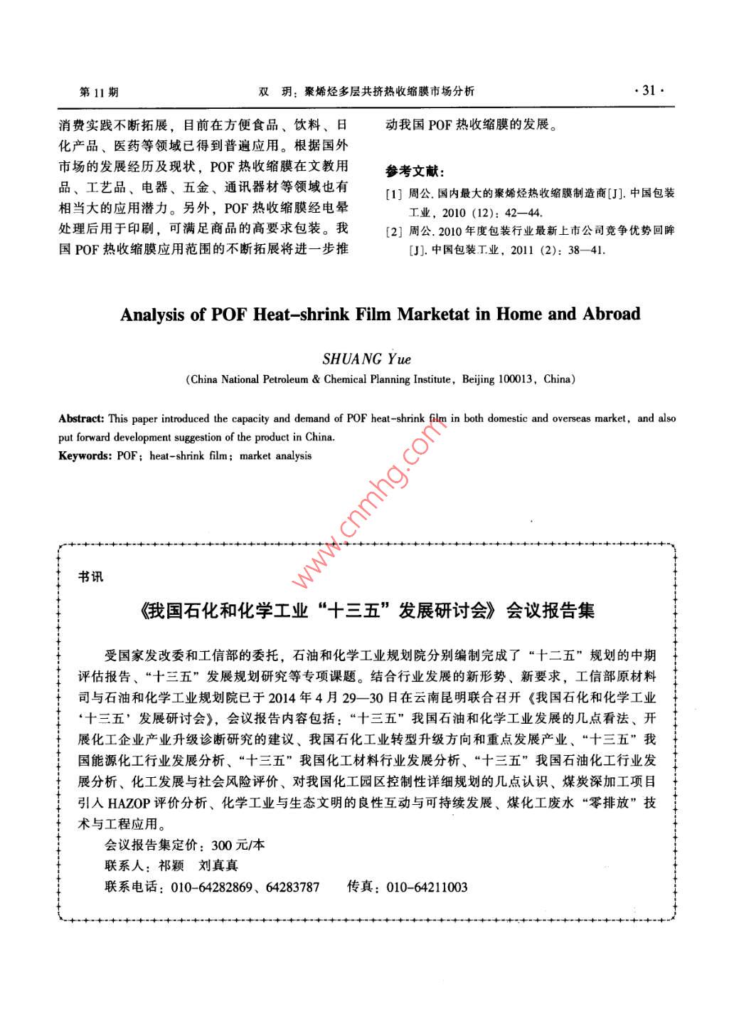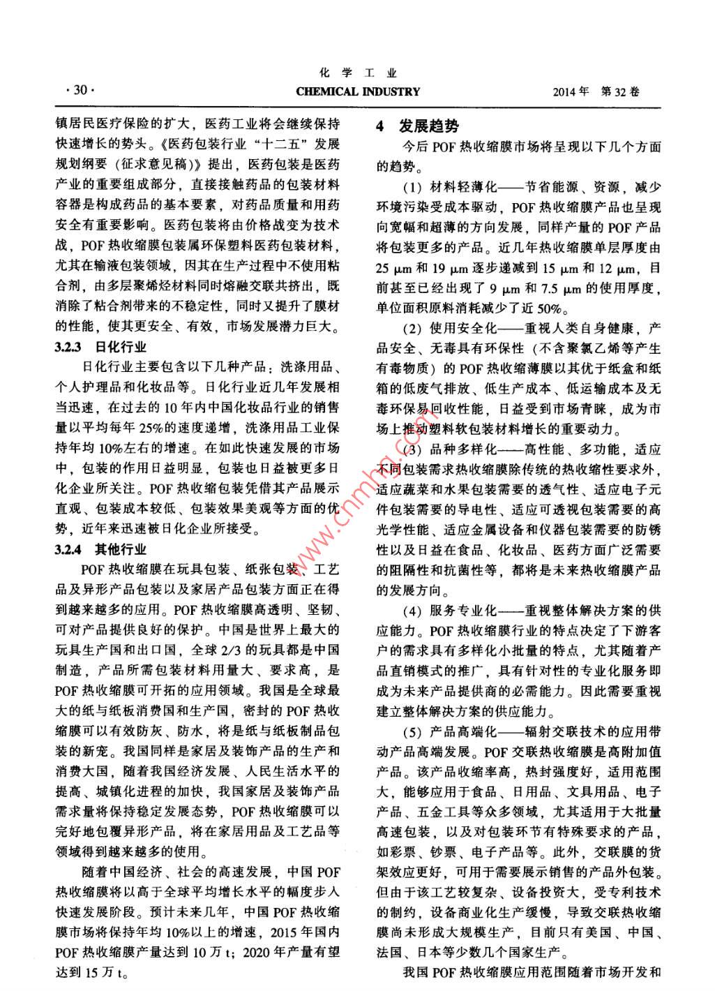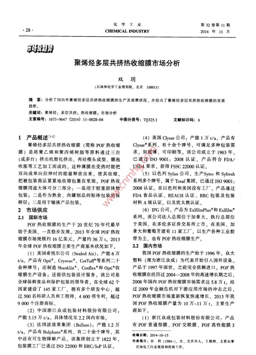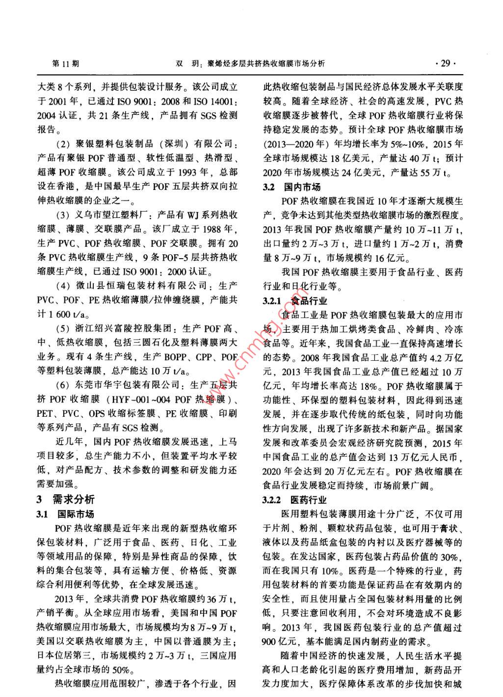 化學工業(yè)第32卷第11期●28●CHEMICAL INDUSTRY2014年11月市打及趨勢聚烯烴多層共擠熱收縮膜市場分析雙玥(石油和化學工業(yè)規(guī)劃院,北京100013)摘要:分析了國內(nèi)外聚烯烴多層共擠熱收編膜的生產(chǎn)及消費狀況,并給出了聚烯烴多層共擠熱收縮膜的發(fā)展趨勢。關(guān)鍵詞:聚烯烴;多層共擠;熱收縮膜;市場分析文章編號: 1673-9647 (2014) 11-0028-04中圖分類號: TQ325.1文獻標識碼: A1產(chǎn) 品概述1[12)(4)美國Clysar公司:產(chǎn)能1萬V/a,產(chǎn)品有聚烯烴多層共擠熱收縮膜( 簡稱POF熱收縮Clysar°系列,有十余個牌號,可滿足多種包裝需膜)是將聚乙烯和聚丙烯樹脂等原料通過三臺求,如超薄、可印刷等。該公司成立于1963年,(或多臺)擠出機塑化擠出,再經(jīng)模頭成型、膜泡已通過ISO 9001: 2008 認證,產(chǎn)品符合FDA/吹脹等工藝加工而成的。這種薄膜在受熱時能把USDA要求,獲得FSSC 22000認證。雙向或單向拉伸時的能量釋放出來,使其收縮,(5)以色列Syfan公司,生產(chǎn)Sytec 和Syfresh把被包裝商品緊緊地收縮包裹在里面。POF熱收系列多個牌號,屬于Tosaf集團,已通過ISO 9001:縮膜用途大體可分三部分:一是用于較重固體物2008認證。在以色列和美國設(shè)有工廠,產(chǎn)品通過包裝;二是作為熟食、肉罐制品的貼體包裝的保FDA食品認證、REACH認證、BRC包裝及包裝鮮層;三是用于輸液產(chǎn)品包裝。材料A級認證,以及猶太教認證。2市場供應(6) IPG 公司,產(chǎn)品為ExfilmPlus*和Exfilm*2.1 國際市場系列。該公司法人總部位于加拿大,執(zhí)行總部位POF熱收縮膜的生產(chǎn)于20世紀70年代最早于美國,在多倫多證券交易所上市,在美國、加始于美國,一直穩(wěn)步發(fā)展。2013 年全球POF熱收拿大和葡萄牙建有11家工廠,以生產(chǎn)各種工業(yè)膠縮膜市場規(guī)模約16億美元,產(chǎn)量約36萬t。2013帶為主,也有POF熱收縮膜生產(chǎn)。年全球POF熱收縮膜主要生產(chǎn)商基本狀況如下。2.2國內(nèi)市場(1)美國希悅爾公司(Sealed Air): 產(chǎn)能6萬我國POF熱收縮膜的生產(chǎn)始于1996年,眾大t/a,產(chǎn)品有Opti*, Cryovac, CorTuff等系列二十塑料(現(xiàn)為浙江眾成)為代表開始引入國外設(shè)備。余種牌號;還制造Shanklin、Conflex" 和Opti°收產(chǎn)品于1997年面世,之前完全依賴進口。POF熱縮膜生產(chǎn)設(shè)備;還提供包裝設(shè)計服務。該公司是收縮膜在經(jīng)歷過2004- -2008 年的高速增長期之后,全球保鮮食品和保護包裝的領(lǐng)導者,在全球62個2008年國內(nèi)POF熱收縮膜市場需求達5.8萬t。經(jīng)國家建設(shè)了145家工廠,擁有多個研發(fā)中心,超過2009年金融危機對下游應用市場的沖擊之后,過500名科研人員和工程師,4 600項專利,超過POF熱收縮膜市場重新恢復快速增長,2013 年我9000個注冊商標。國POF熱收縮膜產(chǎn)量為10萬~11萬t,主要生產(chǎn)(2)中國浙江眾成包裝材料股份有限公司:商如下。產(chǎn)能3.15萬t/a。具體情況見2.2國內(nèi)市場。(1)浙江眾成包裝材料股份有限公司:產(chǎn)品(3) 法國波洛萊集團(Bollore): 產(chǎn)能1.2萬有POF普通型膜、POF交聯(lián)膜、POF高性能膜3Va,產(chǎn)品有Bolphane" 系列,有二十余個牌號,其收稿日期: 2014-10-15中還有可生物降解產(chǎn)品。該集團創(chuàng)立于1822年,作者簡介:雙玥(1984-),女,北京市人,工程師,主要從事包裝膜工廠已通過ISO 22000和BRC/IoP認證。石油化工行業(yè)規(guī)劃和咨詢T.作。第11期雙玥: 聚烯烴多層共擠熱收縮膜市場分析. 29.大類8個系列,并提供包裝設(shè)計服務。該公司成立此熱收縮包裝制品與國民經(jīng)濟總體發(fā)展水平關(guān)聯(lián)度于2001年,已通過Iso 9001: 2008和ISO 14001:較高。隨著全球經(jīng)濟、社會的高速發(fā)展,PVC 熱2004認證,共21條生產(chǎn)線,產(chǎn)品擁有SGS檢測收縮膜逐步被替代,全球POF熱收縮膜行業(yè)將保報告。持穩(wěn)定發(fā)展的態(tài)勢。預計全球POF熱收縮膜市場(2)聚銀塑料包裝制品(深圳) 有限公司:(2013- -2020 年)年均增長率為5%~10%,2015 年產(chǎn)品有聚銀POF普通型、軟性低溫型、熱滑型、全球市場規(guī)模達18億美元,產(chǎn)量達40萬t;預計.超薄POF收縮膜。該公司成立于1993年,總部2020年市場規(guī)模達24億美元,產(chǎn)量達55萬t。設(shè)在香港,是中國最早生產(chǎn)POF五層共擠雙向拉3.2國內(nèi)市場伸熱收縮膜的企業(yè)之- - 。POF熱收縮膜在我國近10年才逐漸大規(guī)模生(3)義烏市望江塑料廠:產(chǎn)品有WJ系列熱收產(chǎn),競爭未達到其他類型熱收縮膜市場的激烈程度??s膜、薄膜、交聯(lián)膜產(chǎn)品。該廠成立于1988 年,2013年我國POF熱收縮膜產(chǎn)量約10萬~11萬t,生產(chǎn)PVC、POF 熱收縮膜、POF交聯(lián)膜。擁有20出口量約2萬-3萬t,進口量約1萬~2萬t,消費條PVC熱收縮膜生產(chǎn)線,9條POF-5層共擠熱收量8萬~9萬t,市場規(guī)模約16億元。縮膜生產(chǎn)線,已通過ISO 9001: 2000 認證。我國POF熱收縮膜主要用于食品行業(yè)、醫(yī)藥(4)微山縣恒瑞包裝材料有限公司:生產(chǎn)行業(yè)和日化行業(yè)等。PVC、POF、PE熱收縮薄膜/拉伸纏繞膜,產(chǎn)能共3.2.1 食品行業(yè)計1 600v/a。食品工業(yè)是POF熱收縮膜包裝最大的應用市(5)浙江紹興富陵控股集團:生產(chǎn)POF高、場,主要用于熱加工烘烤類食品、冷鮮肉、冷凍中、低熱收縮膜,包括三圓石化及塑料薄膜兩大食品等。近年來,我國食品工業(yè)- -直保持高