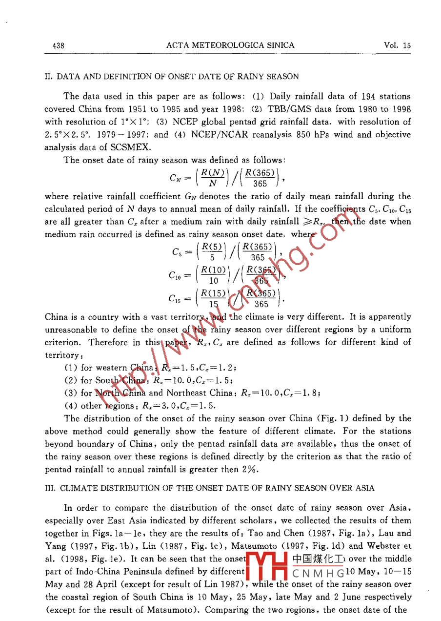 Vol.15 No. 4ACTA METEOROLOGICA SINICA2001ON THE PROCESS OF SUMMER MONSOON ONSET OVEREAST ASIA'CHEN Longxun (陳隆勛). LI Wei (李薇). ZHAO Ping (趙平)Chinese Academy of Meteorological Sciences. Beiing 100081and TAO Shiyan (陶詩言)Institute of Atmospheric Physics, Chinese Acadermy of Sciences. Bejjng 100029Received May 10, 2001; revised August 14. 2001ABSTRACTUsing daily observational rainfall data covered 194 stations of China from 1961 to 1995 andNCEP model analyzed pentad precipitation data of global grid point from 1979 to 1997, thedistribution of onset date of rainy season over Asian area fron spring to summer is studied in thispaper. The analyzed results show that therc exist two stages of rainy season onset over East Asianregion from spring to summer rainy season onset accompanying subtropical monsoon and tropicalmonsoon respectively. The former rain belt is mainly formed by the convergence of cold air and therecurved southwesterly flow from western part of subtropical high and westerly flow from the so-called western trough of subtropical region occurring during winter to spring over South Asia. Thelatter is formed in the process of subtropical monsoon rain belt over inshore regions of South ChinaSea originally coming from south of Changiang (Yangtze) River Basin advancing with northwardshift of subtropical high after the onset of tropical monsoon over South China Sea. The pre- floodrainy season over South China region then came into mature period and the second peak of rainfallappeared. Meiyu, the rainy season over Changjiang Huaibe River Basin and North China thenformed consequently. The process of sutmer tropical monsoon onset over South China Sea in 1998is also discussed in this paper. It indicated that the monsoon during summer tropical monsoononset over South China Sea is the result of the westerly flow over middle part of Soutb China Sca,which is from the new generated cyclone formed in north subtropical high entering into SouthChina Sea, converged with the tropical southweslerly flow recurved by the intensified cross-equatorial flow.Key words: subtropical monsoon rainy season, tropical monsoon rainy scason, summer nonsoononset, East AsiaI. INTRODUCTIONIn 1987, Tao and Chen (1987) put forward a figure of distribution of the onset date ofthe Asian summer monsoon by synthesizing the previous result of Chinese and Indianscholars. According to the result shown in the figure. the earliest onset of the summermonsoon started over the South China Sea (SCS). The result was recarded as one of themain bases for the South China Sea Monsoon Exp中國煤化工ich was carriedTYHCNMHG, This paper is supported by the State Ministry of Science and Technology under the key project A ofSouth China Sea Monsoon Experiment.CHEN Longxun. LI Wei, ZHAO Ping and TAO Shiyan437out in 1998 (PRC-US scientific Working Group 1995). Later, the issue of the seasonalvariation of the Asian summer monsoon has been further studied by many scholars (Lauand Yang 1997; Matsumoto 1997; Webster et al. 1998). They indicated their own onsetdate of the rainy season of the summer monsoon over East Asia according to different datasuch as OLR,wind and rainfall amount, and conforma bly indicated that the earliest onsetof the rainy season started over the Indo-China Peninsula, while the onset date of the rainyseason over the Indo-China Peninsula are different from each other with the onset datechanging from 28 April < Matsumoto 1997) t0 10 May (Lau and Yang 1997; Webster etal.,1998). In another respect. the climatological onset date of the summer monsoon overSouth China Sea has been studied by many Chinese scholars (Xie et al. 1996: Yan 1997;Chen et al. 1999; Liang and Wu 1999). Nearly conformably. the onset date of thesummer monsoon over SCs was defined in the fourth pentad of May although the methodand data were different. Therefore, the onset of the summer monsoon over Indo-ChinaPeninsula was almost 10- 20 days earlier than that over the SCS although the two regionsare different only 5一10 degrees in longitude. the reason is necessary to be explained.Chen et al. (1991) indicated that there existcd tropical monsoon and subtropical one in themonsoon system over East Asia, and that the rainfall showed a pattern of bimodaldistribution over the region from Hainan Island to South China,on an average, the firstpeak occurred in mid-April while the earliest could occur in March. this is the time of thestarting period of pre-flooding rainy season over South China or so-called "Meiyu" inTaiwan region. Till the onset of the tropical summer monsoon, the rainy season of thepre-looding season over South China reached peak time and proceeded northward. Thuswe should study whether the onset of the rainy season over the Indo-China Peninsula andthe onset of the rainy season of April over South China belong to subtropical rainy season,and whether the rain belt extended from South China to Indo-China Peninsula as well aswhether it was caused by the convergence of cold air and the recurved southwesterly flowfrom western part of subtropical high. The result of the paper showed that there existedtropical and subtropical rainy season onset over East Asian region. The rainfall over manysubtropical regions showed a pattern of bimodal distribution. In early April, a rain beltwas formed by the convergence of cold air and the recurved southwesterly flow fromwestern part of subtropical high and westerly flow from the so-called western trough ofsubtropical region which occurred during winter 10 spring over South Asia. After the startof rainy season over north of South China or south of Changiang River Basin, the rain beltextended southwestward to Indo- -China Peninsula and southward to north of SCS, this wasthe first time of onset of the rainy season. but is over subtropical region. Then came theonset of the rainy season over the tropical region. The rain belt of the tropical monsoonmoved northward rapidly to 10- 15°N from equatorial region af