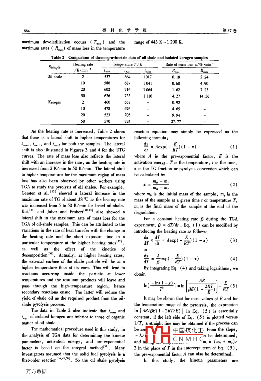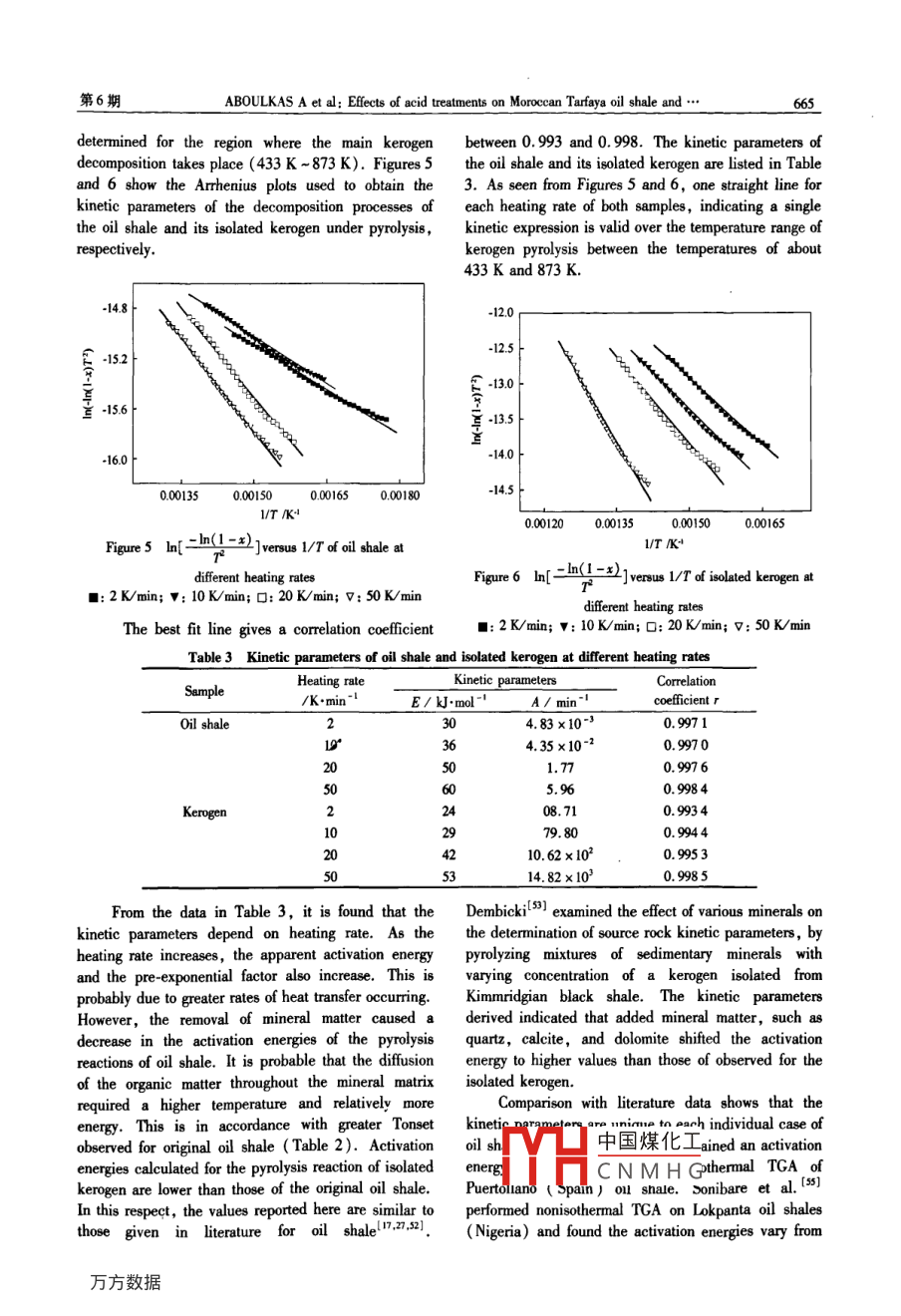 第37卷第6期燃料化學(xué)學(xué)報Vol.37 No.62009年12月Joumal of Fuel Chemistry and TechnologyDec. 2009文章編號: 0253-2409(2009)06-0659-09Effects of acid treatments onMoroccan Tarfaya oil shale and pyrolysis of oil shale and their kerogenABOULKAS A'2, EI HARFI K!2(1. Laboratoire de Recherche sur la Reactivites des Materiaux et lOptimisation des Procedes《REMATOP> ,Deparement de chimie, Faculte des Sciences Semlalia, Universite Cadi Ayyad, BP 2390, 40001 Marrakech, Maroc .2. Laboratoire Interdisciplinaire de Recherche en Sciences et Techniques, Facultepolydisciplinaire de Beni-Mellal, Universite Sultan Moulay Slimane, BP 592 , 23000 Beni Melal, Maroc)Abstract: In this study, the kerogen of oil shale from Moroccan Tarfaya deposits was isolated and the changes in the initial organicmatter during the removal of the mineral matrix were examined. Chloroform extraction of the oil shale increases the intensity of thepeaks in the X-ray dffactograms. Infrared spectra and X-ray difractograms reveal the presence of mineral , calcite , quartz, kaolinite ,and pyrite in the mineral matrix of the oil shale. Hydrochloric and hydroluoric acids dissolution do not alter the organice matter. Thenonisothermal weight loss measurements indicate that thermal decomposition of the isolated kerogen can be described by first-orderreaction. A single kinetic expression is valid over the temperature: range of kerogenpyrolysis between 433 K and 873 K. Furthermore,the results indicate that the removal of mineral malter causes a decrease in the activation energies of the pyrolysis reactions of oil shale.Key words: oil shale; demineralization; isolated kerogen; pyrolysisThe curent energetic crisis is mainly due to theconceptual definition implies that kerogen andincreasing demand of energy and political instability ofpetroleum have complementarycharacteristics.oil-producing countries. Dependence on petroleumAccordingly, petroleum ( and more generally bitumen)could be avoided by exploiting other fossil sources of is soluble in the usual organic solvents whereas kerogenfuel, such as coal, oil shales, and tar sands. World-is the sedimentary organic matter insoluble in thesewide petroleum reserves are calculated to be 12 400solvents.milliards of barrels ( which would last for about 43In this article ,isolation and bulk characterizationyears at the present consuming rate) ,while oilof kerogen are described to define precisely thecontained in oil shales represents 3 300 000possible limitations in interpretation resulting frommilliards'various isolation procedures. Other analytical methodsIn Morocco, 90% of the energy consumed isare considered only through their applications but aredependent on imported oil. Thus, an intensivenot specifically described. In general, as a result ofprogramme was commenced for the mobilzation ofthe low concentration of kerogen in sedimentary rocks,indigenous energy sources, especially the local oithe isolation of this dispersed macromolecular organicshales. Morocco is very rich in Upper Cretaceous oilmatter from associated minerals is a prerequisite forshale deposits, the main sites of oil shale are located atapplying many of the analytical techniques first directlyTimahdit ( Middle Atlas Mountains ) and Tarfayaused for coal characterization. Several isolation or( South Morocco). The oil-shale deposits in Moroccoconcentrationprocedures have been proposed,represent about 15% of known oil shale resources independing on the desired type of organic isolate and thethe world!2). Oil-shale deposits can be considered asanalysis to be performed. These procedures can beinteresting potential sources of carbon or of organicsubdivided into physical and chemical methods.molecules which could be exploited diversely in thePhysical separation method aims at avoiding anyfuturel3-5].chemical alteration of the organic matter during theKerogen is the sedimentary organic matter whichconcentration step. Chemical methods are generallygenerates petroleum and natural gas. In this respect ,better than the physical separation methods formany efforts have been made to its isolation and to theobtaining good separation of the kerogen from thechatacterization of its chemical structure and evolutionminerals but leave more questions about structuralduring sediment burial, aiming at a better prediction ofalteration of the kerogen'Despite attempts with aoil and gas pools. Considerable advances have beennumber of chemical reagents. no general method hasachieved with respect to the prediction of oil and gasbeen中國煤化工tely separate thpotential and the simulation of petroleum systems. Thisunchai.FYTHCNMHGimentary mixture.Received date: 2009-0504; Received in rerised form: 2009 08-10.Corresponding author; ABOULKAS A: Tel.: +212 523 485122; Fax: +212 523 485201。E-mail: a. aboulkas@ yahoo. fr。本文的英文電子版由Elserier出版社在ScienceDiret上出版( htp://www siencedrect. con/sience/jouma/18725813)。660燃料化學(xué)學(xué)報第37卷The conventionalhydrochloric/hydrofluoric acidGoymuk and Green River oil shale. Berkorich et al18])treatment is efective for removing most carbonate ,presented a novel technique to the thermaloxide,and monosulfide minerals from sedimentarycharacterization of oil shale. This approach involves therocks and leaves kerogen and pyrite largelyseparation of the unique components of oil shale, theunaffected-9. Effective removal of pyrite is usuallykerogen and the clay minerals, using chemical andthe main problem' 0. Petroleum geochemists have longphysical techniques. Enthalpy data for dehydration andbeen interested in obtaining pyrite free and chemicallypyrolysis of kerogen were also determined.unaltered kerogen concentrates. Quantiative removalThe aim of this study was to investigate the effectsof pyrite is not possible without alteration of the organicof hydrochloric and hydrofluoric acids treatments. Thecomposition. The magnitude of the change in thechemical changes occ
