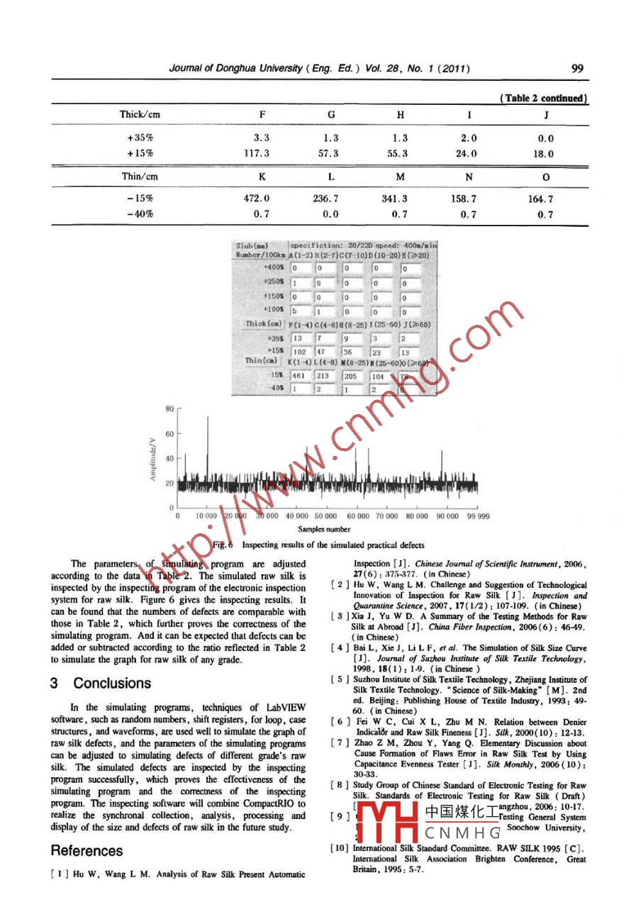)6Joumal of Donghua University(Eng. Ed.) Vol. 28, No. 1 (2011)Simulation and Analysis of Raw Silk DefectsSHI Jia-li( 史佳麗) , ZHOU Guo-li(周國麗), FAN Rong-rong(范蓉蓉), CHEN Qing-guan(陳慶官) "Jiangsu Key Laboratory of Silk Engineering, College of Textile and Clothing Engineering , Soochow University , Suzhou 215021 , ChinaAbstract: To test the relibility and stability of the inspectingsilk[4] ,this simulating system offers favourable conditions forprogram of the electronic inspection system for raw silk, afurther study on the defects analyzing software of the electronicsimulating program is developed to simulate various defect caseswith the software tool of Laboratory Virtual Instrumentinspection system for raw silk .Engineering Workbench( LabVIEW). Many techniques, such asFeatures of Practical Tested Sizerandom numbers, shift registers, for loop, case structures andwaveforms, are used to facilitate the simulation. The simulatedGraph of Raw Silkdefects are inspected by the inspecting program sucessfully , whichproves the electiveness of the simulating program.In the reeling workshop, the fixed size reeling is usuallyKey words: raw silk; defects; simulation; progrumused. The size of raw silk is sensed by the sensor. When theCLC number: TS147Document code: Asize decreases to the limit for cocoon feeding, a signal is givenArticle ID: 1672 5220(2011 )02 -0096 -04to the cocoon supplying and feeding is ended[5]. Because thesize of raw silk gets smaller or ends may get dropped in theIntroductionreeling process, the inspected size of raw silk may be smallerthan its seting size, which means the friction between detectorChina has a long history of silk, with 70% production inglass and silk decreases. When the size of raw silk decreases tothe world and more than 80% exports in the world trade'"l.the limit for cocoon feeding, the lever falls down, and the end-Inspection for raw silk plays a very important role in enhancingfeeding signal will be sent out. Afler feeding is ended, the sizethe silk quality[21. According to the study on the inspectionof raw silk suddenly increases , approximately to that of the lastfor raw silk(3] , in our laboratory , inspections for evenness andend feeding, and the process repeats. The defects appeardefects- two of the most important items of the silk insectionrandomly when the raw silk size changes greatly[6].are being studied. A sensor was invented and related analysingThe data of raw silk in Fig. 1 are collected by a flamentsoftware of the electronic inspection system for raw silk wasyarn tester YG139 of China Aviation Industry Corporationdeveloped. In order to test the reliabilit and stability of theSuzhou Changfeng Co. ,Ltd. The test speed is 400 m/ minsoftware, a large number of samples should be collected fromand the sensor is capacitive. The principle of the capacitivethe silk inspection bureaus and silk factories. However, it issensor is that the change of silk size is tested by sensing theimpssible to obtain all kinds of defect cases only from thechange of the medium capacity of a certain length of silk[7].inspection institutions and factories and these procedures areAs Fig.l shows, the change of silk size is periodical and theusually costly and inconvenient. Therefore, according to thetendency of every period is a gradual decrease. Furthermore ,features of defects collected before, considering the graphthere are many peaks and vales in Fig. 1, which are the calledcharacteristic of raw silk, the number and type of defects ofdefects. The task of the electronic inspection for raw silk is toraw silk, a simulating program is developed to simluate variousdistinguish, sort and count these defects. According to thedefect cases which can be used to test the ectronic inpsectionfeatures above, the present software resource in our laboratorysystem. Since there is a lack of simulating defects of rawis used to simulate the size graph of the defects of raw silk.0.5,45 t0.425 t.20.1550000 100 000150 000200 000250 000300 000 350 000 400 000Sample numbersFig.1 Practical tested graph of raw silkare graded by virtue of dfferent sectional areas and lengths[81.Simulating Programs for Raw SilkAs Table 1 shows, the sectional areas are viewed from theDefectsherizontal perspectives and the length from the verticalparts and 40 grades2.1 Simulating ideawhic中國煤化工C,D, E), 10 gradesAccording to“Standards of Electronic Testing for RawthiclYHCNMH(_grades' thin nodes (K,ilk ( Draft)" put forward by the research group of ChineseL,Ito the major and minorstandard of electronic testing for raw silk, defects of raw silkdefects in the traditional inspection. Thick nodes are equivalentRece2009-10-13Keceived date:$ Correspondence should be addressed to CHENQing-guan, E-mail: qgchen@ suda. edu. cnJoumal of Donghua University(Eng. Ed.) Vol. 28, No. 1 (2011)97to the neat defects[8] . Thin nodes refer to thinner places longercollected every 1 mm. The length listed in Table 1 shows thethan 600 mm, which are resulted from serious lack of feedingnumber of continuously appearing points. For example, theends for raw silk, broken ends of high speed loom and so on.length of B4 is 2-7 mm, which means 2-7 points of more than+ 400% appear continuously, resulting in a big slub. For thickTable 1 Grading graph of raw silk defectsor thin nodes, due to their longer length, they can be realizedSlub/ mm1-22-7 7-1010-20 >20by elongating arayswith LabVIEW. Because of the endfeeding while reeling, the appearing probabilities of big or+ 400%AB4DEmiddle slubs and thin nodes are relatively small, while+ 250%A3D3E3probabilities of small slubs and thick nodes relatively are large.+ 150%A2DXTherefore, relative parameters which depend on the appearing+ 100%AI:1probability of each kind of defects need to be set to make thesimulated defects graph of raw silk more close to the practicalThick nodes/mm 10-40 40-80 80 -250 250 -600 >600tested graph of raw silk.+35%P2C12J22.2 Simulating program+15%FncLabVIEW i