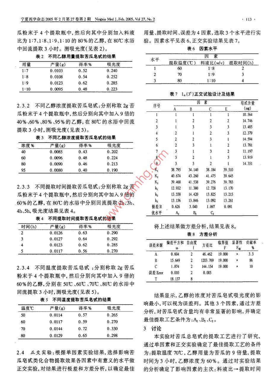 112寧夏醫(yī)學(xué)雜志2005年2月第27卷第2期 ingxia Med,feb.2005,va27n.2文章編號(hào):1001-5949(2005)02-0112-03·實(shí)驗(yàn)研究乙醇提取苦瓜皂甙的工藝研究孫磊【摘要]目的采用乙醇提取苦瓜皂甙,確定最佳工藝。方法采用單因素和正交試驗(yàn)法優(yōu)選提取苦瓜皂甙的最佳工藝,建立合理可靠的提取條件。結(jié)果最佳提取溫度70℃、溶劑用量為苦瓜的9倍量,提取時(shí)間3小時(shí)、乙醇濃度60%。結(jié)論工藝可行、合理。關(guān)鍵詞]苦瓜皂;乙醇;提取中圖分類號(hào)R284.2文獻(xiàn)標(biāo)識(shí)碼]A Study for technology of extracting balsamper glycoside with ethanol SUN Lei.(College of phamacy Harbin Uhiversity of commerce) [Abstract] Objective Adopr ethanol as the solevent to extract balsamper glycoside, and established the optimum process. Methods Single-factor and orthogonal design were used to choose the optimum extraction Process. So as to ensure the reasonable and reliable extracting condition. Results The optimum temperature is 70, the solvent is 9 times of the balsamper the extracting time is 3 hours, the concentration of the ethanol is 60%. Conclusion The process is available and reliable. [Key words] Balsamper slycoside; Ethanol Ertraction苦瓜系葫蘆科苦瓜屬植物的果實(shí),又名涼瓜癩0.10、0.15、0.20、0.25、0.30ml分別置于具塞試管中,瓜含有苦瓜素甙F1、1、G、胡蘿卜甾醇等活性成水浴揮去溶劑,加入新配制的5%香草醛-冰乙酸溶分,含苦瓜甙(為B-谷甾醇--D-葡萄糖甙和5、液0.2ml,高氯酸0.8ml。在60℃水浴中加熱15分25、-豆二稀醇-3-葡萄糖甙的等分子混合物)、鐘,流水冷卻,加冰乙酸5ml,搖勻,在15min內(nèi)于波長(zhǎng)苦瓜蛋白、5-羥基色胺、多種氨基酸、果膠類胰島548m處分別測(cè)吸光度,結(jié)果見(jiàn)表1另取無(wú)水乙醇素或稱植物胰島素(Plant insuliu)等??喙闲晕犊嚯S行空白對(duì)照(取0.35ml于具塞試管中,水浴揮去溶寒,具有消暑滌熱、明目解毒之功效。藥理研究表劑)。以吸光度(A)為縱坐標(biāo),人參皂甙Rg1濃度(C)明苦瓜具有降血糖、抗生育抗突變、抗菌、免疫調(diào)為橫坐標(biāo)繪制標(biāo)準(zhǔn)曲線。經(jīng)統(tǒng)計(jì)處理,得線形回歸節(jié)和抗HV等作用+5。關(guān)于苦瓜皂甙的藥理作用方程為:Y=0.0022x+0.0135,r=0.9974的研究已取得了很大進(jìn)展,但苦瓜皂甙提取工藝的表1人參皂甙Rg1標(biāo)準(zhǔn)品濃度與吸光度研究尚少見(jiàn)報(bào)道,本實(shí)驗(yàn)研究了用乙醇提取苦瓜皂體積(ml)0.000.050.100.150.200.250.30甙,并確定了最佳提取條件。濃度(m)02550751001251501材料與方法吸光度00.0740.1320.1830.2260.2790.3371.1一般資料:苦瓜(購(gòu)自哈爾濱第一百貨商場(chǎng)),人參皂甙Rg1標(biāo)準(zhǔn)品(中國(guó)藥品生物制品檢定所)。2.2苦瓜皂甙的測(cè)定:將苦瓜洗凈、去籽、切片、烘1.2方法采用單因素和正交試驗(yàn)法優(yōu)選提取苦瓜干、粉碎、脫脂、烘干,用乙醇回流提取。將提取液抽皂甙的最佳工藝。儀器為721分光光度計(jì)(上海第三濾、過(guò)濾,在60℃水浴中濃縮,然后用無(wú)水乙醇定容分析儀器廠),系列原裝 PRECISA天平(瑞士公至10ml,過(guò)濾,取1ml濾液于具塞試管中,用無(wú)水乙司)。醇再定容至10ml,取0.2ml于具塞試管中,在60℃水1.3統(tǒng)計(jì)方法:通過(guò)正交實(shí)驗(yàn)表做方差分析得到結(jié)浴中揮去溶劑,加入新配制的5%香草醛-冰乙酸溶論。液0.2ml,高氯酸0.8ml。在60℃水浴中加熱15分2結(jié)果鐘,流水冷卻,加冰乙酸5ml,搖勻,在15分鐘內(nèi)于波2.1標(biāo)準(zhǔn)曲線的制備:精密稱取人參皂甙Rg1的標(biāo)長(zhǎng)548mm處測(cè)吸光度A(取無(wú)水乙醇0.35ml作空白準(zhǔn)品2mg,加無(wú)水乙醇溶解定容至4ml,搖勻,作為對(duì)對(duì)照)。照品溶液。精密吸取上述對(duì)照品溶液0.05、2.3單因素的確定寧夏醫(yī)學(xué)雜志2005年2月第27卷第2期 Ningxia Med Feb.2005,vol2.n.2113瓜粉末于4個(gè)提取瓶中,然后向其中分別加入料液用量、提取時(shí)間、誤差為4因素,選取3個(gè)水平進(jìn)行實(shí)比為1:7、1:8、1:9、1:10的80%的乙醇,在80℃水浴驗(yàn)。因素水平見(jiàn)表6,正交實(shí)驗(yàn)結(jié)果見(jiàn)表7。中回流提取3小時(shí)。測(cè)吸光度(見(jiàn)表2)。表6因素水平表2不同乙醇用量提取苦瓜皂甙的結(jié)果因素用量產(chǎn)量(g)得率%吸光度水平提取溫度(℃)料液比(wv)提取時(shí)間(h)1:70.01030.520.240601:81:8230.01080.540.252123701:91:90.01230.620.285801:101:100.00950.480.223表71(3)正交試驗(yàn)設(shè)計(jì)及結(jié)果2.3.2不同乙醇濃度提取苦瓜皂甙:分別稱取2g苦序號(hào)序號(hào)AB因素皂甙含量 C E (mg)瓜粉末于4個(gè)提取瓶中,然后分別向其中加入9倍的1110.5640%、60%、80%、95%的乙醇,在80℃的水浴中回流21214.746提取3小時(shí),測(cè)吸光度(見(jiàn)表3)。342231231230123231312133313.485312.379表3不同乙醇濃度提取苦瓜皂甙的結(jié)果5223114.594濃度%產(chǎn)量(g)得率%吸光度62213.700.00850.430.20273211.19700890.00960.480.22483313.9190.00900.460.21393114.3510.00800.400.190K138.79534.14038.18439.51040.67443.26041.47539.64539.4681.53839.27639.782.3.3不同提取時(shí)間提取苦瓜皂甙:分別稱取2g苦k12.9321.38012.7283.170瓜粉末于4個(gè)提取瓶中,然后分別向其中加入9倍的k213.55814.42013.82513.215.60%的乙醇,在80℃的水浴中分別回流提取2h、3h、k313.15613.84613.09213.261極差R0.6263.0401.0970.0914h、5h,吸光度結(jié)果見(jiàn)表4。優(yōu)水平A2B2C2表4不同提取時(shí)間提取苦瓜