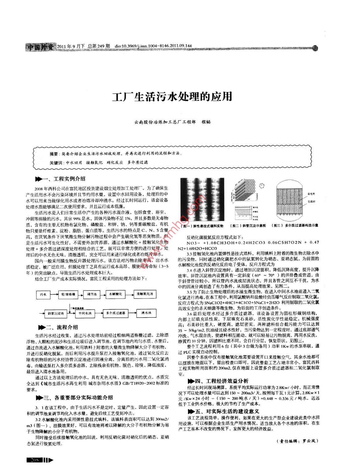 國外資2011年9月下總第249期d10399n14860114工廠生活污水處理的應(yīng)用云南股份冶煉加工總廠工程部程韜摘要:簡要介紹企業(yè)生活污水回收處理,并再次進行利用的流程和方法。關(guān)鍵詞:中水回用接觸氧化硝化反應(yīng)多介質(zhì)過濾一、工程實例介紹2008年西科公司在富民地區(qū)投資建設(shè)煙塵處理加工處理廠,為了確保生產(chǎn)生活用水不會污染環(huán)境并且節(jié)約用水量,設(shè)置中水回用設(shè)備,處理后的中性度水可以用來當做綠化用水或者冶煉冷卻沖渣水。經(jīng)過長時間運行,該套設(shè)備石英砂處理水質(zhì)能夠滿足二次使用要求,并且運行成本低廉。生活污水是人們?nèi)粘I钪挟a(chǎn)生的各種污水混合液,包括食堂、浴室沖廁等排除的污水,其宗9%是水,固體污染物不足1%,并且多數(shù)是無毒物質(zhì),含有的主要無機物有氯化物、磷酸鹽、和鉀、鈉、鈣等重碳酸鹽,有機物只要是纖維素、淀粉、脂肪、蛋白質(zhì)等。生活污水的特點是C、N、S含量高,在厭氧條件下厭氧微生物分解污物過程中會產(chǎn)生硫化氫等惡臭物質(zhì)。但反硝化菌脫氮反應(yīng)方程式如下生活污水可生化性好,不需要外加營養(yǎng)源,通過水解酸化+接觸氧化生物NO3-+1.08CH3OH+0.24H2CO30.06c5H7O2N+0.47處理+多介質(zhì)過濾深度處理相結(jié)合的工藝,就可以非常方便的進行處理,處N2+168H2O+HCO3理后的中水無色無味,清澈透明,完全可以用來進行綠化或者冶煉冷卻水3.3接觸氧化池內(nèi)置彈性懸掛式填料,利用填料上附著的微生物去除水中國內(nèi)一般釆用膜生物反應(yīng)器處理污水,該方法對污物去除率高,出水水的污染物,同時通過硝化菌把水中的氨氮轉(zhuǎn)化為硝態(tài)、亞硝態(tài)氮,為前面的質(zhì)穩(wěn)定,被廣泛應(yīng)用,但膜處理T藝具有運行成本高昂、膜使用壽命短(3-5水解酸化池提供反硝化反應(yīng)電子受體。反應(yīng)方程式為)的突出缺點,導致生活污水處理成本巨大。34水進入斜管沉淀池時,通過增加沉淀面積,降低沉降高度,提升沉降結(jié)合工廠生產(chǎn)成本實際情況,富民工程采用的處理方法如下:效率。斜管沉淀池內(nèi)設(shè)置具有一定斜度(60°~70°)的并排疊成管道,由于斜管管徑較小,所以管內(nèi)水流成層流狀態(tài),并且各管之間互不干擾中的固液分離創(chuàng)造了有力條件,從而提高處理效果,見圖二。粗細格棰詞節(jié)池接觸氧化泡3.5為了防止生物處理后的水滋生微生物,在進入中問水水池前通入二氧化氯進行消毒在本工程中,利用氯酸鈉和鹽酸經(jīng)負壓曝氣反應(yīng)制取二氧化氯反應(yīng)方程式為5NaC1O2+4HC1=4CO2+5NaC1+2H2O利用制取的二氧化氯高效安全的殺滅細菌等微生物,為后面的T序創(chuàng)造條件。斜管沉淀池水池“多介質(zhì)過濾器36最后處理水經(jīng)過多介質(zhì)過濾器,該設(shè)備設(shè)置為圓柱形碳鋼結(jié)構(gòu)內(nèi)部上層填充活性炭,下層填充石英砂?;钚蕴炕瘜W性能穩(wěn)定,機械強度二、流程介紹高;石英砂比重大,硬度高,濾層密實。兩種濾料組合截污能力可以達到35-50kg/m2,抗油浸且浸水性好,當污染物達到一定程度時,通過底部通氣生活污水經(jīng)過收集,通過污水處理站前經(jīng)過粗細兩道格柵過濾,去除漂沖洗、氣水混合洗,使濾料相互搓動,就可以輕易讓污物脫離,再用水反洗,浮物、大顆粒的泥沙和生活垃圾后進入調(diào)節(jié)池在調(diào)節(jié)池內(nèi)均勻水質(zhì)、水量后,靜置約10分鐘,因濾料比重不同,會自行分層,恢復原狀,見圖三。通過自流進入水解酸化池,利用填料上附著的大量微生物降解大分子有機物,整個工藝流程利用6臺(其中3臺做為備用)功率1Kw的水泵串聯(lián),通并進行反硝化脫氮。而后利用污水提升泵打入按觸氧化池,通過氧化反應(yīng)去過PLC實現(xiàn)自動控制除有機物后的污水經(jīng)協(xié)管沉淀池進行固液分離,分離后的污水用二氧化氯消因整個系統(tǒng)中僅有接觸氧化池需要設(shè)置開口來接觸空氣,其余水池都可以擺放在地面以下,留出檢查口即可,因此整套工藝占地非常小。富民西科毒,由輸送泵打入多介質(zhì)多慮器,去除殘余有機物、脫色、除嗅、降低濁度,工程實物所用面積約200m2僅在地面上設(shè)置多介質(zhì)過濾器和二氧化氯制取最后進入清水池備用。通過以上方法處理后的中水,具有無色無味、清澈透明的優(yōu)點,水質(zhì)完全達到《城市生活污水再生利用城市雜用水水質(zhì)》GBT18920-2002標準的冷四、工程經(jīng)濟效益分析要求經(jīng)過長時間現(xiàn)場測算,系統(tǒng)平均實際運行功率為28Kw/小時,而正常情況下可以處理水量可以達到150-200m3/天,按照每千瓦1元計算,2Kwx1吵三、各重要部分實際功能介紹元/Kwx24小時-(150~200噸水/天)=0.448~0.36元/噸水,遠遠3.1在該工程中,由于生活污水不是定時、定量產(chǎn)生,因此設(shè)置一定容低于工業(yè)供水價格,極大的節(jié)約了生產(chǎn)成本調(diào)節(jié)池來調(diào)節(jié)均化入水水量,避免后續(xù)工藝受到?jīng)_擊五、對實際生活的建設(shè)意義32水解酸化池內(nèi)采用彈性懸掛式填料,該填料表面積可以達到3m2該工藝流程簡單,操作便利,如果在更大的生產(chǎn)型企業(yè)建設(shè)此類中水回m3(圖一),掛膜效果好,可以有效地將難以降解的大分子有機物分解為易用設(shè)施,可以根據(jù)企