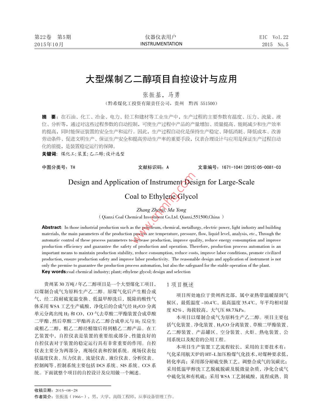 大型煤制乙二醇項(xiàng)目自控設(shè)計(jì)與應(yīng)用