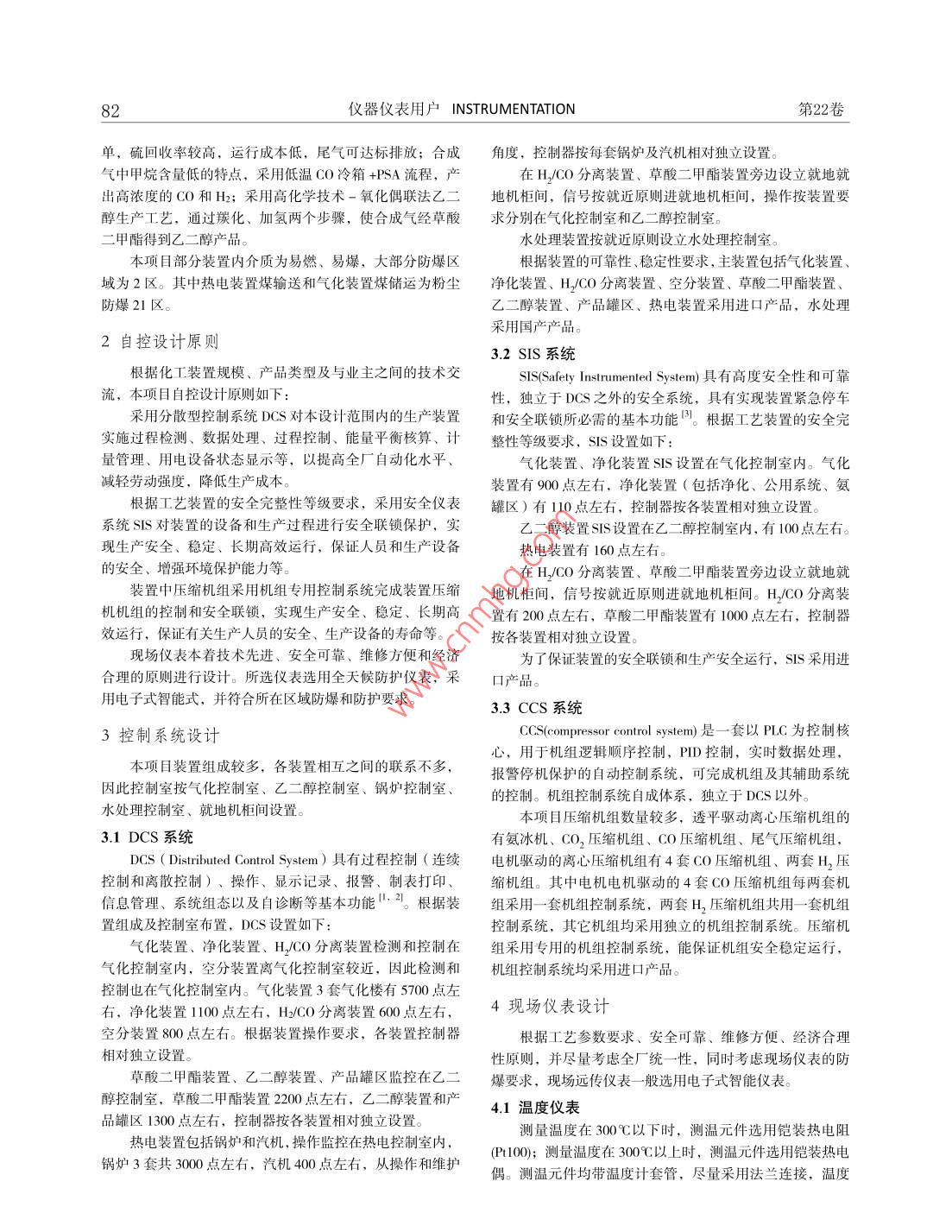 第22卷第5期儀器儀表用戶 EIC Vo1.222015年10月 INSTRUMENTATION2015No.5大型煤制乙二醇項(xiàng)目自控設(shè)計(jì)與應(yīng)用張振基,馬勇(黔希煤化工投資有限責(zé)任公司,貴州黔西551500摘要:在石油、化工、冶金、電力、輕工和建材等工業(yè)生產(chǎn)中,生產(chǎn)過程的主要參數(shù)有溫度、壓力、流量、液位、分析等,通過對這些過程參數(shù)的自動控制,可使生產(chǎn)過程中產(chǎn)品的產(chǎn)量增加、質(zhì)量提高、能耗減少和生產(chǎn)效率的提高,同時能保證裝置的安全生產(chǎn)和運(yùn)行。因此,生產(chǎn)過程自動化是保持生產(chǎn)穩(wěn)定、降低消耗、降低成本、改善勞動條件、促進(jìn)文明生產(chǎn)、保證生產(chǎn)安全和提高勞動生產(chǎn)率的重要手段,儀表合理設(shè)計(jì)與應(yīng)用是保證生產(chǎn)過程自動化的前提,是裝置穩(wěn)定運(yùn)行的保障。關(guān)鍵詞:煤化工;裝置;乙二醇;設(shè)計(jì)選型中圖分類號:TH文獻(xiàn)標(biāo)識碼:A文章編號:1671-1041(2015)05-0081-03 Design and Application of Instrument Design for Large-Scale Coal to Ethylene Glycol Zhang Zhenji, Ma Yong Qianxi Coal Chemical Investment Co.Ltd. Qianxi,551500,China Abstract: In those industrial production such as the pe lurgy, electric power, light industry and building materials, the main parameters of the production process are temperature, pressure, flow, liquid level, analysis, etc., Through the automatic control of these process parameters to increase tion, improve quality, reduce energy consumption and improy uction process automation is an important means to maintain production stability, reduce ts, improve labor conditions, promote civilized only the premise to guaranteethe y and improve labor productivity. The reasonable design and application of instrument is not production, ensure production safety and improv Key words: coal chemical industry; plant; ethylene glycol; design and selection貴州某30萬噸/年乙二醇項(xiàng)目是一個大型煤化工項(xiàng)目,1項(xiàng)目概述以煤制合成氣為原料生產(chǎn)乙二醇。原煤氣化后產(chǎn)生粗合成氣,經(jīng)二段耐硫?qū)挏刈儞Q、低溫甲醇洗后,脫除的酸性氣項(xiàng)目所處地位于貴州西北部,屬中亞熱帶溫暖濕潤氣候區(qū),最低溫度-10.4℃,最高溫度35.4℃,年平均相對濕體采用WSA工藝生產(chǎn)硫酸,凈化后的合成氣經(jīng)H2CO分離度82%,海拔較高,大氣壓88.73kPa單元分離出純H2和CO,CO氣去草酸二甲酯裝置合成草酸本項(xiàng)目以煤制合成氣為原料生產(chǎn)乙二醇。項(xiàng)目主要包二甲酯,然后草酸二甲酯再去乙二醇合成單元與H2反應(yīng)生成粗乙二醇,粗乙二醇經(jīng)精餾后得到精乙二醇產(chǎn)品。在工括氣化裝置、凈化裝置、H2/CO分離裝置、草酸二甲酯裝置、藝裝置中,自控儀表是裝置的重要組成部分,性能良好的乙二醇裝置、產(chǎn)品罐區(qū)、空分裝置、火炬、熱電裝置、公自控儀表對于裝置的穩(wěn)定運(yùn)行具有非常重要的作用。自控用系統(tǒng)以及配套的公用工程儀表主要分為兩部分,現(xiàn)場儀表和控制系統(tǒng)?,F(xiàn)場儀表包本項(xiàng)目生產(chǎn)裝置工藝流程較長,采用的主要技術(shù)有:氣化采用航天爐的HT-L加壓粉煤氣化技術(shù),對煤種要求低,括溫度儀表、壓力儀表、流量儀表、液位儀表、分析儀表、控制閥等,控制系統(tǒng)主要包括DCS系統(tǒng)、SIS系統(tǒng)、CCS系轉(zhuǎn)化率高;采用部分耐硫變換工藝,調(diào)整合成氣的氫碳比采用低溫甲醇洗工藝脫硫脫碳及脫微量雜質(zhì),凈化合成氣統(tǒng)。下面就整個項(xiàng)目的自控設(shè)計(jì)及應(yīng)用做一個闡述。中硫化氫和有機(jī)硫;采用WSA工藝制硫酸,流程成熟、簡收稿日期:2015-08-28作者簡介:張振基(1966-),男,大學(xué),高級工程師,從事設(shè)備管理工作。82儀器儀表用戶 INSTRUMENTATION第22卷單,硫回收率較高,運(yùn)行成本低,尾氣可達(dá)標(biāo)排放;合成角度,控制器按每套鍋爐及汽機(jī)相對獨(dú)立設(shè)置。氣中甲烷含量低的特點(diǎn),采用低溫CO冷箱+PSA流程,產(chǎn)在H2/CO分離裝置、草酸二甲酯裝置旁邊設(shè)立就地就出高濃度的CO和H2;采用高化學(xué)技術(shù)-氧化偶聯(lián)法乙二地機(jī)柜間,信號按就近原則進(jìn)就地機(jī)柜間,操作按裝置要醇生產(chǎn)工藝,通過羰化、加氫兩個步驟,使合成氣經(jīng)草酸求分別在氣化控制室和乙二醇控制室。二甲酯得到乙二醇產(chǎn)品。水處理裝置按就近原則設(shè)立水處理控制室。本項(xiàng)目部分裝置內(nèi)介質(zhì)為易燃、易爆,大部分防爆區(qū)根據(jù)裝置的可靠性、穩(wěn)定性要求,主裝置包括氣化裝置、域?yàn)?區(qū)。其中熱電裝置煤輸送和氣化裝置煤儲運(yùn)為粉塵凈化裝置、H2CO分離裝置、空分裝置、草酸二甲酯裝置、防爆21區(qū)。乙二醇裝置、產(chǎn)品罐區(qū)、熱電裝置采用進(jìn)口產(chǎn)品,水處理采用國產(chǎn)產(chǎn)品。2自控設(shè)計(jì)原則3.2SIS系統(tǒng)根據(jù)化工裝置規(guī)模、產(chǎn)品類型及與業(yè)主之間的技術(shù)交 SISSafety Instrumented System)具有高度安全性和可靠流,本項(xiàng)目自控設(shè)計(jì)原則如下:性,獨(dú)立于DCS之外的安全系統(tǒng),具有實(shí)現(xiàn)裝置緊急停車采用分散型控制系統(tǒng)DCS對本設(shè)計(jì)范圍內(nèi)的生產(chǎn)裝置和安全聯(lián)鎖所必需的基本功能3根據(jù)工藝裝置的安全完實(shí)施