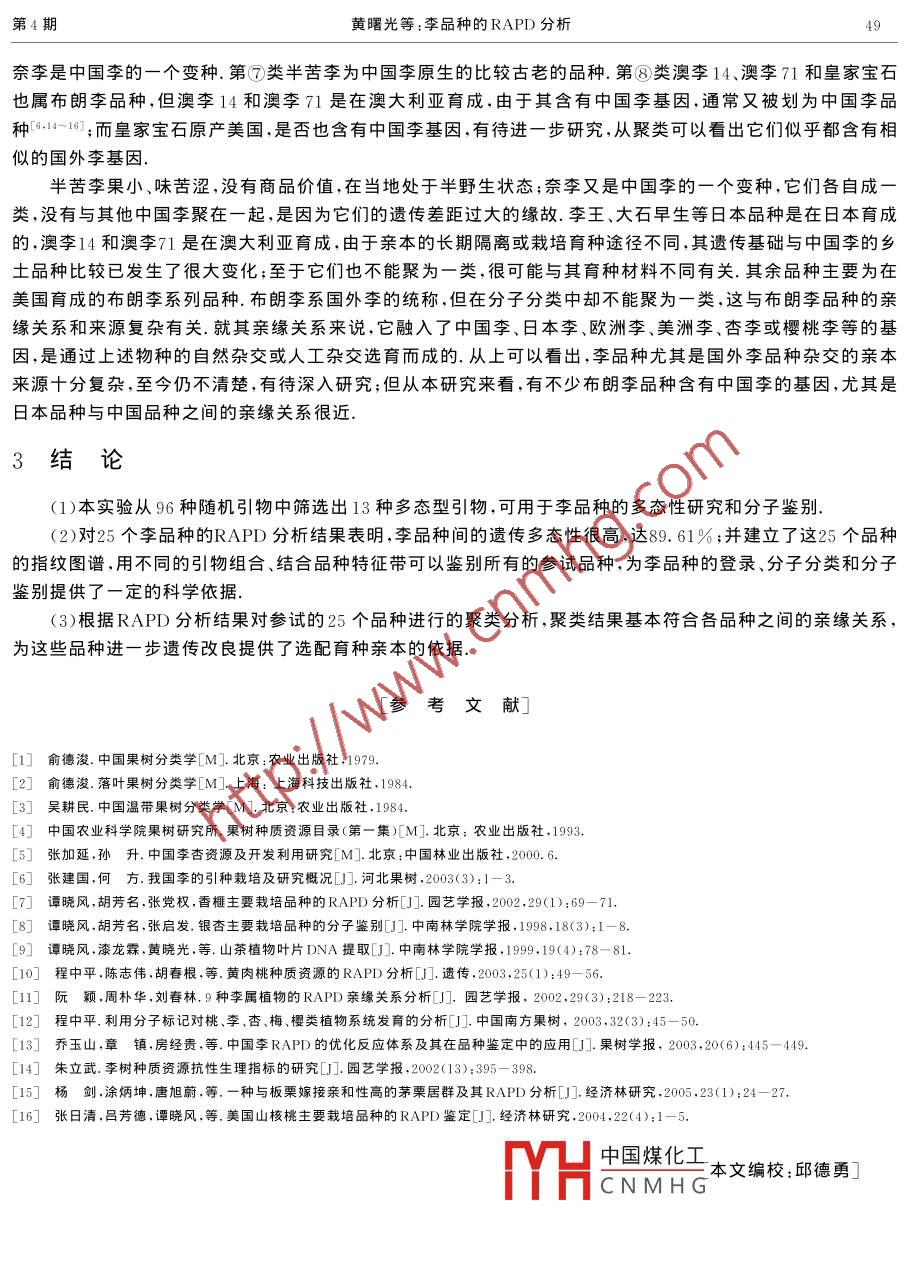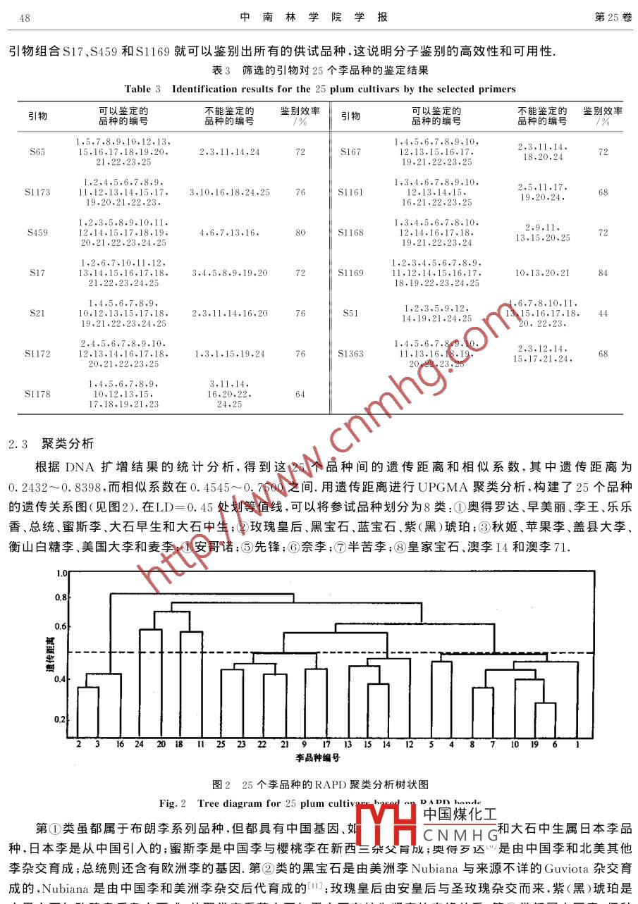 第25卷第4期中南林學(xué)院學(xué)報Vol. 25 No. 42005年8月JOURNAL OF CENTRAL SOUTH FORESTRY UNIVERSITYAug. 2005[文章編號] 1000- 2502(2005)04-0046- 04李品種的RAPD分析.黃曙光',烏云塔娜2*,譚曉風(fēng)2.3(1.吉首大學(xué)師范學(xué)院生物系,湖南吉首416000; 2.中南林學(xué)院經(jīng)濟林育種與栽培國家林業(yè)局重點實驗室,湖南長沙410004;3.中南林學(xué)院資源與環(huán)境學(xué)院,湖南長沙410004)[摘要]從96條S系列RAPD引物中篩選出能穩(wěn)定擴增并具有多態(tài)性的13條引物,對25個李品種進行了RAPD分析.結(jié)果表明,只用S17、S459和S1169等3條引物就能鑒別出所供試的25個李品種.利用PopGene軟件中的UPGMA方法對供試25個李品種進行分子聚類分析,取LD=0.45,可將這25個李品種分為8類.[關(guān)鍵詞]李; 品種; RAPD;分子鑒別;分子分類[中圖分類號] S662. 3;Q523[文獻標(biāo)識碼] ARAPD Analysis of Plum CultivarsHUANG Shu-guang',WUYUN Ta-na', TAN Xiao feng2(1. Dept. of Biology, School of Normal, Jishou University, Jishou 416000,Hunan, China;2. The Key Lab. of Non- wood Forest Product of Forestry Ministry of CSFU, Changsha 410004. Hunan, China;3. School of Resources and Environment, Central South Forestry University, Changsha 410004, Hunan, China)Abstract: In this research 13 primers were selected from 96 random ones which could be success flly used for amplifying the DNA of25 plum cultivars and showing polymorphism. We could identify each cultivar by DNA fingerprints and the characteristic bands.Among them,the above- mentioned cultivars could be distinguished only with S17, S459 and S1169. In the same time 25 cultivarswere taken for cluster analysis by using the way of UPGMA and PopGene software, and when LD was 0. 45, the cultivars could beclassified into 8 categories.Key words : plum; cultivars; RAPD; molecular identification ; molecular classification李是薔薇科李屬PrunusL..植物,該屬大約有30余種,分布于北半球氣候溫和的地帶,其中我國有8種和4個變種,中國是李屬植物的起源中心和分布中心之一.中國李原產(chǎn)于我國長江流域及西北一帶,是我國栽培最早的果樹之一,迄今已有3000年以上的栽培歷史.目前,我國栽培的李屬果樹有8個種,800多個品種,其中,主要栽培的有中國李、日本李、杏李、櫻桃李、美洲李和歐洲李6個種,約100多個品種[1~5].我國李資源豐富,分布范圍很廣,在北緯21°00'~7220'之間李都能正常生長發(fā)育.但過去李栽培一直不被重視,管理粗放,產(chǎn)量低,質(zhì)量差,經(jīng)濟效益遠比不上蘋果梨等大宗水果.近年來,隨著人民生活水平的提高,對水果的多樣化的需要,帶動了小水果生產(chǎn),尤其是國外優(yōu)質(zhì)李在國內(nèi)水果市場.上賣價比蘋果、梨高出數(shù)倍的比價效應(yīng),更是刺激果農(nóng)發(fā)展李的步伐.近幾年來,國外優(yōu)良李品種大量引入國內(nèi),加上國內(nèi)原有的品種,為李的發(fā)展提供了豐富的種質(zhì)資源,但也由此帶來苗木市場上的良莠混雜和品種不清的問題,特別是在國外李的引種栽培中,品種的命名比較混亂,同物異名現(xiàn)象十分嚴(yán)重6°].區(qū)| 中國煤化工態(tài)學(xué)方法外,近年來分子生物學(xué)的發(fā)展,特別是RAPD技術(shù)在品種鑒別和分類中的YHCNMHG統(tǒng)發(fā)育及資源保存提供了更為科學(xué)的依據(jù)[7.8].[收稿日期] 2005-05-27[基金項骨數(shù)家科技基礎(chǔ)條件平臺工作項目“林木種質(zhì)資源標(biāo)準(zhǔn)化整理、整合及共享試點”(編號:2004BKA30400).[作者簡介]黃曙光(1960- -),男,湖南吉首人,講師,農(nóng)學(xué)士.主要從事植物學(xué)教學(xué)和分子生物學(xué)科研.第4期黃曙光等:李品種的RAPD分析471材料與方法1.1材料實驗于2003年3月~11月在中南林學(xué)院經(jīng)濟林育種與栽培國家林業(yè)局重點實驗室進行.供試的25個品種(見表1)采自吉首市無毒果樹苗圃和中南林學(xué)院苗圃.1.2方法表125 個參試?yán)钇贩N及代號Table 1 Codes for 25 plum cultivars葉片DNA的提取采用改良的CTAP編號品種來源I編號來源編號來源法'9進行,提取的DNA樣品經(jīng)核酸蛋白檢奧得羅達A116樂樂香B19李王測儀檢測濃度和純度達到要求后,置于奧李14 A| 1:安哥諾A2(奈李奧李71 A|1玫瑰皇后A21美國大李-20C下保存?zhèn)溆?PCR擴增采用15 μL大石早生B2) || 1:黑寶石A22蓋縣大李的反應(yīng)體系,其中包括: Taq酶(5 U●大石中生F藍寶石23衡山白糖李C早美麗| 15紫(黑)琥珀A24半苦李μL-1) 0. 15 μlL, MgCl2(25 mmol●L-I)總統(tǒng)皇家寶石A2麥李1.5 uL,10XPCR緩沖液1.12 uL, dNTP蜜斯李秋姬(10 mmol●LI) 1 μL,引物(16.5 ng●蘋果李3)|1先鋒uL-I) 1.3μL,模板DNA (10ng●μL-I)1)A表示為布朗李(美國為主)品種;2)B表示為日本品種;3)C表示為中國品種.1 pL,加入ddH2O使至終體積為15 pL. PCR試劑均購自上海生工. PCR反應(yīng)在德國產(chǎn)9600型PCR儀上進行.反應(yīng)程序參照程中平[8等:94 C變性2 min,36 C退火1 min, 72 C延伸2 min,1次循環(huán);94 C變性1 min,36 C退火1 min, 72 C延伸2 min ,40次循環(huán);94 C變性1 min,36 C退火1 min, 72 C延伸10 min,1次循環(huán).擴增產(chǎn)物在質(zhì)量分?jǐn)?shù)為1.4%的瓊脂糖凝膠上電泳分離,經(jīng)EB染色后,在美國產(chǎn)BIORAD凝膠光密成像掃描儀上觀察、照相,以2DNA酶切片段標(biāo)準(zhǔn)分子量標(biāo)記為參照,確定各分子標(biāo)記的分子量大小.擴增譜帶按有(1)和無(0)記錄,計算任意兩個品種的相似系數(shù),使用軟件PopGene32中的二倍體分析程序,采用UPGMA方法,對25個李品種進行聚類分析.表2篩選