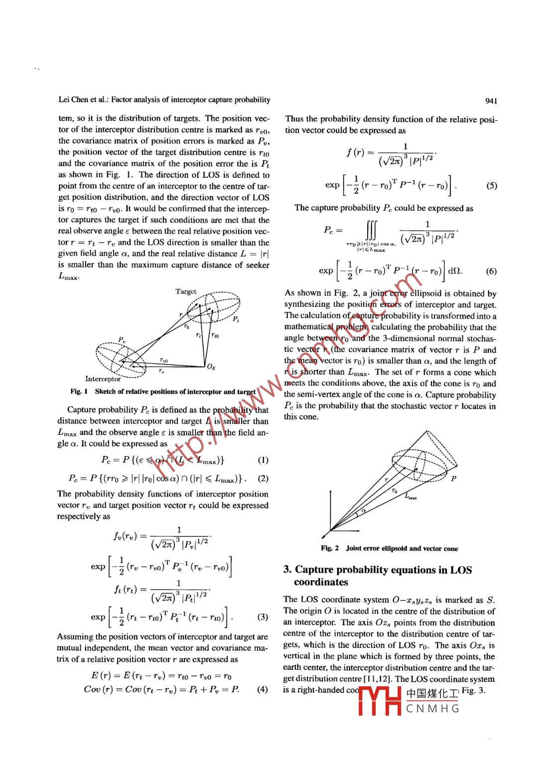 Journal of Systems Engineering and Electronics Vol. 22, No.6, December 2011, pp.940- -947Available online at www.jseepub.comFactor analysis of interceptor capture probabilityLei Chen*, Zhijun Gu, Xianzong Bai, and Kebo LiCollege of Aerospace and Material Engineering, National University of Defense Technology, Changsha 410073, P. R. ChinaAbstract: The capture probability of interceptors has been deeplymaneuverable target, the precision of presetting attitudestudied. Firsty, the definition of capture probability is analyzed.angles is determined by the frequency that the ground sen-It is transformed into calculating the probability that the relativesors transfer the target position information to the kineticposition vector between the target and the interceptor locates ininterceptor [5- -7]. The problem could be solved efficientlya certain cone. The relative position vector and associated CO-if some search mechanisms are actualized. .variance matrix are projected in line-of-sight coordinates, and the3-dimensional integral of a probability function in a cone is cal-The maximum capture distance of an interceptor is de-culated to obtain the capture probability. The integral equationtermined by the capability of the interceptor seeker. Itis a complicated expression of probability, and it is simlified towould be determined by the magnitude of the seeker fieldan explicit approximate expression according to some assump-angle to capture the target if the target moved into the ef-tions based on the characteristics of the engineering problems.fective capturing range of the intercepto [8]. It is assumedThe approximation precision is analyzed by comparative simula-tion difference, which indicates that approximate assumptions arethat the optical axis of interceptor points from the center ofreasonable. Utilzing the explicit expression, the characteristicsan interceptor seeker to the probability distribution centerof capure probablity are analyzed respectively with the factors, of taret position, thus the interceptor altitude is controlledsuch as the distance between the interceptor and the target, theto approximate the presetting attitude angle exactly. Theprecision of relative position vector, the maximum capture distanceposition distribution of targets is stochastic because the er-and the maximum field angle of interceptor seeker.ror of targets trajectory propagation is stochastic. ThusKeywords: intereptor, capture probablity, maximum capture dis- the observe angle is stochastic. The capure probabilitytance, maximum field angle, precision.is defined as the probability that the distance between anDOI: 10.3969./issn.1004 4132 2011.06.010interceptor and a target is smaller than the maximum cap-ture distance of interceptor seeker, and the observe angle issmaller than the maximum field angle. It is significant for1. Introductioninterceptor design to obtain the capture probability.Kinetic energy weapons play an important role in thdomains of bllistic missile defense and air defense [1]. as the navigation precision of interceptors, the detectionThe typical representative is ground-based interceptorcharacteristics of seekers, the prediction precision of tar-(GBI) of ground-based midcourse defense (GMD) systemgets. The interceptor could not capture the target unlessin United States. The precondition of handing over be-the following two conditions are met [4,9,10]: () the dis-tween midcourse guidance and terminal guidance is thattance between interceptor and target L is smaller than thethe interceptor seeker captures the target in the kinetic in-maximum capture distance of seeker Lmax (L≤Lmax);terception process [2]. In the midcourse guidance, preset-(i) the observe angle E (the angle between the optical axisting attitude angles are calculated based on the intercep-of interceptor and line-of -sight (LOS)) is smaller than thetor navigation position and the target position transferredmaximum field angle of interceptor seekera(e≤a).by a battle management, command, control and commu-The calculation methods of capture probability are pri-nications (BM/C3) system on the ground [3,4]. The tar-marily analyzed in this paper, and the influence of inter-get acquisition is infuenced directly by the precision of ceptor navigation precision and target tracking precision ispresetting attitude angles. For a non-maneuverable tar-analyzed emphatically.get, the precision of presetting attitude angles is compara-2. Problem definition of capture probabilitybly accurate, the target should be captured easily. For theManuscript reeved April 27, 2010.The position distribution of kinetic interceptors is normal*Corresponding author.distribution in earth中國煤化工THCNMH G .Lei Chen et al: Factor analysis of interceptor capture probability .941tem, so it is the distribution of targets. The position vec-Thus the probability density function of the relative posi-tor of the interceptor distribution centre is marked as rv0, tion vector could be expressed asthe covariance matrix of position errors is marked as Po,the position vector of the target distribution centre is rtof(r) =(V2x)°|P|/2°and the covariance matrix of the position error the is Pas shown in Fig.1. The direction of LOS is defined topoint from the centre of an interceptor to the centre of tar-exp[如-n)"P-'(-則.(5)get position distribution, and the direction vector of LOSisro= rto - ro. It would be confirmned that the intercep-The capture probability Pc could be expressed astor captures the target if such conditions are met that thereal observe angle Eε between the real relative position vec-Po= f[(√2n)°pP1/2"torr = rt - r。and the LOS direction is smaller than thegiven field angle a, and the real relative distance L = |川|is smaller than the maximum capture distance of seekerexp|-2(r-ro)T P-1(r-ro)| ds2.6)Lmax.TargetAs shown in Fig. 2, a joint error elipsoid is obtained bysynthesizing the position errors of interceptor and target.一PThe calculation of capture pr