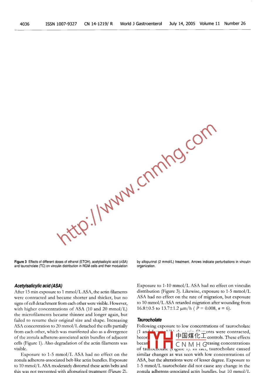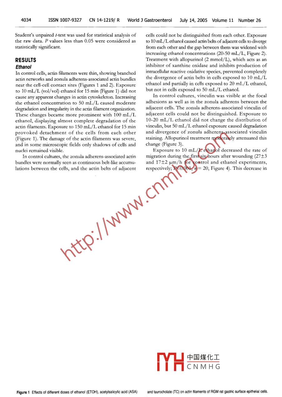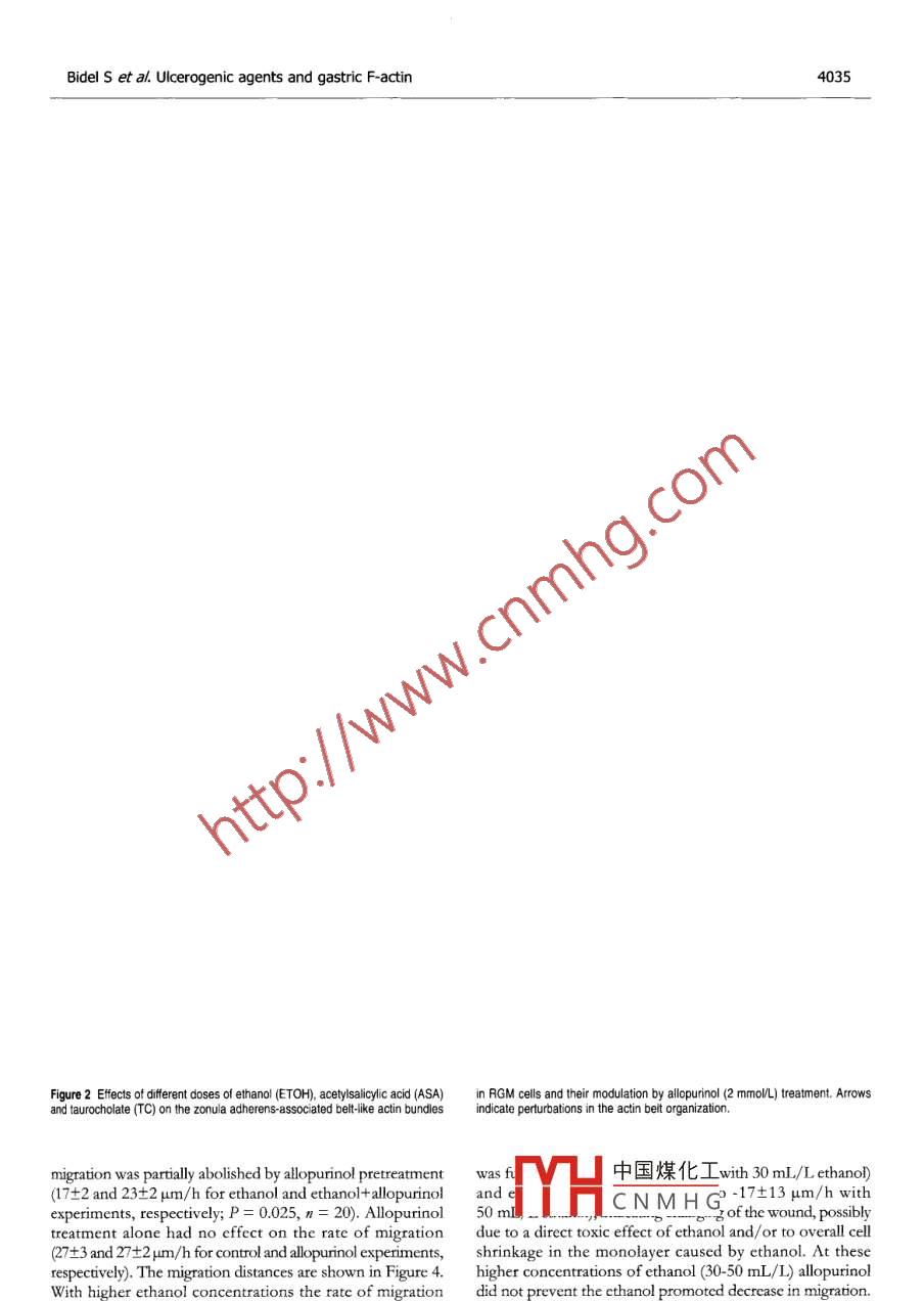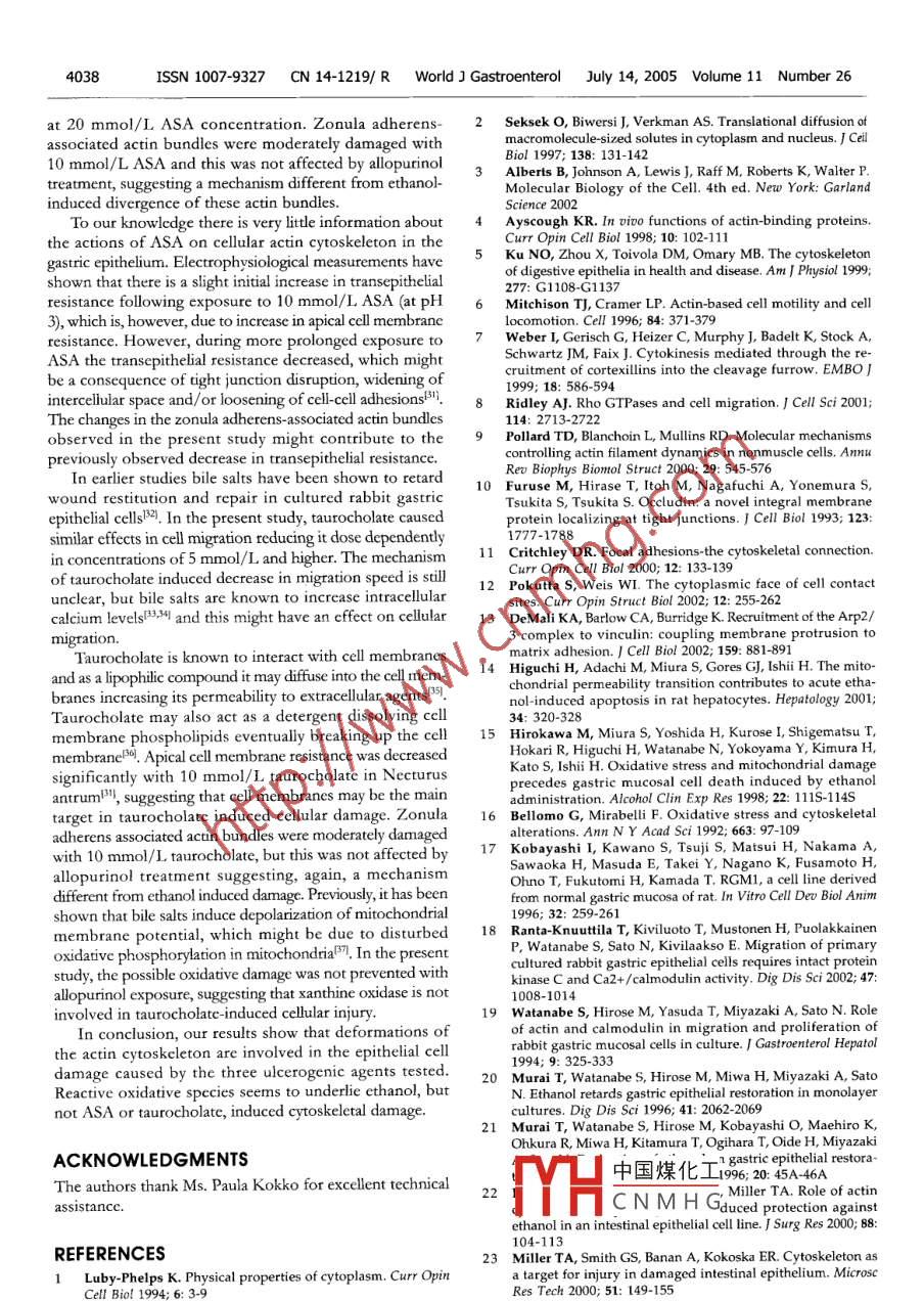 PO Box 2345, Beijing 100023, China置d/ Gastroenterol 2005; 11(26)wig@wigner.comELSEVIER@2005 The WG Press and Elsevier Inc. All rights I·9B4 SIC RESERCH·Effect of the ulcerogenic agents ethanol, acetylsalicylic acid andtaurocholate on actin cytoskeleton and cell motility in culturedrat gastric mucosal cellsSiamak Bidel, Harri Mustonen, Giti Khalighi-Sikaroudi, Eero Lehtonen Pauli Puolakkainen Tuula Kiviluoto Eero KivilaaksoSiamak Bidel, Harri Mustonen, Giti Khalighi-SikaroudiIn addition ethanol and aSa caused degradation of actinLehtonen, Pauli Puolakkainen tuula Kiviluoto, Eero Kivcytoskeleton Oxidative stress seems to underlie ethanolDepartment of Surgery, Helsinki University Central Hebut not aSa or taurocholate, induced cytoskeletal damageHaartmaninkatu 8, Helsinki, FinlandSupported by the Grants from Antti and Jenny Wihuri Foundation 2005 The w3G Press and Elsevier Inc. All rights reservedand Research Foundation of Helsinki University Central HospitalTYH4228Co-first-authors: Harri MustonenKey words: Gastric mucosa; Ethyl alcohol; Taurocholate;Correspondence to: Harri Mustonen DSc, Helsinki University Aspirin; ActinCentral Hospital, Department of Surgery, Biomedicum HelsinkiHaartmaninkatu 8. Helsinki 00290Bidel S, Mustonen H, Khalighi-Sikaroudi G, Lehtonen E,Finland. harri mustonen @helsinki. fiPuolakkainen P, Kiviluoto T, Kivilaakso E. Effect of theTelephone:+3589471-7829Fax:+3589471-74675ulcerogenic agents ethanol, acetylsalicylic acid andReceived: 2004-09-01 Accepted: 2004-10-07taurocholate on actin cytoskeleton and cell motility incultured rat gastric mucosal cells. World J Gastroenterol2005;11(26):4032-4039http://www.wjgnet.com/1007-9327/11/4032.aspAbstractAIM: To assess the effects of ulcerogenic agents on actincytoskeleton and cell motility and the contribution ofoxidative stressINTRODUCTIONMETHODS: Rat gastric mucosal cell monolayers wereThe gastric mucosa is frequently exposed to differentor without allopurinol( 2 mmol/L), for 15 min to ethanol aspirin and taurocholate. These agents have been extensively10-150 mL/L), ASA(1-20 mmol/L)or taurocholateds, including biochemistry, mor( 1-20 mmol/L), then the cells were processed for actinlogy, electrophysiology, tissue permeability, etc but theand vinculin staining. Cell migration after wounding wascellular mechanisms of injury are still poorly definedalso measuredIn digestive epithelia actin cytoskeleton is involved, forexample, in organization of cytoplasm, maintenance of cellRESULTS: Exposure to 10 my/L ethanol caused divergence shape, generation and maintenance of epithelial polarityof zonula adherens-associated actin bundles of adjacent in migration. The cytoplasm of epithelial cell is spatiallyells and decreased rate of migration. These actions were and temporally organized by microfilaments, microtubulesopposed by xanthine oxidase inhibitor allopurinol Exposure and intermediate filaments, which form a lattice-liketo 50 mL/L ethanol induced degradation and divergence intracellular meshwork!2.of zonula adherens- associated vinculin from adjacent cells,The actin cytoskeleton is highly conserved in eukaryoticwhich was, again, partially reverted by allopurinol. With cells, including more than 70 categorized types of actin-1 mmol/L ASA actin filaments became shorter and thicker. binding proteins. The human actin family includes a-B,However, higher concentrations(10, 20 mmol/L)of ASA and Y-actin, which share most of their amino acid sequencreturned microfilaments thinner and longer, and decreased The actin filaments are formed by polymerization of actinrate of migration. Zonula adherens-associated actin bundleswere moderately distorted with 10 mmol/L ASA and withmonomers. The polymeric actins are assembled into10 mmol/L taurocholate. Exposure to taurocholate provokedfilamentous network, which is regulated by actin-bindingchanges resembling those of ASA. Taurocholate 5-20 mmol/L proteins. These proteins regulate, for example, polymcrization,decreased the rate of migration dose dependently. The crosseffects of aSa and taurocholate were not prevented by中國(guó)煤化工 LallopurinolCNMH Gf actin filaments/#.Theactinlieu wgcuicr by various actin crossCONCLUSION: All ulcerogenic agents decreased the rate linking proteins to form complex three-dimensional structuresof migration dose dependently and induced divergence of The filaments are extensively branched near the plasmazonula adherens-associated actin bundles of adjacent cells. membrane, focal adhesions, and adherens and tight junctionsBidelS et al. Ulcerogenic agents and gastric F-actin4033Arp2/3 complex is involved in this branchingthe cytoskeleton. We further studied the possible role ofDifferent components of the cytoskeleton are tightly reactive oxygen species in epithelial injury by inhibitinginvolved in cell motility Actin based cell motility has several endogenous intracellular generation of superoxide radicalsimportant tasks in epithelial cell functions, such as in secretory from purines with a xanthine oxidase inhibitor, allopurinolvesicle movement and cell migration during wound healing 1The cell migration starts with lamellipodia extension and MATERIALS AND METHODSof the cell body and detachment of the tail. Rho guanosine Immortal rat gastric mucosal cells(RGM-1, Riken Cell Bank,triphosphatases have a key role in regulating different phases Riken, Japan) I were cultured on coverslips to confluentof migration. Racl seems to be involved in initiation of monolayers at 37 C in humidified atmosphere containingmigration and in stimulation of lamellipodium extension", 50 mL/L COz in air. The medium used was an equalwhile Rho seems to contribute mainly to cell body contraction. mixture of Ham's F12 and Dulbeccos's MEM supplementedEpithelial cells have specialized mechanisms to enable with inactivated 200 mL/L fetal bovine serum, 100 U/mLcell-cell and cell-extracellular matrix adhesions. These penicillin, 100 ug/mL streptomycin and 0. 125 ug/mLconnections are formed by tra