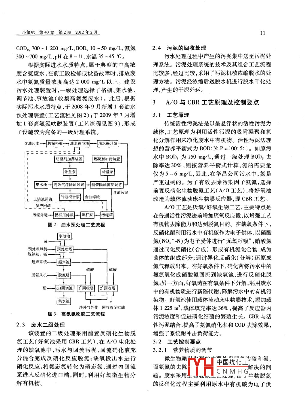 10_小氮肥_ 第40卷 第2期2012年2月污水處理裝置運行總結(jié)黃曉秋陳誠(江蘇華昌化工股份有限公司張 家港215634)法為主體工藝的一~體化除油裝置, 2009年7月投1污水處理 裝置基本情況運1套高氨氮吹脫裝置,2010 年8月將原A/O工江蘇華昌化工股份有限公司(以下簡稱華昌藝升級改造為載體流動床生物膜(CBR)工藝;至公司)污水處理裝置處理的廢水包括生產(chǎn)廢水和2011年1月,該污水處理裝置已經(jīng)形成以油水預(yù)生活污水兩部分,處理水量約為2000Vd;設(shè)計處理裝置和高氨氮吹脫裝置為預(yù)處理設(shè)施、以進水氨氮質(zhì)量濃度為70 mg/L, COD質(zhì)量濃度為CBR生物脫氮工藝為主體工藝的污水處理系統(tǒng)。350 mg/L,處理水量為450 m'/h, 采用A/O工藝經(jīng)處理達標(biāo)后的污水,部分外排送至園區(qū)污水處(前置反硝化生物脫氮工藝)。該裝置投運后,仍理廠(勝科水務(wù))進- -步處理,部分回用。實際污進行不斷發(fā)展完善,2008年9月新增1套以氣浮水處理月基本情況見表1。表1實際污水處理月基本情況時間污水處理量/kt廢水性質(zhì)排放量/kt排放去向回用量/kt用電量/(kW .h)20110146.814NH3-N,COD15.972勝科水務(wù)30. 842292 3912011-0241.08718. 96022. 127219 0742011-0336.480NHz-N,COD13. 93522. 545234 8862011-0449.59317.47432. 119262 262離,剩余的污泥送脫水系統(tǒng)進行脫水干化處理,產(chǎn)2污水 處理工藝生的干泥餅外運。2.1工藝流程2.2廢水的一級處理污水處理工藝流程見圖1。含油污水匯集至由于污水中可濾殘渣含量較高,這些殘渣若隔油池,經(jīng)油水預(yù)處理裝置處理后進人集水池;不不經(jīng)過處理直接進人生化處理系統(tǒng),會在生化系含油污水經(jīng)格柵后進人集水池。若前工段排放的統(tǒng)中積累而占據(jù)生化池大量的容積,使A/O生化污水中氨氮濃度較高,則先排放人事故池經(jīng)高氨池的有效容積不斷縮小,最終導(dǎo)致系統(tǒng)完全失效。氮吹脫裝置處理后再進人集水池。集水池的污水因此,需通過預(yù)處理(即一級處理)去除水中的漂由潛水泵送均質(zhì)調(diào)節(jié)池,除去污水中漂浮雜物、無浮物和部分懸浮污染物,調(diào)節(jié)廢水pH,減輕廢水機砂粒、懸浮物等,進人AVO生化池。A/0生化的腐化程度和后續(xù)處理工藝的負荷。池好氧段流出的泥水混合物在沉淀池進行泥水分該污水處理裝置設(shè)計時按綜合生活污水水質(zhì)、水量和生產(chǎn)廢水水質(zhì)水量,經(jīng)理論計算出裝不含油污水一格柵及集水池一潛水泵}-均質(zhì)調(diào)節(jié)池一串故池置的設(shè)計進水水質(zhì)(質(zhì)量濃度,下同):CODc≤出水沉淀池含油污水-一隔油池不達標(biāo)水| A/O生化池I[內(nèi)回流泵350 mg/L(非正常時達350~1 000 mg/L) ,懸浮物≤150 mg/L, BOD,≤150 mg/L,氨氮≤70 mg/L油泥外運一-達標(biāo)水外排→一污水排放井空氣(非正常時請0- m"在6~8,水溫中國煤化工出泥一濃縮體化股水機一{泥漿泵一污泥池鼓風(fēng)機30~40 C。Y門HCNMH' S濃度有機污根據(jù)設(shè),選次付鼠,胸」圖1污水處理工藝流程水,但實際運行中水質(zhì)變化較大,實際進水水質(zhì):小氮肥第40卷第2期2012年2月I1CODcr 700~1 200 mg/L, BOD, 10 ~ 50 mg/L,氨氮2.4污泥的回收處理300 ~ 700 mg/L,pH在8~11,水溫35 ~45 C。污水處理過程中產(chǎn)生的污泥集中送至污泥處根據(jù)實際進水水質(zhì)特點,屬于典型的中高濃理系統(tǒng)。污泥處理系統(tǒng)的技術(shù)及其組合工藝流程度含氨廢水,在前工段檢修或設(shè)備故障時,排放廢比較多,經(jīng)過比較,采用了污泥機械濃縮脫水的處水中氨氮質(zhì)量濃度高達2 000 mg/L以上。建設(shè).理方法。污泥經(jīng)濃縮后送脫水機進行脫水干化處污水處理裝置時, -級處理選擇了格柵、集水池、理,產(chǎn)生的干泥外運。調(diào)節(jié)池.事故池(收集高氨氮廢水)。此后,根據(jù)A/0與CBR工藝原理及控制要點實際污水水質(zhì)特點,于2008年9月新增1套油水.預(yù)處理裝置(工藝流程見圖2);于2009年7月增3.1工藝原理加1套高氨氮吹脫裝置(工藝流程見圖3),形成傳統(tǒng)活性污泥法是以呈懸浮狀的活性污泥為了設(shè)施較為完備的- -級處理系統(tǒng)。載體,工藝原理為利用活性污泥的吸附凝聚和氧化分解作用來凈化廢水中有機物。活性污泥法理含油污水一機械格棚一油水調(diào)節(jié)池一油水提升系想的營養(yǎng)平衡式為BOD: N:P= 100:5:1。如原污IF :::::=:==dj|助凝劑加藥裝置|累凝 劑加藥裝置1水中BODs為150 mg/L,通過一級處理BOD,去除率達30%,則按營養(yǎng)平衡式計算,氮的需要量計量泵僅為5~6 mg/L,因此,在華昌公司污水中,氮是集水池一高效氣浮除油裝置}-科管隔油沉淀裝置}嚴重過剩的。為了有效去除污染因子氨氮,選擇I氣液混合泵I含油浮渣含油污泥前置反硝化生物脫氮工藝(A/0工藝) ,將好氧池上清液回流_改造為載體流動床生物膜反應(yīng)器,即CBR工藝。L-濾液回海AVO工藝是厭氧好氧生物工藝,主要特點是污泥外運一板框壓濾機一螺桿象一污泥箱在普通活性污泥法前增加厭氧反應(yīng)段,以增強工藝圖2油水預(yù)處理工藝流程有機物去除能力和達到脫氮目的。在缺氧條件下,反硝化菌利用污水中有機碳作為電子供體,以硝酸事故池氮( NO3 - -N)為電子受體進行“無氧呼吸”,硝酸氮預(yù)處理風(fēng)機一一預(yù)處理塔通過同化反硝化(合成) ,形成有機氮化合物,成為脫氨劑、堿-一菌體的組成