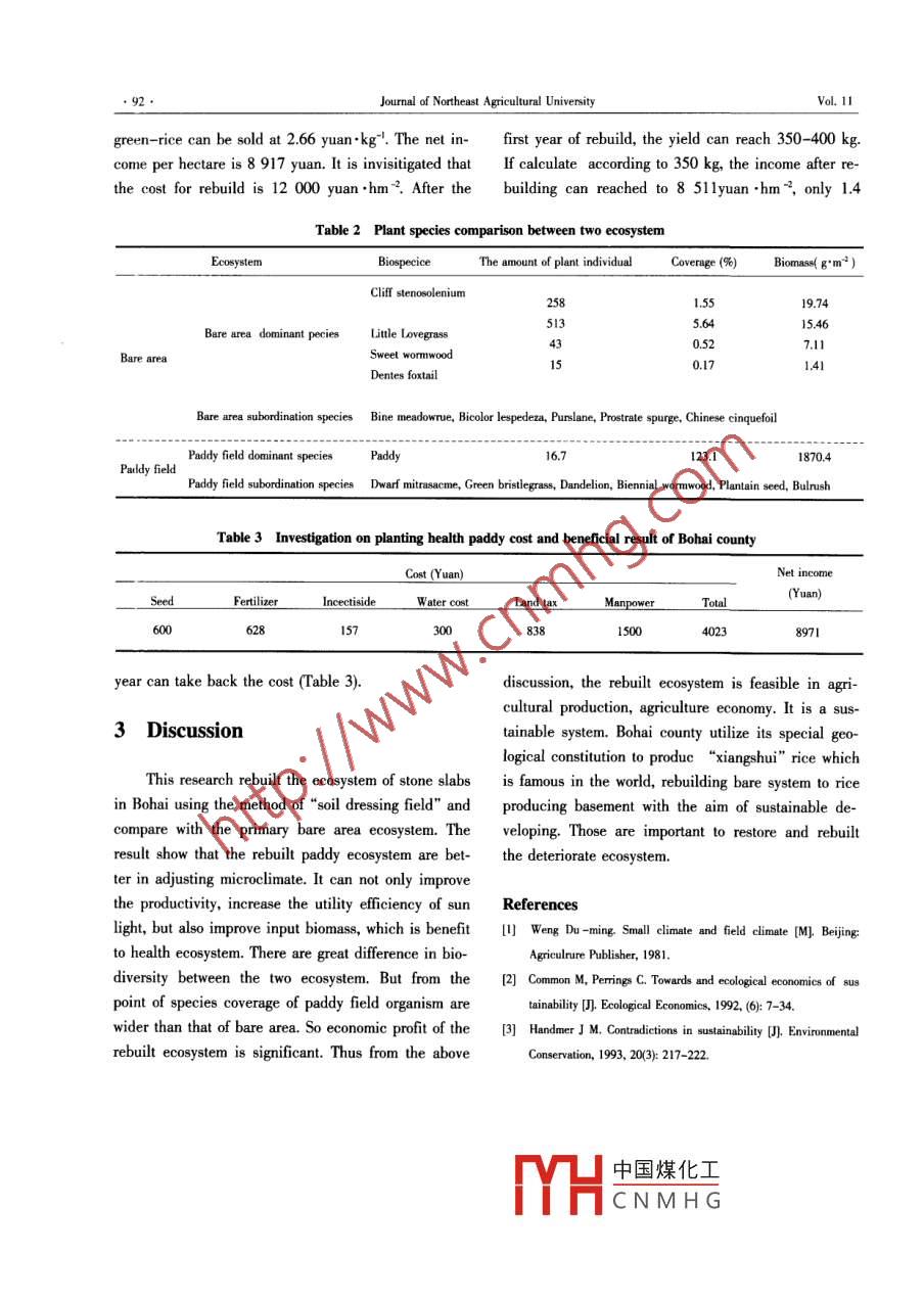 Junr 2004Joumal of Northeast Agriculural UniversityVol. II, No.I 90-92Article ID:1006 -8104(2004)- -01-0090-03Sustainable Factors Analysis of Restoredand Rebuilt EcosystemWANG Xu-mei, WANG Hong -yan, ZHANG Ying(olle of Resource and Environment, Norhest Agriculural Universily, Harbin Heilogiang 150030, PRC)Abstract: This study compared the paddy field ecosystem on developped from basalt area in Jingpo Lake withprimary ecosystem by analyzing some indexes such as sunlight, temperature, moisture, bidiversity and energy. Theresult indicate that the paddy field ecosystem is feasible in improving the environment, energy utility, biodivrsity andeconomy. And also it is a sustainable system, providing theoretical basis and practical reference for the rebuilt of sim-ilar system.Key words: ecosystem; sustainableCLC number: Q14; Q142; X826Document code: AThe field at “Bohai" county in Mudanjiang citylasl, analyze its economic feasibility.belong to stone slabs of basalt, and are mostly primarybare area, later humus deposited on it. Accumulated2 Result and Analysistenperature is higher significantly than that of otherland located in the same latitude. Quality of irrigation2.1 The effect of rebuilt system on field micro-water have reached national standard. Rice annualclimateyield attain 6.5x10 kg. Volcanic eruption formed aTake the results obtained performed in Augustdry and lttle rain climale. Thus, primary bare areafor example.The result showed that: in 8:00 a. m, thewere transformed into paddy field using the method oftemperature of bare area is higher than that of paddy"soil dressing field”。Up to now, 266.67 hm2 areafield. From the Fig.l, temperature difference is 0.4 -have been rebuilt and 4 66.67 hm? area remain to 1.0 C; at 11:00 a.m, the difference increased to 1.0-be rebuilt. Large amounts of profits have been1.4 C; at 14:00 p.m, the difference reached to 1.2-achieved. Our study aims to analyze its feasibility to1.6 C; the temperature diference reduced to 0.8-supply reference for similar system.1.2 C at 17:00 p.m. But the moisture change betweenthe two system is on the reverse. The moisture i1 Methodspaddy field ecosystem is higher than that of bare areaecosystem above 3%-17%. But there is no significantMeaurements were taken during May to Sepetem-difference (only 1% -3%) between day and night. Onber in 2000. The study compared the paddy field e-day, the change is bigger and have low moisture. In tcosystem with adjacent bare primary ecosystem takingword, compared with rebuilt paddy field ecosystem,the method of“soil dressing field" to explore the in-large scope of bare area have higher superficial tem-fluence of paddy field ecosystem on field microclimateperature and lower moisture. So, the rebuilt system(sunlight, temperature, relative moisture), energy utili-an regulate field microclimate better than primaryty (fficiency of light energy utilization, the retum ra-bare area.tio), matter utility, biodiversity (biospecies, the amount"he effect of rebuilt system on energyof plant individual, coverage percent and quantity). AtutilizationReceived date:2003-10-29中國(guó)煤化工Biography: WANG Xu-mei(1970-), female, lecturer, master of ecology.MYHCNMHG"nagement and envionmentalprolection. E-mail: wangxumei2003@sina. com.No. 1Journal of Northeast Agricultural University.91●Energy utilization are given in Table 1. It can bedy field can reach as much as 1.007%. Furthermore,seen that biomass in bare land is only 6% of paddythe return of energy per hectare in bare area is onlyfield. Less biomass lead to unique climate with dry air 5 027.286 MJ which is equal to 5.2% of paddy fieldand high temperature. The difference of photosynthetic(96 424.24 MJ). Thus, rebuilding can not only improvebetween two ecosystem is significant. The photosynthe productive capicity of soil and photosynthetic butthetic of bare area is only 0.053%, while that of pad also improve input energy to soil which is beneficial◆Temperature of bare area-一Temperature of paddy field一- Relative moisture of bare area- *- Relative moisture of paddy field3(100230501l020J08:0011:0014:0017:00TimeFig.1 The etecet of dferent ecosystem on soil temperature and the relative moisture in AugustTable 1 Comparison of energy uility of being renewed paddy field ecosystemEcosystemBiomassEnergyPhotosynthesis use fficiency(%)The return of energy per hectareBare area1 0643 608.00.0531 202.7Paddy field18 70469 204.81.00723 068.0to culture ecosystem.more abundant than that of paddy field ecosystem due.3The effect of rebuilt system on biospeciesto the restrit of topsoil. Deficient nutrient supplyThe comparison of plant species between twomake plant grow low and gracile. Thus, though moreecosystems can be seen from Table 2. Practical sam-amount of plant individual, the total biomass is onlypling results the biospecies bare area is far from that105.7 g.m, while is 5.6% of paddy field ecosystem.in paddy field. Organisms in paddy area are mostlyTotal cover percent was only 14.1%, that is to saygathered from ridges between fields and irrigating exit.there are 86% of the field remaining bared, no plantThe species are mostly belong to humid -tolerancegrowing.weeds species. Thus, the community have changed2.4 Beneficial analysisrom drought -tolerance artemazulene community toAd中國(guó)煤化工m farmer of Bo-humid-tolerant weed community.hai cou|YHCNMH G-rice is 4 023Biodiversity of bare artemazulene conmunity isyuan.hm-. The yield can reach 372.5 kg. The price of.92 .Journal of Northeast Agicultural UniversityVol. 11green- -rice can be sold at 2.66 yuan.kg". The net in-first year of rebuild, the yield can reach 350-400 kg.come per hectare is 8 917 yuan. It is invisitigated thatIf calculate according to 350 kg, the income after re-the cost for rebuild is 12 000 yuan ●hm-. After thebuilding can reached to 8 511yuan .hm-, only 1.4Table 2 Plant species comparison between two ecosystemEcosystemBiospeciceThe amount of plant individualCoverage (%)Biomas