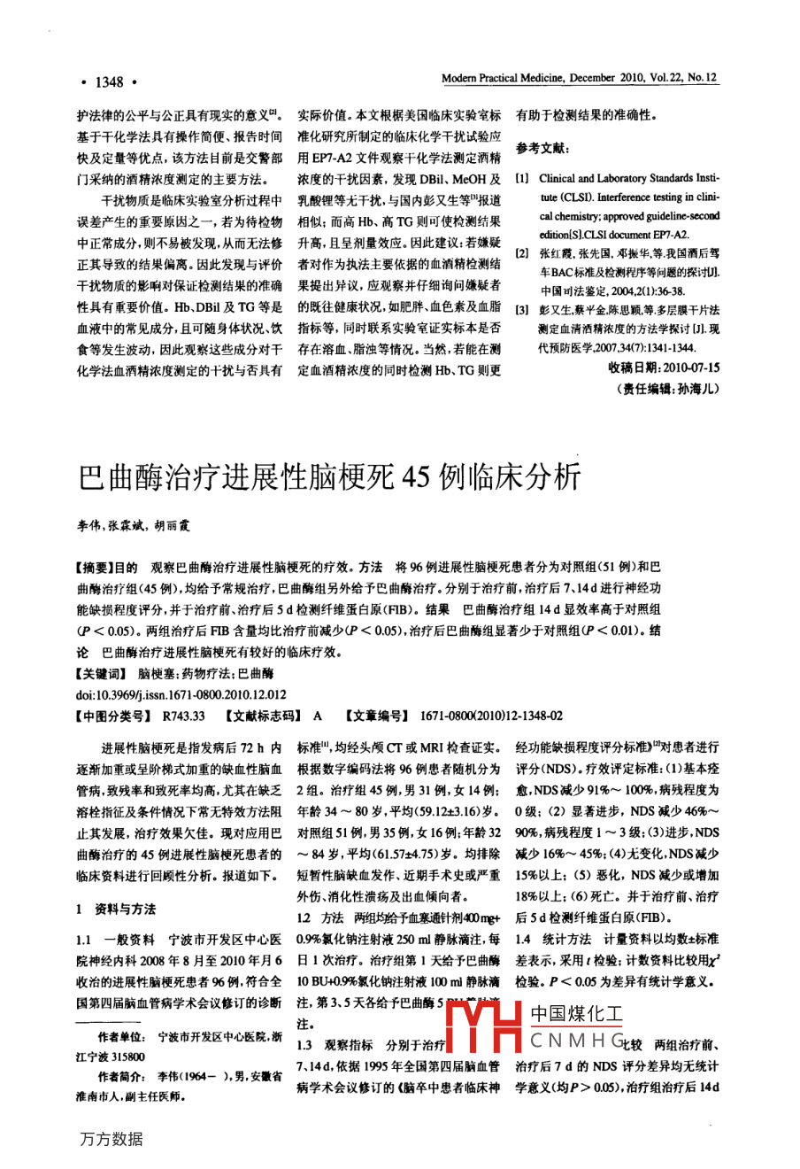 現(xiàn)代實用醫(yī)學2010年12月第22卷第12期1347·干化學法檢測血乙醇濃度的影響因素分析周方滿',趙筆輝',吳建平2,王吳英,賀玲【摘要】目的觀察血常見成分對干化學法測定血酒精濃度的影響。方法采用EP7A2評價血紅蛋白、結合膽紅素、甘油三酯、甲醇和乳酸鋰等對血酒精濃度測定的干擾,并觀察干擾成分的劑量效應。結果血清中的膽紅素≤342moL、甲醇≤0.7mgL及乳酸鋰≤66mmoL時,不影響對血酒精測定;血紅蛋白≥5gL、甘油三酯≥37mmolL時可使血酒精測定結果升高,結論嚴重溶血高濃度甘油三酯干擾干化學法測定血酒精濃度,但黃疸甲醇、乳酸鋰等無干擾【關鍵詞】血酒精濃度:干化學法;干擾do:10.3969ss167108002010.12011【中圖分類號】R44611【文獻標志碼】A【文章編號】1671408002010)12-1347-0酒后駕車已成為交通肇事的主要原66 mmolL。根據說明書進行操作,按2.2Hb、TG干擾血酒精濃度檢測的劑因之一,而血酒精濃度是公安部門進行交互順序法進行干擾試驗,平行測定8量效應顯示Hb、TG對血酒精濃度檢執(zhí)法的主要依據,因此準確可靠的檢測次測的干擾呈非線性關系,干擾效應隨報告是公正、公平處理相關事件的關鍵。14劑量效應試驗酒精濃度為1000Hb、TG濃度的增加而增強。見圖1。然而就任一實驗方法而言影響檢測的mgL的基礎血清中分別加入不同濃度因素客觀存在,因此發(fā)現(xiàn)影響因素并確的Hb和TG,平行測定3次,獲得干擾3討論定其效應可有效減少誤差,提高檢測準值進行相關分析酒精主要在消化道內被吸收,一般確度。為此,本研究觀察了血清常見干1.5數椐處理計算估計Dobs值,當其在胃中吸收20%,其余在十二指腸和空擾物質對干化學法檢測血酒精濃度的影大于Dc值(Co值)時視為存在干擾。腸吸收,飲酒后約14h達峰值。血酒精響,并進行了初步分析主要經肝代謝約10%由呼吸道、尿液和結果汗液以原形排出,故可采用呼出氣體酒1資料與方法21千擾效應干擾試驗證實:Hb≥5g、精含量探測器進行粗篩但根椐《車輛駕1.1標本為酒后、醉酒駕乍嫌疑駕駛TG≥37mmoL時可使血酒精濃度測定駛人員血液、呼氣灑精含量閱值與檢驗》員的血液標本全血3ml,不抗凝。結果增髙,而DBi≤342μmoⅥL、M(GB9522-2004)規(guī)定,血酒精濃度含量12材料vs350干式生化分析儀cOH≤07mgL及乳酸鋰≤66mmo/L是判斷車輛駕駛人員酒后駕車的標準(美國強生公司)及配套試劑(批號:時無影響。見表1。因此,準確測定血液中的酒精含量對維55200670871)和校準物(批號:15338501),血紅蛋白(Hb)、結合膽紅素1血清常見干擾物質對血酒精濃度測定的影響干擾物血酒精濃度(mgLDobs值值(DBi)、甘油三酯(TG)、甲醇(MeOH)、對照組乳酸鋰等配成貯存液待用966±21989±2215.5干擾13方法根椐美國臨床實驗室標準膽紅囊1019+231025±25155無干擾化研究所CLS制定的臨床化學干擾試TG驗應用指南第2版(EP7-A2)附錄B"確定MOH1080161095±1214.3無干擾分析物酒精濃度根彬附錄C、D確定干乳酸鋰1049±18擾物的濃度:Hb5g、DB342moTG37 mmol/L、MeOH0.7mg/L、乳酸鋰基金項目:寧波市北侖區(qū)科技項目編想20085LC41002作者單位:1.寧波市北侖區(qū)人民醫(yī)院,浙江北侖31580012浙江大學醫(yī)學院附屬第YH中國煤化工CNMH一醫(yī)院,浙江杭州310003TG(mmolL)作者簡介:周方滿(1963-),男,淅A圖1HbTG干擾血酒精濃度槍測的劑量效應江省寧波市人,副主任技師注:A:Hb干擾血酒精濃度檢測的劑景效應,B:TG干擾血酒精濃度檢測的劑量效應·1348Modern Practical Medicine, December 2010, Vol 22, No 12護法律的公平與公正具有現(xiàn)實的意義口。實際價值。本文根椐美國臨床實驗室標有助于檢測結果的準確性?;诟苫瘜W法具有操作簡便、報告時間準化研究所制定的臨床化學干擾試驗應快及定量等優(yōu)點,該方法目前是交警部用EPA2文件觀察干化學法測定酒精參考文獻:門采納的酒精濃度測定的主要方法。濃度的干擾因素,發(fā)現(xiàn)DBi、MeOH及Ⅱ] Clinical and Laboratory Standards Insti干擾物質是臨床實驗室分析過程中乳酸鋰等無干擾,與國內彭又生等報道tute(CLSD. Interference testing in clini-誤差產生的重要原因之一,若為待檢物相似:而高Hb、高TG則可使檢測結果 al chemistry: approved guideline-secor中正常成分,則不易被發(fā)現(xiàn),從而無法修升高,且呈劑量效應。因此建議:若嫌疑edition(s). clsI document EP7-A2.正其導致的結果偏離。因此發(fā)現(xiàn)與評價者對作為執(zhí)法主要依據的血酒精檢測結2】張紅霞,張先國,鄧振華等我國酒后駕車BAC標準及檢測程序等問題的探討機干擾物質的影響對保證檢測結果的準確果提出異議,應觀察并仔細詢問嫌疑者中國可法鑒定,200213638性具有重要價值。Hb、DBi及TG等是的既往健康狀況如肥胖、血色素及血脂B3]彭又生,蔡平金陳思穎等多層膜干片法血液中的常見成分,且可隨身體狀況、飲指標等,同時聯(lián)系實驗室證實標本是否測定血清酒精濃度的方法學探討現(xiàn)食等發(fā)生波動,因此觀察這些成分對干存在溶血脂濁等情況。當然,若能在測代預防醫(yī)學2007347)1341-134化學法血酒精濃度測定的干擾與否具有定血酒精濃度的同時檢測Hb、TG則更收稿日期:201007-15(貴任編輯:孫海兒巴曲酶治療進展性腦梗死45例臨床分析李偉,張霖斌,胡麗霞【摘要】目的觀察巴曲酶治療進展性腦梗死的療效。方法將9例進展性腦梗死患者分為對照組(51例)和巴曲酶治療組(45例),均給予常規(guī)治療,巴曲酶組另外給予巴曲酶