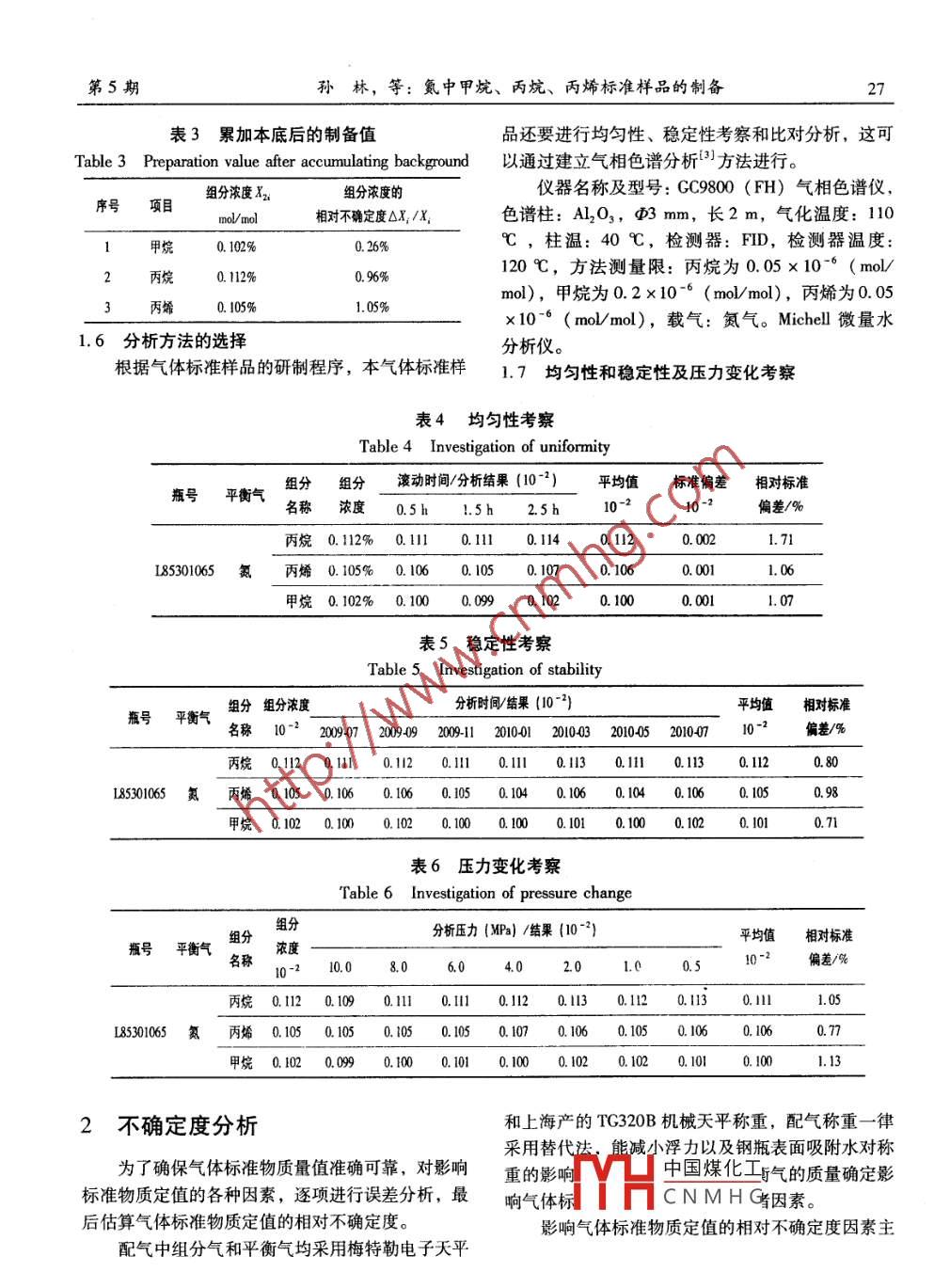 第30卷第5期低溫與特氣VoL 30. No 5012年10月Low Temperature and Specialty Gasesoct,2012特氣制備氮中甲烷、丙烷、丙烯標(biāo)準(zhǔn)樣品的制備孫林,劉志軍,李英輝,陳楊,尹玲玲(蘇州金宏氣體股份有限公司,江蘇蘇州215152)摘要:敘述了氮中甲烷、丙烷、丙烯標(biāo)準(zhǔn)樣品制備,以及采用氣相色譜法對(duì)其穩(wěn)定性和均勻性進(jìn)行考核,確保其數(shù)據(jù)準(zhǔn)確可靠。關(guān)鍵詞:氮中甲烷;丙烷;丙烯標(biāo)準(zhǔn)樣品;制備;定值中圖分類號(hào):TQ117文獻(xiàn)標(biāo)志碼:B文章編號(hào):1007-7804(2012)050025-05doi:10.3969/ J. Issn.1007-7804.2012.05.007Preparation of Standard Sample of Methane, Propane, Propylene in NitrogenSUN Lin, LIU Zhijun, LI Yinghui, CHEN Yang, YIN LinglingSuzhou Jinhong Gas Co., Ltd., Suzhou 215152, ChinaAbstract The thesis has explained the preparation reference material of methane, propane, propylene in nitrogen. It also in-troduces to use GC to check the uniformity and stability of the sample in order to ensure its accuracy and reliability.Key words: methane; propane; propylene in nitrogen; preparation; analysis隨著我國國民經(jīng)濟(jì)的進(jìn)一步發(fā)展和人民生活水平合氣體的總摩爾數(shù)。的穩(wěn)步提高,社會(huì)對(duì)環(huán)境質(zhì)量的要求越來越高,在此1.2設(shè)備過程中,加強(qiáng)對(duì)汽車尾氣排放的控制也受到了越來越1.2.1稱量設(shè)備多的重視。隨著《中華人民共和國大氣污染防治法》稱量設(shè)備一:上海精密科學(xué)儀器有限公司以及與之配套的汽車排放法規(guī)的頒布與實(shí)施,我國對(duì)(天平儀器廠)生產(chǎn)的機(jī)械天平,型號(hào):TC320B汽車尾氣排放的控制步入了法治軌道。為了滿足執(zhí)法載荷:20kg/10mg。部門能夠準(zhǔn)確測(cè)定其含量的要求,研制了氮中甲烷、稱量設(shè)備二:梅特勒( Mettler toledo)生產(chǎn)的丙烷、丙烯氣體標(biāo)準(zhǔn)物質(zhì)1。電子天平,型號(hào):KCC150 Platform,載荷:1501氣體標(biāo)準(zhǔn)樣品制備方法的研究kg/lg,實(shí)際分度值:0.1g;型號(hào):XPl0002S,載荷:10kg/0.1g,實(shí)際分度值:0.01g1.1原理1.2.2氣瓶處理設(shè)備根據(jù)GBT5274—2008《混合氣體的制備一稱江蘇省丹陽市華東空分設(shè)備廠設(shè)計(jì)制造,可在量法》2),以質(zhì)量為單位,配制氣體標(biāo)準(zhǔn)樣品。在130℃以下任意設(shè)定加熱溫度,真空度可達(dá)到充入一定量的已知濃度氣體前后分別稱量容器,所3Pa充入組分的質(zhì)量由兩次稱量讀數(shù)之差來確定,依次1.2.3配氣裝置充入不同的組分氣體,從而獲得一種混合氣體?;熘袇枪饷骰ぱ芯吭O(shè)計(jì)院有限公司設(shè)計(jì)制造合氣體中各組分的含量以組分的摩爾分?jǐn)?shù)表示,定由真空泵、真空熱電偶、真空表、壓力表、氣路系義為組分i的摩爾數(shù)與混合氣體總摩爾數(shù)之比。其統(tǒng)以及氣瓶連接件組成。采用性能良好的閥門、真標(biāo)準(zhǔn)氣體的摩爾濃度定義為X=n,/n1。式中,X為空表、壓中國煤化工證了系統(tǒng)的氣密標(biāo)氣的摩爾濃度;n2為標(biāo)氣的摩爾分?jǐn)?shù);n1為混性。采用特CNMHG域少了磨損。收稿日期:2012-07-20中國煤化工CNMHG第5期孫林,等:氪中甲烷、丙炕、丙烯標(biāo)準(zhǔn)樣品的制備27表3累加本底后的制備值品還要進(jìn)行均勻性、穩(wěn)定性考察和比對(duì)分析,這可Tae3 Preparation value after accumulating background以通過建立氣相色譜分析方法進(jìn)行。組分濃度2儀器名稱及型號(hào):GC9800(FH)氣相色譜儀,序號(hào)項(xiàng)目mol/ mol相對(duì)不確定度△X1/X色譜柱:A12O3,Φ3mm,長2m,氣化溫度:1100.102%0.26%℃,柱溫:40℃,檢測(cè)器:FID,檢測(cè)器溫度0.96%120℃,方法測(cè)量限:丙烷為0.05×10-6(mo0.112%mol),甲烷為0.2×10-6(mol/mol),丙烯為0.05丙烯0.105%1.05%10-6(mo/mol),載氣:氮?dú)狻?Michell微量水1.6分析方法的選擇分析儀。根據(jù)氣體標(biāo)準(zhǔn)樣品的研制程序,本氣體標(biāo)準(zhǔn)樣1.7均勻性和穩(wěn)定性及壓力變化考察表4均勻性考察Table 4 Investigationof uniformity瓶號(hào)平,t組分組分滾動(dòng)時(shí)間/分析結(jié)果(102)平均值標(biāo)準(zhǔn)偏差相對(duì)標(biāo)準(zhǔn)名稱濃度0.5h1.5h2.5b1010偏差/%丙烷0.112%0.10.1110.1140.1120.002I85301065氮丙烯0.105%0.100.1050.1070.001甲烷0.102%0.1000.0990.1020.1000.00l1.07表5穩(wěn)定性考察Table 5 Investigation of stability瓶號(hào)平衡氣組分組分濃度分析時(shí)間/結(jié)果(10-2)平均值相對(duì)標(biāo)準(zhǔn)名稱10-2200020090001201012010320105200102偏差/%丙烷0.1120.110.120.1l0.ll0.l30.l0.130.20.80L85301065氮丙烯01050.1060.100.1050.1040.100.1040.1060.100.9甲烷01020.1000.1020.1000.1000.1010.1000.1020.1010.71表6壓力變化考察Table 6 Investigation of pressure change組分組分分析壓力(MPa)/結(jié)果(10-平均值相對(duì)標(biāo)準(zhǔn)瓶號(hào)平衡氣濃度名稱8.04.01.00.5偏差/%丙烷0.1120.1090.1l0.ll0.120.0.1120.30.l1.05I85301065氮丙烯0.1050.1050.1050.1050.1070.1060.1050.1060.100.77甲烷0.1020.090.1000.100.1000.1020.1020.1010.1001.132不確定度分析和上海產(chǎn)的TG320B機(jī)械天平稱重,配氣稱重一律采用替代法,能減小浮力以及鋼瓶表面吸附水對(duì)稱為了確保氣體標(biāo)準(zhǔn)物質(zhì)量值準(zhǔn)確可靠,對(duì)影響重的影響中國煤化工氣的質(zhì)量確定影標(biāo)準(zhǔn)物質(zhì)定值的各種因素,逐項(xiàng)進(jìn)行誤差分析,最響氣體標(biāo)CNMHG因素。后估算氣體標(biāo)準(zhǔn)物質(zhì