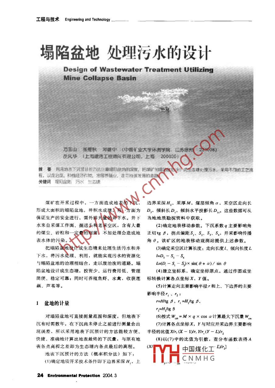 工程與技術(shù)Engineering and Technology .塌陷盆地處理污水的設(shè)計Design of Wastewater Treatment UtilizingMine Collapse Basin萬玉山張雅秋鄧喀中(中國礦業(yè)大學(xué)環(huán)測學(xué)院,江蘇徐州 221008)胡風(fēng)華 (上海建浩工程顧問有限公司, 上海200030)擅要利用地表下沉累計的方法計算增陷然地的深度,把煤礦的喝沿然地設(shè)計成生態(tài)唐父理污水,采用不同的工藝流程,以廢治廢,種植經(jīng)濟作物,發(fā)展養(yǎng)殖業(yè),走司持續(xù)發(fā)器的道路。關(guān)鍵詞爛陷盆地 三態(tài)塘煤礦在開采過程中,一方面造成地表的下沉,邊界采深H,采厚M,煤層傾角a,采空區(qū)走向長形成大面積的塌陷盆地,并積水成塘,另方面為D,,傾斜長D,傾斜水平投影長D1。這些數(shù)據(jù)可從保證生產(chǎn)的安全進行,需外排大量的井下水。井下當(dāng)?shù)氐刭|(zhì)勘探資料中獲取。水來自采煤工作面、掘進頭和老采空區(qū),含有大量(2)確定地表移動參數(shù)。下沉系數(shù)q主要影響角的煤塵、巖粒和一定量的細菌,不加處理會造成地正切tg B,拐點偏距S, s2、S,. s,開采影響傳播表水體的污染。角日。該礦區(qū)的地表移動觀測站提供上述參數(shù)。把塌陷盆地設(shè)計成生態(tài)塘來處理生活污水和井(3)確定采空區(qū)計算長度:走向長度1、傾向長度L下水,將污水處理、利用,就能實現(xiàn)污水的資源化l=D3-S,- S.與塌陷盆地的治理相結(jié)合,走以廢治廢的道路。塌L=(D-S,- S)x sin(θ+ a)/ sin θ陷盆地設(shè)計成生態(tài)塘,投資少、運行費用低、管理(4)建立坐標(biāo)系,確定坐標(biāo)原點,通過作圖或坐簡便、穩(wěn)定可靠,同時可養(yǎng)殖魚蝦、水禽,收獲蓮標(biāo)轉(zhuǎn)換計算各 點坐標(biāo)X、Y值。藕、蘆葦?shù)取?5)計算走向主要影響半徑r和上、下邊界的主要影響半徑r,、r2:1盆地的計 量r=H/tgB, r,=H/tg B,r:=H/lg β對塌陷盆地可直接測量范圍和深度,但地表下(6)按式WEm =Mxqx cos a計算最大下沉量W.沉有時需數(shù)年,在下沉尚未停止之前進行測量會出(7)計算各點坐標(biāo)X,Y與對應(yīng)開采邊界主要影響現(xiàn)誤差,所以采用地表下沉預(yù)計的方法能較方便、半徑的比值XIr,(X - 1)r, Yr,(Y - LD)r,快捷、準(zhǔn)確地計算出地表最終的下沉最,與原有地(8)以(7)中的比值為引數(shù),查分布函數(shù)表得A表各點高程之差即為生態(tài)塘內(nèi)各點最后的高程。中國煤化工D)lrJ地表下沉預(yù)計的方法(慨率積分法)如下:(1)確定地質(zhì)開采技術(shù)條件即下邊界采深H,上“THCNMHG24 Envlronmental Protoctlon 2004. 3_ Enineering and Technoloy 工程與技術(shù)W,(X-D=W.xA[(X-D/r]藻類和大氣復(fù)氧時,就使全塘處于厭氧分解狀態(tài)。W([)= Wm xA(Yr)厭氧塘是一類高有機負荷的以厭氧分解為主的生物W(Y- D)=Wm xA[(Y- LD)r,]塘,BOD,負荷40 ~ 600kg/(km2/d),其表面積較小,水在W(X)=([W,(X)- W(X - 0]塘中停留1-5d.它能以高有機負荷處理高濃度廢W(Y)=[W(Y)- W(Y- L)]水,BOD,去除率60%~ 90%,污泥量少,產(chǎn)生臭氣,計算X方向的下沉量W(X). W(X - D). W(X)和出水不能達 到排放要求,因而多作為好氧塘的預(yù)處Y方向的下沉量W(ID、W(Y- L). W(Y)。 .理塘使用。(10)由公式:2.3好氧塘W(X,N)=WX)x WrY/Wm好氧塘是--種主要靠塘內(nèi)藻類的光合作用供氧求得各點的最終下沉量W(X,Y)。的氧化塘。它的水深較淺,-般在0.3~0. 5m,陽把以上步驟編程,輸入(1)、(2)、 (4) 的數(shù)據(jù),光能直接射透到池底,藻類生長旺盛,加上塘面風(fēng)可很快求出各點的高程。力攪動進行大氣復(fù)氧,全部塘水都呈好氧狀態(tài)。BOD,負荷2~ 40kg/ (km?/d),水在塘中停留2~ 10d,2處理工藝BOD,去除率80% ~95%。暌氣塘是為了強化塘面大氣復(fù)氧作用,在塘上設(shè)置機械曝氣或水力曝氣器,2.1 工藝流程使塘水得到不同程度的混合而保持好氧狀態(tài)。曝氣塘有機負荷和去除率都比較高,占地面積小,污水早醫(yī)氧塘一植物塘一好氧塘一養(yǎng)殖城- 排放或回用但運行費用高,且出水懸浮物濃度較高,使用7國。時可在后面連接兼性塘來改善最終出水水質(zhì)。植物塘或好氧塘2.4蒹性塘兼性塘的水深一般在1~ 2.5m,塘內(nèi)好氧根據(jù)不同的進水水質(zhì)和回用要求選用不同的處和厭氧生化反應(yīng)兼而有之。 在上部水層中,白天藻理流程①②③④,并結(jié)合上文計算所得塌陷盆地的深類光合作用旺盛,塘水維持好氧狀態(tài),其凈化機理度,盡量減少工程投資,降低運行成本。和各項運行指標(biāo)與好氧塘相同:在夜晚,藻類光合山東東營市污水生態(tài)處理工藝流程為:作用停止,大氣復(fù)氧低于塘內(nèi)耗氧,溶解氧急劇下降至接近于零。在塘底,由可沉固體和藻類、菌類污水一+沉砂池一厭氧塘|-+曝氣塘殘體形成了污泥層,由于缺氧而進行厭氧發(fā)酵,在.好氧層和厭氧層之間,存在著一個兼性層。兼性塘是氧化塘中最常用的塘型,常在曝氣塘或厭氧塘之儲水庫蘆葦塘←一藕塘曝氣養(yǎng)魚塘后作為二級處理塘使用,有的也作為難生化降解有機廢水的貯存塘和間歇排放塘。BOD,負荷4~ 10kg/(km?/d),水在塘中停留3~ 15d,BOD, 去除率70% ~在設(shè)計時應(yīng)盡最k滿足下列條件: (1)塘的個數(shù)不90%。少于3個,串聯(lián)運行,(2)塘形如為矩形,長寬比應(yīng)2.5 植物塘大于3,設(shè)置黏土止水層1 (3) 進口距塘底0.5m,以水生植物有挺水植物、漂浮植物、浮葉植物和多點進水為佳,出口應(yīng)盡可能遠離進