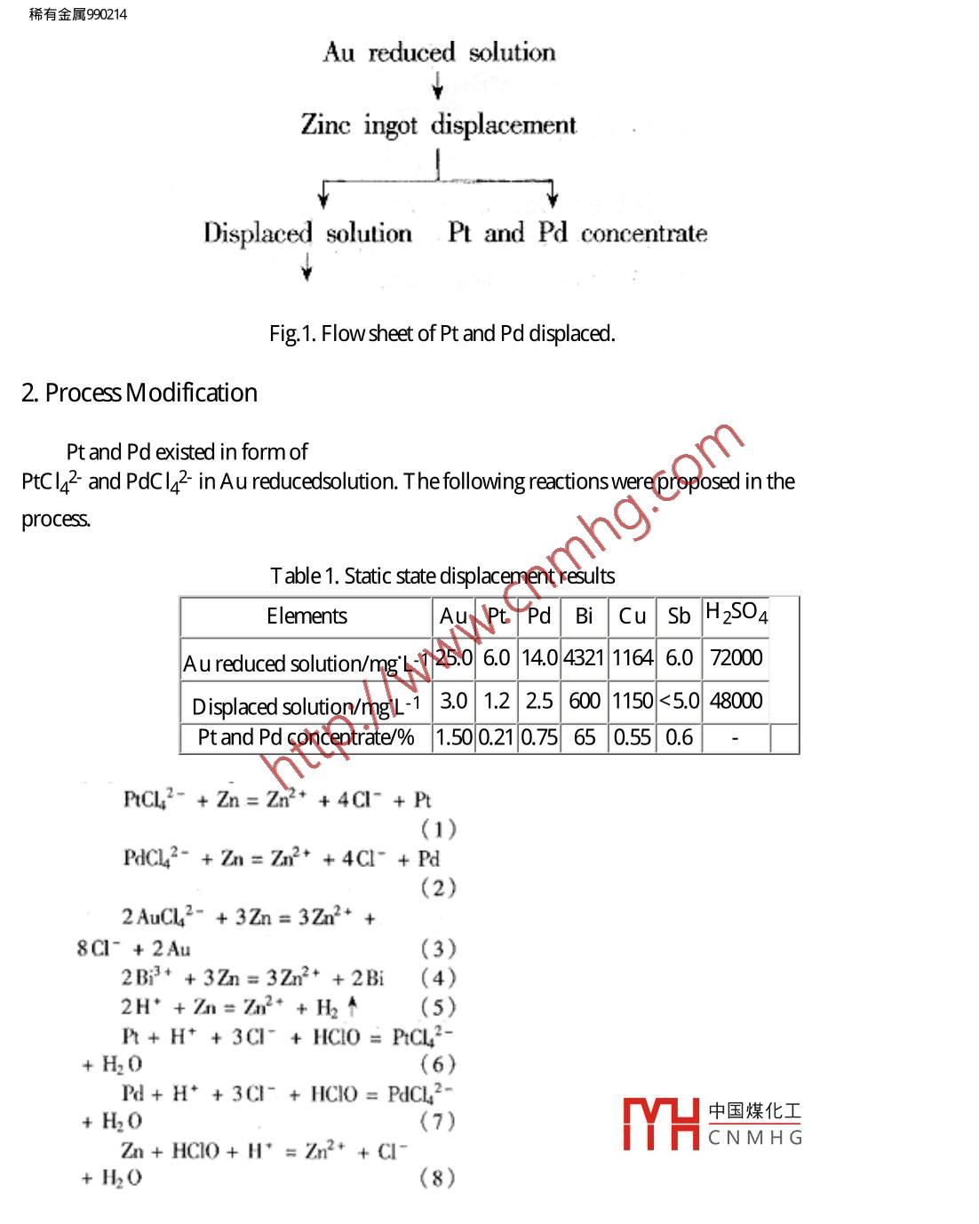 稀有金屬990214稀有金屬資源系統(tǒng)RARE METALS數(shù)字化期刊WANFANG DATA ( CHINAINFO)DIGITIZED PERIODICAL1999年第2期No.2 1999Optimization of Pt and Pd D isplacement Processof Au Reduced SolutionHuJianhui(胡建輝)Guixi Smelter, Jiangxi C opper Corporation, Guixi 335424, ChinaReceived 2June 1998AbstractThe question existed in the displacement of platinum and palladium fromAureduced solution was analyzed. The process optimization schemewas put forward and adoptedto practice and has achieved a good result.Key W ords.: Pt and Pd, Displacement Optimization1. IntroductionIn Guixi Smelter, copper anode slimewas treated by means of technological process ofvolatilizing Sein a rotary kiIn, picking copper in water solution, leaching Tein alkalinesolution,separating Au by chloridizing method and extracting Ag with sodium sulphite. The Pt and Pd incopper anodeslime was almost concentrated in Au rich solution after the Au reduced withNa2SO3 and then recovered by means of traditional displacement with zinc ingot, as seen in Fig.1.The reduced solution with ahigh acid concentration solution contained many foreign ions.The static state displacement wasvery low in efficiency and the reagent consumption wasverygreat. In addition, the displaced solution could not meet the discharged standard and a greatamount ofbase metals(such as bismuth) got into the displaced residue making it more difficult toextract the Pt and Pd. The chemical composition of Au reduced solution is shown in T able1.中國(guó)煤化工MHCNM HGfle://E Viy999yji9902/990214.htm (第1/ 8頁(yè)) 2010-3-23 12:17:16稀有金屬990214Au reduced solution↓Zinc ingot displacementDisplaced solution. Pt and Pd concentrateFig.1. Flowsheet of Pt and Pd displaced.2. Process ModificationPt and Pd existed in formofPtCI42- and PdCl42- in Au reducedsolution. The following reactions were proposed in theprocess.Table 1. Static state displacement resultsElementsAu| Pt| PdBiCu | Sb |Hz2SO4Aureduced slution/mgL-1|25.0 6.0 14.04321164 6.0 7200Displaced solution/mgL-1 3.0 1.2 2.5 | 601150<5.0 48000Pt and Pd concentrate/% 1 .50|0.210.75 65 0.55 0.6PrCL2- + Zn= Zn2+ +4C1- + Pt(1)PdCL2- + Zn= Zn2+ +4Cl" + Pd .(2)2AuCL2- + 3Zn= 3Zn2+ +8CI- + 2Au(3)2Bi+ + 3Zn= 3Zn?+ + 2Bi (4)2H*+Zn=Zn2++H2↑(5)P+ H+ + 3C1~ + HCIO= PrCL2-+ H20(6)Pd+ H* + 3C1- + HCIO = PdCL.2-中國(guó)煤化工<7)Zn+ HCIO+ H° = Zn2+ + CI~MHCNM HG+ H2O(8)fle://E/ Vy999yji9902/990214.htm (第2/ 8頁(yè)) 2010-3-23 12:17:16稀有金屬990214The reaction (4) not only increased the zinc consumption but also degraded the Pt and Pdconcentration. C omparing the hydrolysis pH values of Bi3+, PtC l42-~ and PdCl42-, Bi3+ can be .separated by hydrolysis from theAu reduced solution before it was displaced when adjusting theacid concentration of the solution[ 1] .PICL2- + 2H20=2H+ + 4CI-+ P(OH)2(9)pH=4.29- 1/21g[ PCL2- ]+ 2lg[Cl- ]PdCL42- + 2H2O= 2H+ +4CI~+ Pd( OH)2(10)pH = 5.18 - 1/21g [ PdCL3- ]+ 2lg[Cl~ ]AuCl4~ + 3H2O= 3H* + 4Cl-+ Au( OH);(11)pH= 7.68- 1/31g[ AuCl4~ ] +4/31g[ C1~ ]Bi++Cl~+H2O=BiOCI+2H°(12)pH= - 1.39- 1/21g[ Bi}* ]- 1/21g[ CI~]Though it is beneficial to the hydrolysis of bismuth and displacement of Ptand Pd byreducing the acid concentration of theAu reduced solution [ 1,2] . Pt and Pd would loss onhydrolysis if thevery low acid concentration was directly adopted. Therefore, bismuth wasseparated firstfrom Au reduced solution by alkalinehydrolysis, followed by adjusting the acid concentration of solution, Pt and Pd were cemented, asshown in Fig.2. Not only could bismuth be separated first from it but also the rates of thereactions(5) ~ (8) and the zinc consumption were reduced. It has also been ableto raise thedisplacement efficiency and achieve quantitative displacement of the Pt and Pd.3. Optimization ofT echnological C onditions3.1. Bi Hydrolysis Precipitation中國(guó)煤化工.HCNMHGFig.3 indicates the effect of the acidity on Bi hydrolysis at differentuenprauits.11increase in temperature isDischarge after purified beneficial to Bi precipitation[3] . A reductionfle//E/ Vy/ys9902/990214.htm (第3/ 8頁(yè)) 2010-3-23 12:17:16稀有金屬990214in the acid concentration of the solution is beneficial to the reaction(12) and Bi precipitation.When the concentration of H 2SO4 Was as low as 15 g/L and thereaction temperaturewas above80°C, the precipitation eficiency of Bi was greater than 98%.Au reduced solutionBi hydrolysis precipitationBiOCIBi precipitated solution↓Adjusting acid concentrationCemented with zinc. powderPi and Pd concentrateDisplaced solutionDischarge after purifiedFig.2. Flow sheet of the Pt and Pd displacement optimized.1003\ 2\958515202S中國(guó)煤化工Cooentretion d H:SO2 Solutiov/g*l.'FYHCNM HGfle://E Viy999yji9902/990214.htm (第4/ 8頁(yè)) 2010-3-23 12:17:16稀有金屬990214Fig.3. Effect of acidity on precipitation eficiency of Bi.1- -40°C ; 2- 60°C ; 3- 80°CAt 80°C, the process of bismuth hydrolysis affects the Pt, Pd etc, as shown in theTable 2.Only at the solution pH value of above4, PtCl42- would start to be hydrolyzed. Table2 showsthat, when the H 2SO4 concentration of solution was adjusted to 12 ~ 15 g/L during bismuthhydrolysis, AuCl42- and PdCl2- was hardly afected, but PtCI2- has a ltloss and thereasonwas to be studied.T able 2. Effect of acidity on concentrationof Pt et al/mg'L-1No.Au|Pt|Pd| Bi | Cu H2SO410 23.14.716.241121190 800002 23. 14.715.8466 1183 300003 23.04.615.8 167 1146 220004 23.04.315.690 1185 16000「 522.84.015.6 61[1182[ 12000[ 6 22.83.915.3 31 1182| 100007 21.71.713.8 5 1113| 2400①Au reduced solution3.2. Displacement by Zinc PowderIn Au reduced solution, Pt and Pd were displaced with zinc powder very quickly, thereaction equilibriumwould reach for 5 ~ 10 min with agitation. Asseen in Fig.4 and Fig.5.中國(guó)煤化工MHCNM HGfle://E Viy999yji9902/990214.htm (第5/ 8頁(yè)) 2010-3-23 12:17:16稀有金屬990214100等805意70H600305070110T'ime t/minFig.4. Effect of time on rateof Pt displacement