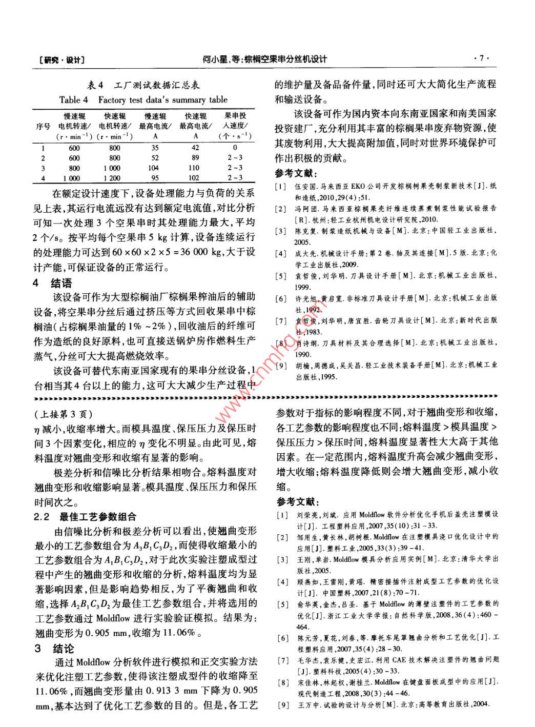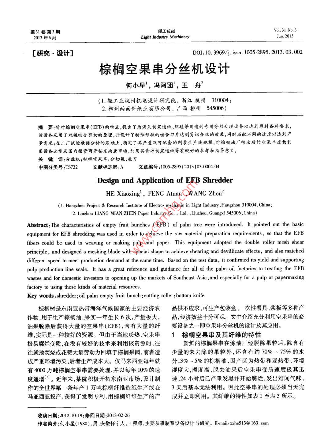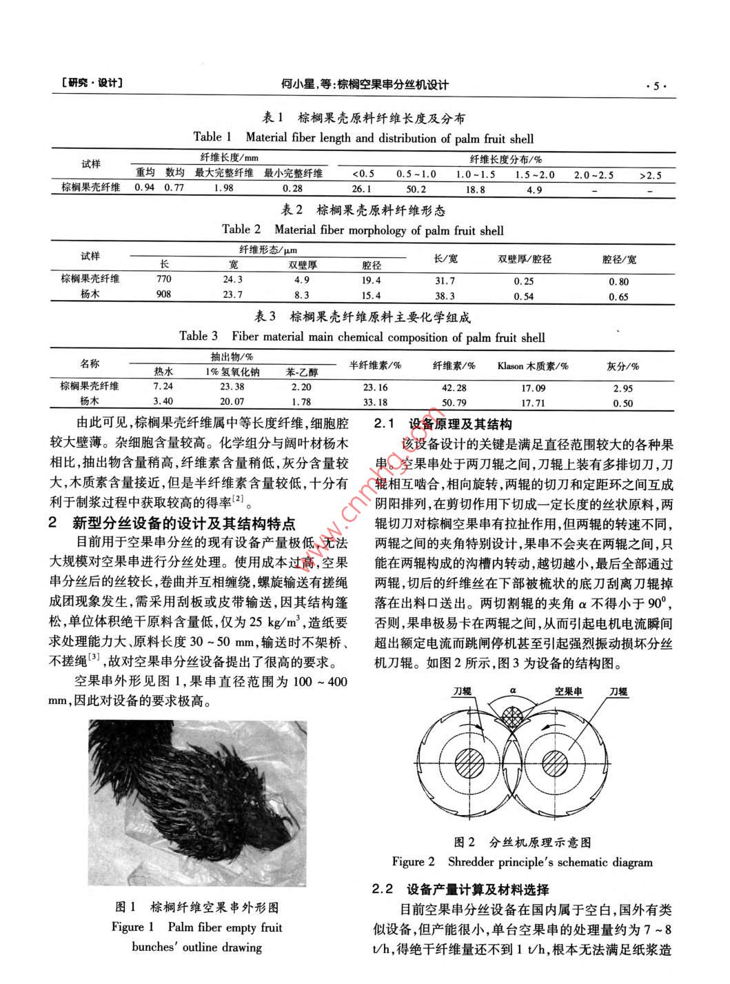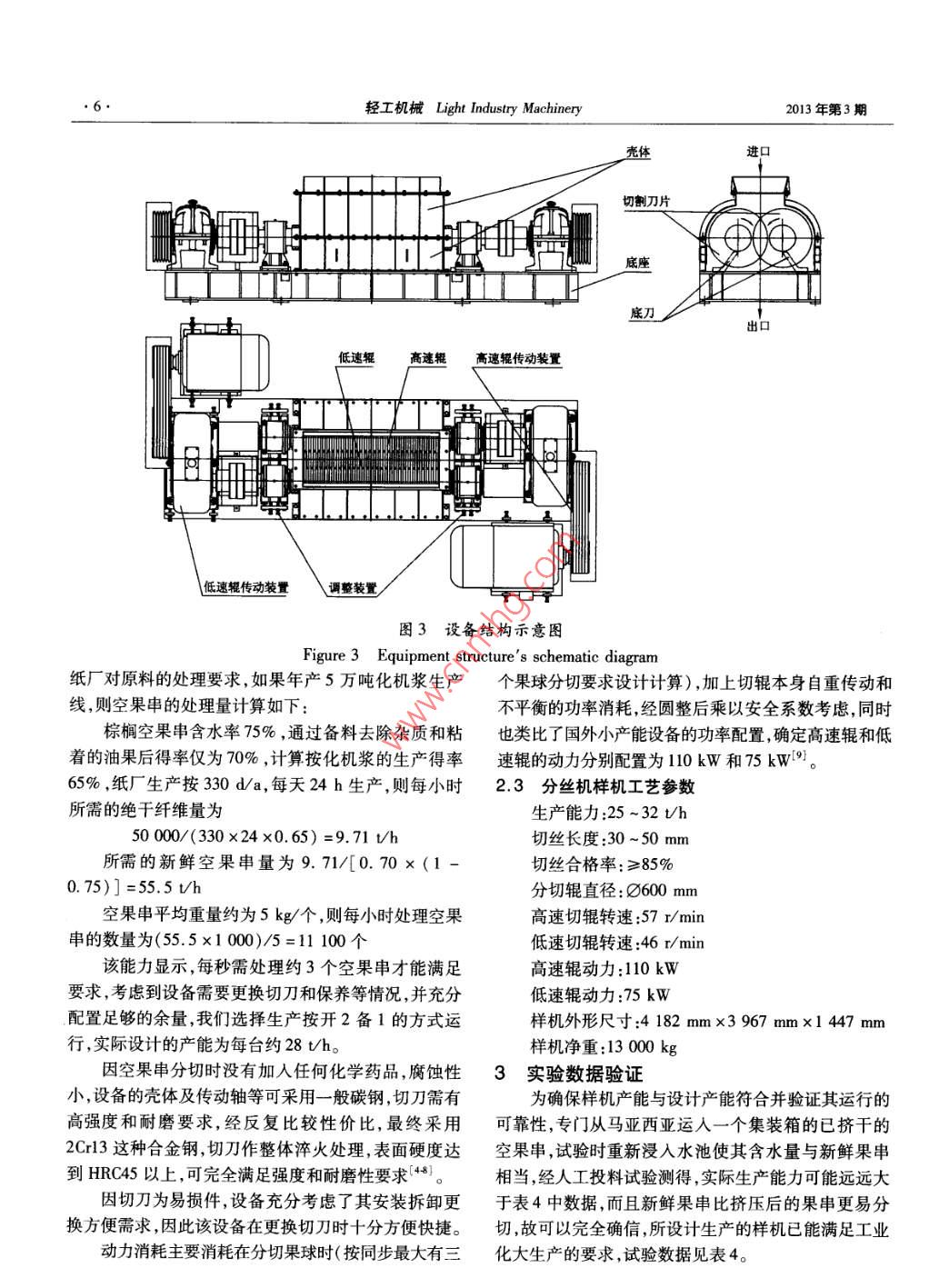 第31卷第3期輕工機(jī)械Vol 31 No. 32013年6月Light Industry MachineryJun.2013[研究·設(shè)計(jì)]DOI:10.3969/j.issn.1005-2895.2013.03.002棕櫚空果串分絲機(jī)設(shè)計(jì)何小星,馮阿團(tuán),王舟(1.輕工業(yè)杭州機(jī)電設(shè)計(jì)研究院,浙江杭州3100042.柳州兩面針紙業(yè)有限公司,廣西柳州545006摘要:針對棕櫚空果串(EFB)的特點(diǎn),提出了為滿足制漿造紙、織毯等用途的專用分絲處理設(shè)備以達(dá)到原料備料要求,該設(shè)備采用了雙輥嚙合剪切的原理,并設(shè)計(jì)了特殊形狀的嚙合η片達(dá)到剪切分絲的效果,同時(shí)匹配不冋的速度以達(dá)到產(chǎn)量需求;在工廠試驗(yàn)數(shù)據(jù)分析的基礎(chǔ)上,確定了其產(chǎn)量及可配套的制漿生產(chǎn)線規(guī)模,對棕櫚油廠榨油后的空果串廢物利用設(shè)備選型及國內(nèi)投資商開拓東南亞市場,利用其資源制漿造紙等有較好的參考和指導(dǎo)意義。關(guān)鍵詞:分絲機(jī);棕櫚空果串;分切輥;底刀中圖分類號(hào):TS732文獻(xiàn)標(biāo)志碼:A文章編號(hào):10052895(2013)03000404Design and Application of EFB ShredderHE Xiaoxing, FENG Atuan, WANG Zhou(I. Hangzhou Project Research Institute of Electro- mechanic in Light Industry, Hangzhou 310004, China;2. Liuzhou LIANG MIAN ZHEN Paper Industry Co., Ltd., Liuzhou, Guangxi 545006, China)Abstract: The characteristics of empty fruit bunches(EFB )of palm tree were introduced. It pointed out the basicequipment for EFB shredding was used in order to achieve the raw material preparation requirements, so that the EFBfibers could be used to weaving or making pulp and paper. This equipment adopted the double roller mesh shearprinciple, and designed a meshing blade with special shape to achieve shearing and devillicate effects, and also matcheddifferent speed to meet production demand at the same time. Based on the test data, it confirmed its yield and supportingpulp production line scale. It has a great reference and guidance for all of the palm oil factories to treating the EFBwastes and for domestic investors to opening up the markets of Southeast Asia, and especially for a pulp or papermakingfactory to using those kinds of material resourcesKey words: shredder; oil palm empty fruit bunch; cutting roller; bottom knife棕櫚樹是東南亞熱帶海洋氣候國家的主要經(jīng)濟(jì)農(nóng)品供不應(yīng)求,可生產(chǎn)包裝盒、次性餐具、漿板等多種產(chǎn)作物用于生產(chǎn)棕櫚油,果實(shí)一年生長6次,產(chǎn)量極大,品,經(jīng)濟(jì)效益十分可觀。文中介紹充分利用空果串的必油果脫除后獲得大量的空果串(EFB),含有大量的纖要設(shè)備之一即空果串分絲機(jī)的設(shè)計(jì)及其應(yīng)用維,實(shí)際是一種較好的資源。但由于當(dāng)?shù)匮谉?空果串1棕櫚空果串及其纖維的特性極易腐爛變質(zhì),在沒有較好的技術(shù)來利用該資源時(shí),往新鮮的棕櫚果串在煉油廠經(jīng)脫除果粒后,除含有往就地焚燒或花費(fèi)大量勞動(dòng)力回填于棕櫚果園,前者造少量的未去除的果粒外,還含有約70%-75%的水成嚴(yán)重環(huán)境污染,后者生產(chǎn)成本大。僅馬來西亞每年就分,3%~5%的棕櫚油,因產(chǎn)區(qū)為熱帶和亞熱帶,環(huán)境有4000萬噸棕櫚空果串需要處理,并以每年10%的速濕度大,溫度高,脫去油果后空果串變質(zhì)速度極其迅度遞增口。近年來,某院積極開拓東南亞市場,設(shè)計(jì)制速,24小時(shí)后已嚴(yán)重發(fā)黑并開始腐爛,發(fā)出難聞氣味,作的全世界第一條年產(chǎn)1萬噸棕櫚纖維造紙生產(chǎn)線在3天后基本無法利用。因此空果串的處理必須當(dāng)天完馬亞西亞投產(chǎn),獲得了發(fā)明專利,用棕櫚纖維生產(chǎn)的產(chǎn)成并立即利用。其纖維的特性如表1至表3所示。收稿日期:2012-10-19;修回日期201302-26作者簡介:何小星(1980),男,安徽懷寧人,工程師,主要從事制漿設(shè)備設(shè)計(jì)與研究。E-mail:xhe13@l63.com[研究·設(shè)計(jì)]何小星等:棕櫚空果串分絲機(jī)設(shè)計(jì)表1棕棡果殼原料纖維長度及分布Table 1 Material fiber length and distribution of palm fruit shell纖維長度/mm纖維長度分布/%重均數(shù)均最大完整纖維最小完整纖維<0.50.5-1.01.0-151.5202.0-2.52.5棕櫚果殼纖維0940.771.980.28表2棕櫚果殼原料纖維形態(tài)Table 2 Material fiber morphology of palm fruit shell試樣纖維形態(tài)/pm長寬雙壁厚腔徑長/寬雙壁厚/腔徑腔徑/寬棕櫚果殼纖維24.319.431.70.250.80楊木23.7表3棕櫚果殼纖維原料主要化學(xué)組成Table 3 Fiber material main chemical composition of palm fruit shell名稱抽出物/%熱水1%氫氧化鈉苯,乙醇半纖維素/%纖維素/%Kom木質(zhì)素/%灰分/%棕櫚果殼纖維23.3842.2817.092.95楊木17710.50由此可見,棕櫚果殼纖維屬中等長度纖維,細(xì)胞腔2.1設(shè)備原理及其結(jié)構(gòu)較大壁薄。雜細(xì)胞含量較高?;瘜W(xué)組分與闊葉材楊木該設(shè)備設(shè)計(jì)的關(guān)鍵是滿足直徑范圍較大的各種果相比,抽出物含量稍高,纖維素含量稍低,灰分含量較串??展幱趦傻遁佒g,刀輥上裝有多排切刀,刀大,木質(zhì)素含量接近,但是半纖維素含量較低,十分有輥相互嚙合,相向旋轉(zhuǎn)兩輥的切刀和定距環(huán)之間互成利于制漿過程中獲取較高的得率2。陰陽排列,在剪切作用下切成一定長度的絲狀原料,兩2新型分絲設(shè)備的設(shè)計(jì)及其結(jié)構(gòu)特點(diǎn)輥切刀對棕櫚空果串有拉扯作用,但兩輥的轉(zhuǎn)速不同,目前用于空果串分絲的現(xiàn)有設(sh