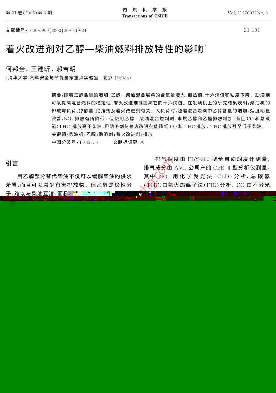第21卷(2003)第6期內(nèi)燃機(jī)學(xué)報(bào)Vol.21(2003)No.6Transactions of CSICE文章編號(hào):1000909(2003)06-0419-0421-101著火改進(jìn)劑對(duì)乙醇一柴油燃料排放特性的影響何邦全,王建昕,郝吉明(清華大學(xué)汽車安全與節(jié)能國家重點(diǎn)實(shí)驗(yàn)室,北京100084)摘要:隨著乙醇含量的增加,乙醇—柴油混合燃料旳含氧量増大,但熱值、十六烷值和粘度下降。助溶劑可以提高混合燃料的穩(wěn)定性,著火改進(jìn)劑能提高它的十六烷值。在發(fā)動(dòng)機(jī)上的硏究結(jié)果表明:柴油機(jī)的排放與負(fù)荷、摻醇量、助溶劑及著火改進(jìn)劑有關(guān)。大負(fù)荷時(shí),隨著混合燃料中乙醇含量的增加,煙度明顯改善,NO排放有所降低,但使用乙醇—柴糶油混合燃料時(shí),未燃乙醇和乙醛排放增加,而且CO和總碳?xì)?THC)排放高于柴油,但助溶劑與著火改進(jìn)劑能降低CO和THC排放,THC排放甚至低于柴油關(guān)鍵詞:柴油機(jī);乙醇;助溶劑;著火改進(jìn)劑;排放中圖分類號(hào):TK421.5文獻(xiàn)標(biāo)識(shí)碼引言排氣煙度由FBY-200型全自動(dòng)煙度計(jì)測(cè)量排氣成分由AVL公司產(chǎn)的CEB型分析儀測(cè)量用乙醇部分替代柴油不僅可以緩解柴油的供求其中NO用化學(xué)發(fā)光法(CID)分析,總碳?xì)涿芏铱梢詼p少有害排放物。但乙醇是極性分(THC)由氬火焰離子法(FID)分析,CO由不分光子,難以與柴油互溶,而且乙醇_柴油混合燃料的穩(wěn)紅外線法(NDR)分析。排氣中的乙醛和乙醇排放定性受柴油中碳?xì)浠衔锏臉?gòu)成、含水量、比重、溫量由 Agilent公司產(chǎn)的色譜6890N-質(zhì)譜5973N聯(lián)度和添加劑量的影響,因此要形成均勻穩(wěn)定的乙用手段分析,該機(jī)配有PLOT-Q極性毛細(xì)管柱。料公司研制的 Puranol添加劑能保證含有體積分?jǐn)?shù)2試驗(yàn)結(jié)果與討論為10%~15%的乙醇—柴油燃料長期不分層,而且2.1乙醇一柴油混合燃料的物理化學(xué)性質(zhì)這種燃料能分別減少柴油機(jī)的微粒、CO和NO,排本試驗(yàn)研究了5種燃料的排放特性。這5種燃放41%、27%和5%。但是乙醇和助溶劑的加入,料是:0*柴油(簡稱E0),含有10%乙醇的乙醇柴使得乙醇—柴油—助浛劑燃料的物理化學(xué)性質(zhì)發(fā)生油燃料(簡稱E10,含有30%乙醇的乙醇一柴油燃了改變。Caro等3的研究結(jié)果表明:乙醇的添加使料(簡稱E30),含有2%助溶劑、0.1%著火改進(jìn)劑得乙醇—柴油混合燃料的粘度和十六烷值降低,柴和10%乙醇的乙醇_柴油燃料(E10AⅠ,含有2%油機(jī)旳NO排放降低,循環(huán)壓力波動(dòng)也降低,但同助溶劑、1%著火改進(jìn)劑和30%乙醇的乙醇一柴油時(shí)有新生排放物—未燃乙醇排出4燃料(E30AI)。以上燃料中,各種成分均以體積分考慮到乙醇—柴油混合燃料最容易在柴油機(jī)上數(shù)計(jì)。助溶劑由中國科學(xué)院生態(tài)中心提供,它不含推廣應(yīng)用,因此本文重點(diǎn)研究這類燃料的排放特性。金屬和S成分。著火改進(jìn)劑為硝酸異辛酯。5種燃1試驗(yàn)裝置料的物理化學(xué)性質(zhì)示于表1由表1可見,隨著乙醇含量的增加,混合燃料的試驗(yàn)用發(fā)動(dòng)機(jī)是一臺(tái)非增壓直噴式4102型柴C/H比、密度、運(yùn)動(dòng)粘度、高熱值、十六烷值均降低,油機(jī),最大轉(zhuǎn)矩/轉(zhuǎn)速為245N·m/(1700r/而且E10和E30的十六烷值低于0=柴油下限。著min)壓縮比為17.5。為便于比較各種燃料的排放火改進(jìn)劑可提高混合燃料的十六烷值,并能使其滿特性,試驗(yàn)時(shí)發(fā)動(dòng)機(jī)未做調(diào)整足0柴油對(duì)十六烷值的要求。使用助溶劑后,乙醇*收稿日期:2003-06-02;修訂日期:2003-07-30420內(nèi)燃機(jī)學(xué)報(bào)第21卷第6期柴油混合燃料能長期存放而不分層,而且助溶劑粘度仍低于0柴油標(biāo)準(zhǔn)。還可以看出,各種乙醇一還可以部分恢復(fù)混合燃料的運(yùn)動(dòng)粘度,但E30AⅠ的柴油混合燃料的餾程能滿足θ°柴油的要求。表1試驗(yàn)用燃料的物理化學(xué)性質(zhì)Tab. 1 Physicochemical properties of various fuels目0#柴油標(biāo)準(zhǔn)乙醇EOE10E30ElOAlE3OAl50%回收溫度/C2552340%回收溫度/C31895%回收溫度/C332密度(20C)/(kg/L)實(shí)測(cè)0,83660,83080,82060.8224運(yùn)動(dòng)粘度(20C)/(mm2/s)3.0~8.03.7443.2153.3152.889高熱值/(MJ/kg)46.4543.88十六烷值4544.225.548.745.8芳香烴/%(m/m)18.23.118.1C含量/%(m/m)52.3583.4683.0176.60H含量/%(m/m)13.253.15C/H6.5526.3475.8446.3465.8432.2煙度圖1給出了各種燃料對(duì)煙度排放的影響。由圖1 700 r/min可知煙度與柴油機(jī)的負(fù)荷和乙醇含量有關(guān)。當(dāng)柴油機(jī)處于低負(fù)荷時(shí),乙醇對(duì)煙度排放的影響較小,因+一E10x一E10AI為此時(shí)燃燒室內(nèi)的過量空氣系數(shù)較大。在大負(fù)荷y一E30時(shí),隨著乙醇含量的增加,煙度逐步降低。如平均有E30AL效壓力(BMEP)p。為0.58MPa時(shí),E0、E10AI和E30AI的波許煙度分別為1.6,1.5和0.9。與E0相比,E10AⅠ與E30AI的煙度分別降低了6.3%和43.8%。發(fā)生上述現(xiàn)象的原因是:1)高負(fù)荷時(shí)噴油時(shí)間長,此時(shí)進(jìn)入油束中心的乙醇可抑制碳煙的形成;2)乙醇不提供生成芳香環(huán)的先趨物( precursor)7;3)高的含氧量、低的C/H比也有利于減少1 700 r/min碳煙排放;4)高的過量空氣系數(shù)(圖2)使得局部缺氧的可能性降低。就E10和E10AI來說,著火改進(jìn)劑對(duì)碳煙排放的影響較小。但E30AI