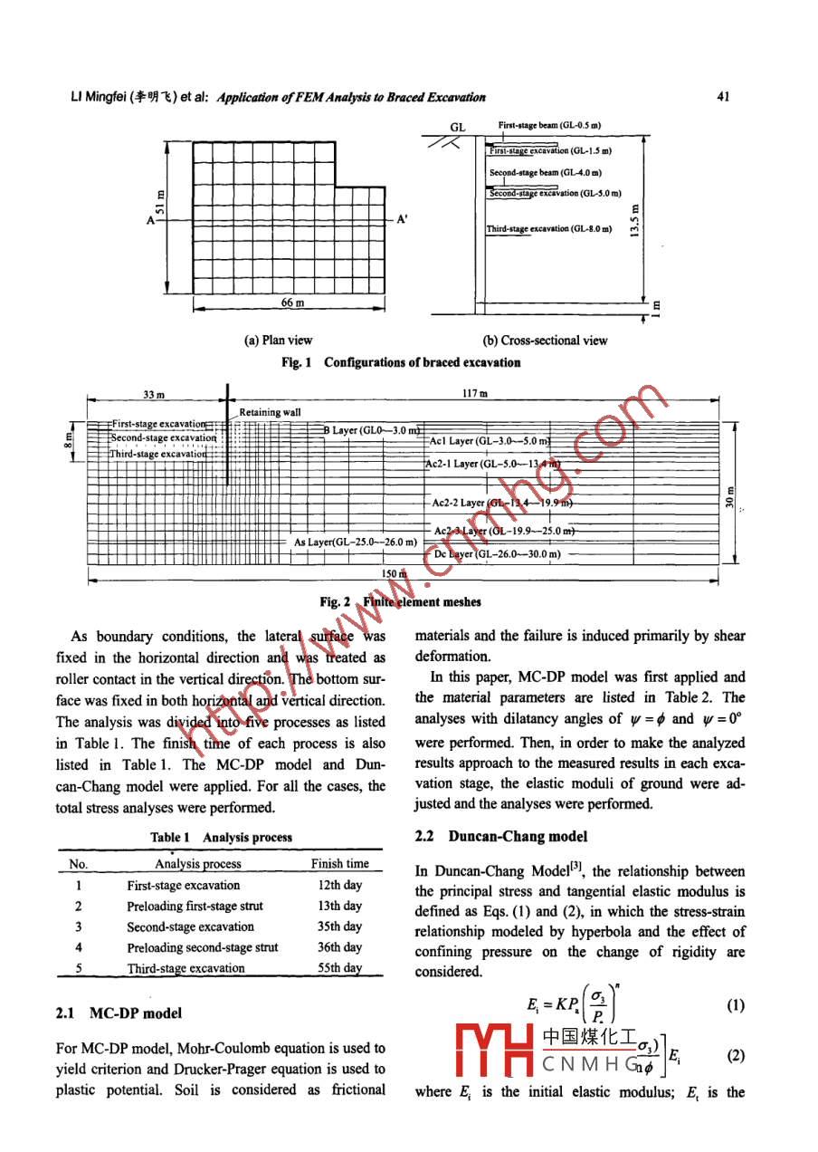 TSINGHUA SCIENCE AND TECHNOLOGYISSN 1007-0214 07/67 pp40-45Volume 13, Number S1, October 2008Application of FEM Analysis to Braced ExcavationLI Mingfei (李明飛)", Atsushi Nakamura, CAI Fei (蔡飛)y, Keizo UgaitFORUM8 Co., Ltd, 2-1-1, Nakameguro GT Tower 15F, Kamimeguro, Meguro-ku, Tokyo, 153-0051, Japan;↑Department of Civil and Environmental Engineering, Gunma University, Kiryu, Gunma 376 8515, JapanAbstract: It is becoming possible to do detailed numerical analyses for the various mechanical behavior ofbraced excavation by researching and developing the numerical analysis technique such as the finite ele-ment method (FEM). However, the mechanical behavior of braced excavation has not been carified fullyboth in theory and in experience. Therefore, improving the prediction accuracy during the prior design is veryimportant for making the observational method of braced excavation more effective. In this paper, FEManalyses were perfomed for a model of braced excavation by using Geotechnical Finite Element Elasto-plastic Analysis Sofware, GeoFEAS (2D). As the constitutive law of ground, MC-DP model, and Dun-can-Chang model were applied. The results were compared and discussed with that of a site measurement,and the effects of the constitutive law of ground on the analyzed result were verified. For the diference be-tween the results, the reason was investigated by the analyses adjusting the elastic modulus of ground, andthe appropriate application of the constitutive law was researched.Key words: numerical analysis; retaining wall; fnite element method (FEM); constutive lawIntroductionservational method of braced excavation more effec-tive. In this research, in order to improve the predictionIn recent years, it is becoming possible to do detailedaccuracy during the prior design, FEM analyses werenumerical analyses for the various mechanical behav-.. performed and the results were compared and dis-ior of braced excavation by researching and developingcussed with the result of a site measurement.the numerical analysis technique such as the finiteelement method (FEM). The observational method1 Outline of Braced Excavation Caseconnecting mechanical behavior measured in the proc-The plan view and cross-sectional viewll are shown iness of construction is becoming an effective design andFig. 1. The horizontal range of excavation is 66mxconstruction technique.51 m and the depth of the final excavation is 8 m.However, it must be paid attentions when applyingthe observational method that the mechanical behavior2 Outline of FEM Analysisof braced excavation has not been clarified fully bothin theory and in experience and the prediction accuracyFor the A-A' section shown in Fig. la, the simulationduring the prior design is not quite enough.analyses were performed by plane strain FEM utilizingTherefore, improving the prediction accuracy duringGeotechnical Finite element Elastoplastic Analysisthe prior design is very important for making theSoftware GeoFFAS (?n)(21 The finite element meshesare sh中國煤化工y, the half of con-Received: 2008-05-30figura|YHCNMHGthewidthandback** To whom corespondence should be adressed.range were assumed to be 30 m and 117 m, with theE-mail: m-ri@forum8 cojpretaining wall and the stnut modeled by beam elements.LI Mingfei (李明飛) et al: Application OfFEMAralysis t0 Braced Excavation41iLFinst-stage beam (GL 0.5 m)Firsi-suge CXGvatii (GL-I.5 m)I Scond-sage excvaiono (GL-S.0m)十Tird-stage exeavtion (GL-8.0m)66m(a) Plan view(b) Coss-sectional viewFig. 1 Configurations of braced excavation33m117mRetaining wa3B Layer(GL0- 3.0年ESecond-stage excavation ;EAcl Layer (GL-3.0~ -5.0哇Third-stge xavatioArc2-1 Layer(GL-5.0~ 13.40- Ac2-2 Layer (GL-13.4-- 19.9 )As Layer(GL -25.0-- 26.0 m)= Ac2-3 Layer (GL-19.9~ -25.0時(shí)- De Layer(GL -26.0~ -30.0m)Fig. 2 Finite element meshesAs boundary conditions, the lateral surface wasmaterials and the failure is induced primarily by shearfixed in the horizontal direction and was treated asdeformation.roller contact in the vertical direction. The bottom sur-In this paper, MC-DP model was first applied andface was fixed in both horizontal and vertical direction.he material parameters are listed in Table 2. TheThe analysis was divided into five processes as listedanalyses with dilatancy angles of ψ=φ and ψ=0°in Table 1. The finish time of each process is alsowere performed. Then, in order to make the analyzedlisted in Table 1. The MC-DP model and Dun-results approach to the measured results in each exca-can-Chang model were applied. For all the cases, thevation stage, the elastic moduli of ground were ad-total stress analyses were performed.justed and the analyses were performed.Table 1 Analysis process2.2 Duncan-Chang model_No.Analysis processFinish time_In Duncan-Chang Model), the relationship betweenFirst-stage excavation12th daythe principal stress and tangential elastic modulus isPreloading first stage strut13th daydefined as Eqs. (1) and (2), in which the stress strainSecond-stage excavation35th dayrelationship modeled by hyperbola and the effect ofPreloading second-stage strut36th dayconfining pressure on the change of rigidity areThird-stagc excavationsSth day__considered.2.1 MC-DP modelE,=KP(1](1)For MC-DP model, Mohr-Coulomb equation is used to中國煤化工,)](2)yield criterion and Drucker-Prager equation is used toMHC NMH Gnφplastic potential. Soil is considered as frictionalwhere E is the initial elastic modulus; E, is the42Tsinghua Science ard Technology, October 2008, 13(S1): 40-45tangential elastic modulus; p is the atmospheric pres-principal stresses; K and n are the experimentallysure; c is the cohesion coefficient; φ is the frictiondetermined constants; and R is the failure ratio. Theangle; σ and σ,are the maximum and minimummaterial parameters are listed in Table 3.Table 2 Material parameters of ground (MC-DP model)Unit weight, Poisson's ratio, Elastic modulus,Cohesion,Friction angle,LayersDepth (m)y (kN/m)E (