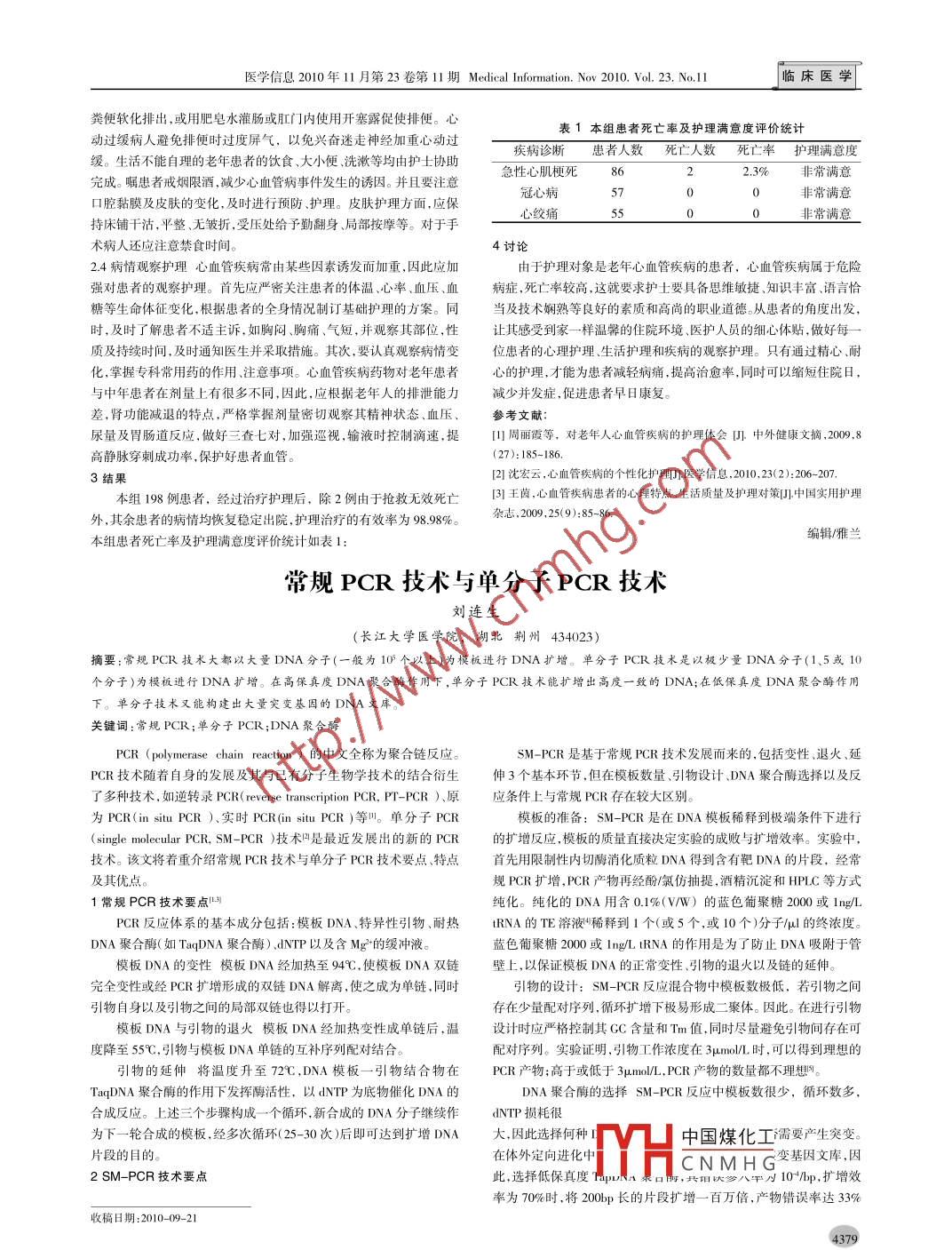 醫(yī)學(xué)信息2010年11月第23卷第11期Medical Information.Nov 2010. Vol. 23. No.11臨床醫(yī)學(xué)糞便軟化排出,或用肥皂水灌腸或肛門]內(nèi)使用開塞露促使排便。心表1本組患者死亡率及護(hù)理滿意度評(píng)價(jià)統(tǒng)計(jì)動(dòng)過緩病人避免排便時(shí)過度屏氣,以免興奮迷走神經(jīng)加重心動(dòng)過疾病診斷患者人數(shù)死亡人數(shù)死亡率 護(hù)理滿意度緩。生活不能自理的老年患者的飲食、大小便、洗漱等均由護(hù)士協(xié)助急性心肌梗死8非常滿意完成。囑患者戒姻限酒,減少心血管病事件發(fā)生的誘因。并且要注意冠心病50口腔黏膜及皮膚的變化,及時(shí)進(jìn)行預(yù)防、護(hù)理。皮膚護(hù)理方面,應(yīng)保心絞痛_5持床鋪干沽,平整、無皺折,受壓處給予勤翻身、局部按摩等。對(duì)于手術(shù)病人還應(yīng)注意禁食時(shí)間。4討論2.4病情觀察護(hù)理心血管疾病常由某些因索誘發(fā)而加重,因此應(yīng)加由于護(hù)理對(duì)象是老年心血管疾病的患者,心血管疾病屬于危險(xiǎn)強(qiáng)對(duì)患者的觀察護(hù)理。首先應(yīng)嚴(yán)密關(guān)注患者的體溫、心率.血壓.血病癥,死亡率較高,這就要求護(hù)士要具備思維敏捷知識(shí)豐富、語言恰糖等生命體征變化,根據(jù)患者的全身情況制訂基礎(chǔ)護(hù)理的方案。同當(dāng)及技術(shù)嫻熟等良好的素質(zhì)和高尚的職業(yè)道德。從患者的角度出發(fā),時(shí),及時(shí)了解患者不適主訴,如胸悶、胸痛、氣短.并觀察其部位,性讓其感受到家- -樣溫 馨的住院環(huán)境.醫(yī)護(hù)人員的細(xì)心體貼,做好每一質(zhì)及持續(xù)時(shí)間,及時(shí)通知醫(yī)生并采取措施。其次.要認(rèn)真觀察病情變位患:者的心理護(hù)理、生活護(hù)理和疾病的觀察護(hù)理。只有通過精心、耐化,掌握??瞥S盟幍淖饔?、注意事項(xiàng)。心血管疾病藥物對(duì)老年患者心的護(hù)理,才能為患者減輕病痛,提高治愈率,同時(shí)可以縮短住院日,與中年患者在劑量上有很多不同,因此,應(yīng)根據(jù)老年人的排泄能力減少并發(fā)癥,促進(jìn)患者早日康復(fù)。差,腎功能減退的特點(diǎn),嚴(yán)格學(xué)握劑量密切觀察其精神狀態(tài)、血壓、參考文獻(xiàn):尿量及胃腸道反應(yīng),做好三查七對(duì),加強(qiáng)巡視,輸液時(shí)控制滴速,提[周麗霞等,對(duì)老年人心血管疾病的護(hù)理體會(huì)田中外健康文摘,2009,8.高靜脈穿刺成功率,保護(hù)好患者血管。(27):185-186.3結(jié)果[2]沈宏云,心血管疾病的個(gè)性化護(hù)理D.醫(yī)學(xué)信息,2010,23(2):206-207.本組198例患者,經(jīng)過治療護(hù)理后,除2例由于搶救無效死亡[3]王茵,心血管疾病患者的心理特點(diǎn)、生活質(zhì)量及護(hù)理對(duì)策[J.中國實(shí)用護(hù)理外,其余患者的病情均恢復(fù)穩(wěn)定出院.護(hù)理治療的有效率為98.98%。雜志,2009, 25(9):85-86.編輯/雅蘭本組患者死亡率及護(hù)理滿意度評(píng)價(jià)統(tǒng)計(jì)如表1:常規(guī)PCR技術(shù)與單分子PCR技術(shù)劉連生(長江大學(xué)醫(yī)學(xué)院,湖北荊州434023)摘要:常規(guī)PCR技術(shù)大都以大量DNA分子(一般為10個(gè)以上)為模板進(jìn)行DNA擴(kuò)增。單分子PCR技術(shù)是以極少量DNA分子(1、5或10個(gè)分子)為模板進(jìn)行DNA擴(kuò)增。在高保真度DNA聚合酶作用下,單分子PCR技術(shù)能擴(kuò)增出高度一致的DNA;在低保真度DNA聚合酶作用下。單分子技術(shù)又能構(gòu)建出大量突變基因的DNA文庫。關(guān)鍵詞:常規(guī)PCR;單分子PCR;DNA聚合酶PCR (polymerase chain reaction )的中文全稱為聚合鏈反應(yīng)。SM-PCR是基于常規(guī)PCR技術(shù)發(fā)展而來的,包括變性、退火、延PCR技術(shù)隨著自身的發(fā)展及其與已有分子生物學(xué)技術(shù)的結(jié)合衍生伸3個(gè)基本環(huán)節(jié),但在模板數(shù)量、引物設(shè)計(jì).DNA聚合酶選擇以及反了多種技術(shù),如逆轉(zhuǎn)錄PCR( reverse tasription PCR, PT-PCR ).原應(yīng)條件上與常規(guī)PCR存在較大區(qū)別。為PCR(in situ PCR )實(shí)時(shí)PCR(in situ PCR )等川。單分子PCR模板的準(zhǔn)備:SM--PCR是在DNA模板稀釋到極端條件下進(jìn)行(single moleular PCR, SM-PCR )技術(shù)是最近發(fā)展出的新的PCR的擴(kuò) 增反應(yīng).模板的質(zhì)量直接決定實(shí)驗(yàn)的成敗與擴(kuò)增效率。實(shí)驗(yàn)中,技術(shù)。該文將著重介紹常規(guī)PCR技術(shù)與單分子PCR技術(shù)要點(diǎn)、特點(diǎn)首先用限制性內(nèi)切酶消化質(zhì)粒DNA得到含有靶DNA的片段,經(jīng)常及其優(yōu)點(diǎn)。規(guī)PCR擴(kuò)增,PCR產(chǎn)物再經(jīng)酚/氯仿抽提,酒精沉淀和HPLC等方式1常規(guī)PCR技術(shù)要點(diǎn)叫純化。純化的DNA用含0.1%(V/W)的藍(lán)色葡聚糖2000或1ng/LPCR反應(yīng)體系的基本成分包括:模板DNA、特異性引物、耐熱t(yī)RNA的TE溶液“稀釋到1個(gè)(或5個(gè),或10個(gè))分子/μl的終濃度。DNA聚合酶(如TaqDNA聚合酶)、dNTP以及含Mg*的緩沖液。藍(lán)色葡聚糖2000或Ing/LtRNA的作用是為了防止DNA吸附于管模板DNA的變性模板DNA經(jīng)加熱至94c,使模板DNA雙鏈壁上,以保證模板DNA的正常變性.引物的退火以及鏈的延伸。完全變性或經(jīng)PCR擴(kuò)增形成的雙鏈DNA解離,使之成為單鏈.同時(shí)引物的設(shè)計(jì): SM-PCR 反應(yīng)混合物中模