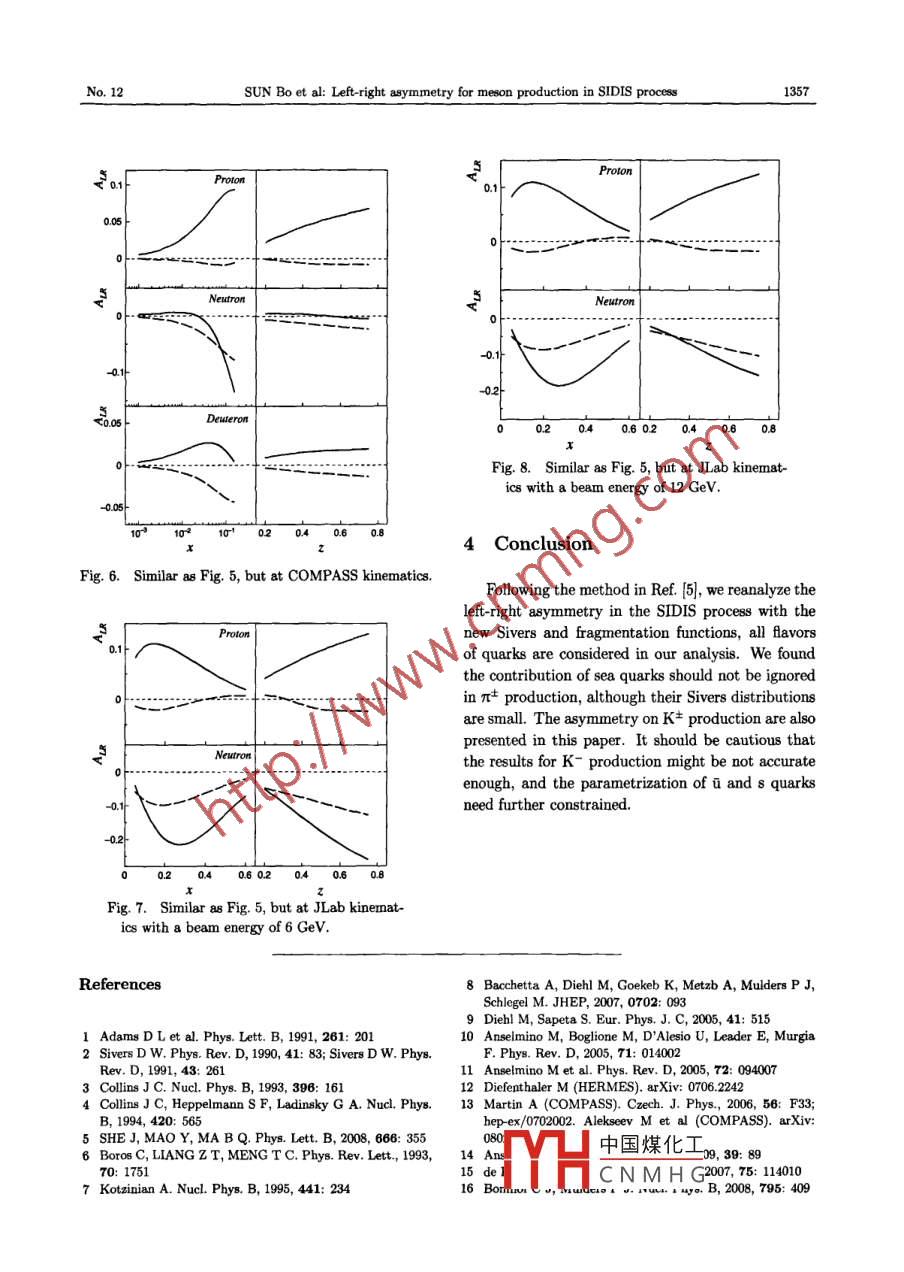 CPC(HEP & NP), 2009, 33(12): 1354- -1357Chinese Physics CVol. 33, No. 12, Dec., 2009Left-right asymmetry for meson production inSIDIS process'SUN Bo(孫博) SHE Jun(佘俊) ZHANG Bing(張冰) MAO Ya Jun(冒亞軍)) MA Bo-Qiang(馬伯強(qiáng))3)(School of Physics and State Key Laboratory of Nuclear Physics and Technology, Peking Univereity, Beijing 100871, China )Abstract We analyze the left- right asymmetry in the semi inclusive deep inelastic scattering (SIDIS) processusing a method where no weighting function are used. Considering all favor of quarks, we reanalyze the π*production and extend our calculation on the K* production. The predictions on HERMES, COMPASS andJLab kinematics with transversely polarized nucleon target are shown in this paper.Key words semi-inclusive deep inelastic scattering, transversity, left right asymmetryPACS 13.60.Le, 13.85.Ni, 13.87.Fh1 Introductionvarious weighting functions are used in most analy-sis. After multiplying the weighting function, we canIn 1991, the left -right asymmetry was reported byextract each efect separately. This is the conven-E704 collaboration for the first timel", where largetional way to deal with the SIDIS data. However, inasymmetry was found in p'p→πX process withRef.5, it was pointed out that the selection of the200 GeV transversely polarized beam. Their resultsweighting functions is based on a certain theory, thesuggest that the transverse spin effect is also signifi-“weighting function”method may change if the the-cant even in the high energy region. However, the the-ory changes. The authors suggested to analyze theory based on the naive parton model predicted a vani-SIDIS data using the method at the E704 experimentshing asymmetry. In order to explain these phenom-where no weighting functions were multiplied.As we know, there are other theory which try toena, two mechanisms were proposed. In 1991, Siversprovided a possible mechanism2 that the asymme-explain the lef-right asymmetry, e.g. the valencetry is originated from the quark intrinsic transversequark orbital angular moment effectio, but appar-momentum. This mechanism is now described by aently the weighting functions do not work in theseparton distribution function, the Sivers function; Intheories. Thus we think it is reasonable to adopt the1993, Collins provided another mechanism!3, 日thatno-weighting function method.In Ref. [5], only u and d quarks were consideredthe asymmetry is generated in the hadronization pro-cesses with a spin dependent fragmentation function,in the calculation, however, besides u and d quarks,the Collins function. Although these two mechanisms0 and d quarks are also favored in the fragmenta-are completely diferent, both of them contribute totion process to the π production, so the sea quarkscontribution especially for i and d should not be igthe asymmetry.Contrast to the complexity of the hadron-hadronnored. Considering all Aavors of quarks, we reanalyzecollision proces, we turn our attention to a muchthe πt production and then extend our calculation oncleaner and simpler process, the semi-inclusive deepthe K* production.inelastic scattering (SIDIS) process. Since the con-2 Theoretical descriptiontribution of the Sivers and Collins effects are com-bined during the interaction of high energy particles,On the theoretical side, we adopt the factorizationReceived 7 August 2009中國煤化工* Supported by National Natural Science Foundation of China (107.MYHCNMH Giv Grant PrierorChinese Ministry of Education (305001)1)E-mail: maoyj@pku.edu.cn2) E mail: mabq@phy.pku. edu.cn⑥2009 Chinese Physical Society and the Institute of High Energy Physics of the Chinese Academy of Sciences and the Instituteof Modern Physics of the Chinese Academy of Sciences and IOP Publishing LtdNo. 12.SUN Bo et al: Left-right agymmetry for meson production in SIDIS process1355theorem to describe the cross section. By introduc-0(1), but other terms such as the Collins efect areing various distribution or fragmentation functions,O(sin2 0).0 can be calculated byla!:we can express the cross section for an SIDIS pro-cess explicitly under the r' p framel7,8, in which thez axis is defined as the direction parallel to the ex-sin0=γ\1+r2,γ= 2xMp/Q. (5)changed virtual pboton. However, most of the ex-periment analysis were under the lp frame, i.e. theFor most instance, θ is very small, and the directionlaboratory frame, where z axis is defined as the di-of the virtual photon is very close to the direction ofrection parallel to the beam direction. In order tothe incident beam. That is: the Sivers effect is domi-compare with experiment, we need to transform thenant and other efects are suppressed in our analysis.crOss section from r°p frame to lp frame by a rota-And for convenience, the Collins effect which is nottion of angle 0, θ is the angle between the beam andknown so clearly yet is not considered in our analysis.the virtual photon. Thus the cross section is writtenThe asynmetry can be written as:asl!:drdydqdzdqhdPRLloAuv(r,y,z,Ph1)≈- s|d$fd中% (dosv + do.+....|dfdh douua2cos02s-1-mair0g x{F.D.]-(6)SrcosO; in( -的)F(臨D]-3 Numerical calculationsVI- sin'0sin',: M,ST cosθh.時(shí)+Before the numerical calculations, we need an in-√1- sin'0sin'φput for the distribution and fragmentation functions.The Sivers function has already been studied by+other terms > = dσv + dosiv +o+.+...,(1)HERMES and COMPASS Collaborations[10,川, butat that time, only the information of u and d quarkswhere we use a compact notation:could be extracted. Recently, besides the chargedFlwfD]= Sedp_dk_8(pr- kx-Pa1/2)pion production, neutral pion and charged kaon az-imuthal asymmetries were also analyzed by HER-w(pI,k)f*(x,pH)Df(,z2h2),(2)MES and COMPASS Collaboration[12, 13). Thanks tothese experiment, the parameters of the Sivers func-andtion were improved, and besides the u and d quarksthe Sivers function for the sea, quarks were extracted1-y- =y2n2h=Pr/|P%1| (3) for the first time