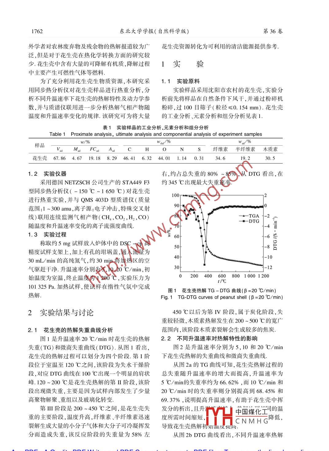 第36卷第12期東北大學(xué)學(xué)報(自然科學(xué)版)Vol 36. No 122015年12月Journal of Northeastern University( Natural ScienceDec.2015doi:10.3969/.isn.1005-3026.2015.12.020花生殼的熱重一質(zhì)譜分析及其反應(yīng)動力學(xué)姚錫文,許開立,閆放,王貝貝(東北大學(xué)資源與土木工程學(xué)院,遼寧沈陽108要:采用熱重-質(zhì)譜聯(lián)用(TG-MS)研究了氮氣氣氛中花生殼在不同升溫速率(5,10和20℃/min)下的熱解行為,分析得到了花生殼熱裂解過程產(chǎn)生的小分子氣相產(chǎn)物(CO2,CH4,H2,CO)隨溫度和升溫速率變化的釋放規(guī)律結(jié)果表明:花生殼熱裂解過程分為四個階段,升溫速率越大,花生殼熱解的失重溫度區(qū)間越寬,最大熱解速率峰越陡峭.應(yīng)用Fy-wall- Ozawa法得出花生殼熱裂解過程不同轉(zhuǎn)化率(0.2~0.8)下的活化能在57.3~88.6k/mol范圍內(nèi)結(jié)合 Achar微分法和 Coats- Redfern積分法確定了該反應(yīng)過程的機(jī)理函數(shù)表達(dá)式,將30種常用機(jī)理函數(shù)一一代入得出花生殼熱裂解機(jī)理的最概然函數(shù)為球形對稱的三維擴(kuò)散 Jander方程,反應(yīng)級數(shù)為2級關(guān)鍵詞:花生殼;熱解;熱重-質(zhì)譜;動力學(xué)分析中圖分類號:S216文獻(xiàn)標(biāo)志碼:A文章編號:1005-3026(2015)12-1761-0Thermogravimetric-Mass Spectrometry Analysis and PyrolysisKinetic of peanut shellYAO Xi-wen, XU Kai-li, YAN Famg, WANG Be i beiSchool of Resources Civil Engineering, Northeastern University, Shenyang 110819, China. Correspondingauthor:XUKai-li,E-mailkaili_xu@aliyun.com)Abstract: In the nitrogen atmosphere, simultaneous thermogravimetric-mass spectrometry( TGMS)was used to study the pyrolysis behavior of peanut shell at different heating rates(5, 10 and20 C/min), and with the change of temperature and heating rates, the release rule of smallmolecule gas(CO2, CH4, H,, Co )product was obtained by mass spectrometry analysis. Resultsshowed that four stages appeared during pyrolysis process of peanut shell. Moreover, the greaterthe heating rate, the wider the weightlessness temperature range, and the steeper the maximumpyrolysis rate peak. The activation energy of peanut shell under different weight loss rates(0.20. 8)ranged in 57 3-88. 6 kJ/mol by Flynn-Wall-Ozawa method. With Achar differentialmethod and the Coats-Redfern integral method, it could be determined that pyrolysis process ofpeanut shell accords with the Jander equation after calculating 30 kinds of common mechanismfunction one by one, the reaction mechanism was three-dimensional uniformly spherical diffusioncontrol. The reaction order was 2Key words: peanut shell pyrolysis; thermogravimetric-mass spectrometry; kinetics anal能源短缺與環(huán)境污染已然成為當(dāng)今世界必須被丟棄,造成花生殼資源的極大浪費.直面的兩大難題,作為一種可再生的清潔能源,生生物質(zhì)熱解氣化是農(nóng)林廢棄物向清潔燃?xì)廪D(zhuǎn)物質(zhì)能因其具有分布廣、產(chǎn)量大、可儲存、可再生、化的關(guān)鍵技術(shù),產(chǎn)生的合成氣可替代天然氣等化低灰分和碳循環(huán)等優(yōu)點而受到廣泛關(guān)注.花生是石燃料,實現(xiàn)燃?xì)?、熱能和電能的供給.熱解是我國的主要油料作物之一,大量剩余的花生殼除種高效的熱化學(xué)轉(zhuǎn)化技術(shù),生物質(zhì)通過熱解可了少部分被用作飼料、燃料、化工原料外,大部分以轉(zhuǎn)化為富氫氣中國煤化工,國內(nèi)CNMHG收稿日期:2014-11-06基金項目:農(nóng)業(yè)部農(nóng)村能源綜合建設(shè)資助項目(2014-28);遼寧省自然科學(xué)基金資助項目(2013020137)作者簡介:姚錫文(1987-),男,山東五蓮人,東北大學(xué)博士研究生;許開立(1965-),男,山東鄆城人,東北大學(xué)教授,博土生導(dǎo)師AcroPDF-A Quality PDF Writer and PDF Converter to create PDF files. To remove the line buy a license1762東北大學(xué)學(xué)報(自然科學(xué)版)外學(xué)者對農(nóng)林廢棄物及殘余物的熱解報道較為廣花生殼資源轉(zhuǎn)化為可利用的清潔能源提供參考.泛,但是對于花生殼在熱化學(xué)轉(zhuǎn)換方面的研究較少.花生殼中含有大量的可降解有機(jī)質(zhì)降解過程1實驗中主要產(chǎn)生可燃性氣體等燃料.為了充分利用花生殼生物質(zhì)資源,本研究采1.1實驗原料用同步熱分析儀對花生殼樣品進(jìn)行熱重分析,分實驗樣品采用沈陽市農(nóng)村的花生殼,實驗分析不同升溫速率下花生殼的熱解特性及動力學(xué)參析前先將樣品在自然條件下風(fēng)干,并通過粉碎機(jī)數(shù),并與質(zhì)譜儀聯(lián)用進(jìn)一步分析熱解氣相產(chǎn)物隨粉碎,過100目篩子(粒徑≤0.154mm).花生殼溫度和升溫速率變化的規(guī)律.該研究可為將大量的工業(yè)分析、元素分析和組分分析見表1表1實驗樣品的工業(yè)分析、元素分析和組分分析Table 1 Proximate analysis, ultimate analysis and componential analysis of experiment samples樣品纖維素半纖維素木質(zhì)素花生殼67.864.6719.188.2946.416.3244.011.140.3134.619.230.52實驗儀器右,約占總失重的80%~85%,從DTG看出,在采用德國 NETZSCH公司生產(chǎn)的STA449F3約345℃出現(xiàn)最大失重速率型同步熱分析儀(-150℃~1650℃)對花生殼進(jìn)行熱重實驗,并與QMS403D型質(zhì)譜儀(質(zhì)量范圍:1~300amu,離子源:電子沖擊,特殊交叉射線)聯(lián)用連續(xù)監(jiān)測氣相產(chǎn)物(CH4,CO2,H2,CO)+-TGA1-2-DTG隨溫度和升溫速率變化的離子流強(qiáng)度曲線1.3實驗過程稱取約5mg試樣放入爐體中的DSC-cp高50精度試樣支架上,加上有孔的坩堝蓋,通入流量為30