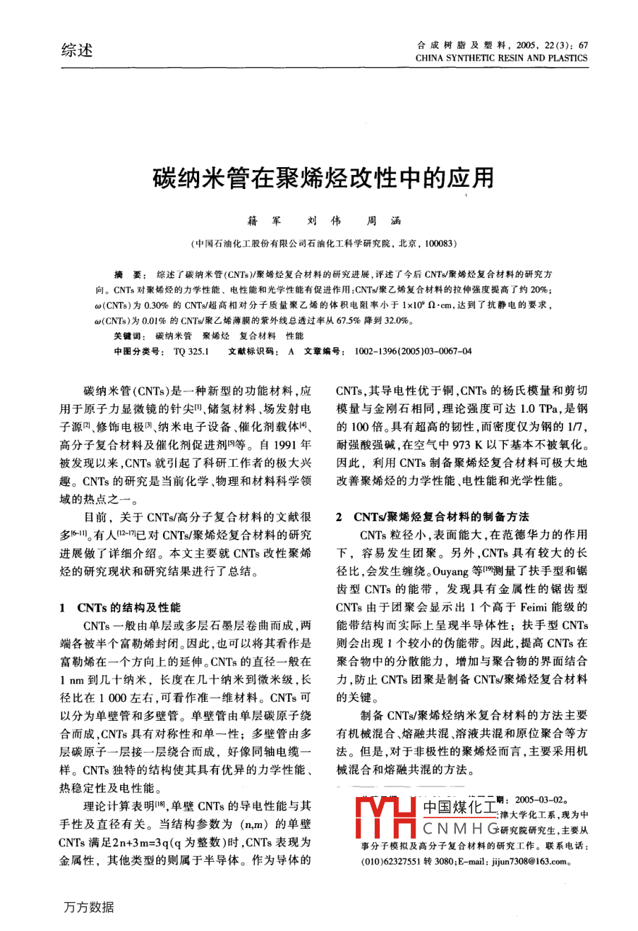 綜述合成樹脂及塑料,2005, 22(3): 67CHINA SYNTHETIC RESIN AND PLASTICS碳納米管在聚烯烴改性中的應用籍軍劉偉周涵(中國石油化工股份有限公司石油化工科學研究院,北京,10083)摘要:綜述了碳納米管(CNTs)/聚烯烴復合材料的研究進展,評述了今后CNTs/聚烯烴復合材料的研究方向。CNTs對聚烯烴的力學性能、電性能和光學性能有促進作用:CNTs/聚乙烯復合材料的拉伸強度提高了約20%;w(CNTs)為0.30%的CNT:/超高相對分子質量聚乙烯的體積電阻率小于1x10° ∩.cm,達到了抗靜電的要求,w(CNTs)為0.01%的CNTs/聚Z烯薄膜的紫外線總透過率從67.5%降到32.0%。關鍵詞:碳納米管 聚烯烴復合材料 性能中國分類號: TQ 325.1文獻標識碼: A文章編號: 1002-1396(2005 )03- 0067-04碳納米管(CNTs)是一種新型的功能材料,應CNTs,其導電性優(yōu)于銅,CNTs的楊氏模量和剪切.用于原子力顯微鏡的針尖凹.儲氫材料場發(fā)射電模量與金剛石相同,理論強度可達1.0 TPa,是鋼子源2、修飾電極凹納米電子設備、催化劑載體閣、的100倍。具有超高的韌性,而密度僅為鋼的1/7,高分子復合材料及催化劑促進劑9等。自1991年耐強酸強堿,在空氣中973K以下基本不被氧化。被發(fā)現以來,CNTs就引起了科研工作者的極大興因此,利用CNTs制備聚烯烴復合材料可極大地趣。CNTs的研究是當前化學、物理和材料科學領改善聚烯烴的力學性能、電性能和光學性能。域的熱點之一。目前,關于CNTs/高分子復合材料的文獻很2CNTs/聚烯烴復合材料的制備方法多1611。有人2-17已對CNTs/聚烯烴復合材料的研究CNTs粒徑小,表面能大,在范德華力的作用進展做了詳細介紹。本文主要就CNTs改性聚烯下,容易發(fā)生團聚。另外,CNTs具有較大的長烴的研究現狀和研究結果進行了總結。徑比,會發(fā)生纏繞。Ouyang等19測量了扶手型和鋸齒型CNTs的能帶,發(fā)現具有金屬性的鋸齒型1 CNTs 的結構及性能CNTs由于團聚會顯示出1個高于Feimi能級的CNTs一般由單層或多層石墨層卷曲而成,兩能帶結構而實際上呈現半導體性;扶手型CNTs端各被半個富勒烯封閉。因此,也可以將其看作是則會出現1個較小的偽能帶。因此,提高CNTs在富勒烯在一個方向上的延伸。CNTs的直徑一般在聚合物中的分散能力,增加與聚合物的界面結合1 nm到幾十納米,長度在幾十納米到微米級, 長力,防止CNTs團聚是制備CNTs/聚烯烴復合材料徑比在1 000左右,可看作準-維材料。CNTs 可的關鍵。以分為單壁管和多壁管。單壁管由單層碳原子繞制備CNTs/聚烯烴納米復合材料的方法主要合而成,CNTs具有對稱性和單一性;多壁管由多有機械混合、熔融共混、溶液共混和原位聚合等方層碳原子一層接一層繞合而成,好像同軸電纜一法。 但是,對于非極性的聚烯烴而言,主要采用機樣。CNTs獨特的結構使其具有優(yōu)異的力學性能、械混合和熔融共混的方法。熱穩(wěn)定性及電性能。理論計算表明舊,單壁CNTs的導電性能與其中國煤化工明: 2005-03-02。津大學化工系,現為中手性及直徑有關。當結構參數為(n,m) 的單壁CNTs滿足2n+3m=3q(q為整數)時,CNTs表現為FYHC N M H G研究院研究生,主要從事分子模擬及高分子復合材料的研究工作。聯系電話:金屬性,其他類型的則屬于半導體。作為導體的(010)62327551轉3080;E- mail: jun7308@163.com。.68.合成樹脂及塑料2005年第22卷2.1機械混合法混煉;最后,將混煉物切成小片擠出,并在PP的.機械混合法主要用研磨設備將CNTs和聚烯玻璃化轉變溫度(T)附近用熔融紡絲的方法制得烴混合而得到復合材料。胡平等啊通過球磨法制纖維。備了CNTs/超高相對分子質量聚乙烯(UHMWPE)狄澤超等叫將CNTs用氫氟酸和硝酸處理后,復合材料。UHMWPE為白色粉末,平均粒徑為兒與低密度聚乙烯在 180 C下混煉、造粒,制得了百微米。為了改善UHMWPE的塑性,先將自制的CNTs分散均勻的CNTs/聚乙烯(PE)復合材料。解CNTs與經過稀釋的分散偶聯劑混合,然后同孝林等129采用球磨共混和熔融共混相結合的方UHMWPE - -起放入三頭研磨機中研磨2h以上。法,制備了CNT/PP復合材料。其中,馬來酸酐接通過掃描電子顯微鏡(SEM)觀察表明,CNTs在枝苯乙烯-乙烯-丁烯-苯乙烯共聚物(MA- -SEBS)UHMWPE中分散良好,直徑在50~60 nm。還與手作為相容劑促進了CNTs在PP基體中的分散,形工混合、溶液超聲混合及磁力攪拌混合等方法進成了完善的逾滲網絡。行了比較,發(fā)現研磨法的分散效果最好。王琪等凹利用固相剪切的方法制備了CNTs/3CNTs對聚烯烴性能的影響聚烯烴復合粉體。將聚烯烴顆粒和CNTs在高速3.1力學性能攪拌器中均勻混合后送人固相剪切粉碎設備,重CNTs與聚合物大分子尺寸在同一數量級,可復碾磨多次,得到外觀均勻的CNTs/聚烯烴復合以近似看作--種剛性大分子。因此,作為增強材料粉體。該復合粉體通過熱壓成型可得到CNTs/聚對提高聚烯烴性能有著重要意義。烯烴復合材料。王琪等叫利用固相剪切的方法制備的CNTs/2.2熔融 共混法聚烯烴復合粉體,其拉伸強度和抗沖擊性能均得熔融共混法是將CNTs和聚烯烴混合后熔到了一-定的提高。同純PE相比,CNTs/PE復合材融,再制成各種復合材料。Kumar等四在雙螺桿擠料的拉伸強度提高了大約20%,沖擊強度提高了出機上制備了CNTs/聚丙烯(PP)復合材料。擠出15%-30%;而CNTs/PP復合材料的拉伸強度和沖機的各段溫度分別為150,200,220,240 C,螺桿擊強度比純PP分別提高了25%和20%。轉速為20 r/min。擠出物料經過淬火和真空干燥.胡平等網在測試CNTs/UHMWPE復合材料的后,