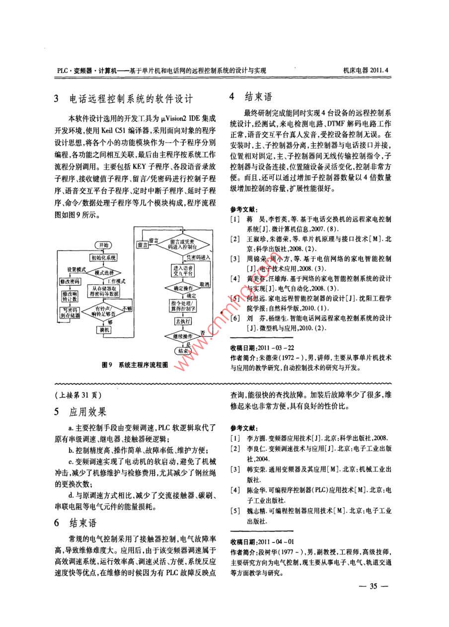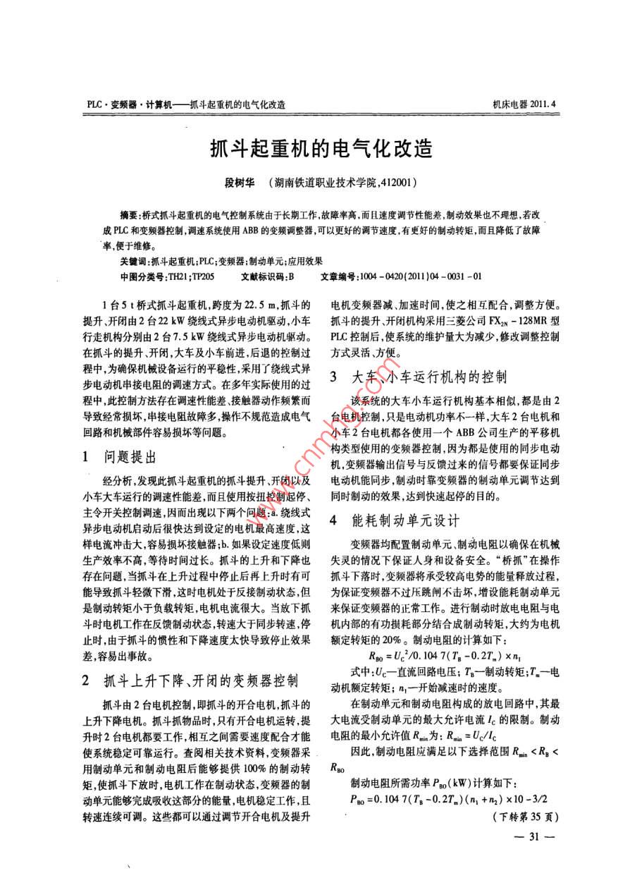 PLC.變頻器,計算機(jī)一抓斗起重機(jī)的電 氣化改造機(jī)床電器2011.4抓斗起重機(jī)的電氣化改造段樹華( 湖南鐵道職業(yè)技術(shù)學(xué)院,412001)摘要:橋式抓斗起重機(jī)的電氣控制系統(tǒng)由于長期工作,故障率高,而且速度調(diào)節(jié)性能差,制動效果也不理想,若改成PLC和變頻器控制,調(diào)速系統(tǒng)使用ABB的變頻調(diào)整器,可以更好的調(diào)節(jié)速度,有更好的制動轉(zhuǎn)矩,而且降低了故障率,便于維修。關(guān)鍵詞:抓斗起重機(jī);PLC;變頻器制動單元;應(yīng)用效果中圈分類號:TH21;TP205文獻(xiàn)標(biāo)識碼:B文章編號:1004 -0420(2011)04 -0031 -011臺5 t橋式抓斗起重機(jī),跨度為22.5 m,抓斗的電機(jī)變頻器減、加速時間,使之相互配合,調(diào)整方便。提升、開閉由2臺22 kW繞線式異步電動機(jī)驅(qū)動,小車抓斗的提升、開閉機(jī)構(gòu)采用三菱公司FX2N - 128MR型行走機(jī)構(gòu)分別由2臺7.5 kW繞線式異步電動機(jī)驅(qū)動。PLC控制后,使系統(tǒng)的維護(hù)量大為減少,修改調(diào)整控制在抓斗的提升、開閉,大車及小車前進(jìn),后退的控制過方式靈活方便。程中,為確保機(jī)械設(shè)備運行的平穩(wěn)性,采用了繞線式異3大車、小車運行機(jī)構(gòu)的控制步電動機(jī)串接電阻的調(diào)速方式。在多年實際使用的過程中,此控制方法存在調(diào)速性能差、接觸器動作頻繁而該系統(tǒng)的大車小車運行機(jī)構(gòu)基本相似,都是由2導(dǎo)致經(jīng)常損壞,串接電阻故障多,操作不規(guī)范造成電氣臺電機(jī)控制,只是電動機(jī)功率不一樣,大車2臺電機(jī)和回路和機(jī)械部件容易損壞等問題。小車2臺電機(jī)都各使用一個ABB公司生產(chǎn)的平移機(jī)構(gòu)類型使用的變頻器控制,因為都是使用的同步電動1問題提出機(jī),變頻器輸出信號與反饋過來的信號都要保證同步經(jīng)分析,發(fā)現(xiàn)此抓斗起重機(jī)的抓斗提升、開閉以及電動機(jī)能同步,制動時靠變頻器的制動單元調(diào)節(jié)達(dá)到小車大車運行的調(diào)速性能差,而且使用按扭控制起停、同時制動的效果,達(dá)到快速起停的目的。主令開關(guān)控制調(diào)速,因而出現(xiàn)以下兩個問題:a.繞線式4能耗制動單元設(shè)計異步電動機(jī)啟動后很快達(dá)到設(shè)定的電機(jī)最高速度,這樣電流沖擊大,容易損壞接觸器;b.如果設(shè)定速度低則變頻器均配置制動單元制動電阻以確保在機(jī)械生產(chǎn)效率不高,等待時間過長。抓斗的上升和下降也失靈的情況下保證人身和設(shè)備安全?!皹蜃ァ痹诓僮鞔嬖趩栴},當(dāng)抓斗在上升過程中停止后再上升時有可抓斗下落時,變頻器將承受較高電勢的能量釋放過程,能導(dǎo)致抓斗輕微下滑,這時電機(jī)處于反接制動狀態(tài),但為保證變頻器不過壓跳閘不擊壞,增設(shè)能耗制動單元是制動轉(zhuǎn)矩小于負(fù)載轉(zhuǎn)矩,電機(jī)電流很大。當(dāng)放下抓來保證變頻器的正常工作。進(jìn)行制動時放電電阻與電斗時電機(jī)工作在反饋制動狀態(tài),轉(zhuǎn)速大于同步轉(zhuǎn)速,停機(jī)內(nèi)部的有功損耗部分結(jié)合成制動轉(zhuǎn)矩,大約為電機(jī)止時,由于抓斗的慣性和下降速度太快導(dǎo)致停止效果額定轉(zhuǎn)矩的20%。制動電阻的計算如下:差,容易出事故。Rgo =Uz2/0.104 7(T。-0.27.) xn式中:Ue- -直流回路電壓; T。一制動轉(zhuǎn)矩;T.- -電2抓斗上升下降、開閉的變頻器控制動機(jī)額定轉(zhuǎn)矩; n,-開始減速時的速度。抓斗由2臺電機(jī)控制,即抓斗的開合電機(jī),抓斗的在制動單元和制動電阻構(gòu)成的放電回路中,其最上升下降電機(jī)。抓斗抓物品時,只有開合電機(jī)運轉(zhuǎn),提大電流受制動單元的最大允許電流Ic的限制。制動升時2臺電機(jī)都要工作,相互之間需要速度配合才能電阻的最小允許值Rmin為: Rmn = U/Ic使系統(tǒng)穩(wěn)定可靠運行。查閱相關(guān)技術(shù)資料,變頻器采因此,制動電阻應(yīng)滿足以下選擇范圍Rgim