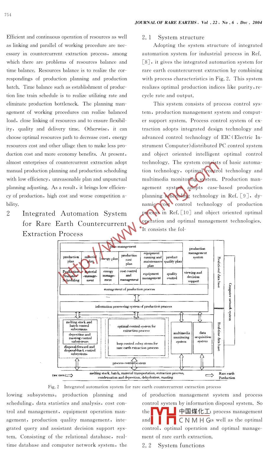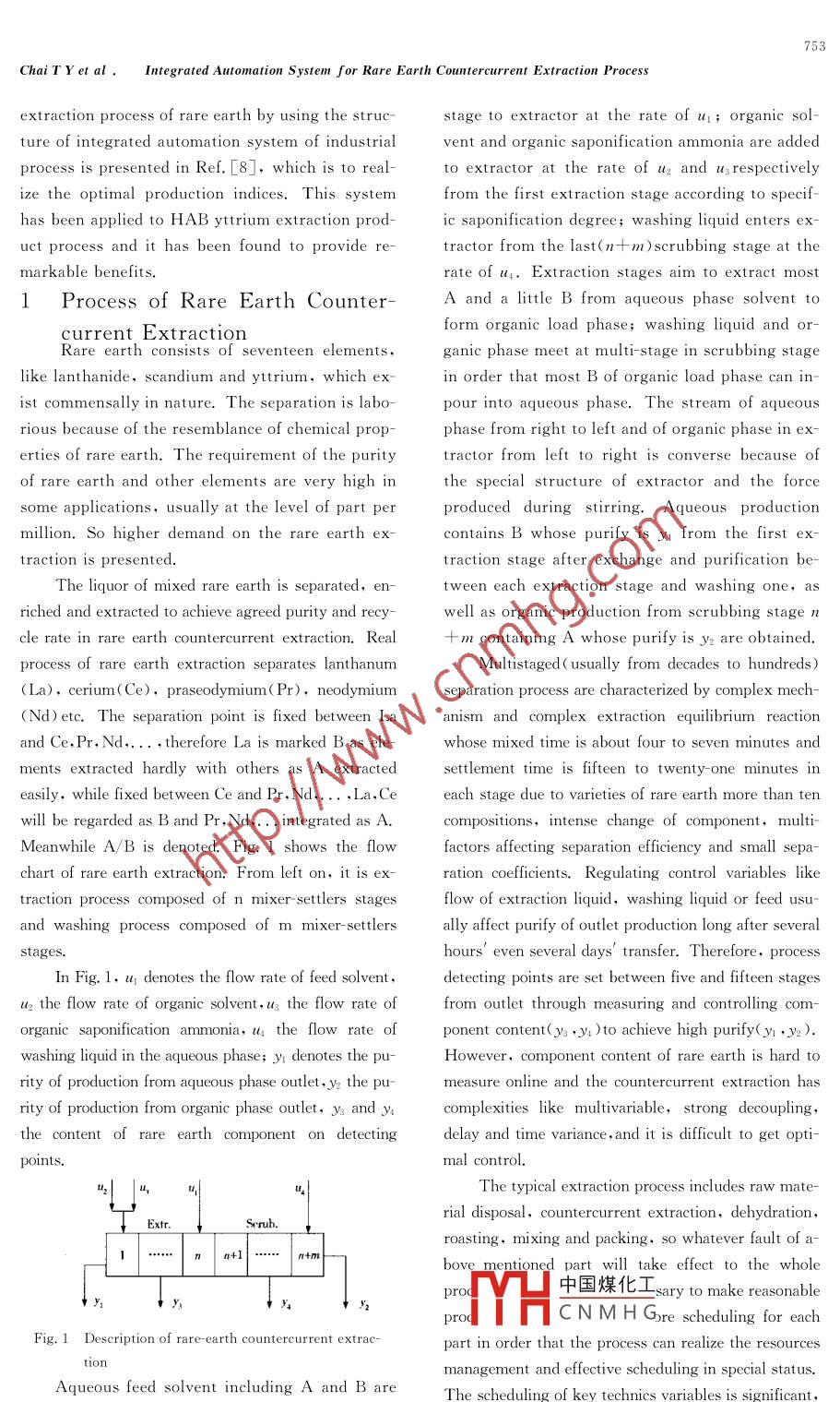JOURNAL OF RARE EARTHSVol .22,No.6, Dec. 2004,p.752 .Integrated Automation System for Rare Earth Countercurrent ExtractionProcessChai Tianyou( 柴天佑)1 , Yang Hui(楊輝)1.2.( 1. Research Center of Automation,Northeastern University, Shenyang 110004,China; 2. Schoolof E-lectronics and Electrical Engineering, East China J iaotong University, Nanchang 330013,China)Abstract: Lower automation level in industrial rare- earth extraction processes results in high productioncost, inconsistent product quality and great consumption of resources in China. An integrated automationsystem for extraction process of rare earth is proposed to realize optimal product indices, such as productpurity ,recycle rate and output. T he optimal control strategy for output component, structure and functionof the two-gradcd integrated automation system composed of the process management grade and thprocess control grade were discussed. This system is successfully applied toa HAB yttrium extraction pro-duction process and was found to provide optimal control, optimal operation, optimal management and re-markable benefits.Key words: countercurrent extraction; intelligent optimal control; integrated automation system; rare earthsCLC number: O614. 33Document code: AArticle ID: 1002 - 0721(2004 )06-0752 - 07.There are abundant rare earth resources in Chi-“Reduction of production cost,improvementna,which has the largest reserves and all kinds of va-of product quality, minimization of environmentalrieties. Rare earth researchers and operators in Chinaimpact and minimization of resources consumptionhave developed advanced rare earth extraction tech-can only be achieved by optimal design of all auto-niques'1] with the largest rare earth and capacity out-matic control facilities” has been pointed out input in the world since 1970' s thanks to the counter-Technology Road Map to Determine the Researchcurrent extraction theory. Efficient and consistent au-Priorities of the European Steel Industry-4]. Thetomatic production processes are in great need for theintegrated automation system of process industriescontinuous, large- scale and integrated rare earth pro-is the key to solve the above problems. The inte-duction. In France, Japan and the U. S. A.,automat-grated automation system is proposed in Ref. [5],ic measurement of material concentration,acidity andwhich consists of five grades: process control,flow rate in rare earth extraction process has been a-process optimization,production scheduling, erchieved as well as automatic control of material feed.terprise management and economic decision. TheAs a result steady product quality is achieved in Ref.control system of minerals processing consisting[2]. Automatic level of domestic equipments are gen-of three grades: process stabilization, process operally low, resting on off-line analysis, manual regu-timization and process management which is de-lation and experienced control that result in infficientveloped in Ref. [6]. The integrated automationproduction,high resource consumption, inconsistentsystem with three grades, Enterprise Resourceproduct qualities, which have become bottleneck ofPlanning ( ERP),Manufacturing Execution Syrare earth industry. Therefore, it is pointed out intem( MES) and Process Control System (PCS) isRef[3] that the technical target of the tenth “Five-given in Ref. [7]and has been successfully appliedYear Plan”of rare earth production is “the researchto Paishanlou Gold Mine of China. It has beenon new equipment and automatic control technique forfound to provide many benefits to this gold mine.high purity rare earth as well as on-line supervisoryAccording to the characteristics of productionsystem and automatic control technique for rare earthes manaoement of rare earth indus-中國(guó)煤化工。extraction".tryautomation system forReeived date: 2004-04- 20;revised date:2004-08 - 10MHCNMHGFoundation item: Project supported by the National Tenth Five Year Plan of Key Technology( 2002BA315A) , the National Key Fundamen-tal Research Program( 2002CB312201) ,and the National Natural Science Foundation of China( 5047 4020).Biography: Chai Tianyou( 1947-emician of Chinese Engineering Academy* Corespgesei易雅uor( E- mail: yhshuo@ 263. net)75ChaiTYet al .Integrated Automation System for Rare Earth Countercurrent Extraction Processextraction process of rare earth by using the struc-stage to extractor at the rate of u1; organic solture of integrated automation system of industrialvent and .organic saponification ammonia are addedprocess is presented in Ref.[8], which is to real-to extractor at the rate of u2 and us respectivelyize the optimal production indices. This systemfrom the first extraction stage according to specif-has been applied to HAB yttrium extraction prod-ic saponification degree; washing liquid enters exuct process and it has been found to provide re-tractor from the last(n+ m)scrubbing stage at themarkable benefits.rate of u4. Extraction stages aim to extract mostProcess of Rare Earth Counter-. A and a little B from aqueous phase solvent toform organic load phase; washing liquid and or-current. ExtractionRare earth consists of seventeen elements, .ganic phase meet at multi-stage in scrubbing stagelike lanthanide, scandium and yttrium,which ex .in order that most B of organic load phase can in-ist commensally in nature. The separation is labo-pour into aqueous phase. The stream of aqueousrious because of the resemblance of chemical prop-phase from right to left and of organic phase in ex-erties of rare earth. The requirement of the puritytractor from left to right is converse because ofof rare earth and other elements are very high inthe special structure of extractor and the forcesome applications, usually at the level of part perproduced during stirring. Aqueous productionmillion. So higher demand on the rare earth ex-contains B whose purify is y1 from the first extraction is presented.traction stage after exchange and purificat