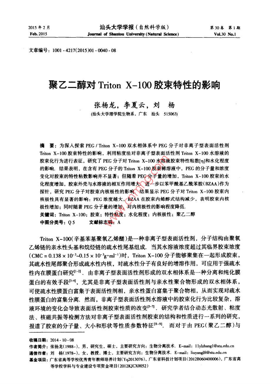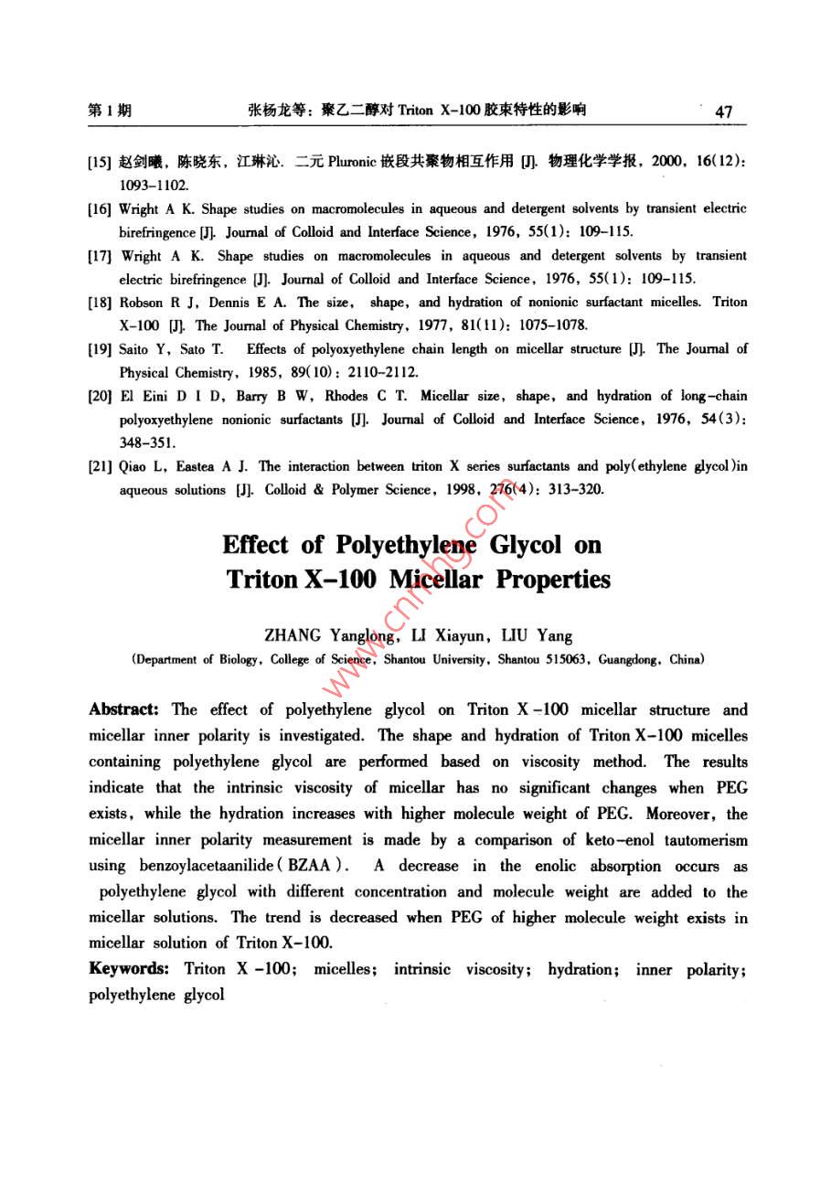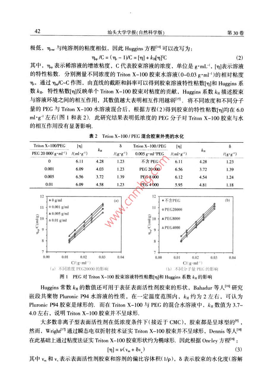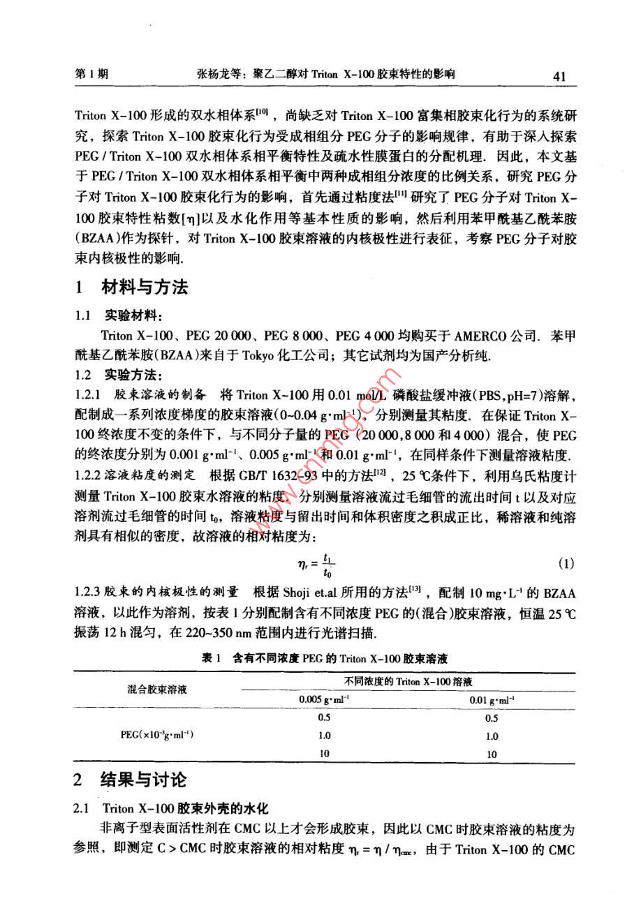 2015年2月汕頭大學(xué)學(xué)報(bào)(自然科學(xué)版)第30卷第1期Feb.2015Journal of Shantou Untversity(Natural Science)Vol 30 No. 1文章編號(hào):1001-4217(2015)01-0040-聚乙二醇對(duì) Triton X-100膠束特性的影響張楊龍,李夏云,劉楊(汕頭大學(xué)理學(xué)院生物系,廣東汕頭515063)摘要:為深入探索PEG/ Triton X-100雙水相體系中PEG分子對(duì)非離子型表面活性劑Triton X-100膠束特性的影響,利用粘度法對(duì)非離子型表面活性劑 Triton x-100水溶液的膠束化行為進(jìn)行表征,研究了PEG分子對(duì) Triton X-100水溶液膠束特性粘數(shù)q]和水化程度的影響.結(jié)果表明,在含有PEG分子的 Triton X-100膠束稀溶液中,PEG的分子量和濃度變化對(duì)膠束的特性粘數(shù)影響并不顯著;但隨著PEG分子量的增加, Triton X-100膠束的水化程度增加,膠束外殼與水溶液的相互作用增大.進(jìn)一步以苯甲?;阴1桨?BZA)作為探針,研究PEG分子對(duì)膠束內(nèi)核極性的影響.結(jié)果顯示PEG分子對(duì) Triton X-100膠束內(nèi)核極性具有顯著的影響:PEC濃度越大,BZA在膠束內(nèi)烯醇式結(jié)構(gòu)減少,表明膠束內(nèi)核極性增加;同時(shí)隨著PEG分子量的增加,對(duì)內(nèi)核極性的影響程度降低關(guān)鍵詞: Triton X-100;膠束;特性粘度;水化程度;內(nèi)核極性;聚乙二醇中圖分類號(hào):Q5文獻(xiàn)標(biāo)志碼:ATriton X-100(辛基苯基聚氧乙烯醚)是一種非離子型表面活性劑,分子結(jié)構(gòu)由聚氧乙烯鏈的親水性頭基和烷烴鏈的疏水性尾基組成.當(dāng)其水溶液濃度超過(guò)其臨界膠束濃度(CMC=0138×103-015×10gml-1)時(shí), Triton x-100分子能夠聚集在一起形成膠束其疏水性尾部聚合形成疏水性內(nèi)核,對(duì)疏水性分子有良好的增溶作用,可應(yīng)用于強(qiáng)疏水性內(nèi)在膜蛋白研究.由非離子型表面活性劑形成的雙水相體系是一種分離和純化膜蛋白的有效手段,尤其是非離子型表面活性劑與親水性聚合物形成的雙水相體系,可使疏水性膜蛋白富集于表面活性劑相,親水性蛋白富集于聚合物相,從而實(shí)現(xiàn)對(duì)疏水性膜蛋白的富集分離.然而,非離子型表面活性劑水溶液中的膠束化行為比較復(fù)雜,溶液環(huán)境的變化會(huì)導(dǎo)致表面活性劑膠束性質(zhì)的改變.研究學(xué)者結(jié)合動(dòng)態(tài)光散射、粘度法、核磁共振等檢測(cè)方法對(duì)非離子型表面活性劑膠束的結(jié)構(gòu)和性質(zhì)進(jìn)行一系列的研究,報(bào)道了膠束的分子量、大小和形狀等性質(zhì)參數(shù)特征-9.而對(duì)于由PEG(聚乙二醇)與收稿日期:2014-10-08作者簡(jiǎn)介:張楊龍(1988-),男,研究生,碩士,主要研究方向:生物分離技術(shù).E-mal:1lylzhangl@Pstu.edu.cn通信作者:劉楊(1978-),女,教授,博士,主要研究方向:生物分離技術(shù)E-mil:liuyanglft@stu.edu.cn基金項(xiàng)目:廣東省高等學(xué)校優(yōu)秀青年教師培養(yǎng)計(jì)劃(Yq2013076),廣東省科技計(jì)劃項(xiàng)目(2012B060000廣東省高等學(xué)校學(xué)科與專業(yè)建設(shè)專項(xiàng)資金項(xiàng)目(2012KJCX0052)第1期張楊龍等:聚乙二醇對(duì) Triton X-100膠束特性的影響Triton X-100形成的雙水相體系,尚缺乏對(duì) Triton x-100富集相膠束化行為的系統(tǒng)研究,探索 Triton X-100膠束化行為受成相組分PEG分子的影響規(guī)律,有助于深入探索PEG/ Triton x-100雙水相體系相平衡特性及疏水性膜蛋白的分配機(jī)理.因此,本文基于PEG/ Triton X-100雙水相體系相平衡中兩種成相組分濃度的比例關(guān)系,研究PEG分子對(duì) Triton x-100膠束化行為的影響,首先通過(guò)粘度法研究了PEG分子對(duì) Triton X100膠束特性粘數(shù)[q]以及水化作用等基本性質(zhì)的影響,然后利用苯甲酰基乙酰苯胺(BZAA)作為探針,對(duì) Triton X-100膠束溶液的內(nèi)核極性進(jìn)行表征,考察PEG分子對(duì)膠束內(nèi)核極性的影響1材料與方法11實(shí)驗(yàn)材料Triton X-100、PEG20000、PEG8000、PEG4000均購(gòu)買于 AMERCO公司.苯甲?;阴1桨?BZAA)來(lái)自于 Tokyo化工公司;其它試劑均為國(guó)產(chǎn)分析純12實(shí)驗(yàn)方法1.2.1膠束溶液的制備將 Triton X-100用0.01mol/L磷酸鹽緩沖液(PBS,pH=7)溶解,配制成一系列濃度梯度的膠束溶液(0-004gm-1),分別測(cè)量其粘度.在保證 Triton X100終濃度不變的條件下,與不同分子量的PEG(2000,.8000和4000)混合,使PEG的終濃度分別為001gml-1、0.005gml1和00lgml,在同樣條件下測(cè)量溶液粘度1.22溶液粘度的測(cè)定根據(jù)GB1632-93中的方法,25℃條件下,利用烏氏粘度計(jì)測(cè)量 Triton X-100膠束水溶液的粘度.分別測(cè)量溶液流過(guò)毛細(xì)管的流出時(shí)間t以及對(duì)應(yīng)溶劑流過(guò)毛細(xì)管的時(shí)間t,溶液粘度與留出時(shí)間和體積密度之積成正比,稀溶液和純?nèi)軇┚哂邢嗨频拿芏?故溶液的相對(duì)粘度為t(1)1.23膠柬的內(nèi)核極性的測(cè)量根據(jù) Shoji et al所用的方法,配制10mgL4的BZAA溶液,以此作為溶劑,按表1分別配制含有不同濃度PEG的(混合)膠束溶液,恒溫25℃振蕩12h混勻,在220-350nm范圍內(nèi)進(jìn)行光譜掃描.表1含有不同濃度PEG的 Triton X-100膠束溶液混合膠束溶液不同濃度的 Triton X-100溶液0.005 g"ml-0.01 gml0.5PEG(x10'g'ml2結(jié)果與討論2.1 Triton X-100膠束外殼的水化非離子型表面活性劑在CMC以上才會(huì)形成膠束,因此以CMC時(shí)膠束溶液的粘度為參照,即測(cè)定C>CMC時(shí)膠束溶液的相對(duì)粘度n=η/nm,由于 T