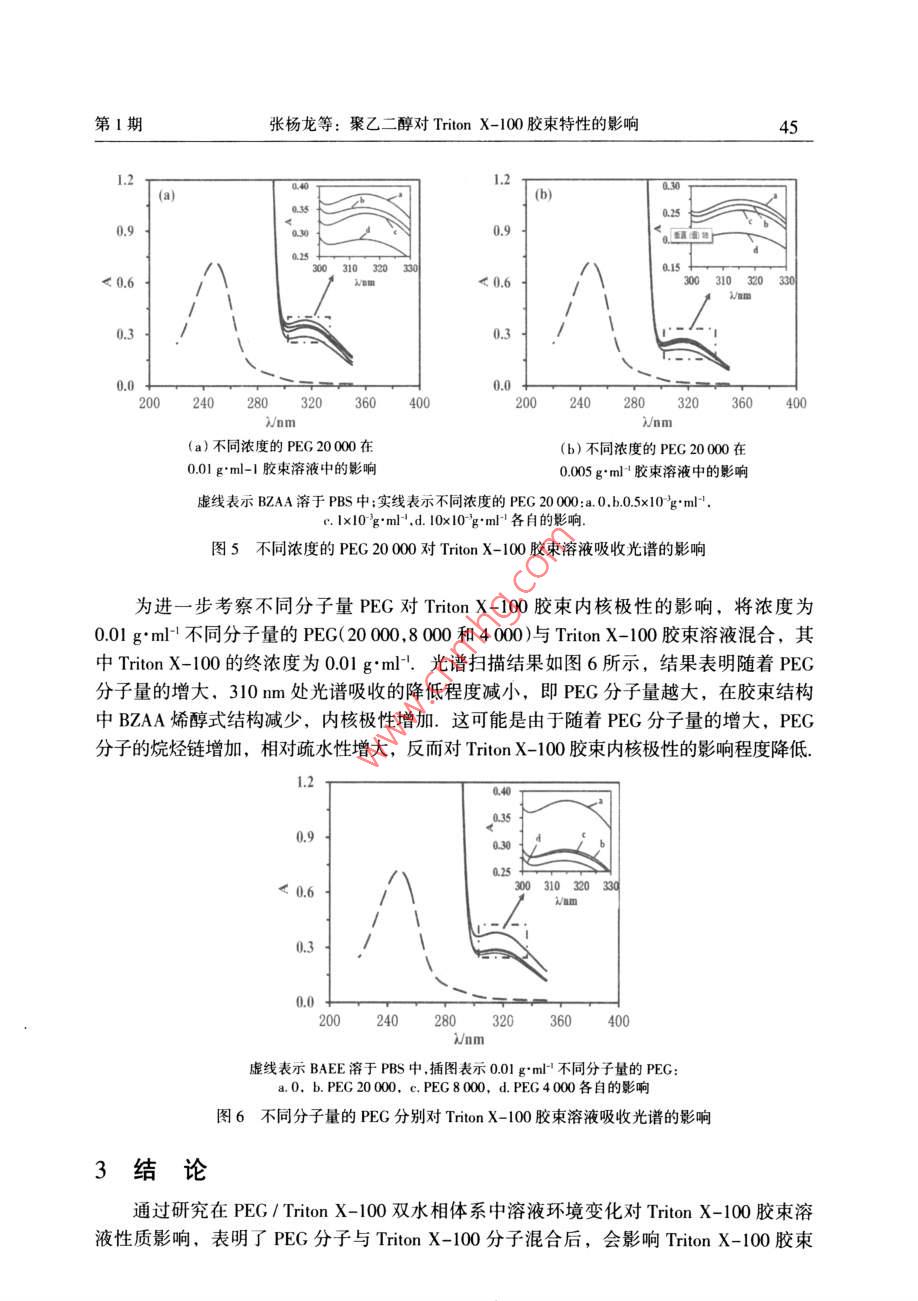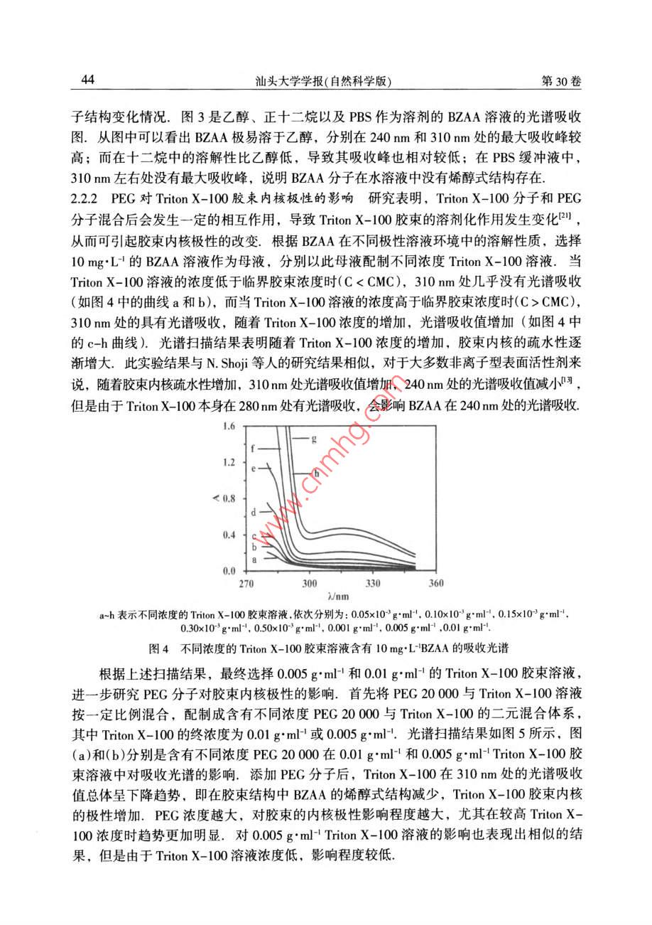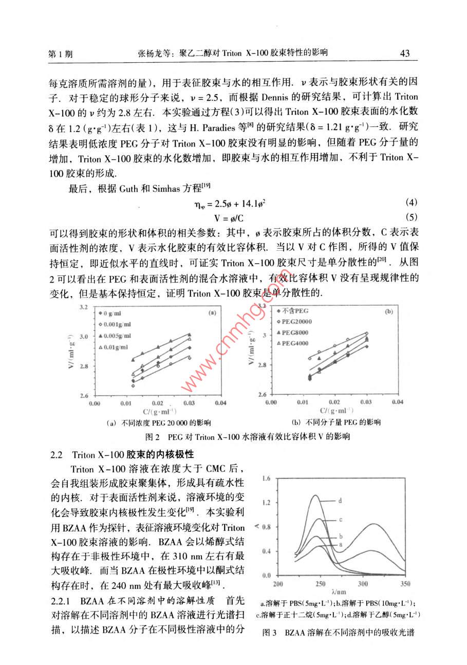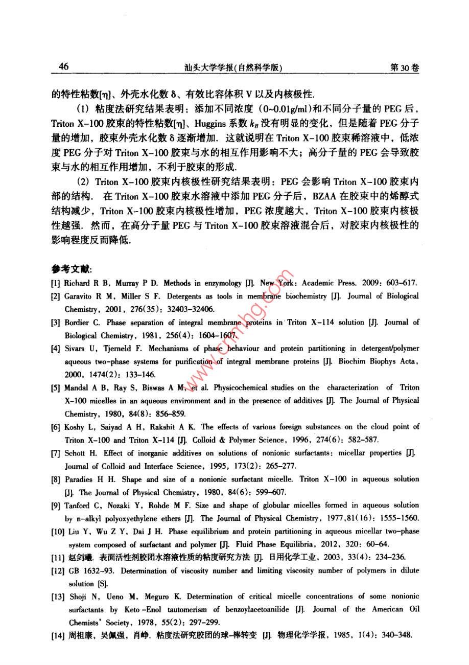 2015年2月汕頭大學(xué)學(xué)報(bào)(自然科學(xué)版)第30卷第1期Feb.2015Journal of Shantou Untversity(Natural Science)Vol 30 No. 1文章編號(hào):1001-4217(2015)01-0040-聚乙二醇對(duì) Triton X-100膠束特性的影響張楊龍,李夏云,劉楊(汕頭大學(xué)理學(xué)院生物系,廣東汕頭515063)摘要:為深入探索PEG/ Triton X-100雙水相體系中PEG分子對(duì)非離子型表面活性劑Triton X-100膠束特性的影響,利用粘度法對(duì)非離子型表面活性劑 Triton x-100水溶液的膠束化行為進(jìn)行表征,研究了PEG分子對(duì) Triton X-100水溶液膠束特性粘數(shù)q]和水化程度的影響.結(jié)果表明,在含有PEG分子的 Triton X-100膠束稀溶液中,PEG的分子量和濃度變化對(duì)膠束的特性粘數(shù)影響并不顯著;但隨著PEG分子量的增加, Triton X-100膠束的水化程度增加,膠束外殼與水溶液的相互作用增大.進(jìn)一步以苯甲?;阴1桨?BZA)作為探針,研究PEG分子對(duì)膠束內(nèi)核極性的影響.結(jié)果顯示PEG分子對(duì) Triton X-100膠束內(nèi)核極性具有顯著的影響:PEC濃度越大,BZA在膠束內(nèi)烯醇式結(jié)構(gòu)減少,表明膠束內(nèi)核極性增加;同時(shí)隨著PEG分子量的增加,對(duì)內(nèi)核極性的影響程度降低關(guān)鍵詞: Triton X-100;膠束;特性粘度;水化程度;內(nèi)核極性;聚乙二醇中圖分類號(hào):Q5文獻(xiàn)標(biāo)志碼:ATriton X-100(辛基苯基聚氧乙烯醚)是一種非離子型表面活性劑,分子結(jié)構(gòu)由聚氧乙烯鏈的親水性頭基和烷烴鏈的疏水性尾基組成.當(dāng)其水溶液濃度超過(guò)其臨界膠束濃度(CMC=0138×103-015×10gml-1)時(shí), Triton x-100分子能夠聚集在一起形成膠束其疏水性尾部聚合形成疏水性內(nèi)核,對(duì)疏水性分子有良好的增溶作用,可應(yīng)用于強(qiáng)疏水性內(nèi)在膜蛋白研究.由非離子型表面活性劑形成的雙水相體系是一種分離和純化膜蛋白的有效手段,尤其是非離子型表面活性劑與親水性聚合物形成的雙水相體系,可使疏水性膜蛋白富集于表面活性劑相,親水性蛋白富集于聚合物相,從而實(shí)現(xiàn)對(duì)疏水性膜蛋白的富集分離.然而,非離子型表面活性劑水溶液中的膠束化行為比較復(fù)雜,溶液環(huán)境的變化會(huì)導(dǎo)致表面活性劑膠束性質(zhì)的改變.研究學(xué)者結(jié)合動(dòng)態(tài)光散射、粘度法、核磁共振等檢測(cè)方法對(duì)非離子型表面活性劑膠束的結(jié)構(gòu)和性質(zhì)進(jìn)行一系列的研究,報(bào)道了膠束的分子量、大小和形狀等性質(zhì)參數(shù)特征-9.而對(duì)于由PEG(聚乙二醇)與收稿日期:2014-10-08作者簡(jiǎn)介:張楊龍(1988-),男,研究生,碩士,主要研究方向:生物分離技術(shù).E-mal:1lylzhangl@Pstu.edu.cn通信作者:劉楊(1978-),女,教授,博士,主要研究方向:生物分離技術(shù)E-mil:liuyanglft@stu.edu.cn基金項(xiàng)目:廣東省高等學(xué)校優(yōu)秀青年教師培養(yǎng)計(jì)劃(Yq2013076),廣東省科技計(jì)劃項(xiàng)目(2012B060000廣東省高等學(xué)校學(xué)科與專業(yè)建設(shè)專項(xiàng)資金項(xiàng)目(2012KJCX0052)第1期張楊龍等:聚乙二醇對(duì) Triton X-100膠束特性的影響Triton X-100形成的雙水相體系,尚缺乏對(duì) Triton x-100富集相膠束化行為的系統(tǒng)研究,探索 Triton X-100膠束化行為受成相組分PEG分子的影響規(guī)律,有助于深入探索PEG/ Triton x-100雙水相體系相平衡特性及疏水性膜蛋白的分配機(jī)理.因此,本文基于PEG/ Triton X-100雙水相體系相平衡中兩種成相組分濃度的比例關(guān)系,研究PEG分子對(duì) Triton x-100膠束化行為的影響,首先通過(guò)粘度法研究了PEG分子對(duì) Triton X100膠束特性粘數(shù)[q]以及水化作用等基本性質(zhì)的影響,然后利用苯甲酰基乙酰苯胺(BZAA)作為探針,對(duì) Triton X-100膠束溶液的內(nèi)核極性進(jìn)行表征,考察PEG分子對(duì)膠束內(nèi)核極性的影響1材料與方法11實(shí)驗(yàn)材料Triton X-100、PEG20000、PEG8000、PEG4000均購(gòu)買于 AMERCO公司.苯甲?;阴1桨?BZAA)來(lái)自于 Tokyo化工公司;其它試劑均為國(guó)產(chǎn)分析純12實(shí)驗(yàn)方法1.2.1膠束溶液的制備將 Triton X-100用0.01mol/L磷酸鹽緩沖液(PBS,pH=7)溶解,配制成一系列濃度梯度的膠束溶液(0-004gm-1),分別測(cè)量其粘度.在保證 Triton X100終濃度不變的條件下,與不同分子量的PEG(2000,.8000和4000)混合,使PEG的終濃度分別為001gml-1、0.005gml1和00lgml,在同樣條件下測(cè)量溶液粘度1.22溶液粘度的測(cè)定根據(jù)GB1632-93中的方法,25℃條件下,利用烏氏粘度計(jì)測(cè)量 Triton X-100膠束水溶液的粘度.分別測(cè)量溶液流過(guò)毛細(xì)管的流出時(shí)間t以及對(duì)應(yīng)溶劑流過(guò)毛細(xì)管的時(shí)間t,溶液粘度與留出時(shí)間和體積密度之積成正比,稀溶液和純?nèi)軇┚哂邢嗨频拿芏?故溶液的相對(duì)粘度為t(1)1.23膠柬的內(nèi)核極性的測(cè)量根據(jù) Shoji et al所用的方法,配制10mgL4的BZAA溶液,以此作為溶劑,按表1分別配制含有不同濃度PEG的(混合)膠束溶液,恒溫25℃振蕩12h混勻,在220-350nm范圍內(nèi)進(jìn)行光譜掃描.表1含有不同濃度PEG的 Triton X-100膠束溶液混合膠束溶液不同濃度的 Triton X-100溶液0.005 g"ml-0.01 gml0.5PEG(x10'g'ml2結(jié)果與討論2.1 Triton X-100膠束外殼的水化非離子型表面活性劑在CMC以上才會(huì)形成膠束,因此以CMC時(shí)膠束溶液的粘度為參照,即測(cè)定C>CMC時(shí)膠束溶液的相對(duì)粘度n=η/nm,由于 T