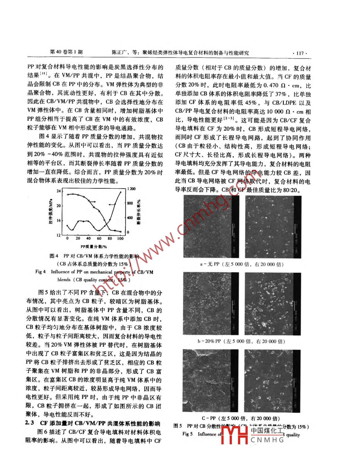 第40卷第1期塑料工業(yè)2012年1月CHINA PLASTICS INDUSTRY115·聚烯烴類彈性體導電復合材料的制備與性能研究陳正廣,周濤,武建勛,夏利平,惠江濤,李林,張愛民(高分子材料工程國家重點實驗室,四川大學高分子研究所,四川成都610065)摘要:將炭黑(CB)和碳纖維(CF)導電粒子加入到新型聚丙烯彈性體( Vistamaxx)與聚丙烯(PP)基體樹脂中,共混制備導電復合材料。通過體積電阻率測試、力學性能測試和加工流變性能測試,得到了體積電阻率最低為047·cm,拉伸強度為66MPa,斷裂伸長率為250%,具有良好加工性能的導電復合材料。關鍵詞:炭黑;碳纖維;石墨;新型聚丙烯彈性體;導電復合材料中圖分類號:TQ325.14文獻標識碼:A文章編號:1005-5770(2012)01-0115-04Study on Reparation and Properties of Polyolefin Elastomeric Conductive CompositesCHEN Zheng"guang, ZHOU Tao, WU Jian-xun, XIA Li-ping, HUl Jiang-tao, LI Lin, ZHANG Ai-minState Key Laboratory of Polymer Materials Engineering, Polymer Research Institute of SichuanUniversity, Chengdu 610065, China)Abstract: By adding the carbon black (CB)and carbon fiber( CF)conductive particles into the newpolypropylene elastomer Vistamaxx) and polypropylene( PP) matrix resin blend, a conductivewas prepared. Through the volume resistivity test, mechanical test, processing rheology test, we can get theconductive composite with the low volume resistivity of 0. 47 n. cm, the tensile strength of 6. 6 MPa, elongation at break of 250%, and good processing propertiesKeywords: Carbon Black; Carbon Fiber; Graphite; New polypropylene Elastomer; Conductive Composite高分子導電復合材料是導電材料研究的一個重要1實驗部分分支,現(xiàn)已廣泛應用于電子領域和電磁屏蔽等領1.1主要原料及試劑域。目前高分子導電復合材料基體材料主要有新型聚丙烯彈性體: Vistamaxx6202,美國??松璓E、PP、PTFE、 SEBS/PP和EPDM/PP等,常用的美孚化工公司;聚丙烯:K8303,中石化燕山石化;導電填料有導電炭黑(CB),碳纖維(CF)和石墨炭黑、碳纖維、石墨、抗氧劑等試劑:市售。(GP)等26。由這些材料制備的導電復合材料在某12實驗儀器及設備些方面存在缺陷,例如由PE和PP為基材制備的導微機控制電子萬能試驗機:CMT4104,深圳市新電復合材料機械性能比較差; SEBS/PP和 EPDM/PP三思材料檢測有限公司;高阻計:ZC36,上海精密類的導電復合材料高溫流動性較差;PTFE類的加工科學儀器有限公司第六電表廠;程控絕緣電阻測試工序比較復雜,加工性能需要進一步改善,而且成本儀:YD980A,常州揚子電子有限公司;四探針電阻較高。新型聚丙烯彈性體( Vistamaxx,縮寫為M,測試儀(配R48#號針頭):SDY-4,廣州半導體材料下同)采用茂金屬作引發(fā)劑,加入少量的乙烯單體研究所;高壓毛細管流變儀: Rosand RH7D以無規(guī)的方式插入聚丙烯主鏈中,破壞了丙烯鏈段的 BOHLIN儀器公司;掃描電子顯微鏡(SEM):JSM結(jié)晶,而使其具有優(yōu)良的彈性,可有效改善PP導電5900LV,日本日立公司。復合材料韌性較差的缺點,同時還有較好的力學強13樣品制備度。本文首次利用VM/PP為基體材料,加人導電粒首先將抗氧劑加入到基體樹脂中,在雙輥筒煉塑子CB/CF通過共混制得了導電性能優(yōu)良,力學強度機上開煉使其塑化(其中ⅤM樹脂塑煉溫度為80℃,和加工性較好的導電復合材料。塑煉時間為3min;含P樹脂的塑爍溫度為170℃,教育部新世紀優(yōu)秀人才支持計劃”基金支持(NCET0840368)*聯(lián)系人中國煤化工作者簡介:陳正廣,男,1986年,研究生,主要從事塑料合成與改性的研究。. yHCNMHG116塑料工業(yè)2012年塑煉時間為5min);然后加入CB、CF、GP,繼續(xù)混積電阻率為0.64·cm的高導電復合材料。煉,待各種填料混合均勻后取出;最后將混煉好的物圖2是采用高壓毛細管流變儀測得的不同導電填料在半自動壓力成型機上于180℃溫度下壓制成型,料體系的流變曲線,填料添加量(占體系總質(zhì)量)制樣后進行各種性能測試。均為50%。從圖中可以看出,相對于純VM體系抗氧劑CB、CF、GP填充體系的熔體黏度增大,且CFVM和GP/VM體系黏度的剪切速率敏感性規(guī)律與純VM基本一致。而樹脂雙輥塑化雙輥混煉一壓制成型CB填充體系的黏度對剪切速率具有較高的敏感性1.4性能測試與表征表現(xiàn)為在低剪切速率區(qū)相對于GP和CF體系要高很拉伸性能按照GB/T1040-200進行測試,載荷多,但在高剪切速率區(qū)與CP和CF體系幾乎相等。為500N,拉伸速率為200mm/min;導電性能測試:這可能是由于在高填充量下CB粒子容易團聚,在受體積電阻率超過10g·cm的樣品采用ZC36型高阻到高剪切速率作用時,團聚體被拆散導致CB填充體計測量體積電阻率;對于體積電阻率低于102·cm系的黏度對剪切速率具有較高的敏感性。的樣品采用SDY4型四探針測試儀測量體積電阻率;1000對于體積電阻率在102~100g·cm之間的樣品,用YD9820A型程控絕緣電阻測試儀測量其電阻率;流e變性能實驗在雙管型高壓毛細管流變儀上進行,口模直徑為1mm,長徑比為16,實驗溫度為200℃;掃描電子顯微鏡(SEM):掃描電壓為20kⅤ。2結(jié)果與討論剪切遠率mada121不同導電填料與VM共混體系導電與加工性能圖2不同填料對復合材料黏度的影響(填料添加量為50%)的比較Fig 2 Influence of different fillers on shear viscosity ofcomposites(filling quality content: 50%)2.2PP對CB/VM共混體系導電與加工性能的影響100102030405060填料質(zhì)量分數(shù)圖1不同填料對復合材料導電性能的影響020406080100Fig 1 Influence of different fillings on conductivity of compositesP質(zhì)量分數(shù)圖1給出了不同種類導電