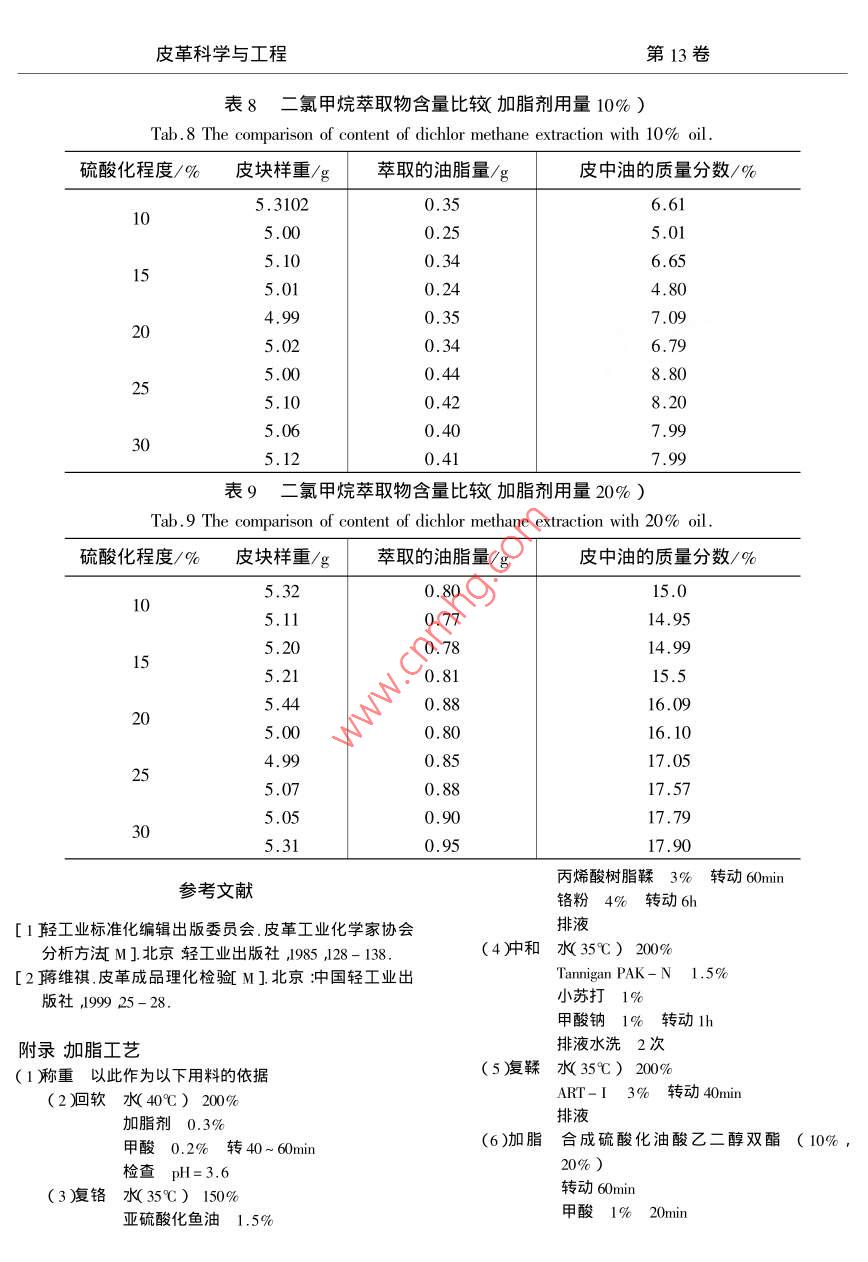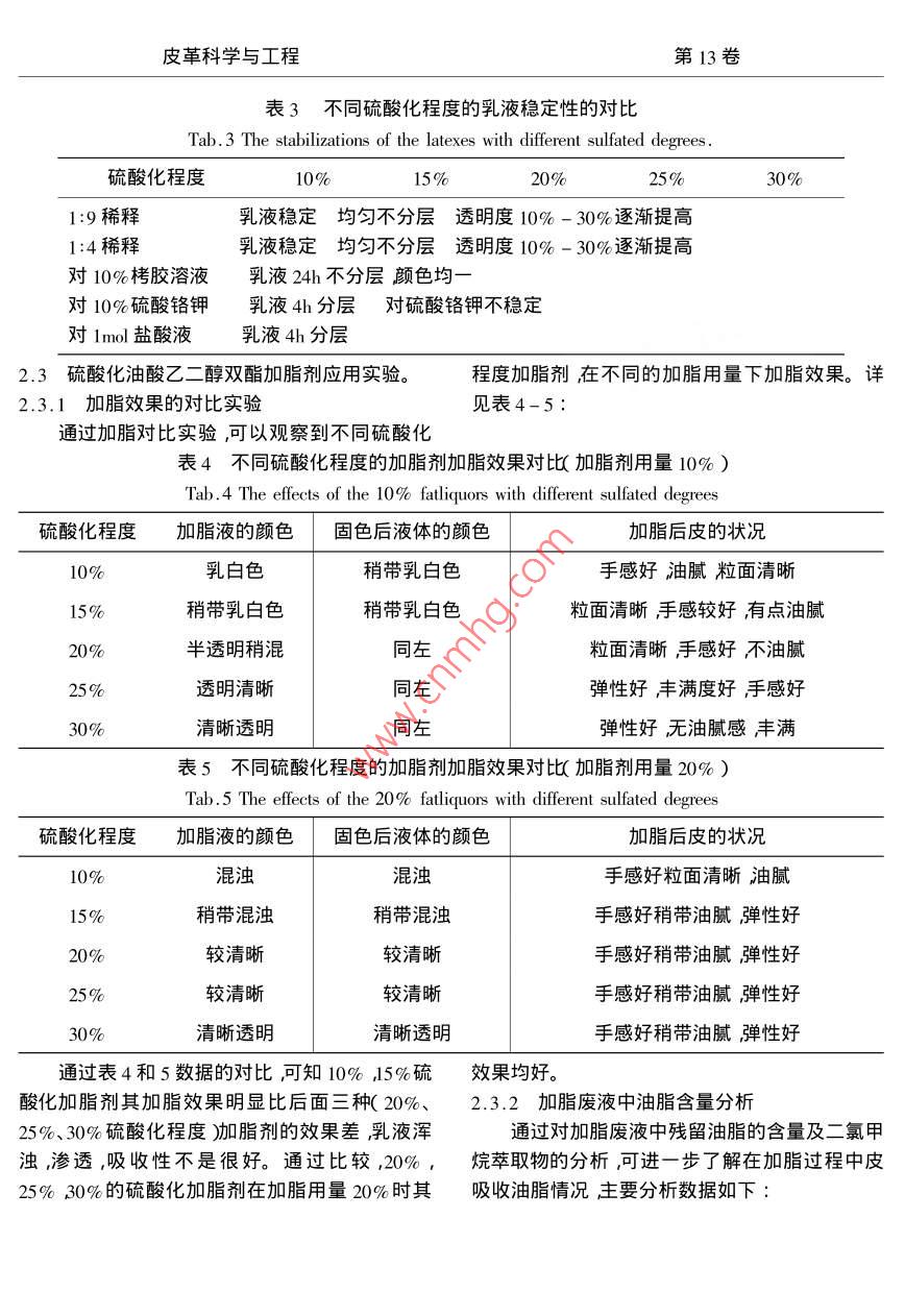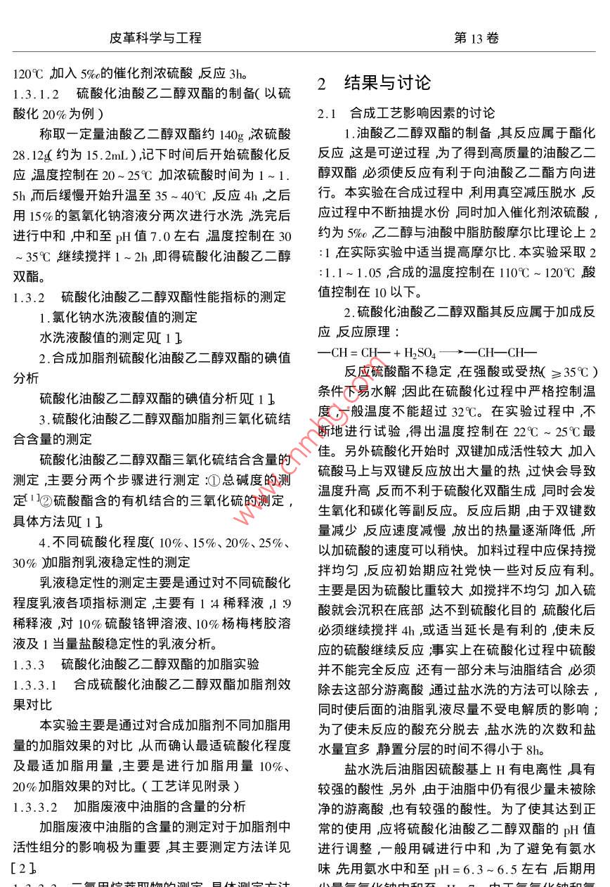 第13卷第3期皮革科學與工程Vol 13 No. 32003年6月LEATHER SCIENCE AND ENGINEERINGJun.2003文章編號:004-796(200303-011-06油酸乙二醇雙酯的硫酸化研究周華龍陳家麗毛耀東錢峰皮革化學與工程教育部重點實驗室(四川大學)四川成都610065)摘要用工業(yè)油酸和乙二醇經(jīng)過酯化后用濃硫酸對其進行硫酸化合成硫酸化油酸乙二醇雙酯的陰離子型加脂劑。分別合成了不同硫酸化10%、15%、20%25%、30%程度的加脂劑進行了性能指標和其在加脂過程中的對比實驗分析了其活性組分和對加脂效果的影響。關鍵詞油脂流酸化加脂劑中圖分類號TS529文獻標識碼Study of the Sulfated Diesters of Deicacid-glycolZHOU Hua - long ChEN Jia-li ,Ao Yao-dong QIAN FengKey Laboratory of Leather Chemistry and EngineeringSichuan University ) Ministry of Education, Chengdu 610065, China)Abstract Sulfated diesters as anionic fatliquoring was synthesized which was esterified by the in-dustrial oleic acid and glycol then sulfated by vitriol oil. The diesters with a series of sulfated degree, such as10%,15%,20%,25%,30%ompared on physical characteristic and effect of fatliquoring. Meanwhile the effects of activity components on the fat liquoring were analyzedKey words stuff sulfated fatliquoring有關硫酸化加脂劑的合成技術已經(jīng)是非常成能進行討論的熟的但是主要集中在天然油脂的研究方面如蓖麻油和菜油的硫酸化是最常見的其次是合成脂1實驗肪酸甲臘酯汋硫酸化。而脂肪酸雙酯的硫酸化1.1主要實驗材料的利用并不多見因為它主要用于加脂劑的調配。乙二醇(CP)油酸(酸值185,碘值90)目前作為油脂副產品——脂肪酸產量的大幅度(CP濃硫酸(qP氨水(CP),氫氧化鈉(濃度的增加對利用脂肪酸酯深度加工并開發(fā)性能更30%)自配豐富的產品是非常有利的。本文就是針對油酸乙1.2主要儀器設備二醇雙釀又稱油酸乙二酯進行硫酸化和相關性溫控儀WMZK-01)真空泵SHB-Ⅲ)攪拌器(D-971)電加熱BXHW)1.3實驗方法1.3.1硫酸化油的制備收稿日期2003-03-251.3.1.1油酸乙二醇雙酯的制備基金項目四川省重點攻關項目頂目編號m2GY0-046油酸乙二醇雙酯制備的主要原料是油酸和乙第一作者簡介凋華龍男1956年生副教授主要從事皮革科學與工程第13卷120℃加入5%的催化劑濃硫酸反應3h1.3.1.2硫酸化油酸乙二醇雙酯的制備(以硫2結果與討論酸化20%為例)2.1合成工藝影響因素的討論稱取一定量油酸乙二醇雙酯約140g濃硫酸1.油酸乙二醇雙酯的制備其反應屬于酯化28.12g約為152mL),記下時間后開始硫酸化反反應這是可逆過程為了得到高質量的油酸乙二應溫度控制在20~25℃加濃硫酸時間為1~1.醇雙酯必須使反應有利于向油酸乙二酯方向進5h而后緩慢開始升溫至35-40℃反應4h之后行。本實驗在合成過程中利用真空減壓脫水反用15%的氬氧化鈉溶液分兩次進行水洗洗完后應過程中不斷抽提水份同時加入催化劑濃硫酸進行中和中和至pH值7.0左右溫度控制在30約為%乙二醇與油酸中脂肪酸摩爾比理論上235℃繼續(xù)攪拌1~2h即得硫酸化油酸乙二醇1在實際實驗中適當提高摩爾比.本實驗采取2雙酯1.1~1.05合成的溫度控制在110℃~120℃酸1.3.2硫酸化油酸乙二醇雙酯性能指標的測定值控制在10以下。1.氯化鈉水洗液酸值的測定2.硫酸化油酸乙二醇雙酯其反應屬于加成反水洗液酸值的測定11應反應原理2.合成加脂劑硫酸化油酸乙二醇雙酯的碘值一CH=CH—+HSOCH-CH-分析反應硫酸酯不穩(wěn)定在強酸或受熱(≥35℃)硫酸化油酸乙二醇雙酯的碘值分析見1條件下易水解因此在硫酸化過程中嚴格控制溫3硫酸化油酸乙二醇雙酯加脂劑三氧化硫結度,般溫度不能超過32℃。在實驗過程中不合含量的測定斷地進行試驗,得出溫度控制在22℃~25℃最硫酸化油酸乙二醇雙酯三氧化硫結合含量的。另外硫酸化開始時雙鍵加成活性較大加入測定主要分兩個步驟進行測定:①總堿度的測硫酸馬上與雙鍵反應放出大量的熱過快會導致定1②硫酸酯含的有機結合的三氧化硫的測定,溫度升高反而不利于硫酸化雙酯生成同時會發(fā)生氧化和碳化等副反應。反應后期由于雙鍵數(shù)具體方法見11量減少反應速度減慢放岀的熱量逐漸降低所4不同硫酸化程度(10%、15%、20%、25%、以加硫酸的速度可以稍快。加料過程中應保持攪0%加脂劑乳液穩(wěn)定性的測定拌均勻,反應初始期應社黨快一些對反應有利。乳液穩(wěn)定性的測定主要是通過對不同硫酸化主要是因為硫酸比重較大如攪拌不均勻加入硫程度乳液各項指標測定主要有14稀釋液n9酸就會沉積在底部達不到硫酸化目的硫酸化后稀釋液對10%硫酸鉻鉀溶液、10%楊梅栲膠溶必須繼續(xù)攪拌4或適當延長是有利的使未反液及1當量鹽酸穩(wěn)定性的乳液分析。應的硫酸繼續(xù)反應事實上在硫酸化過程中硫酸1.3.3硫酸化油酸乙二醇雙酯的加脂實驗并不能完全反應還有一部分未與油脂結合必須1.3.3.,1合成硫酸化油酸乙二醇雙酯加脂劑效除去這部分游離酸通過鹽水洗的方法可以除去,果對比同時使后面的油脂乳液盡量不受電解質的影響本實驗主要是通過對合成加脂劑不同加脂用為了使未反應的酸充分脫去鹽水洗的次數(shù)和鹽量的加脂效果的對比從而確認最適硫酸化程度水量宜多靜置分層的時間不得小于8h及最適加脂用量,主要是進行加脂用量10%、鹽水洗后油脂因硫酸基上H有電離性具有20%加脂效果的對比。(工藝詳見附錄)較強的酸性另外由于油脂中仍有很少量未被除1.3.3.2加脂廢液中油脂的含量的分