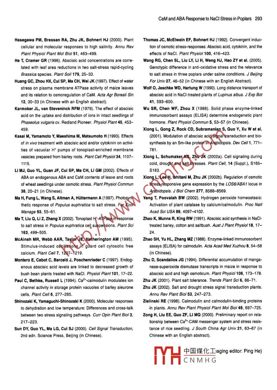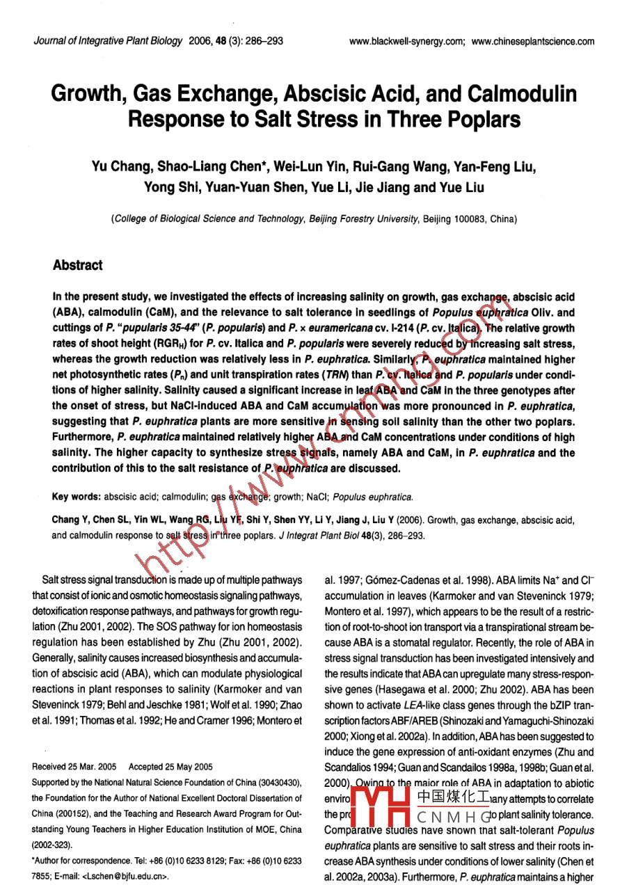 Joumal of Integrative Plant Biology 2006, 48(3): 286-293www.blackwell-synergy.com;www.chineseplantscience.comGrowth Gas Exchange Abscisic Acid and calmodulinResponse to Salt Stress in Three PoplarsYu Chang, Shao-Liang Chen*, Wei-Lun Yin, Rui-Gang Wang, Yan-Feng Liu,Yong Shi, Yuan- Yuan Shen, Yue Li, Jie Jiang and Yue Liu(College of Biological Science and Technology, Beijing Forestry University, Beijing 100083, China)AbstractIn the present study, we investigated the effects of increasing salinity on growth, gas exchange, abscisic acid(ABA), calmodulin(CaM), and the relevance to salt tolerance in seedlings of populus euphratica oliv. andcuttings of P,"pupularis 35-44"(P. popularis)and P. x euramericana cv. I-214(P. cV. Italica). The relative growthrates of shoot height(RGRH)for P. CV. Italica and P. popularis were severely reduced by increasing salt stress,whereas the growth reduction was relatively less in P. euphratica. Similarly, P. euphratica maintained highernet photosynthetic rates(Pn)and unit transpiration rates(TRN) than P cv. Italica and P. popularis under condi-tions of higher salinity. Salinity caused a significant increase in leaf ABa and caM in the three genotypes afterthe onset of stress, but Nacl-induced ABA and CaM accumulation was more pronounced in P euphratica,suggesting that P. euphratica plants are more sensitive in sensing soil salinity than the other two poplarsFurthermore, P euphratica maintained relatively higher ABA and caM concentrations under conditions of highsalinity. The higher capacity to synthesize stress signals, namely ABa and CaM, in P. euphratica and thecontribution of this to the salt resistance of P. euphratica are discussed.Key words: abscisic acid; calmodulin; gas exchange; growth; NaCl; PopulChang Y, Chen SL, Yin WL, Wang RG, Liu YF, Shi Y, Shen YY, Li Y, Jiang J, Liu Y(2006). Growth, gas exchange, abscisic acid,and calmodulin response to salt stress in three poplars. J Integrat Plant Biol 48(3),286-293Salt stress signal transduction is made up of multiple pathways al. 1997; Gomez-Cadenas et al. 1998). ABA limits Na* and Clthat consist of ionic and osmotic homeostasis signaling pathways, accumulation in leaves(Karmoker and van Steveninck 1979detoxification response pathways, and pathways for growth regu- Montero et al. 1997), which appears to be the result of a restric-lation(Zhu 2001, 2002). The SOS pathway for ion homeostasis tion of root-to-shoot ion transport via a transpirational stream be-regulation has been established by Zhu(zhu 2001, 2002). cause ABA is a stomatal regulator. Recently, the role of ABA inGenerally, salinity causes increased biosynthesis and accumula- stress signal transduction has been investigated intensively andtion of abscisic acid(ABA), which can modulate physiological the results indicate that ABA can upregulate many stress-respon-reactions in plant responses to salinity( Karmoker and van sive genes(Hasegawa et al. 2000 Zhu 2002 ). ABA has beenSteveninck 1979: Behl and Jeschke 1981; Wolf et al. 1990; Zhao shown to activate LEA-like class genes through the bZIP tran-et al. 1991; Thomas et al. 1992; He and Cramer 1996; Montero et scription factors ABF/AREB (Shinozaki and Yamaguchi-Shinozaki2000; Xiong et al. 2002a). In addition, ABA has been suggested toinduce the gene expression of anti-oxidant enzymes(zhu andReceived 25 Mar 2005 Accepted 25 May 2005Scandalios 1994 Guan and Scandailos 1998a 1998b Guan et alSupported by the National Natural Science Foundation of China(30430430maior role of ABa in adaptation to abioticthe Foundation for the Author of National Excellent Doctoral Dissertation of envirol中國煤化工 any attempts to correlateChina(200152), and the Teaching and Research Award Program for Out- the preCN MHGoplant salinity tolerancestanding Young Teachers in Higher Education Institution of MOE, China Comparative studies nave snown that salt-tolerant Populuseuphratica plants are sensitive to salt stress and their roots in-Author for correspondence. Tel: +86(0)10 6233 8129; Fax: +86(0)10 6233 crease ABA synthesis under conditions of lower salinity(Chen et7855:E-mail:.al. 2002a, 2003a). Furthermore, P euphratica maintains a higherCaM and ABa Response to Nacl Stress in Poplars 287BA concentration under conditions of long-term increasing sa- week of salinity (Table 1)linty( Chen et al. 2001a). In addition to osmotic stress-inducedABA, ion-specific effects(e.g. Na* salts and cr salts)also con-tribute to the accumulation of ABA in P euphratica(Chen et al. Gas exchange response to salt stress2003a). Abscisic acid signal transduction is a complex signal trans-duction network; however, there is no information on the correla- The Pn, TRN, and Cs of control plants fluctuated considerablytion between salt-induced ABA and secondary signals(e.g. Ca2+ over the 4-week study(Table 2), which resulted from variationsand calmodulin(CaM)in trein environmental factors Natural PAR varied between 100 andThe Ca signal has been regarded as a primary signal trans- 1 100 umol." and air temperature ranged from 20 to 30Cducer in plant cells and CaM is the most important Ca* receptor during the observation period. In general, Ph, TRN, and Cs of thewithin cells. It has been demonstrated that there are many en- three poplar genotypes were all reduced by increasing salt stress,ymes that have important functions in plant metabolism that are but there were genotypic differences in the pattern of the gasregulated by Ca*or the Ca */CaM system( Dieter and Dieter 1983; exchange response to salinity( Table 2). P euphratica and P cvZielinski 1998; Sun et al. 2000 ). The role of Ca/CaM in stress ltalica exhibited a rapid decline in gas exchange upon the initiationphysiology has received considerable attention in recent years, of salinity and the Pn, TRN, and Cs of these two genotypesbut contradictory results have been reported Zong et al. (2000) decreased significantly on Day 1, whereas a marked reduction infound that blockade of Ca */CaM signal transdu