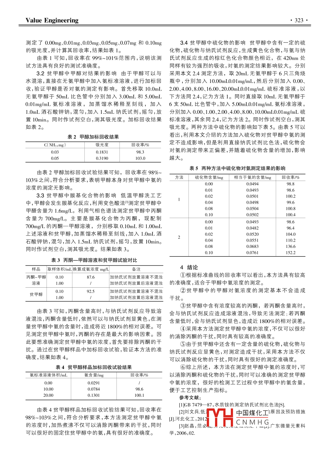 ·322價值工程低溫甲醇洗工藝貧甲醇中的氨含量測定Determination of Ammonia Content of Poor Methanol in the low TemperatureMethanol Washing process杜彥霞 DU Yan-xia(河南煤化集團鶴煤公司化工分公司,鶴壁458000)Henan Coal Group Hebi Coal Ltd Chemical Branch Company, Hebi 458000, China)摘要:低溫甲醇洗工藝的貧甲醇中含有羰基化合物,采用納氏試劑比色法測定貧甲醇中的氨時,將會導(dǎo)致溶液混濁,無法對其進行比色測定。另外貧甲醇中的硫化物,在顯色時會與納氏試劑生成紅色硫化汞,導(dǎo)致測定結(jié)果偏高。文中著重介紹了如何消除貧甲醇羰基化合物和硫化物的干擾確測量貧甲醇中的氨含量Abstract: In the low temperature methanol washing process, the poor metheanol contains carbonyl compounds. When using Nessler'sreagent colorimetric method for determination ammonia content of poor methanol, it will lead to the turbidity of the solution and be unablecolorimetric determination. In addition, sulfide in the poor methanol with Nessler's reagent reacts, will generate red mercuric sulfide in coldThe paper introduces how to eliminate the inter-ference of poor methanolcarbonyl compounds and sulfide, so that accurately measure theammonia content of methanol in poverty關(guān)鍵詞:納氏試劑比色法;貧甲醇;羰基化合物;硫化物;干擾Key words: Nessler's reagent colorimetry; poor methanol; carbonyl compounds; sulfide; interference中圖分類號:O57221文獻標識碼:A文章編號:1006-4311(2013)24-0322-021概述于水中,然后定容至500mL。⑥4%氫氧化鈉溶液:稱取甲醇中含有適量的氨可以防止管道腐蝕,但是氨的含4 g Naoh加入96mL水溶解,冷卻至室溫。⑦銨標準貯備量過高,會給工藝帶來很多危害凹液:稱取3.141g經(jīng)100℃C千燥過的優(yōu)級純氯化銨,溶于水①甲醇中氨的增加,導(dǎo)致生成的硫化銨沉淀增加,從中,轉(zhuǎn)移至1000mL容量瓶中,稀釋至刻線。⑧氨標準溶而引起塔盤浮閥堵塞;②隨著甲醇中氨、碳黑等雜質(zhì)的增液:移取⑦氨標準貯備液5.00m于500mL容量瓶中,用加,使得甲醇的粘度大大增加;③甲醇中的氨、硫化物及碳水稀釋至刻線。黑生成某種絡(luò)合物(固體);④由于甲醇中氨和碳黑的增22方法原理Hgl2和KI的堿性溶液與氨反應(yīng)生成加,引起甲醇發(fā)泡;⑤甲醇中氨含量太高,氨在熱再生塔頂?shù)t棕色的膠態(tài)化合物,此顏色在較寬的波長內(nèi)有強烈的冷凝器與CO2反應(yīng)生成 NHHCO3,堵塞管程。但是至今為吸收,通常波長在410m-425mm。止,甲醇中氨含量的測定只有一種方法——酸堿滴定法,23標準曲線的繪制分別移取0.00、2.00、6.00由于二氧化碳氣體在甲醇中具有較大的溶解度,會導(dǎo)致測10.00、14.00、20.00mL氨標準溶液于6只三角燒瓶中,再定結(jié)果偏小,無法為工藝生產(chǎn)提供精準的數(shù)據(jù)。所以迫切分別加入20mL無氨甲醇,加入適量硼酸溶液,用水稀釋需要一種干擾小,選擇性和靈敏度高的測定方法。所以要至80mL左右,加熱蒸發(fā)至40mL時停止加熱,冷卻至室溫按時對貧甲醇中的氨進行監(jiān)測,必須找到一種適合貧甲醇用氫氧化鈉溶液調(diào)pH至中性,分別轉(zhuǎn)移到6只100mL容中氨的測定方法,將會更好、更快、更準地指導(dǎo)工藝生產(chǎn)。量瓶中稀釋至刻線,然后再加入到6支50mL比色管中至本方法是一種專門針對貧甲醇制定的測定其中氨的分析刻線,加入1.0mL酒石酸鉀鈉溶液,混勻,加入1.5mL納氏方法。試劑,搖勻,放置10min。在420mm波長處,2cm比色皿,測2試驗部分其吸光度,以吸光度為橫坐標,以含量為縱坐標繪制標準21試劑(配制試劑用水均為無氨水)曲線。①無氨水制備:每升蒸餾水中加0.lmL硫酸,在全玻24貧甲醇的測定取適量貧甲醇試樣于250mL三角璃蒸餾器中重蒸餾,棄去50mL初餾液,接收其余餾岀液燒瓶中,加入適量的硼酸溶液2.1.3,加水稀釋至約8OL,于具塞磨口試劑瓶中,密封保存。②無氨甲醇制備:精甲醇同標準曲線繪制方法。在420mm波長處,2cm比色皿,測按①方法制備。③納氏試劑:稱取16 g NaoH,溶于50mL水其吸光度。同時以水作試劑空白中,充分冷卻至室溫。另取7gKI和1 Oggi2溶于少量水中,2.5結(jié)果計算貧甲醇中氨濃度按式(1)計算:然后將此溶液在攪拌下慢慢注入NaOH溶液中,用水稀釋×1000(1)至100mL,儲于聚乙烯瓶中,密封保存。④酒石酸鉀鈉:稱表1標準曲線回收率取50g酒石酸鉀鈉溶于100mL水中,加熱煮沸以除去氨,式中:A一樣品吸光度;K—cNH,m)吸光度回收率%冷卻后定容至100ml。⑤20g/L硼酸溶液:稱取硼酸10g溶標準曲線系數(shù),mg吸光度00635100.9取樣體積,(中國煤化工018721005作者簡介:杜彥霞(1985-),女,河南濮陽人,現(xiàn)河南煤化集團鶴煤3結(jié)果與讠CNMHGO30999.8司化工分公司工作,助理工程師,理學(xué)學(xué)士學(xué)位,從31標準曲線回收率按照v,0.4356100.60.00616699.8事化驗分析工作。2.3標準曲線的繪制方法,分別value Engineering·323·測定了000mg0.01mg0.03mg0.05mg0.07mg和0.10mg3.4貧甲醇中硫化物的影響貧甲醇中含有一定的硫的吸光度,并計算其回收率,結(jié)果如表化物,硫化物與納氏試劑反應(yīng),生成黃色化合物,與氨與納由表1可知,回收率在99%-101%范圍內(nèi),說明該測氏試劑反應(yīng)生成的棕紅色化合物顏色相近,在420m處試方法具有良好的測試準確度。同樣有較為強烈的吸收,對氨的測定結(jié)果影響較大。分別32貧甲醇中甲醇對結(jié)果的影響由于甲醇可以與采用本文24測定方法,取20mL無氨甲醇于6只三角燒水混溶,直接在無氨甲醇中加入氨標準溶液,進行加標